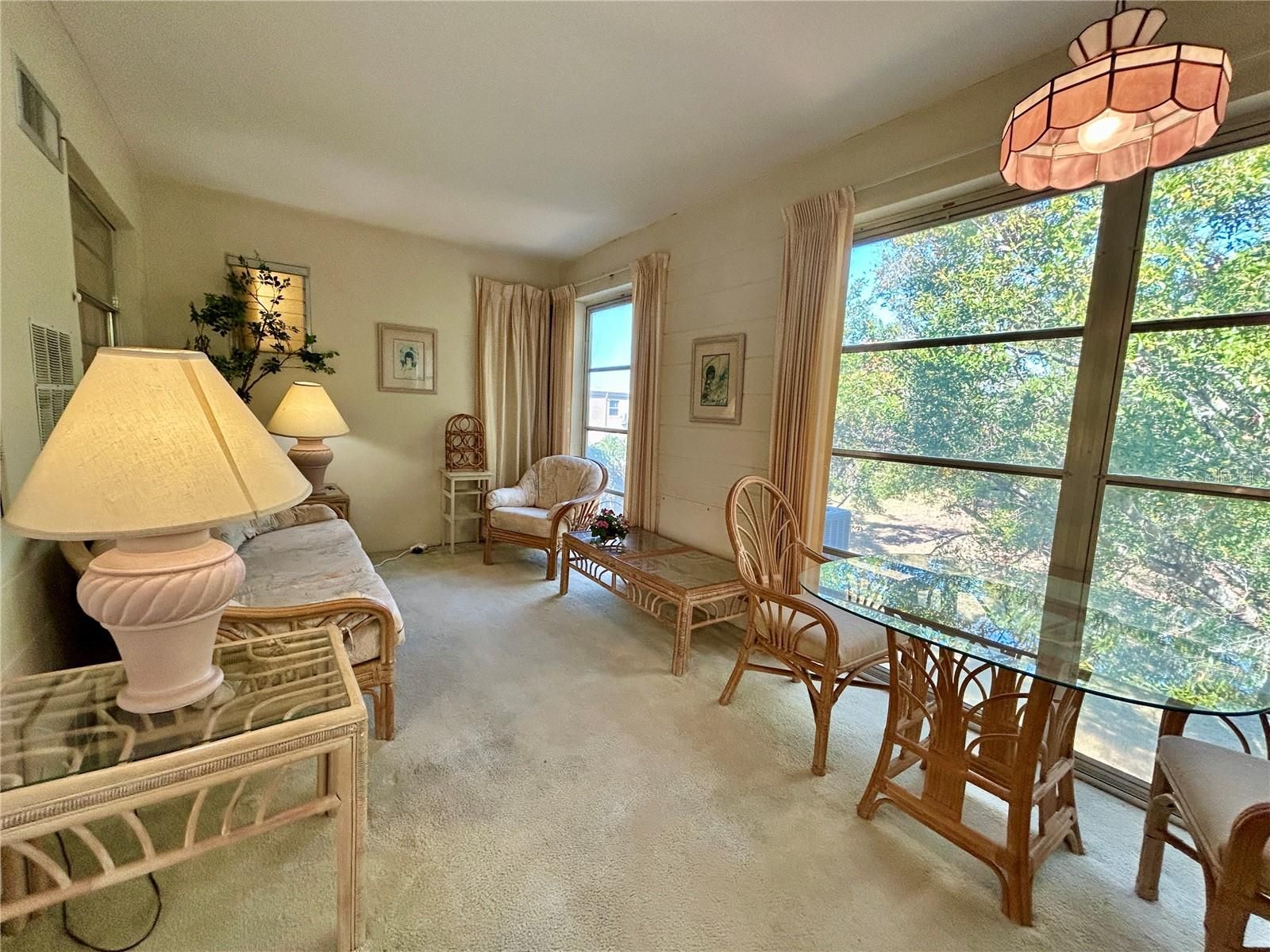 Silence is golden! Enjoy the peace and serenity of this top floor, 2 bed, 2 bath end unit situated on a quiet cul-de-sac overlooking a park-like setting of trees and greenery. This end unit has additional windows in the living room and kitchen to let the daylight in. The kitchen includes an updated dishwasher and refrigerator. The AC was replaced in 2019. New PGT windows scheduled to be installed January, 2026, with transferrable warranty to new owner. Enjoy the convenience of your assigned parking space. Located in a vibrant 55+ community, you'll have access to a wide range of amenities designed to enhance your lifestyle. Enjoy two private golf courses (9 and 18 holes), two heated swimming pools, and two activity centers. Stay active in the remodeled cardio gym or engage in various community activities like fitness classes, dancing, clubs, cards, and billiards. Pet owners will love the pet-friendly environment, featuring a fenced dog park and covered seating areas. Residents can also enjoy hobby studios and a woodshop for creative pursuits. The on-site Good Karma Café offers convenient 'take & bake' meals and snacks. Conveniently located near beaches, transportation, shopping, entertainment, and fine dining. Schedule your showing today and enjoy the best in comfort and convenient living!