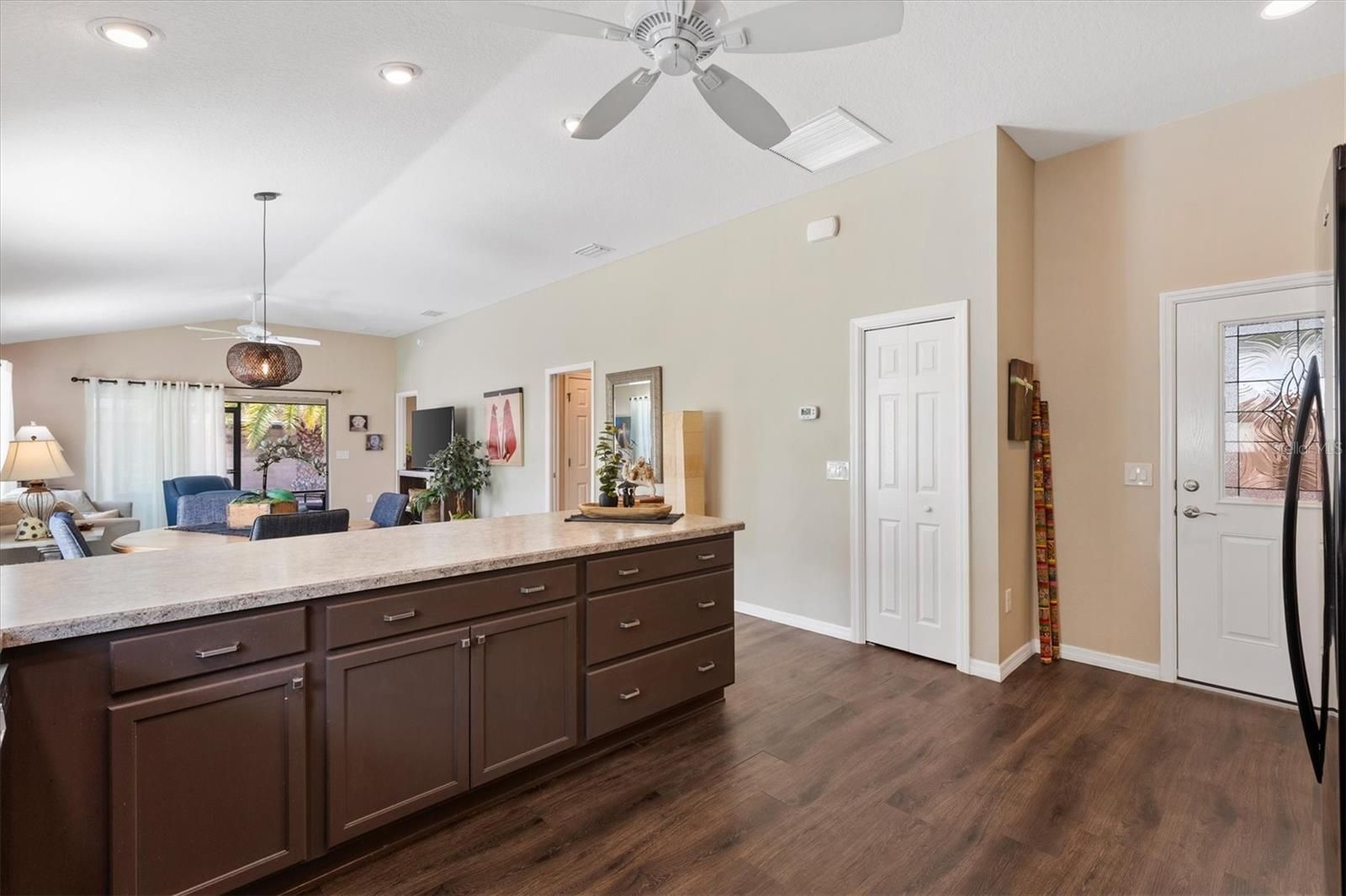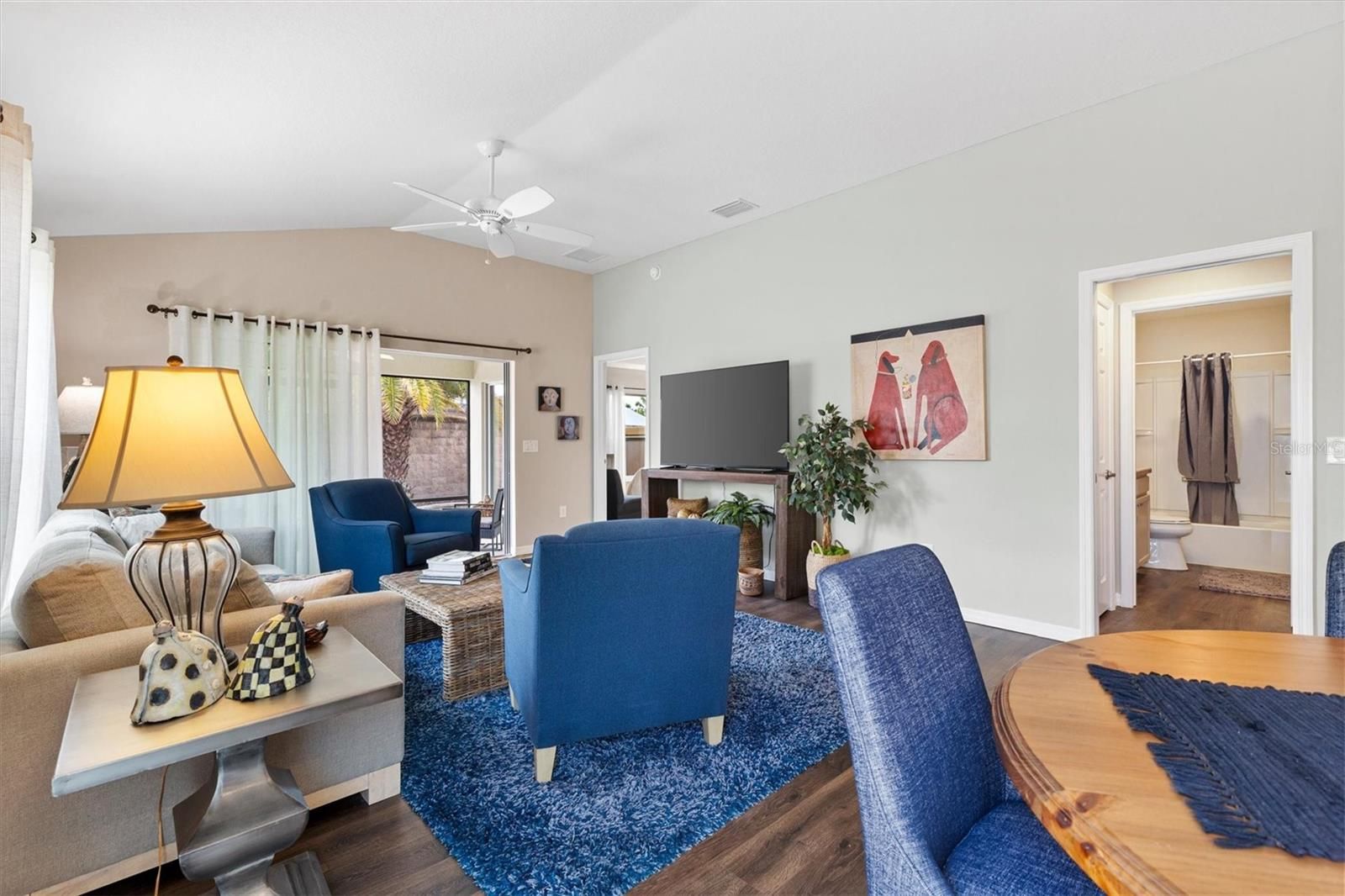 - Ceiling Fan(s), High Ceilings, Open Floorplan, Split Bedrooms, Thermostat, Vaulted Ceiling(s), Window Treatments