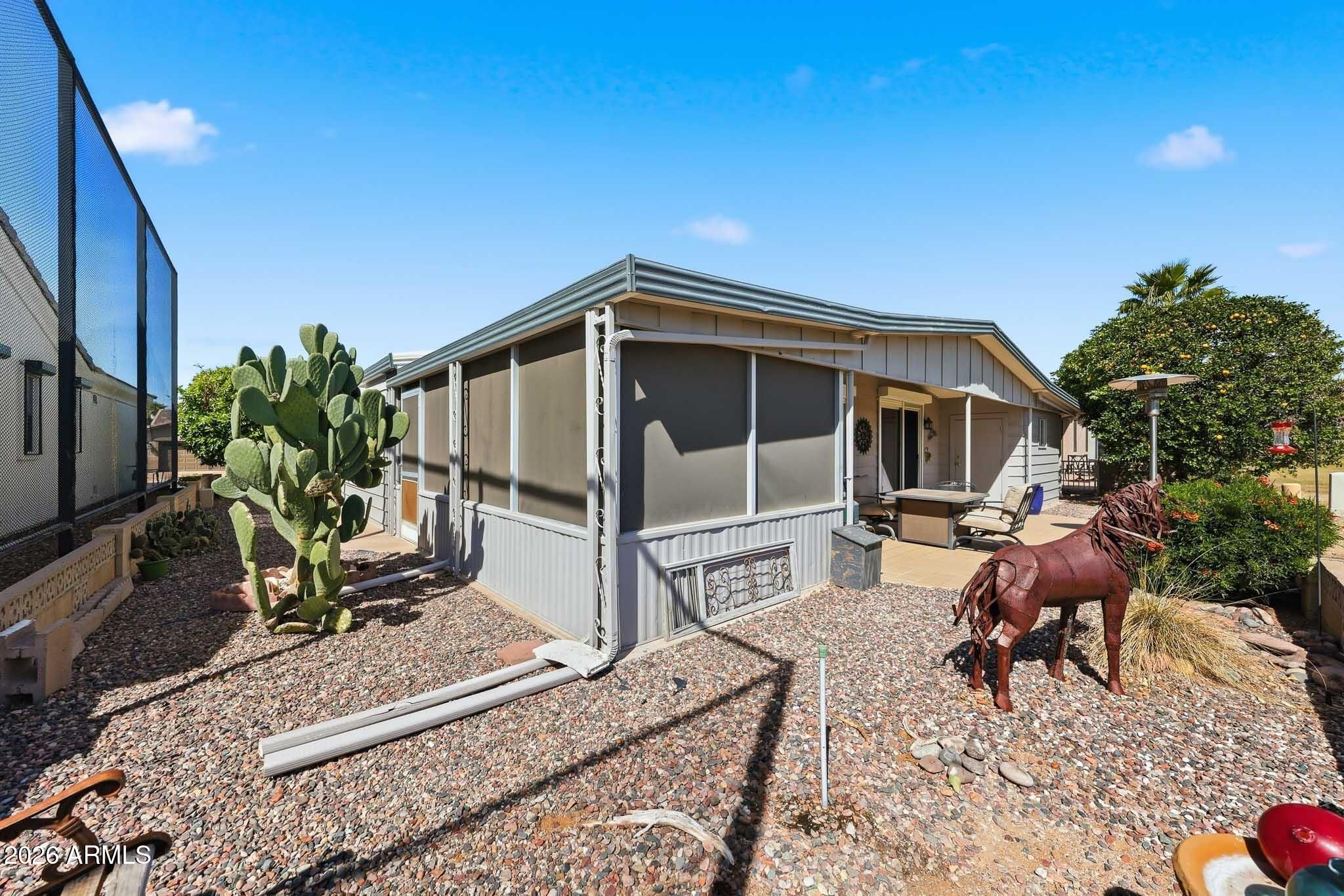 Rarely found, spacious manufactured home of nearly 2000 sq ft! Beautiful views to the east of the 9th hole of Apache Wells golf course. Make full use of the full width back patio-morning coffee and afternoon drinks with friends. Inside find a sizable, well equipped kitchen with seat up counter and views to the course. Conveniently located, nearby dining room would fit a table for 8 easily!! Relax in your living room space that allows for multiple seating arrangements to suit your lifestyle. The primary bedroom is located away from the main living space with a large walk in closet. Primary bath has a his and hers counter, tons of storage and a walk in shower. Second bedroom is large and directly across from the hall bath with shower/tub combo and plenty of counter space. Click MORE Apache Wells is one of the best Active Adult communities with a full 18 hole golf course, amazing amenities including free standing wood shop, multiple pickle ball courts, painting, ceramics, quilting, billiards, card clubs, boche ball, shuffleboard, travel club, library and much more. Restaurant, bar and grill for your entertainment. Full service gym and large pool spa area complete the community offerings. Located with easy access to highways, both Sky Harbor and Mesa Gateway airports. Shopping and outdoor adventures at your fingertips. Apache Wells is a vibrant active community ready for you to take advantage of all it offers.