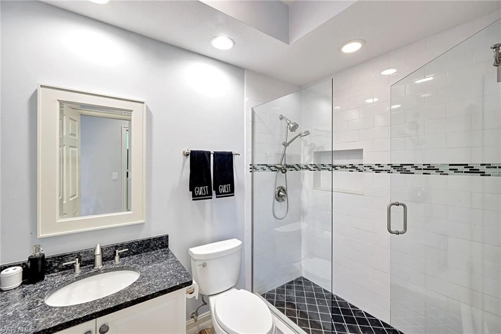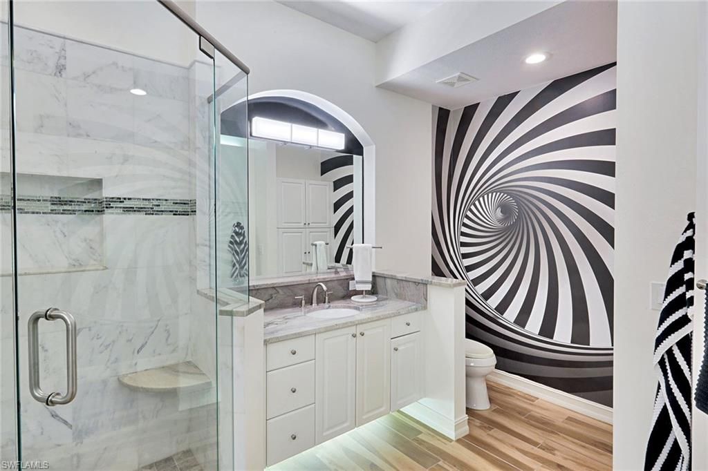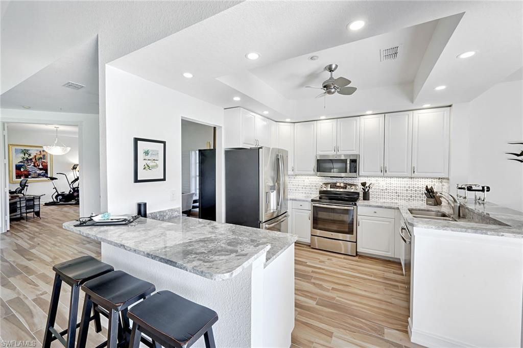 Welcome to effortless living in Palm Colony at Pelican Landing, where sweeping golf course vistas and tranquil lake views set the tone for this beautifully updated second-floor residence. Move-in ready and thoughtfully renovated, this home offers a harmonious blend of modern style and comfort, with a striking black and white contemporary interior that invites you to relax and unwind from day one.With more than 2,000 square feet of refined living space, the residence includes three bedrooms and three full baths. Highlights include wood-look tile flooring, vaulted ceilings and a fresh, modern palette. The kitchen is finished with granite countertops and a distinctive backsplash, while all three baths have been fully redesigned with elegant, high-end touches. Picture windows frame the golf course from the living room, and the dining area overlooks the lake, creating a sense of connection to the outdoors throughout.Palm Colony is among the most desirable enclaves in Pelican Landing, featuring two community pools, two fitness centers and the scenic Canary Island pool, an inviting hub for gatherings in a lush natural setting. As part of the larger Pelican Landing community, residents also enjoy access to a private beach park on Big Hickory Island, along with tennis, pickleball, sailing, bocce and a kayak and canoe launch. A rare opportunity to enjoy a move-in ready home with every lifestyle amenity at your fingertips.