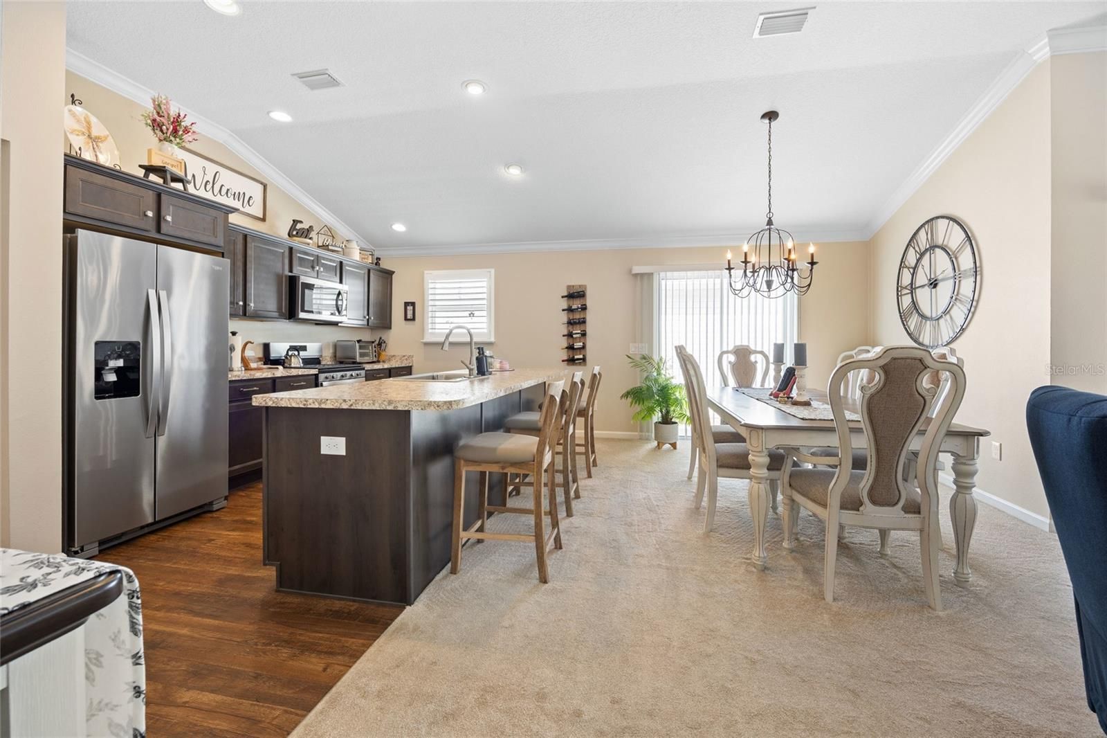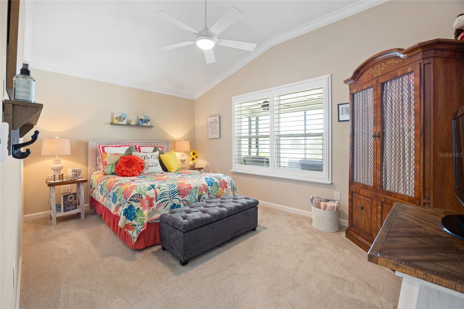 PRICE IMPROVED!! Welcome to this beautiful Melrose model villa in the Village of DeSoto! If you are ready to move to The Villages, this villa is a must see. Not only is it perfectly maintained but it’s in a fantastic location. It’s minutes from Magnolia Plaza, the new Eastport Town Square, and Brownwood Town Square. This 3 bedroom, 2 bath home is filled with thoughtful upgrades and stylish details throughout. From the moment you arrive, you’ll appreciate the enhanced landscaping with stone and mulch and the screened entry creating a welcoming front lanai with dual ceiling fans as well as the LED soffit lighting. Inside, the open floor plan features vaulted ceilings, crown molding, plantation shutters, and ceiling fans in every bedroom. The sliders open to a screened lanai overlooking a private yard—perfect for pet lovers or outdoor enjoyment. Freshly painted in designer colors. The flow of this open living area is perfect for entertaining. Large, bright and, inviting. The spacious kitchen boasts gas appliances, a walk-in pantry, and abundant cabinet and counter space, ideal for both everyday meals and entertaining. Not only is the kitchen open to the dining area but it also has bar area, perfect for overflow seating. The master suite offers a tray ceiling accented with crown molding and color, private bath, double vanity, a Roman walk-in shower, and walk in closets. Guests will enjoy two comfortable bedrooms, with one featuring a custom built-in office workstation. A second full bath adds convenience. Additional highlights include gas heat, a full 2-car garage, and dual fans on the front lanai for year-round comfort. This villa is the perfect blend of beauty, functionality, and low-maintenance living—all in a fantastic location close to the best of The Villages lifestyle! Realtor is the owner.