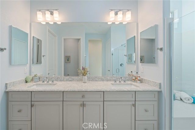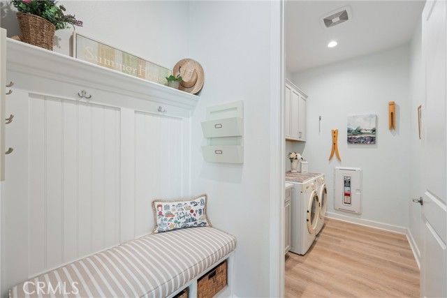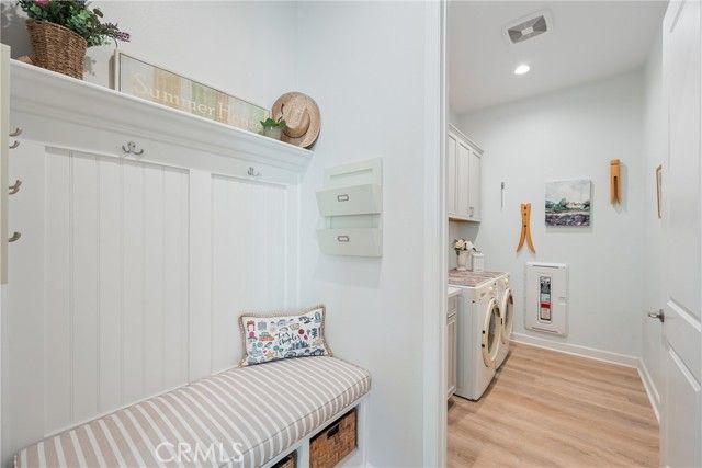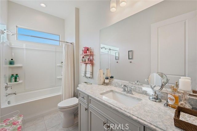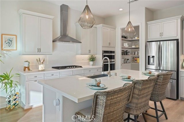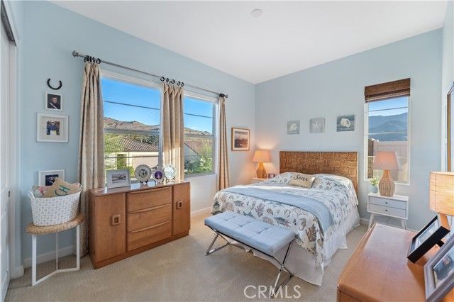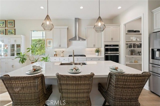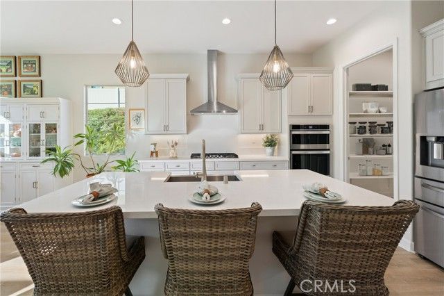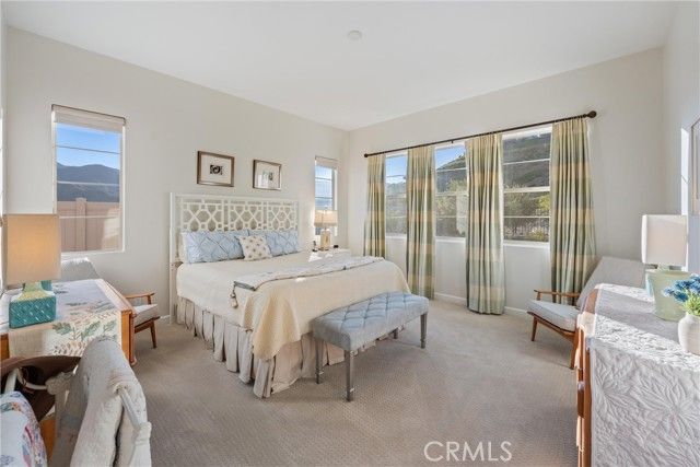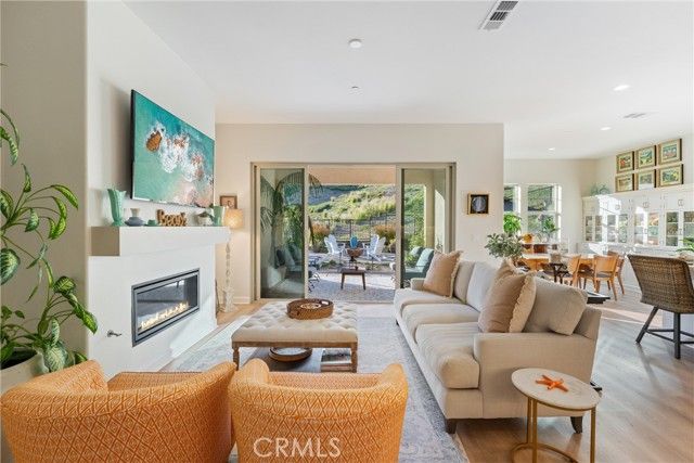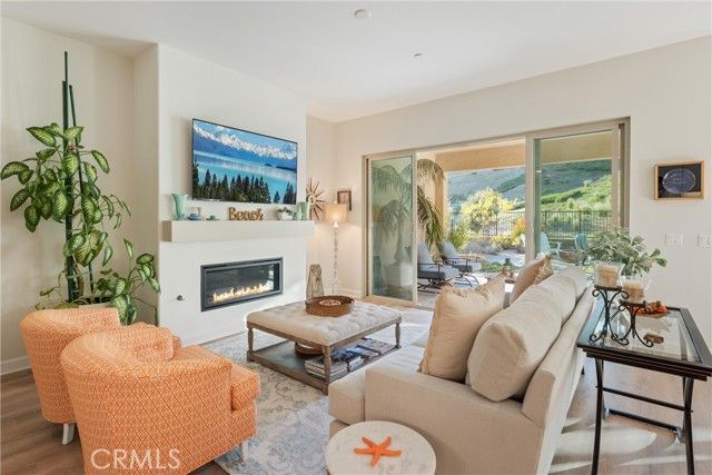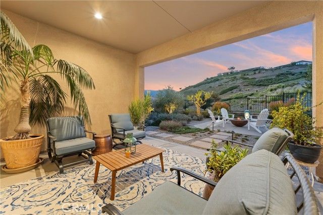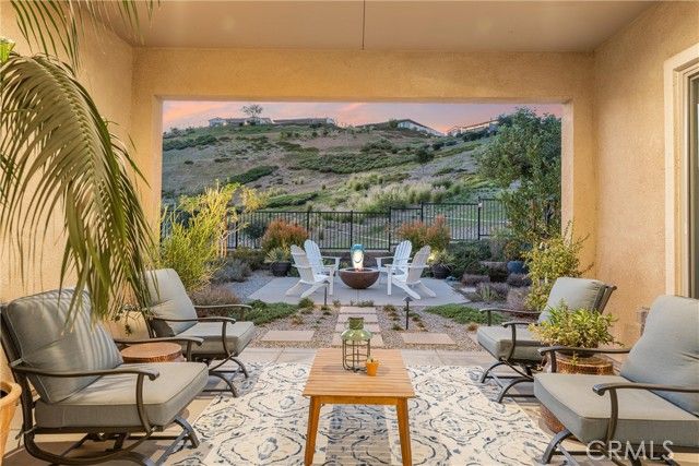55+ RESORT-STYLE LUXURY LIVING | 1-STORY | PANORAMIC VIEWS | FULLY PAID SOLAR | GUARDED + GATED | Welcome to this beautifully upgraded home in the highly desired Terramor — where modern luxury and comfort meet in a vibrant community! A welcoming front patio with mountain views sets the stage for easy living in this elegant residence. Step inside to be greeted by abundant natural light, gorgeous luxury plank flooring, & an impressive array of upgrades. The open-concept Living Room has a warming fireplace & a 2-panel sliding glass door that extends your living space into the grand California Room & fully landscaped yard, creating the perfect blend of indoor-outdoor living. The chef-inspired Kitchen boasts stunning quartz countertops, breakfast bar seating, upgraded cabinetry, stainless steel appliances, pot & pan drawers, under-cabinet lighting, and oversized walk-in pantry. The Dining Room offers convenience for entertaining with a second slider to the backyard & a built-in china hutch with glass display doors—adding style & function. The Primary Ensuite Bedroom is spacious & filled with natural light, creating a serene retreat. The spa-like Ensuite Bathroom showcases quartz countertop, dual sinks, an oversized frameless shower with seating, upgraded cabinetry, & a walk-in closet with custom built-ins. Bedroom #2 enjoys stunning mountain views, while the Builder's spacious optional Bedroom #3 is currently a combined office/den. Bathroom #2 includes quartz counters and a shower-tub combination. Additional highlights include a separate Laundry Room with extended cabinetry and utility sink, and a Mudroom featuring a custom upholstered bench and extra entry storage for convenience. Step outside to your private backyard retreat, complete with a covered California Room, firepit with dedicated gas line, gazebo-covered dining area, a 2nd gas line for your BBQ, an oh-so-perfect lavender garden, and captivating sunset panoramic views. Energy efficiency is top-of-the-line with fully paid solar system, EV outlet, tankless water heater, whole house fan, drip irrigation & recessed lighting. Amenities include 2 clubhouses (55+ Only and All Ages), indoor & outdoor pools, fitness center, wellness studio, tennis, pickleball, miles of trails, dog parks & sports fields. Nearby find shopping, restaurants, cinemas & quick access to OC via 15/91 Expressways & 241 Toll. This remarkable residence offers the perfect blend of elegance, privacy, & modern comfort — welcome home!