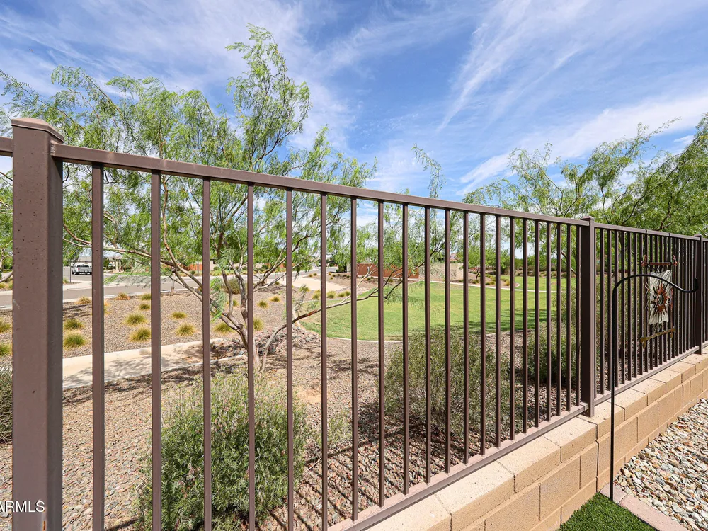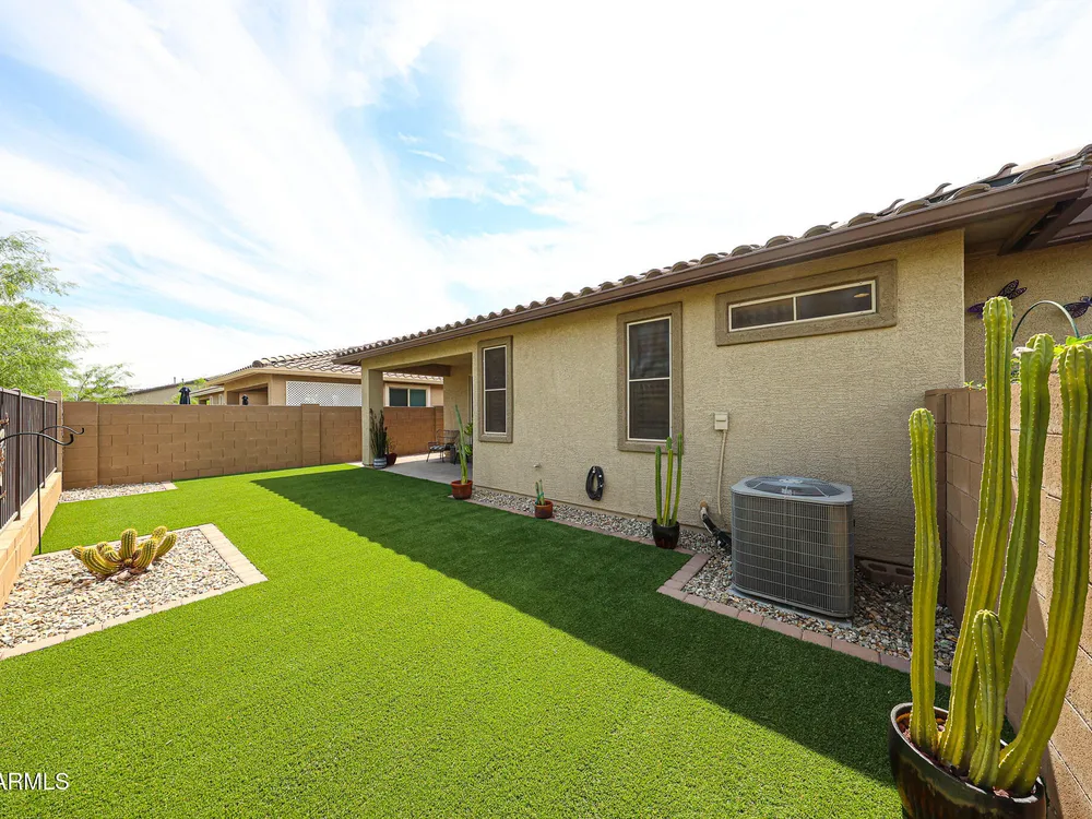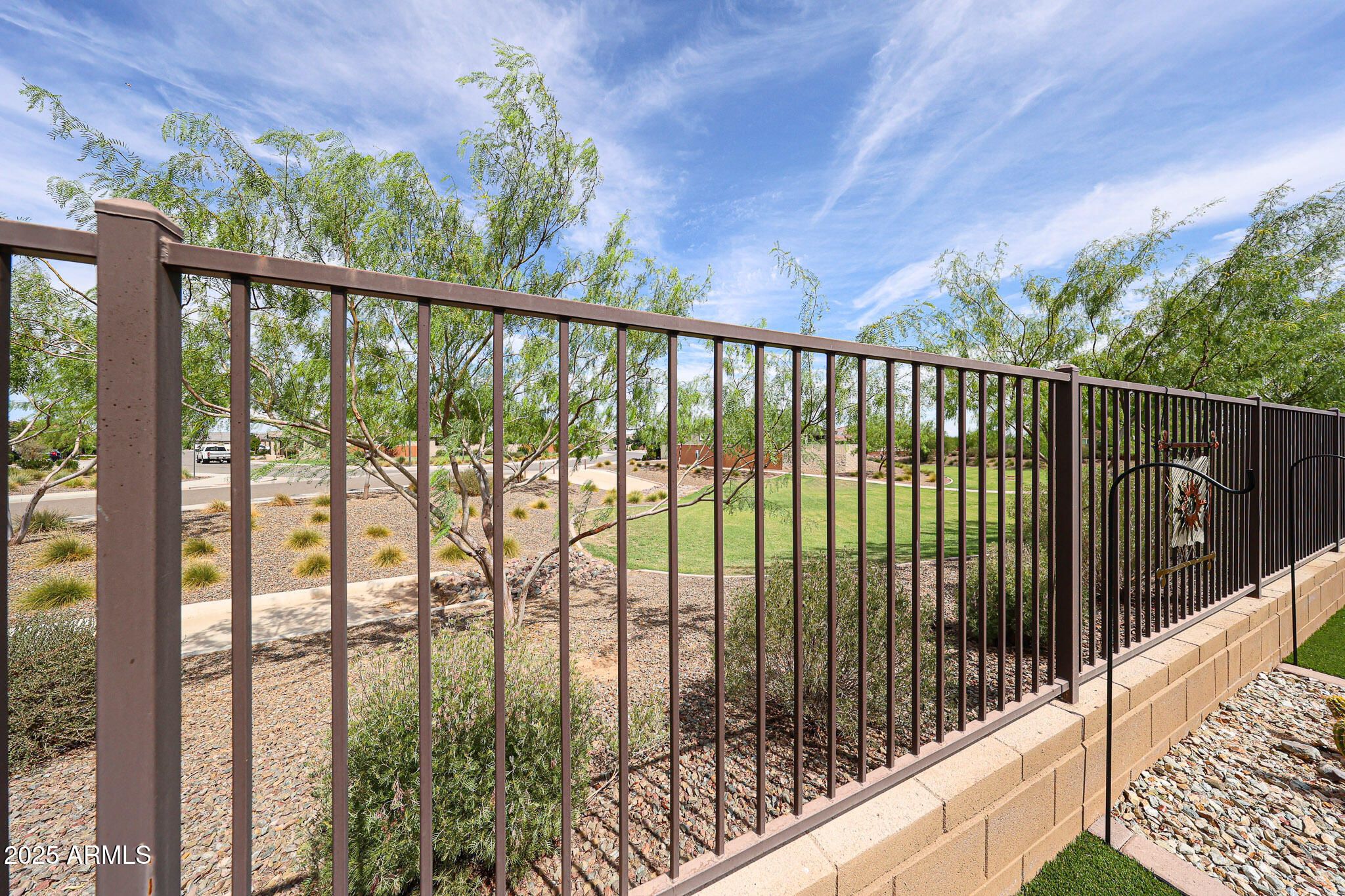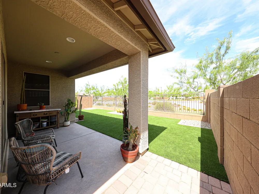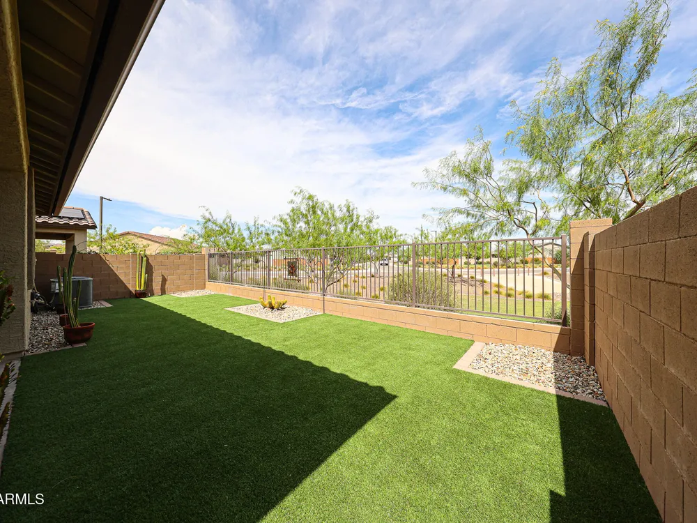 It is all here in the GATED ADULT RESORT Community in Surprise, including a NO MAINTENANCE yard that is maintained by the HOA! What a view in this fur baby dream with privacy FENCING and a block wall ADDITION. This exclusive CUL DE SAC private lot is surrounded by green spaces, NEAR the courts and recreational center and all the UPGRADES that the new build did not offer. SURROUND SOUND, SHUTTERS, FLOOR TO CEILING TILE, RECESSED LIGHTING, FRAMED MIRRORS, QUARTZ Counters, CLOSET ORGANIZATION, SOFT CLOSE cabinets and don't miss the DRAWER additions. The exterior has premium upgraded TURF green space and added PAVERS. Heritage Asante 55+ Community amenities include 9-hole putting golf course, pools with lap lanes, fire pits, bocce ball and pickle ball courts, gym, dog park, trails ++.