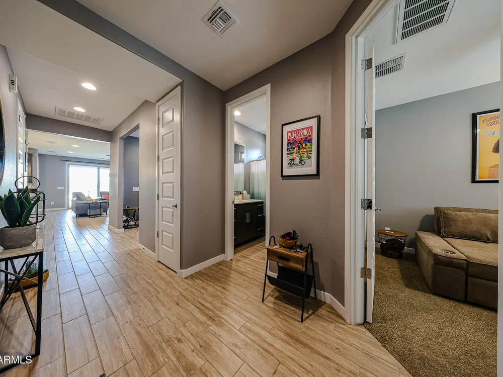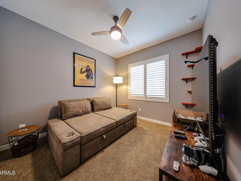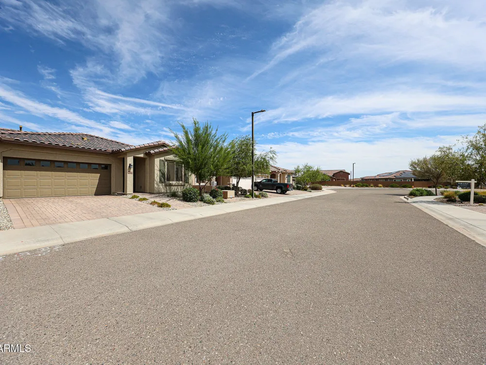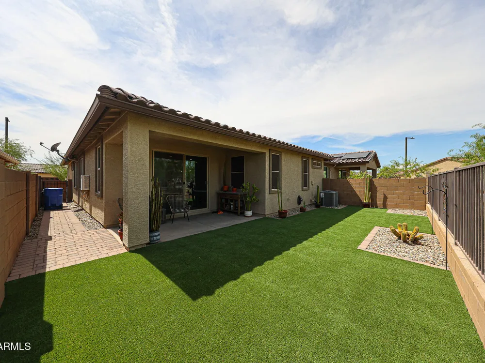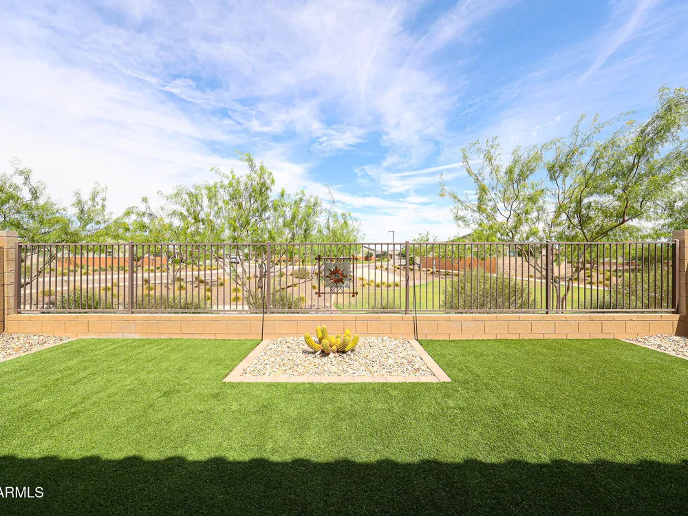 It is all here in the GATED ADULT RESORT Community in Surprise, including a NO MAINTENANCE yard that is maintained by the HOA! What a view in this fur baby dream with privacy FENCING and a block wall ADDITION. This exclusive CUL DE SAC private lot is surrounded by green spaces, NEAR the courts and recreational center and all the UPGRADES that the new build did not offer. SURROUND SOUND, SHUTTERS, FLOOR TO CEILING TILE, RECESSED LIGHTING, FRAMED MIRRORS, QUARTZ Counters, CLOSET ORGANIZATION, SOFT CLOSE cabinets and don't miss the DRAWER additions. The exterior has premium upgraded TURF green space and added PAVERS. Heritage Asante 55+ Community amenities include 9-hole putting golf course, pools with lap lanes, fire pits, bocce ball and pickle ball courts, gym, dog park, trails ++.