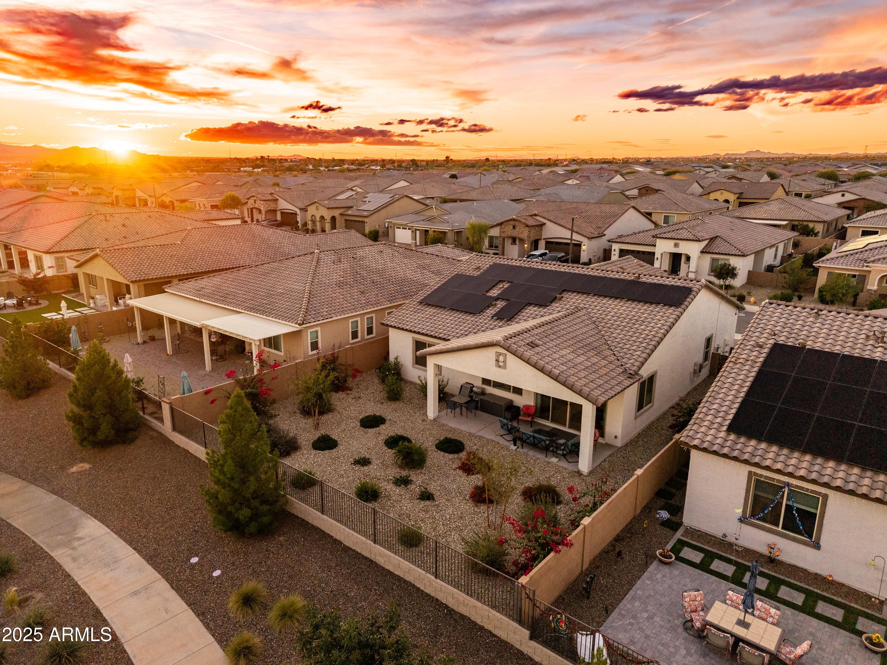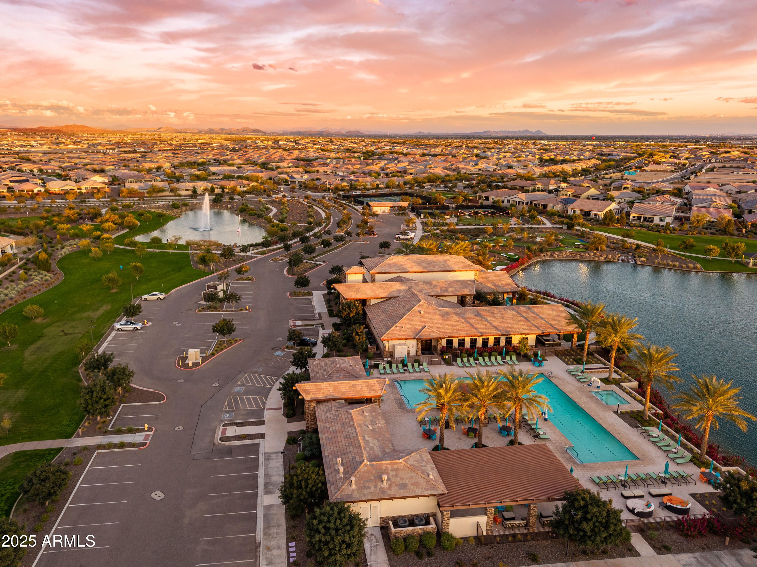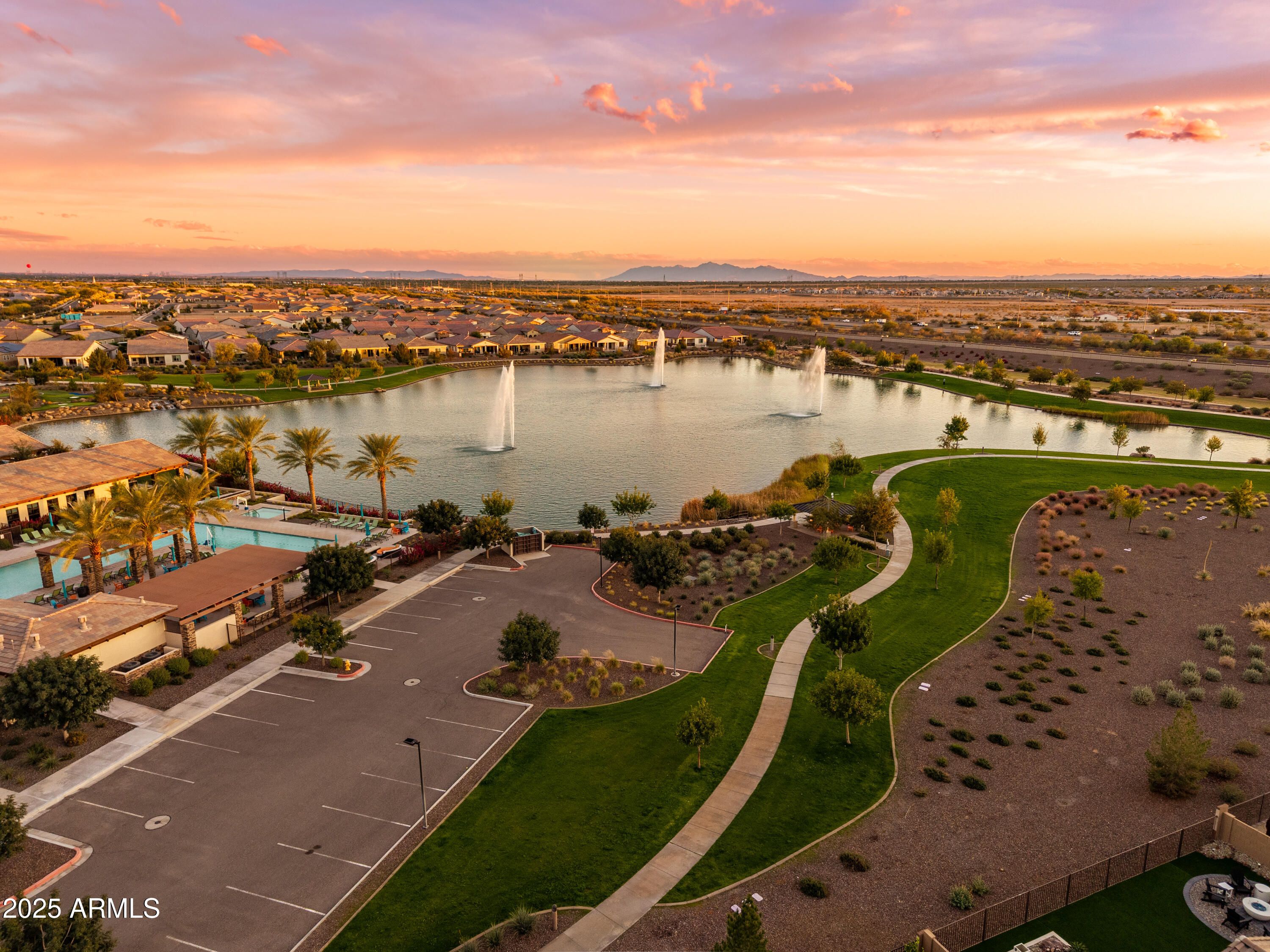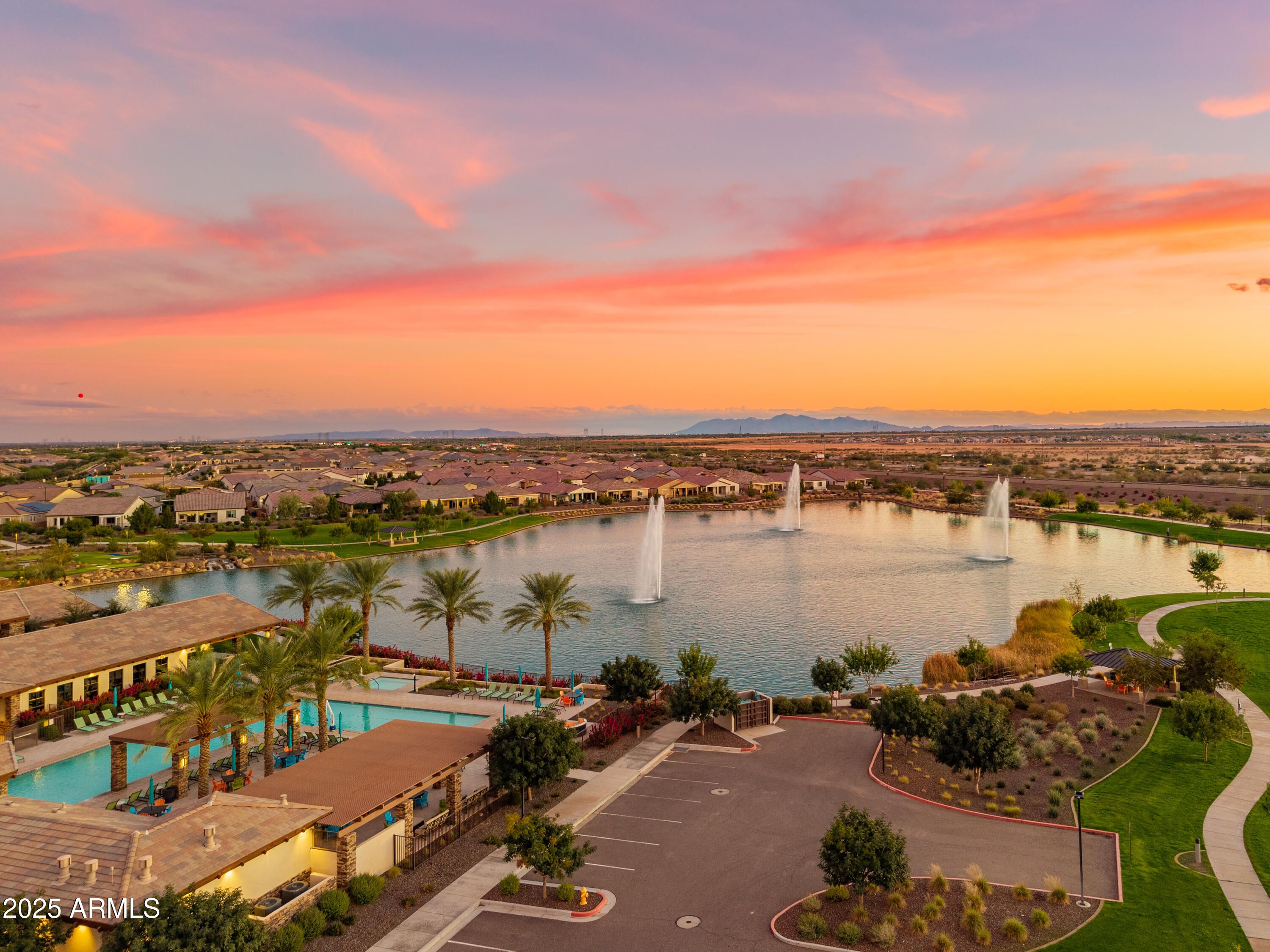 Like-new home set on a premium lot with paid solar facing the lake and community center. This modern single-story features tile flooring throughout the main areas and carpet in the bedrooms. A front secondary bedroom sits beside a versatile den perfect for an office or extra living space. The open kitchen offers dark brown cabinetry, custom herringbone backsplash, quartz countertops, and a large walk-in pantry, flowing into the Great Room. The private owner's suite includes double sinks with a vanity, a large tiled walk-in shower, and a closet that connects directly to the laundry room—an option the builder no longer offers. Enjoy the covered patio with desert landscaping and peaceful sunset views. Garage includes a workbench, storage cabinets, and space for a golf cart