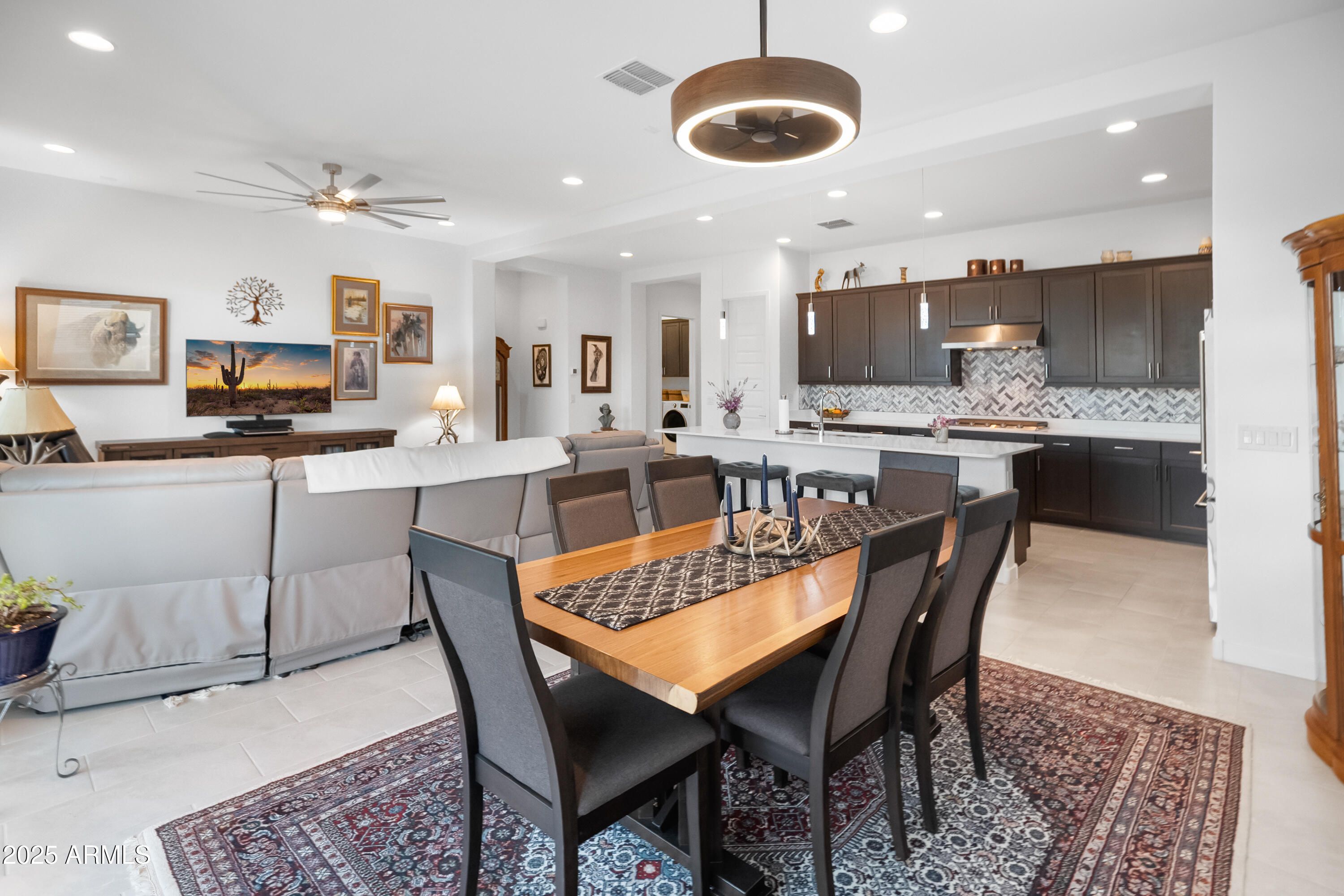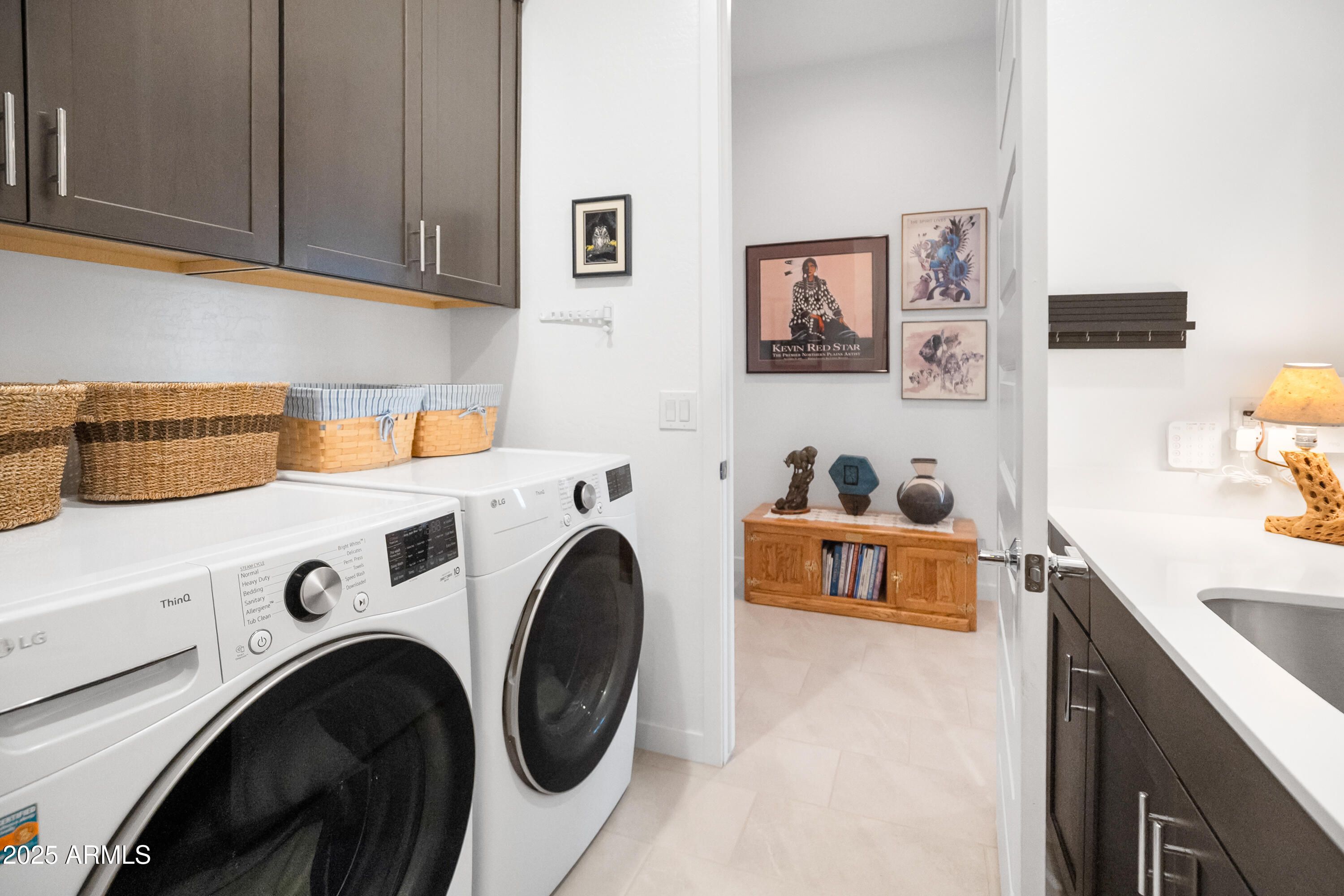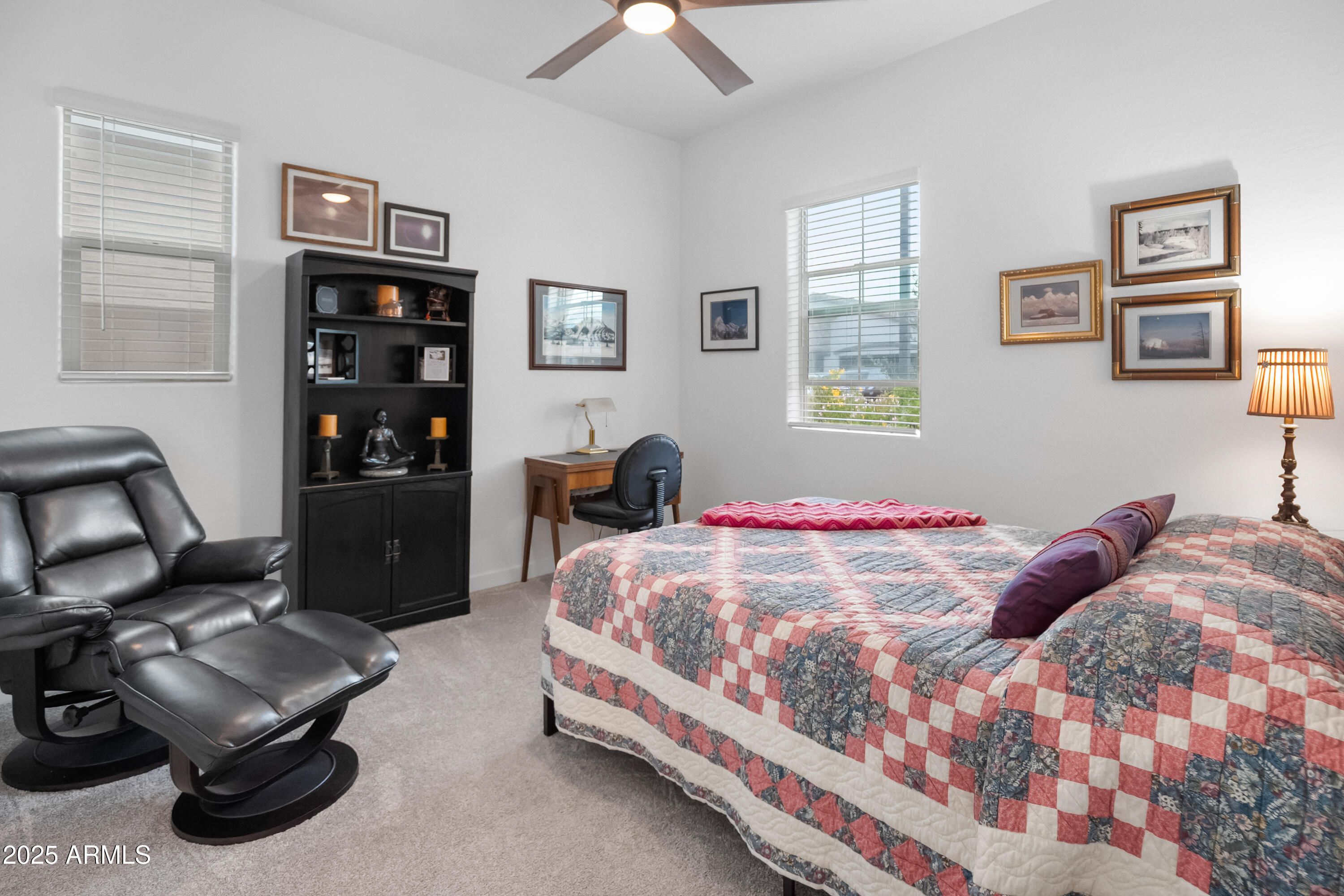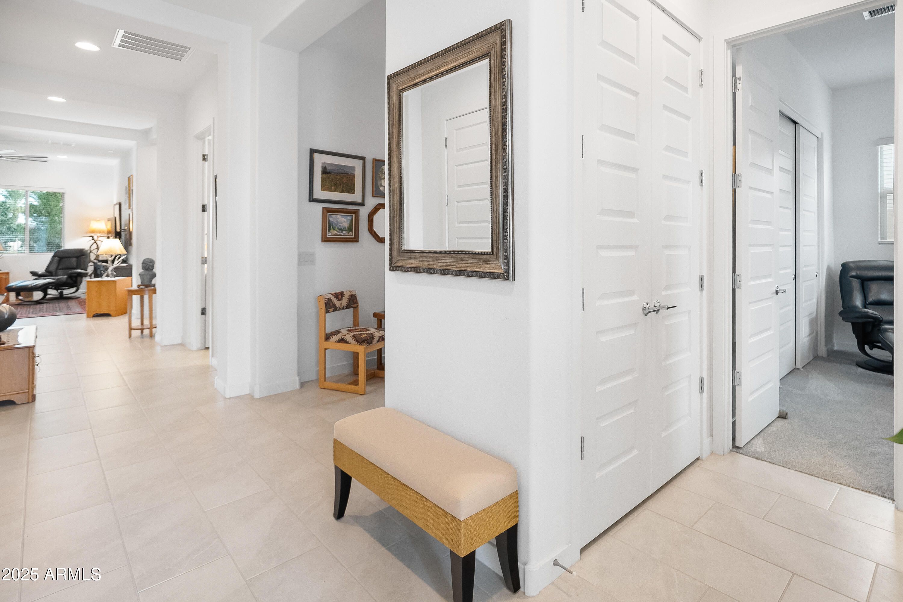 Like-new home set on a premium lot with paid solar facing the lake and community center. This modern single-story features tile flooring throughout the main areas and carpet in the bedrooms. A front secondary bedroom sits beside a versatile den perfect for an office or extra living space. The open kitchen offers dark brown cabinetry, custom herringbone backsplash, quartz countertops, and a large walk-in pantry, flowing into the Great Room. The private owner's suite includes double sinks with a vanity, a large tiled walk-in shower, and a closet that connects directly to the laundry room—an option the builder no longer offers. Enjoy the covered patio with desert landscaping and peaceful sunset views. Garage includes a workbench, storage cabinets, and space for a golf cart