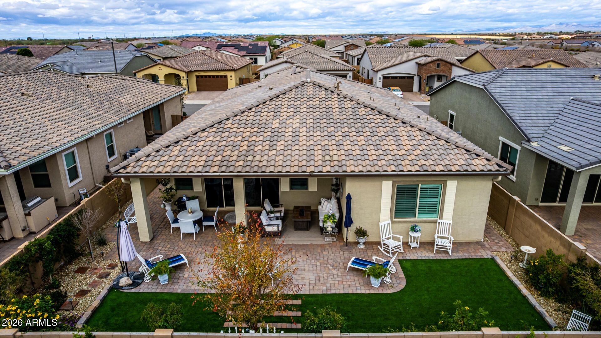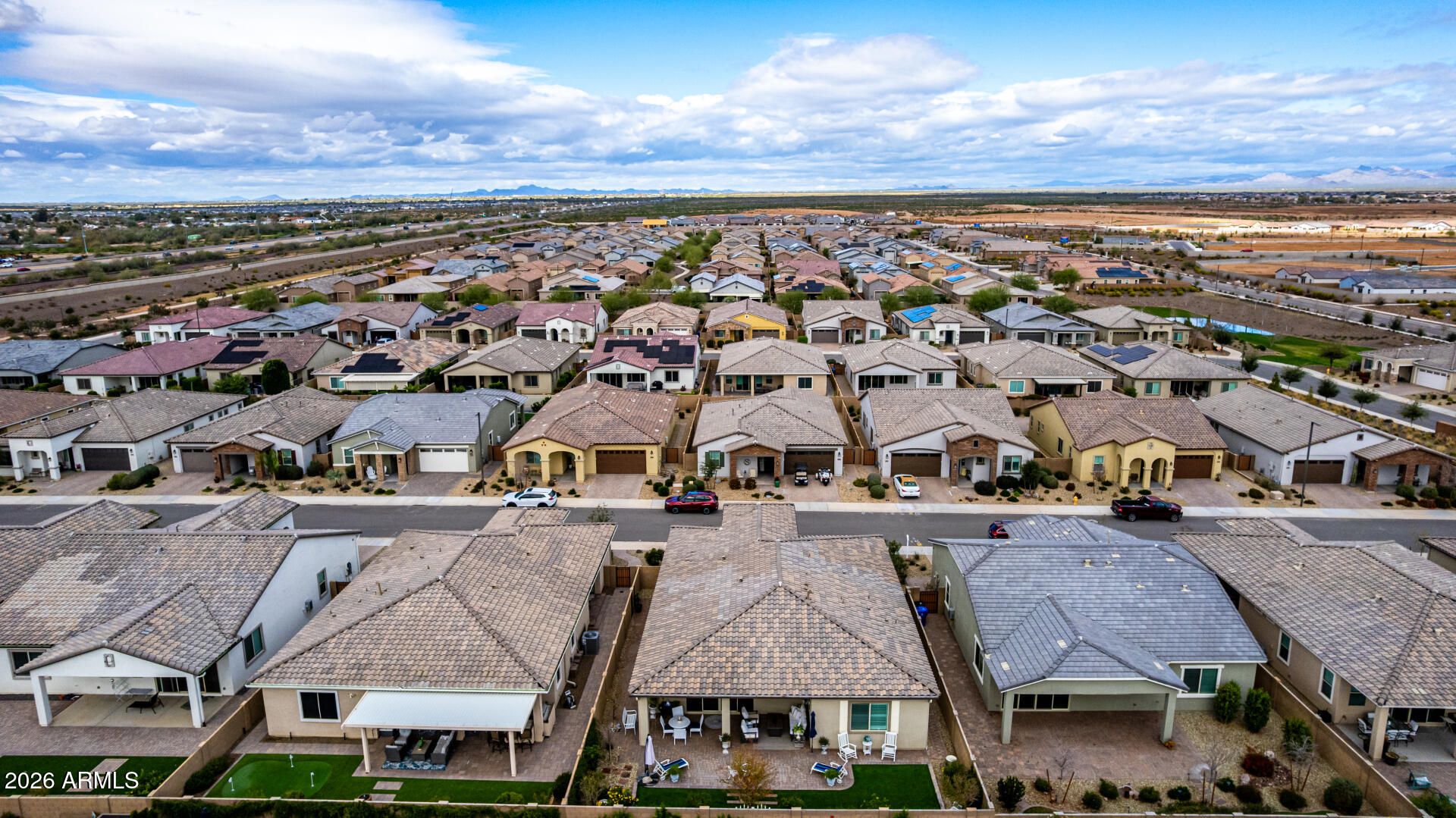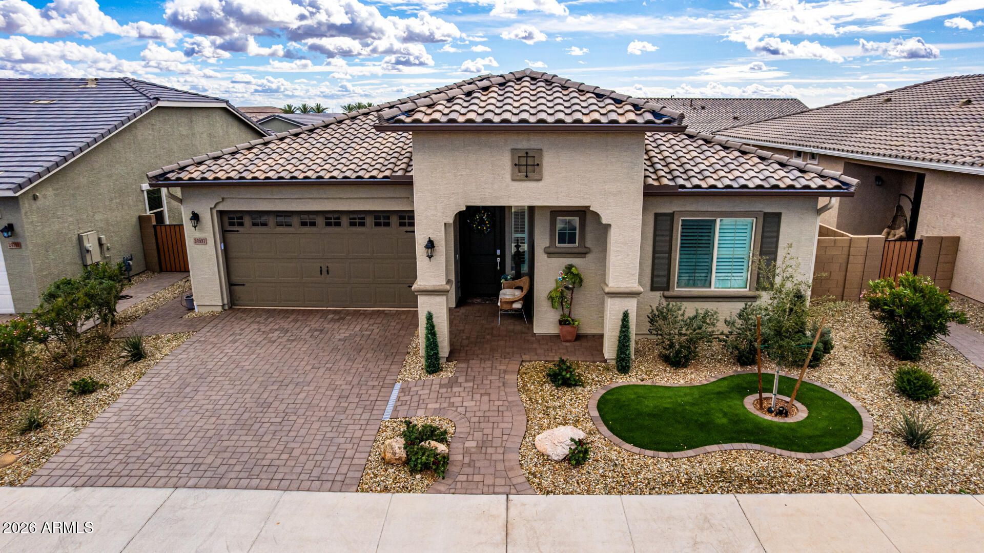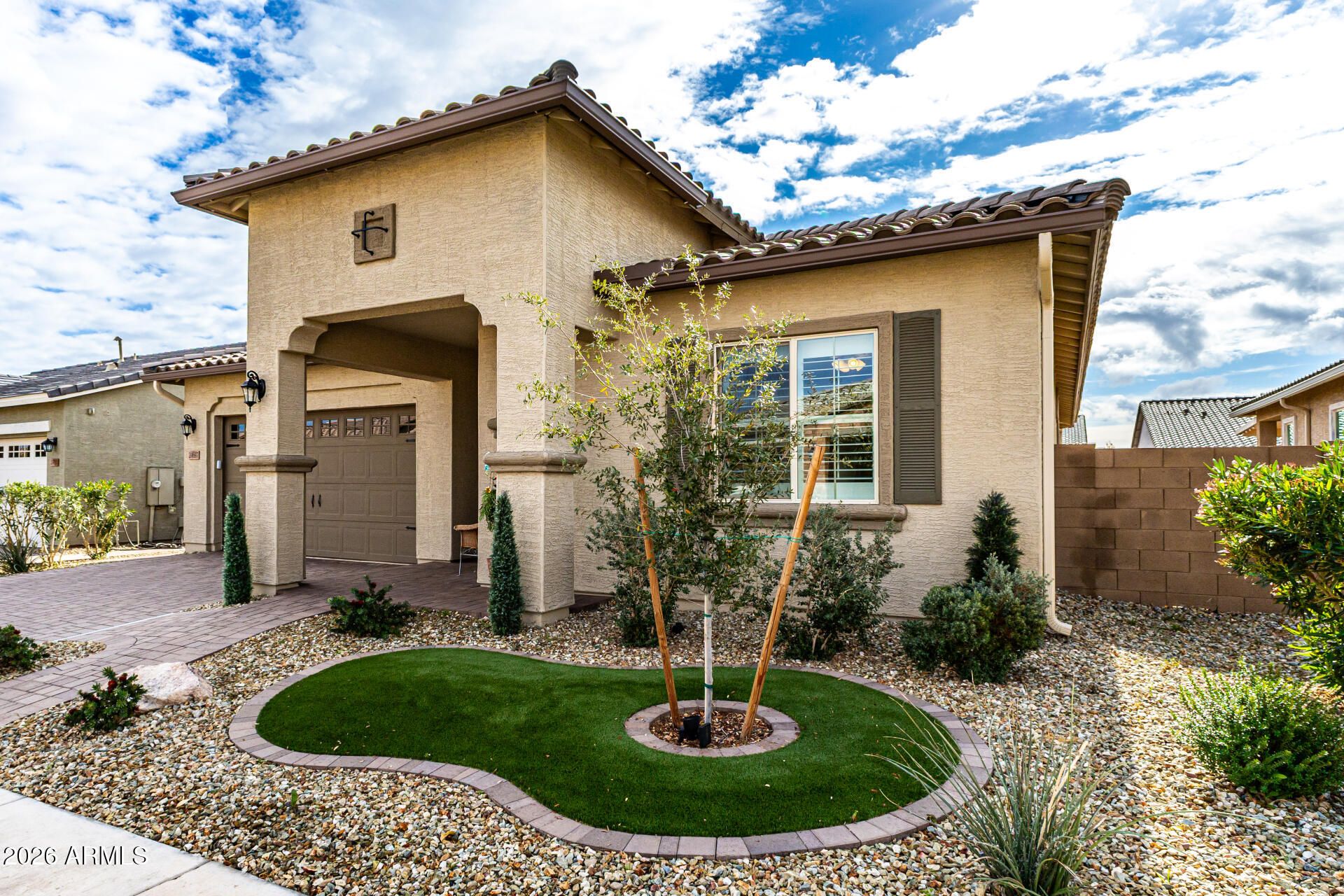 Welcome to a stand out home that feels as good as it looks--an elegant yet inviting retreat located within the gated and highly sought-after Heritage at Asante active adult community. From the moment you arrive, the home's charming curb appeal and gorgeous landscaping create a warm first impression, setting the stage for what awaits inside. Thoughtfully designed with luxury and comfort in mind, this residence offers a refined yet relaxed atmosphere that instantly feels like home. Inside, wood-look tile plank flooring flows beautifully through the main living areas, while bedrooms are accented with upgraded sculpted carpet, creating a perfect balance of style and softness. The open-concept design draws you into the heart of the home, where the kitchen truly shines. White cabinetry, quartz countertops, a gas cooktop, stainless steel appliances, pull-out drawers, custom hardware, a walk-in pantry, and a spacious island with breakfast bar make this kitchen both functional and inviting--ideal for everyday living and effortless entertaining. The kitchen opens seamlessly to the great room and dining area, filling the space with natural light and an easy, welcoming flow. A private guest suite positioned at the front of the home offers a full bath and its own covered patio, providing a comfortable and secluded space for visiting friends or family. The owner's suite serves as a peaceful retreat, featuring dual sinks, a large walk-in tiled shower, and a spacious walk-in closet with convenient direct access to the laundry room. Outdoor living is equally impressive, with two patios designed to extend your living space and invite relaxation. The backyard is a true highlight, showcasing gorgeous landscaping, widened pavers, lush greenery, and a serene setting that's perfect for enjoying quiet mornings or taking in Arizona's breathtaking sunsets. Life in Heritage at Asante is about more than just a beautiful home--it's about lifestyle. Residents enjoy resort-style amenities including a clubhouse, sparkling pool and spa, fitness center, pickleball courts, putting course, and scenic walking trails, all within a vibrant and welcoming 55+ community. With convenient access to nearby shopping, dining, and recreation, everything you need is close at hand. Whether you're searching for a full-time residence or the perfect seasonal retreat, this exceptional home offers comfort, connection, and timeless appeal. From the moment you step inside, you'll feel the harmony of thoughtful design and relaxed luxury. Welcome to the next chapter--you're going to love it here.
