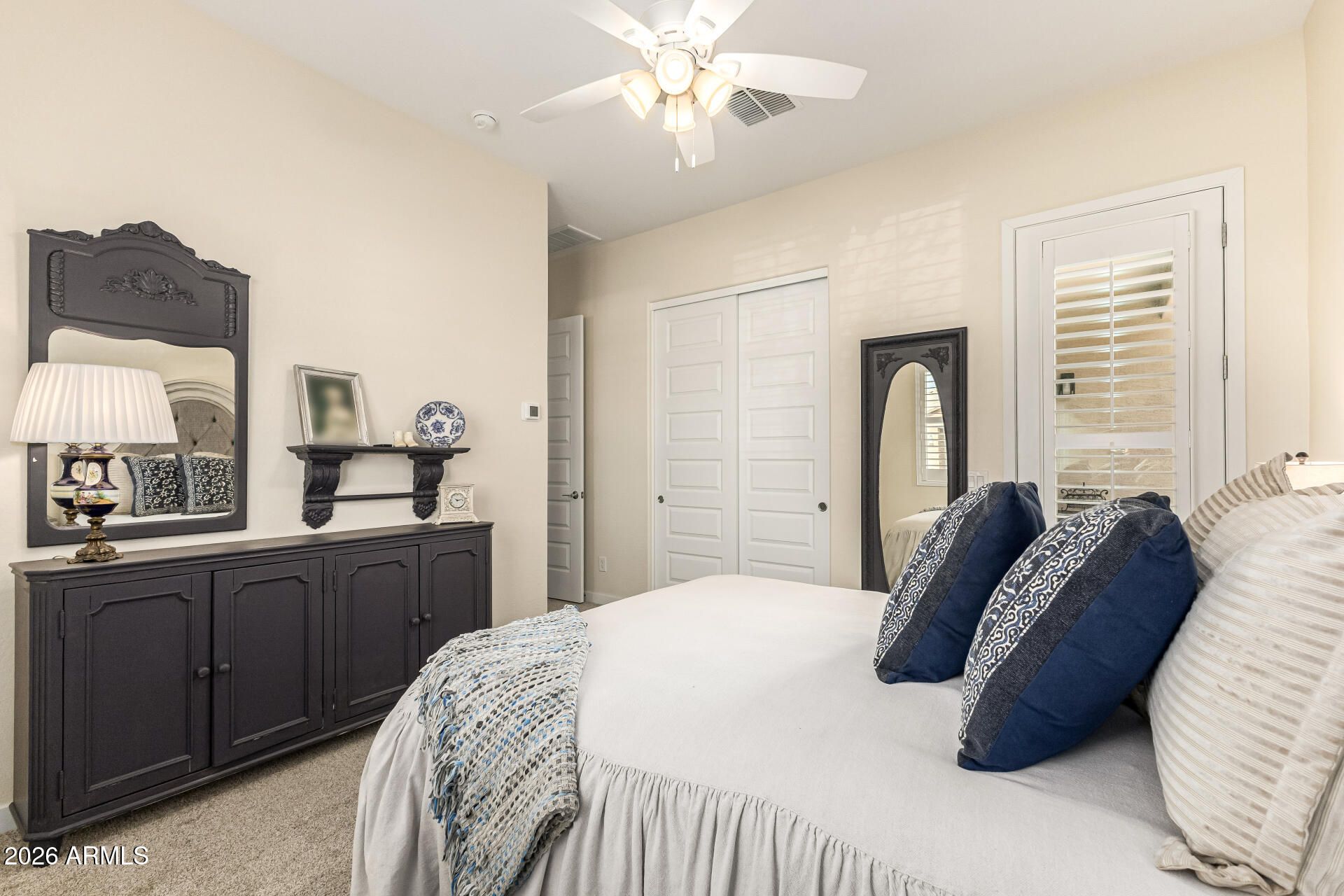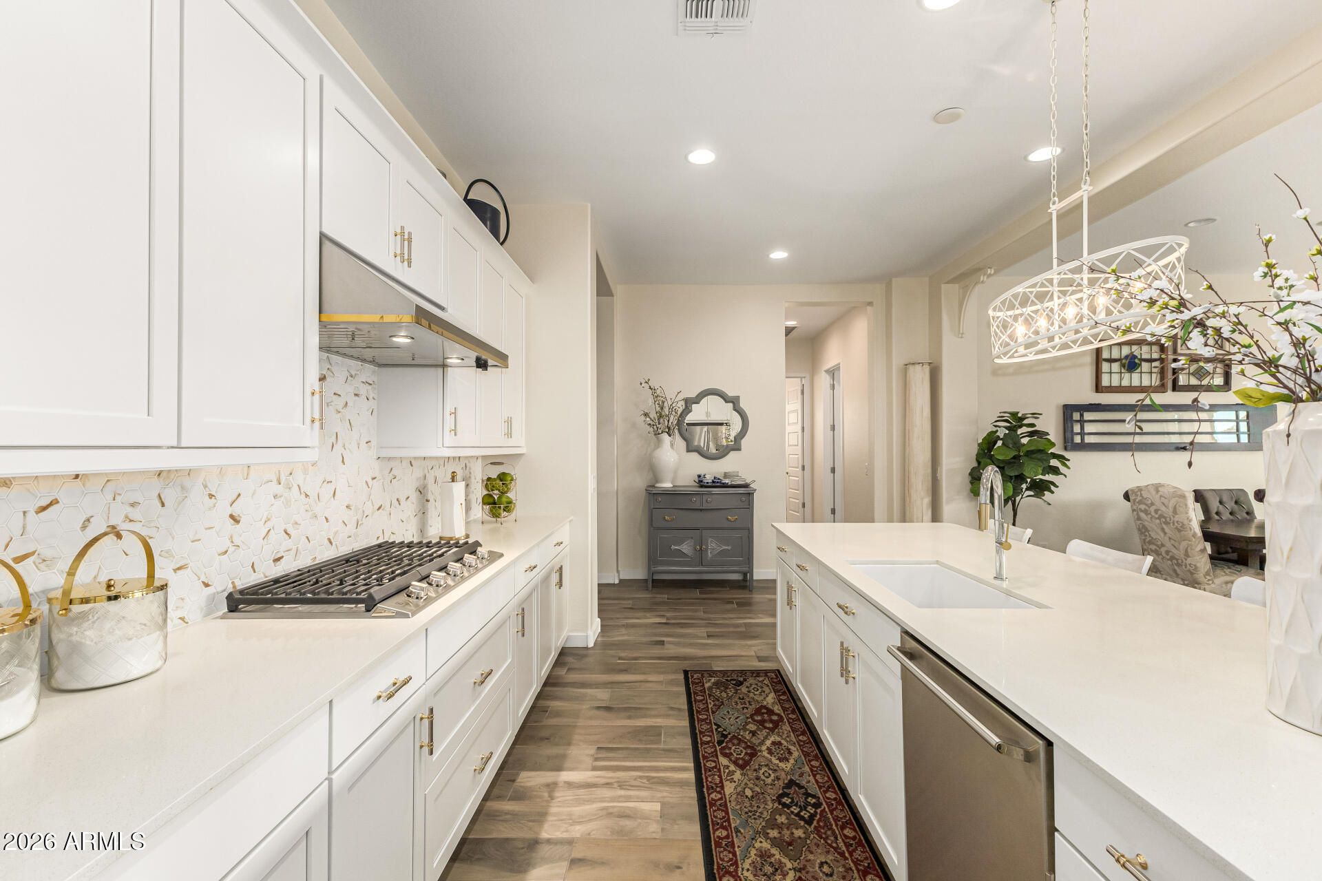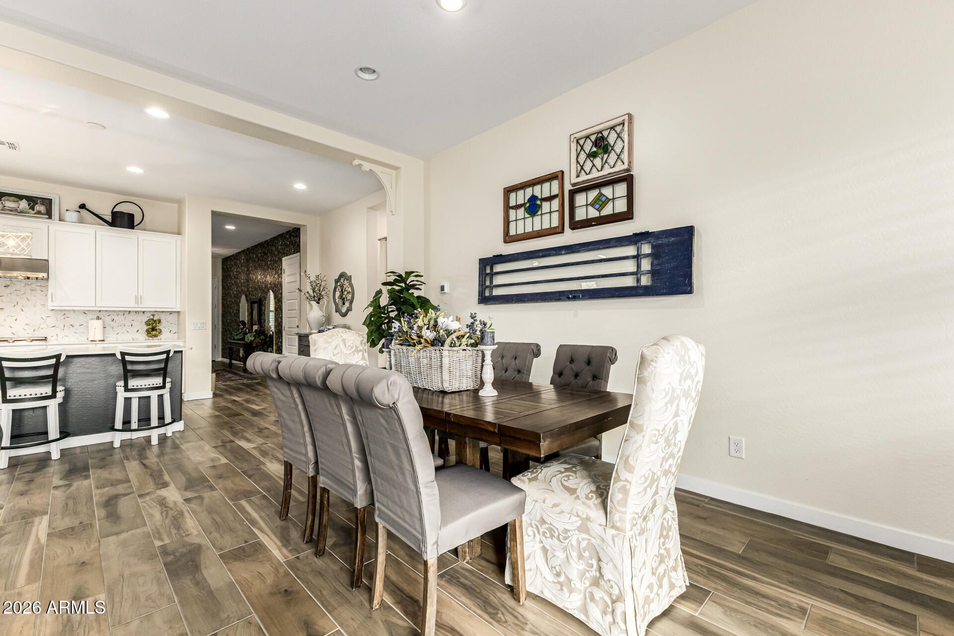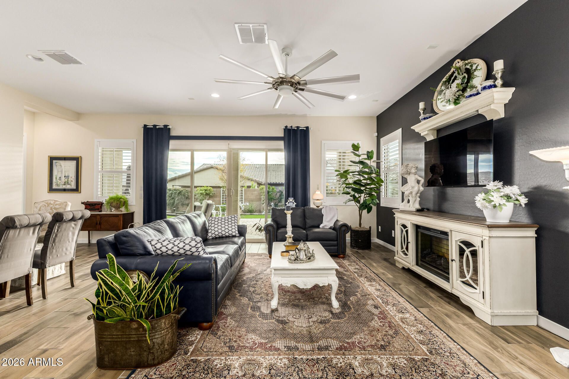 Welcome to a stand out home that feels as good as it looks--an elegant yet inviting retreat located within the gated and highly sought-after Heritage at Asante active adult community. From the moment you arrive, the home's charming curb appeal and gorgeous landscaping create a warm first impression, setting the stage for what awaits inside. Thoughtfully designed with luxury and comfort in mind, this residence offers a refined yet relaxed atmosphere that instantly feels like home. Inside, wood-look tile plank flooring flows beautifully through the main living areas, while bedrooms are accented with upgraded sculpted carpet, creating a perfect balance of style and softness. The open-concept design draws you into the heart of the home, where the kitchen truly shines. White cabinetry, quartz countertops, a gas cooktop, stainless steel appliances, pull-out drawers, custom hardware, a walk-in pantry, and a spacious island with breakfast bar make this kitchen both functional and inviting--ideal for everyday living and effortless entertaining. The kitchen opens seamlessly to the great room and dining area, filling the space with natural light and an easy, welcoming flow. A private guest suite positioned at the front of the home offers a full bath and its own covered patio, providing a comfortable and secluded space for visiting friends or family. The owner's suite serves as a peaceful retreat, featuring dual sinks, a large walk-in tiled shower, and a spacious walk-in closet with convenient direct access to the laundry room. Outdoor living is equally impressive, with two patios designed to extend your living space and invite relaxation. The backyard is a true highlight, showcasing gorgeous landscaping, widened pavers, lush greenery, and a serene setting that's perfect for enjoying quiet mornings or taking in Arizona's breathtaking sunsets. Life in Heritage at Asante is about more than just a beautiful home--it's about lifestyle. Residents enjoy resort-style amenities including a clubhouse, sparkling pool and spa, fitness center, pickleball courts, putting course, and scenic walking trails, all within a vibrant and welcoming 55+ community. With convenient access to nearby shopping, dining, and recreation, everything you need is close at hand. Whether you're searching for a full-time residence or the perfect seasonal retreat, this exceptional home offers comfort, connection, and timeless appeal. From the moment you step inside, you'll feel the harmony of thoughtful design and relaxed luxury. Welcome to the next chapter--you're going to love it here.