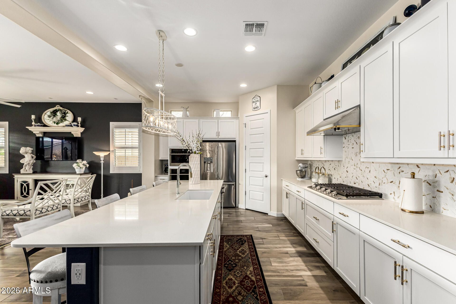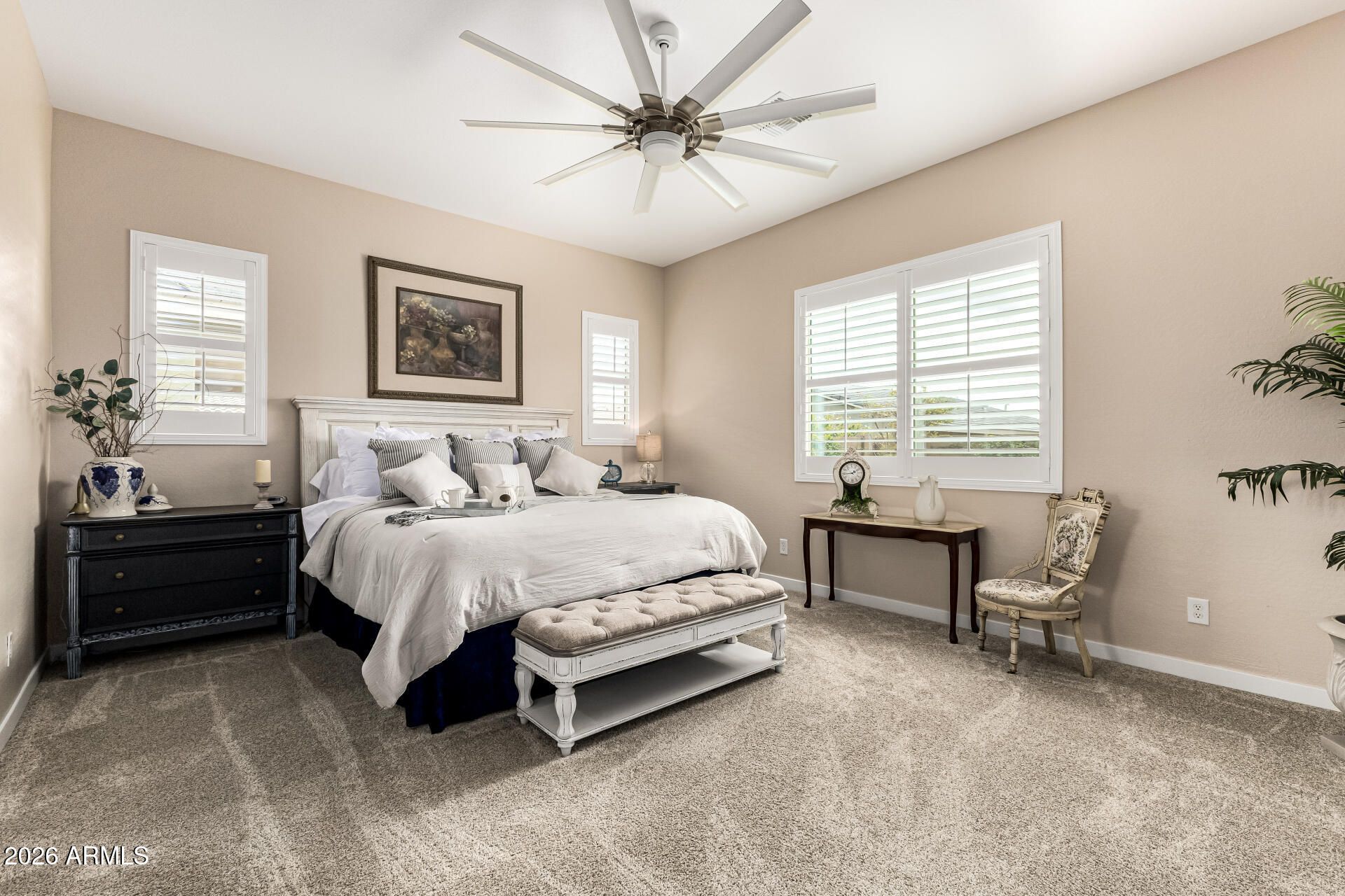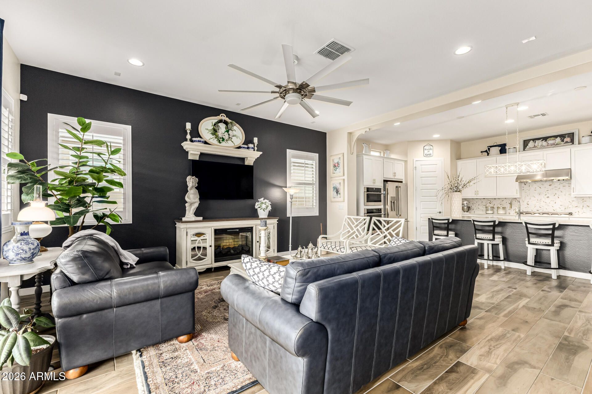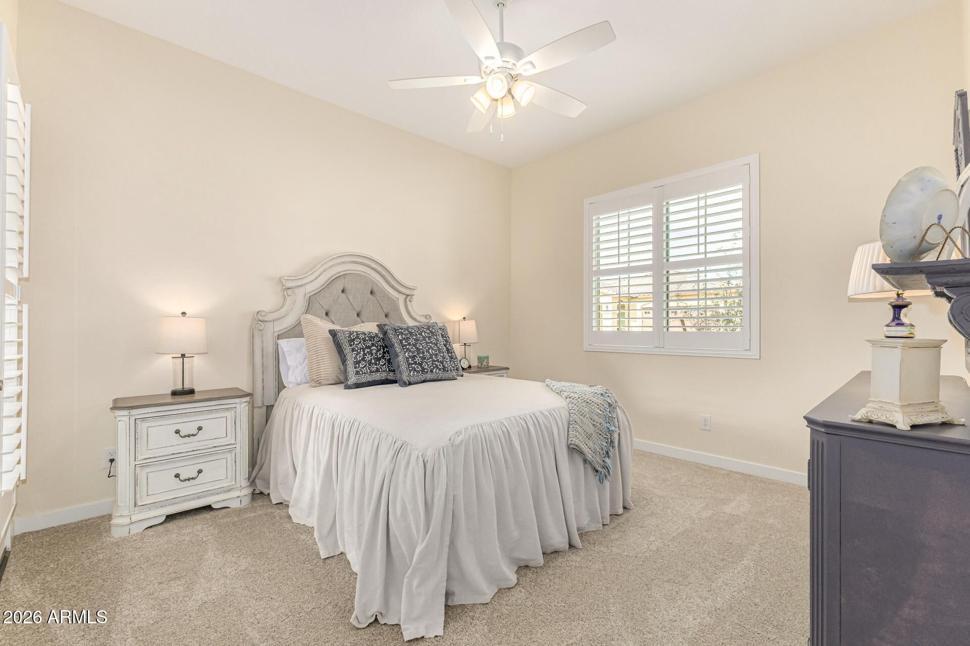 Welcome to a stand out home that feels as good as it looks--an elegant yet inviting retreat located within the gated and highly sought-after Heritage at Asante active adult community. From the moment you arrive, the home's charming curb appeal and gorgeous landscaping create a warm first impression, setting the stage for what awaits inside. Thoughtfully designed with luxury and comfort in mind, this residence offers a refined yet relaxed atmosphere that instantly feels like home. Inside, wood-look tile plank flooring flows beautifully through the main living areas, while bedrooms are accented with upgraded sculpted carpet, creating a perfect balance of style and softness. The open-concept design draws you into the heart of the home, where the kitchen truly shines. White cabinetry, quartz countertops, a gas cooktop, stainless steel appliances, pull-out drawers, custom hardware, a walk-in pantry, and a spacious island with breakfast bar make this kitchen both functional and inviting--ideal for everyday living and effortless entertaining. The kitchen opens seamlessly to the great room and dining area, filling the space with natural light and an easy, welcoming flow. A private guest suite positioned at the front of the home offers a full bath and its own covered patio, providing a comfortable and secluded space for visiting friends or family. The owner's suite serves as a peaceful retreat, featuring dual sinks, a large walk-in tiled shower, and a spacious walk-in closet with convenient direct access to the laundry room. Outdoor living is equally impressive, with two patios designed to extend your living space and invite relaxation. The backyard is a true highlight, showcasing gorgeous landscaping, widened pavers, lush greenery, and a serene setting that's perfect for enjoying quiet mornings or taking in Arizona's breathtaking sunsets. Life in Heritage at Asante is about more than just a beautiful home--it's about lifestyle. Residents enjoy resort-style amenities including a clubhouse, sparkling pool and spa, fitness center, pickleball courts, putting course, and scenic walking trails, all within a vibrant and welcoming 55+ community. With convenient access to nearby shopping, dining, and recreation, everything you need is close at hand. Whether you're searching for a full-time residence or the perfect seasonal retreat, this exceptional home offers comfort, connection, and timeless appeal. From the moment you step inside, you'll feel the harmony of thoughtful design and relaxed luxury. Welcome to the next chapter--you're going to love it here.
