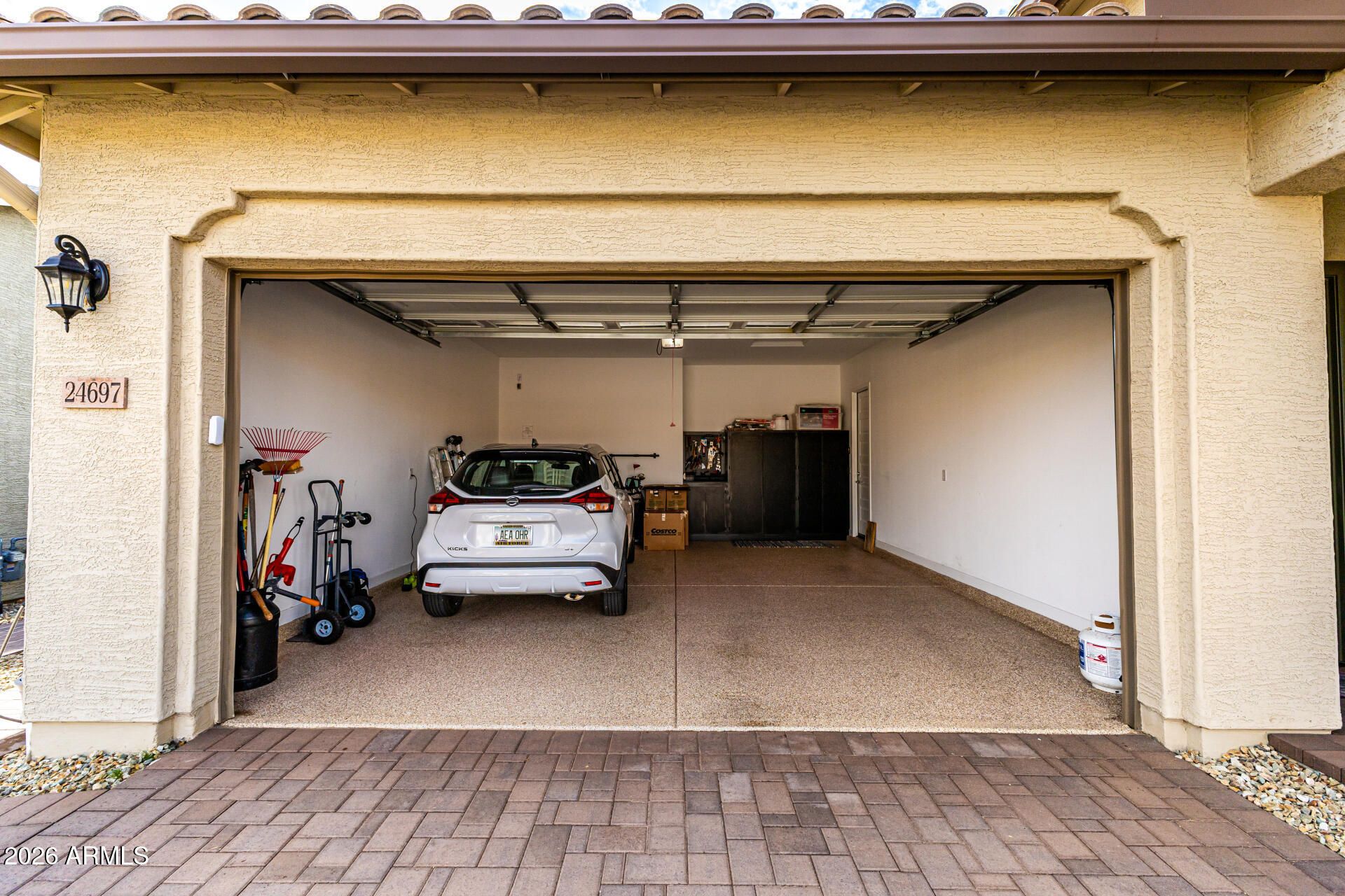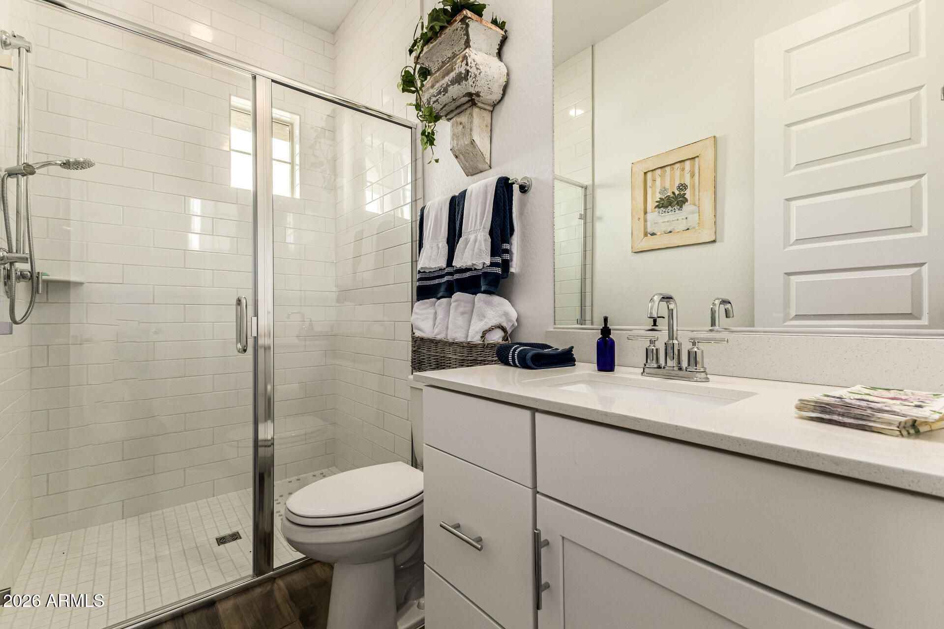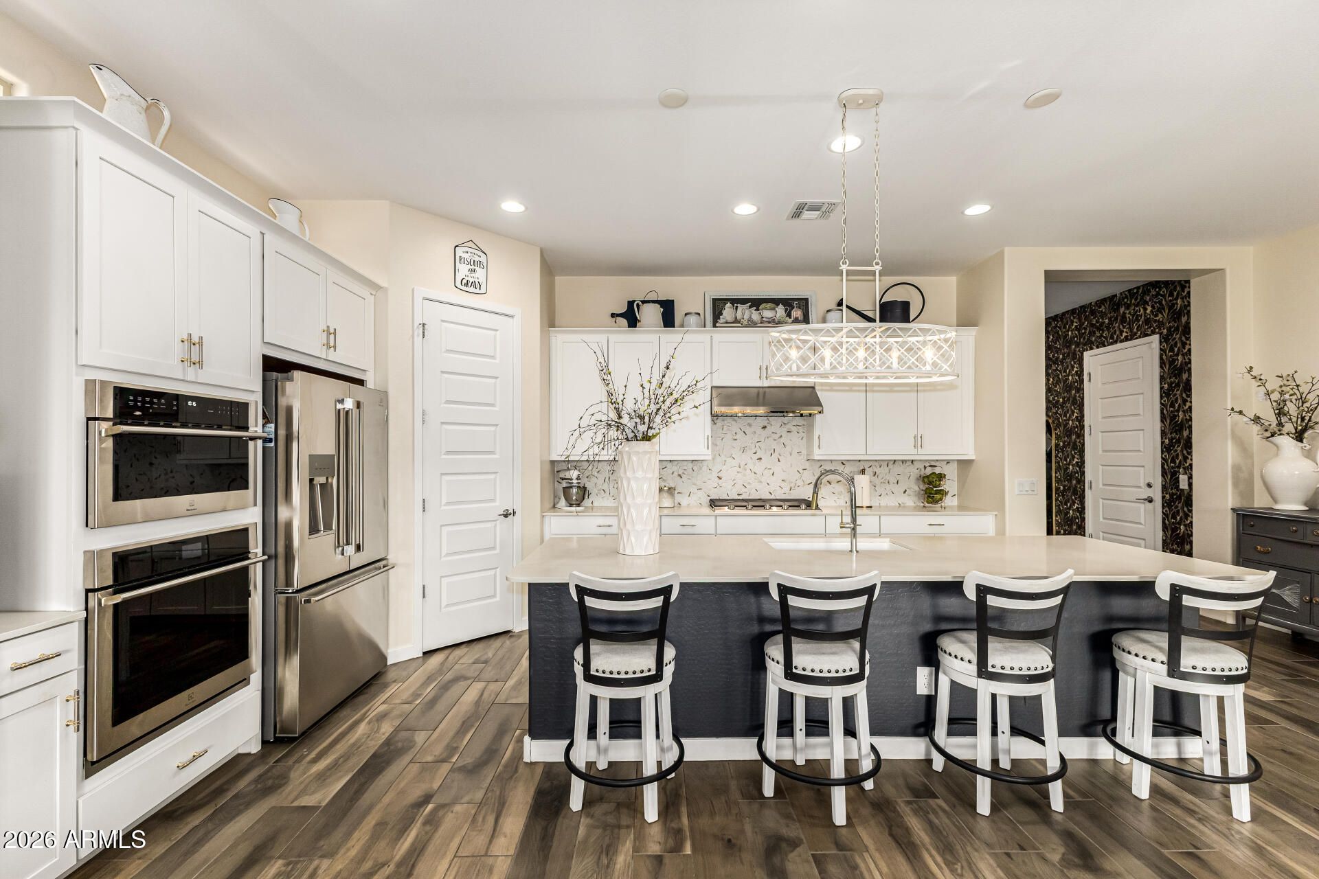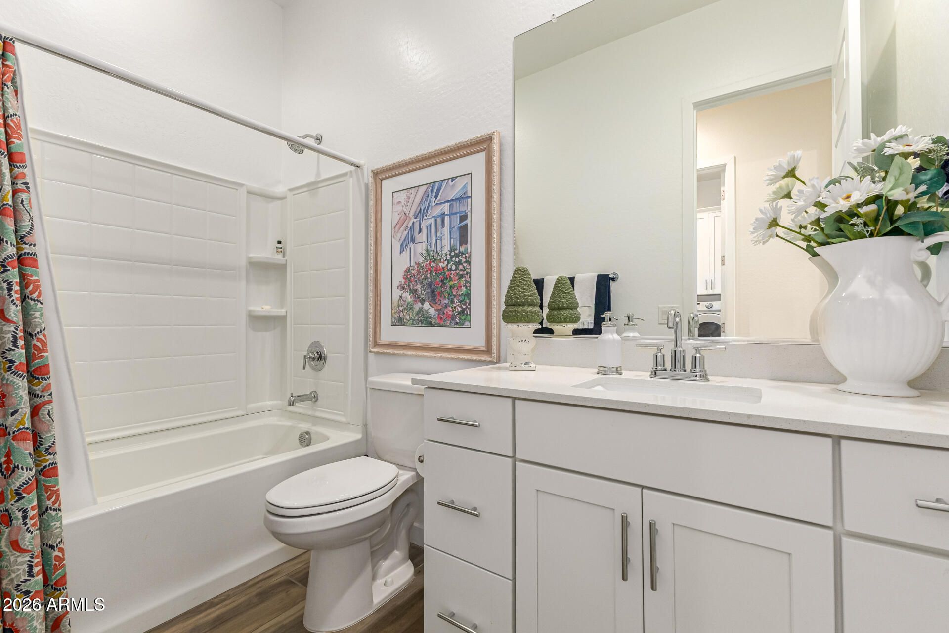 Welcome to a stand out home that feels as good as it looks--an elegant yet inviting retreat located within the gated and highly sought-after Heritage at Asante active adult community. From the moment you arrive, the home's charming curb appeal and gorgeous landscaping create a warm first impression, setting the stage for what awaits inside. Thoughtfully designed with luxury and comfort in mind, this residence offers a refined yet relaxed atmosphere that instantly feels like home. Inside, wood-look tile plank flooring flows beautifully through the main living areas, while bedrooms are accented with upgraded sculpted carpet, creating a perfect balance of style and softness. The open-concept design draws you into the heart of the home, where the kitchen truly shines. White cabinetry, quartz countertops, a gas cooktop, stainless steel appliances, pull-out drawers, custom hardware, a walk-in pantry, and a spacious island with breakfast bar make this kitchen both functional and inviting--ideal for everyday living and effortless entertaining. The kitchen opens seamlessly to the great room and dining area, filling the space with natural light and an easy, welcoming flow. A private guest suite positioned at the front of the home offers a full bath and its own covered patio, providing a comfortable and secluded space for visiting friends or family. The owner's suite serves as a peaceful retreat, featuring dual sinks, a large walk-in tiled shower, and a spacious walk-in closet with convenient direct access to the laundry room. Outdoor living is equally impressive, with two patios designed to extend your living space and invite relaxation. The backyard is a true highlight, showcasing gorgeous landscaping, widened pavers, lush greenery, and a serene setting that's perfect for enjoying quiet mornings or taking in Arizona's breathtaking sunsets. Life in Heritage at Asante is about more than just a beautiful home--it's about lifestyle. Residents enjoy resort-style amenities including a clubhouse, sparkling pool and spa, fitness center, pickleball courts, putting course, and scenic walking trails, all within a vibrant and welcoming 55+ community. With convenient access to nearby shopping, dining, and recreation, everything you need is close at hand. Whether you're searching for a full-time residence or the perfect seasonal retreat, this exceptional home offers comfort, connection, and timeless appeal. From the moment you step inside, you'll feel the harmony of thoughtful design and relaxed luxury. Welcome to the next chapter--you're going to love it here.