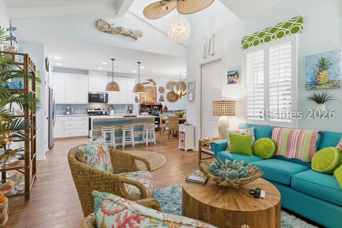 Welcome to your island-inspired retreat at 247 Tropics in Latitude Margaritaville Hilton Head-where every day feels like a vacation. This charming Caribbean cottage-style home offers 2 bedrooms, 2 bathrooms, and a flexible layout designed for both entertaining and easygoing coastal living.Step inside to discover a bright, open floor plan enhanced by Vaulted beamed ceilings and beautiful LVP flooring that flows seamlessly throughout the main living spaces. The home exudes warmth and character, the dining area-perfect is for hosting friends or enjoying a relaxed evening cocktail. The spacious living area opens effortlessly into the kitchen and dining space, creating an inviting atmosphere ideal for gatherings.A versatile flex room provides endless possibilities, whether you need a home office, guest bedroom, or cozy den. The primary suite offers comfort and privacy, while the second bedroom is perfect for visitors.Unwind in your screened-in lanai, a peaceful outdoor space perfect for morning coffee or relaxing after a day enjoying the community's resort-style amenities-like the pool, live music, and vibrant social scene. The two-car garage offers ample space, including room for your golf cart to fully embrace the Margaritaville lifestyle.This home blends comfort, style, and fun in one of the most sought-after active adult communities-don't miss your chance to start living the dream.