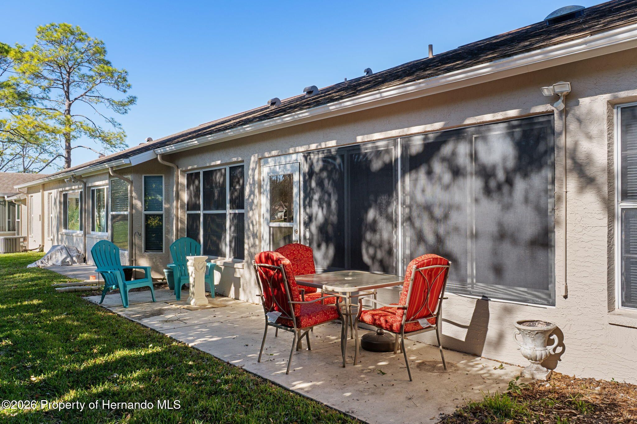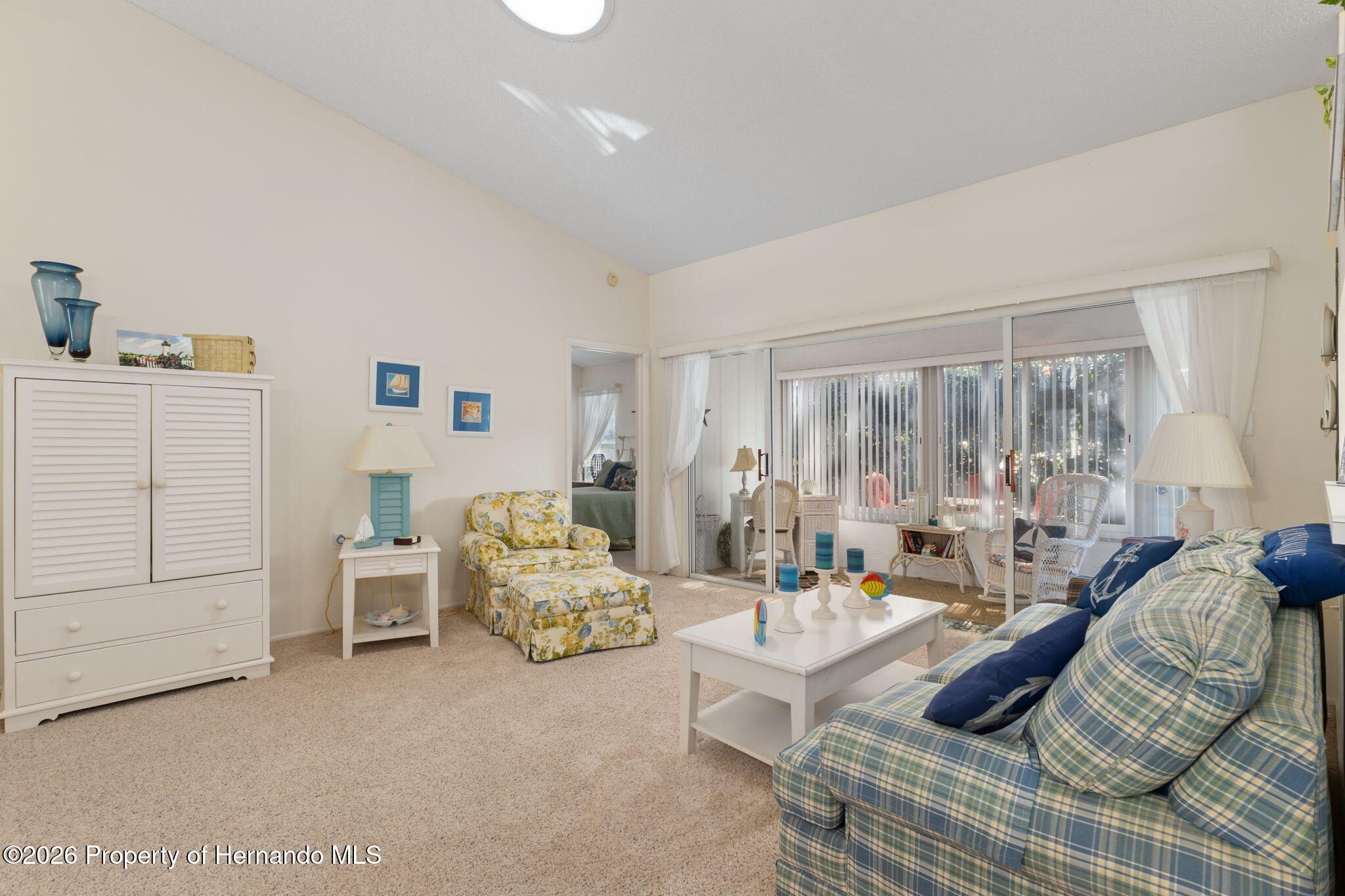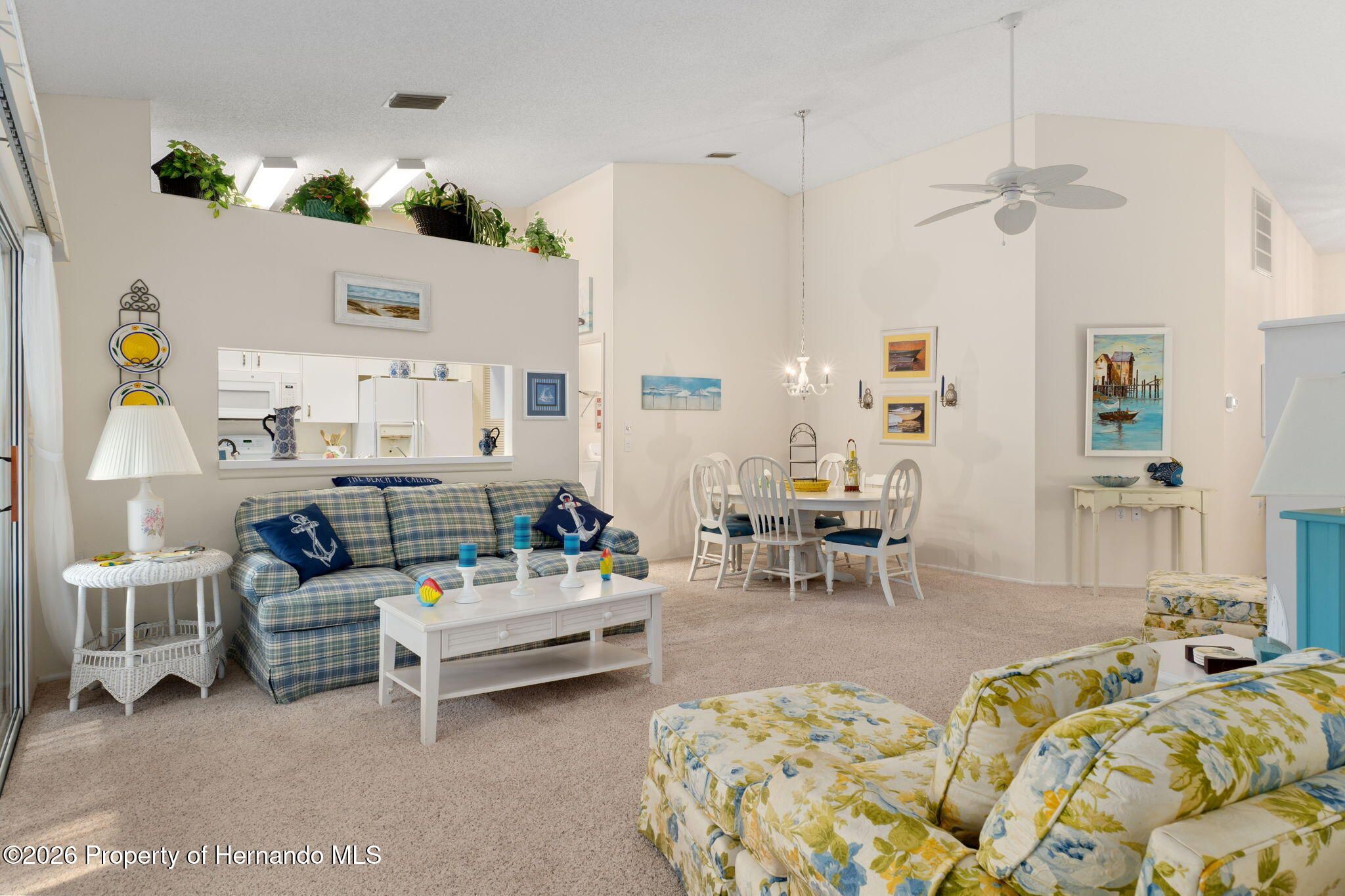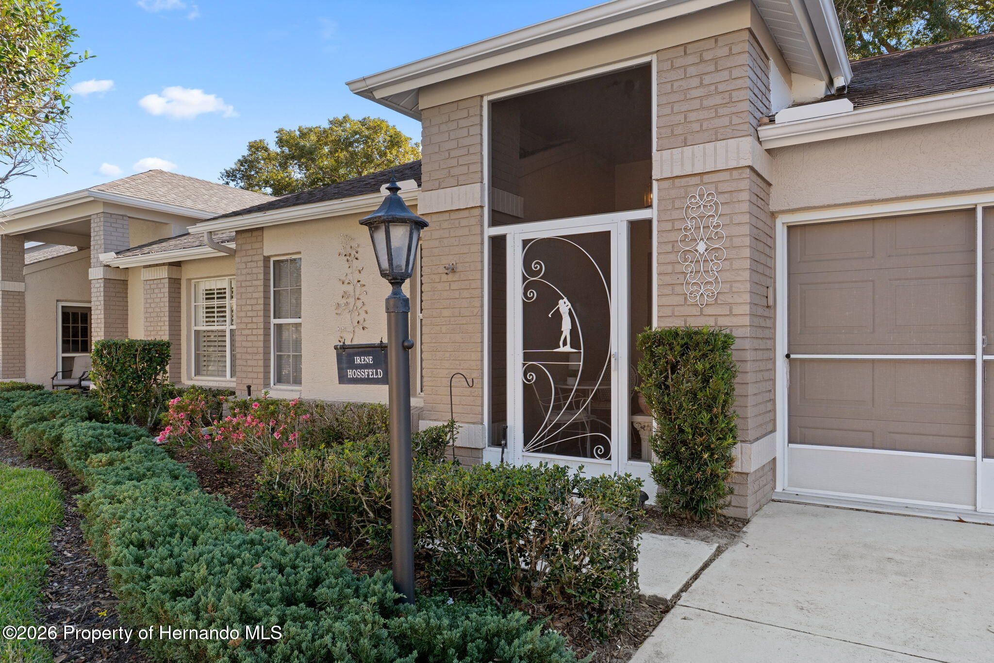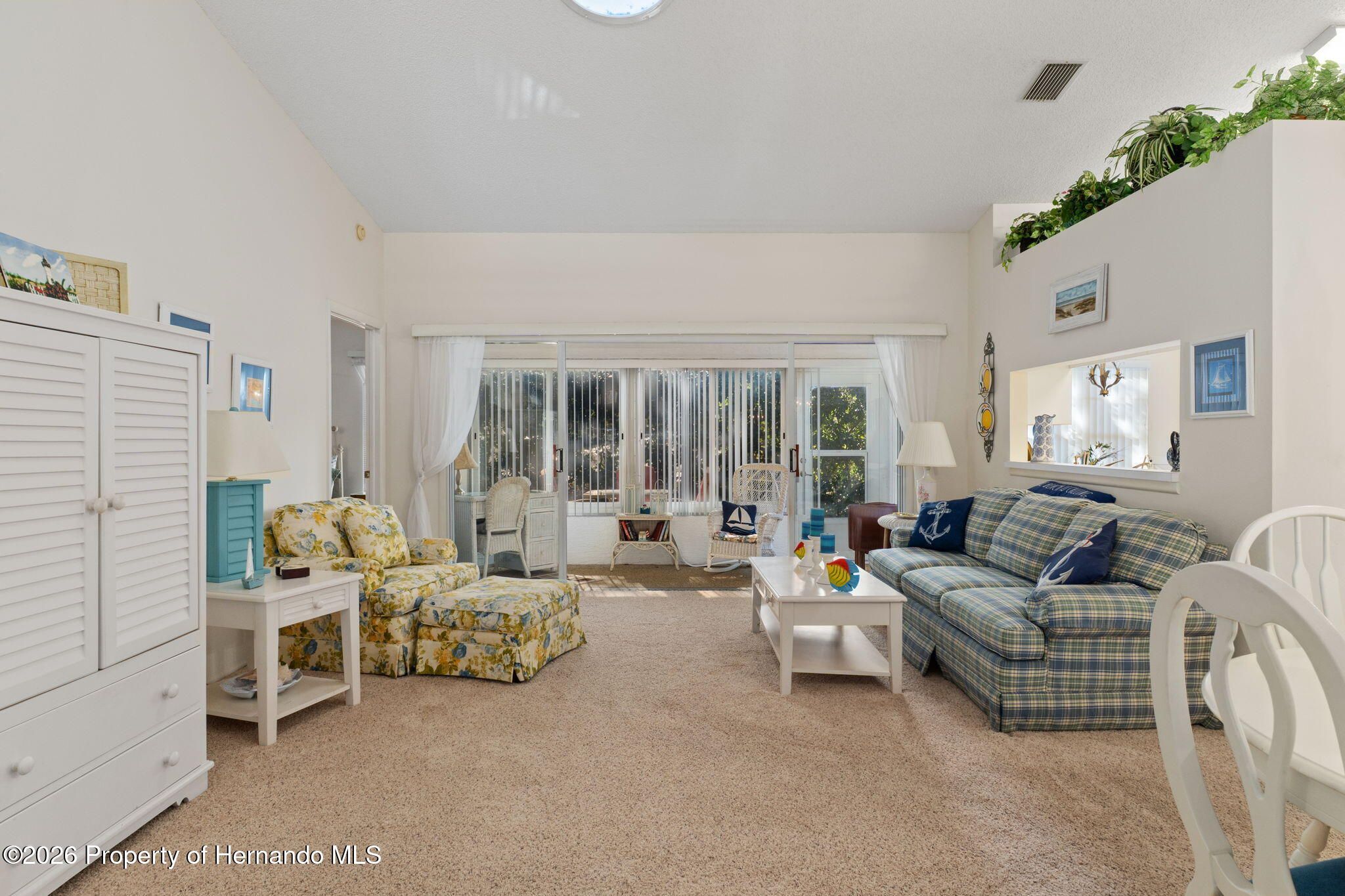 Welcome to effortless living in this delightful 2-bedroom, 2-bathroom villa nestled within the prestigious Timber Pines, an award-winning 55+ golfing community where the lifestyle is as inviting as the greens. This move-in-ready gem offers 1,245 square feet of thoughtfully designed living space, and here's the best part—it comes fully furnished with a golf cart included so that you can hit the links from day one! Even better, Country Ridge Village is pet-friendly and welcomes one dog, so your four-legged companion can enjoy this active lifestyle right alongside you. Step inside and be greeted by soaring vaulted ceilings that create an open, airy atmosphere. Natural light pours through the solar tube in the living room, illuminating the seamless flow between the living and dining areas. The kitchen opens beautifully to these spaces, making entertaining a breeze thanks to its new microwave and stove. The master suite serves as your private retreat, featuring two generous walk-in closets and an ensuite bath with dual vanity, a convenient step-down shower, and its own solar tube for natural brightness. Your guests will appreciate their own comfortable bedroom with charming built-in bookshelves and integrated speakers, plus a full bath with tub-shower combination. The enclosed lanai with acrylic windows transforms into a versatile three-season room, perfect for a cozy home office or morning coffee spot. Step outside to your private backyard oasis, complete with a cement patio and lush privacy bushes. Recent updates provide peace of mind, including a brand-new water heater installed in January 2026, a roof replaced in 2015, and an interior laundry room with a new washer and a newer dryer. The enclosed front porch and screened garage doors add extra comfort and convenience. A one-year home warranty valued at 550 sweetens this already irresistible package. Schedule your private showing today! Priced competitively and located in a desirable area with convenient access to community features, shopping, and recreation, this property is well-suited for buyers seeking comfort and value. You won't be bored with over 100 clubs, a Country Club, a Performing Arts Center, a Wellness Center, golf, bocce, tennis, and pickleball.