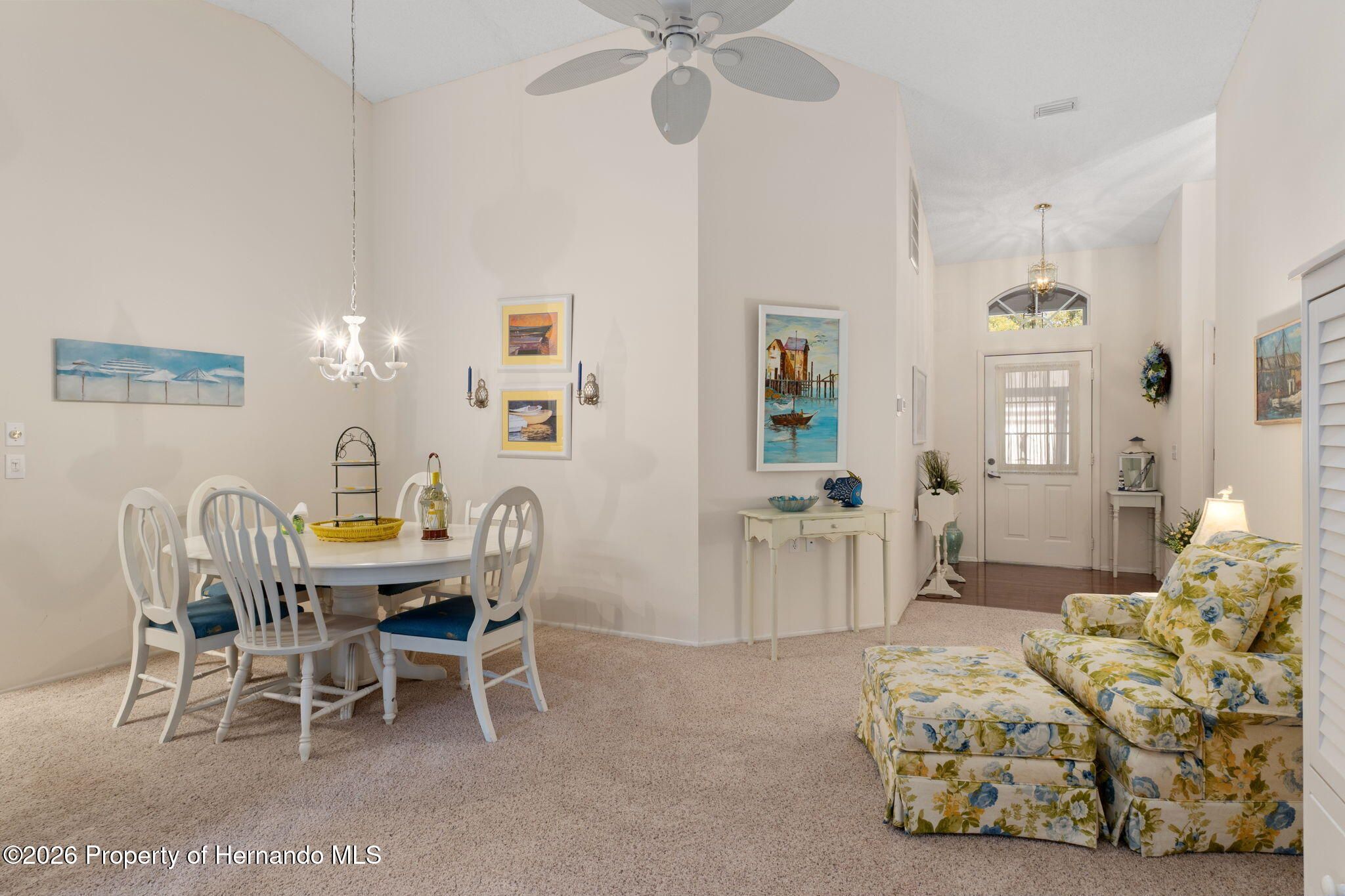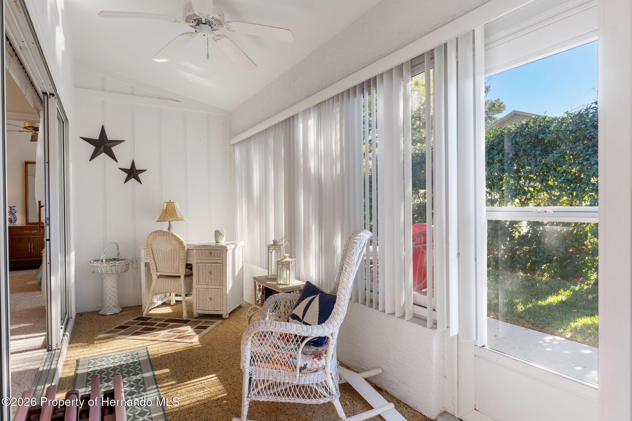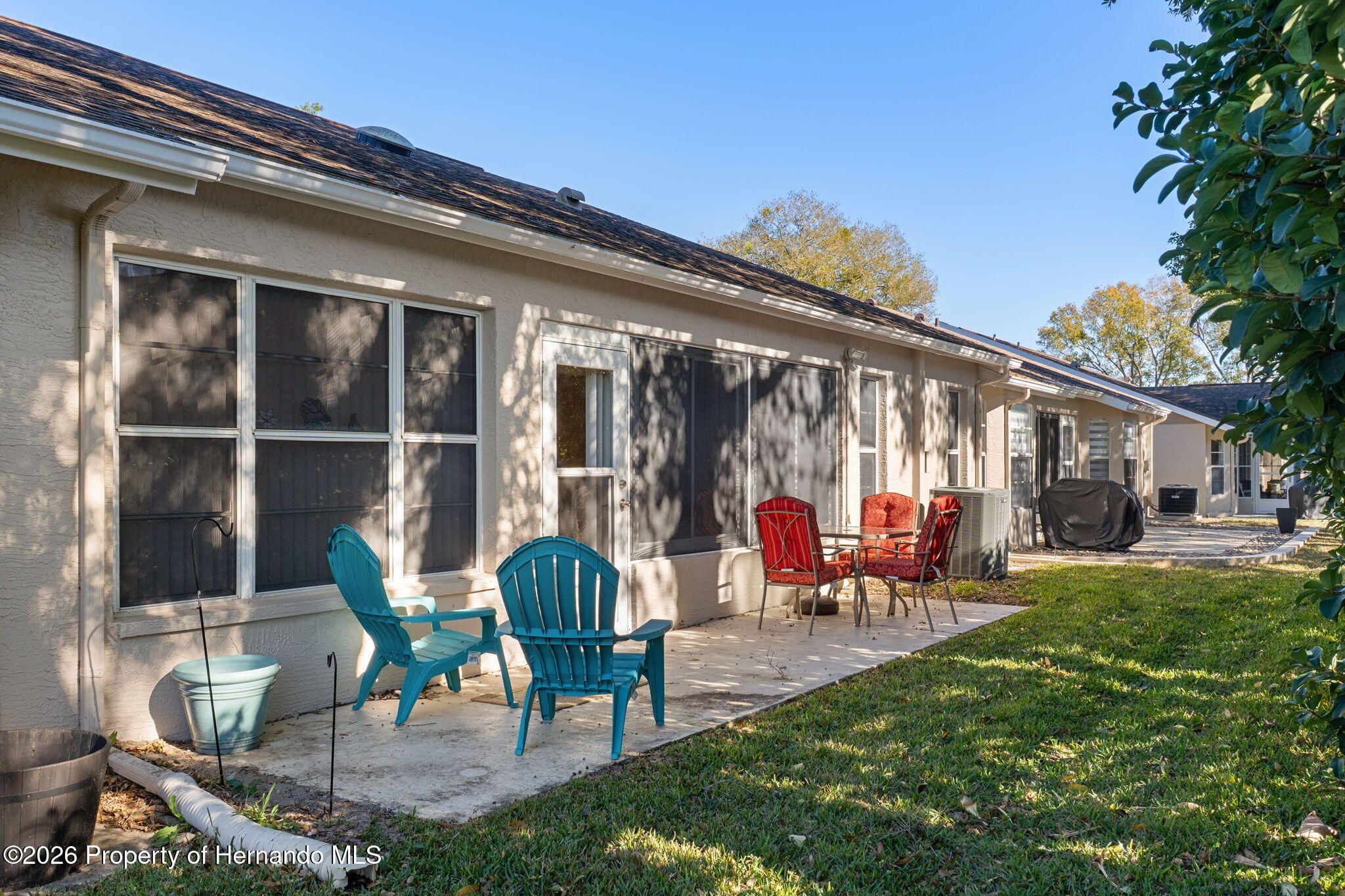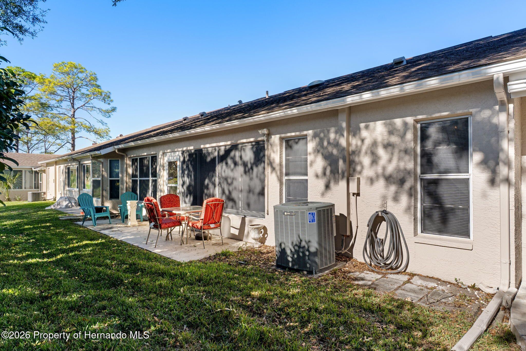 Welcome to effortless living in this delightful 2-bedroom, 2-bathroom villa nestled within the prestigious Timber Pines, an award-winning 55+ golfing community where the lifestyle is as inviting as the greens. This move-in-ready gem offers 1,245 square feet of thoughtfully designed living space, and here's the best part—it comes fully furnished with a golf cart included so that you can hit the links from day one! Even better, Country Ridge Village is pet-friendly and welcomes one dog, so your four-legged companion can enjoy this active lifestyle right alongside you. Step inside and be greeted by soaring vaulted ceilings that create an open, airy atmosphere. Natural light pours through the solar tube in the living room, illuminating the seamless flow between the living and dining areas. The kitchen opens beautifully to these spaces, making entertaining a breeze thanks to its new microwave and stove. The master suite serves as your private retreat, featuring two generous walk-in closets and an ensuite bath with dual vanity, a convenient step-down shower, and its own solar tube for natural brightness. Your guests will appreciate their own comfortable bedroom with charming built-in bookshelves and integrated speakers, plus a full bath with tub-shower combination. The enclosed lanai with acrylic windows transforms into a versatile three-season room, perfect for a cozy home office or morning coffee spot. Step outside to your private backyard oasis, complete with a cement patio and lush privacy bushes. Recent updates provide peace of mind, including a brand-new water heater installed in January 2026, a roof replaced in 2015, and an interior laundry room with a new washer and a newer dryer. The enclosed front porch and screened garage doors add extra comfort and convenience. A one-year home warranty valued at 550 sweetens this already irresistible package. Schedule your private showing today! Priced competitively and located in a desirable area with convenient access to community features, shopping, and recreation, this property is well-suited for buyers seeking comfort and value. You won't be bored with over 100 clubs, a Country Club, a Performing Arts Center, a Wellness Center, golf, bocce, tennis, and pickleball.