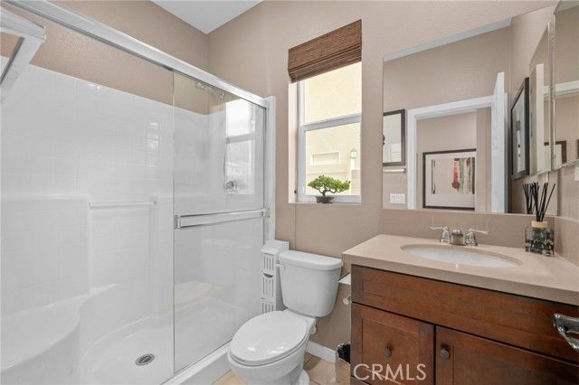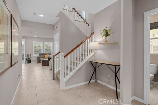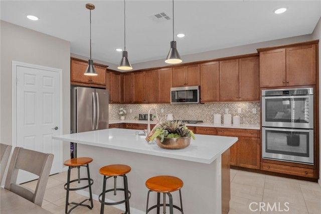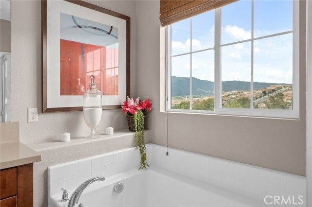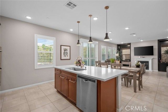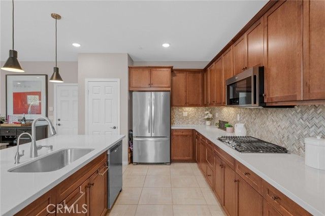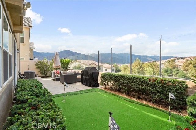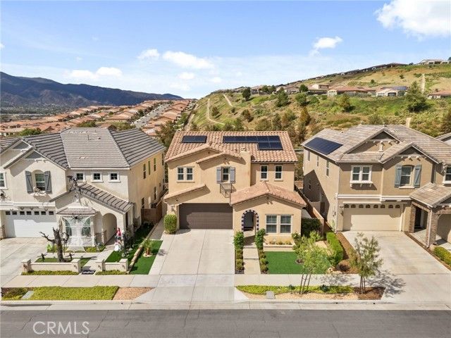 This stunning former model home is located in the exclusive gated community of Terramor and offers beautiful curb appeal with well-maintained, manicured yards and low-maintenance turf in both the front and back. Featuring 4 bedrooms and 3 bathrooms, this home boasts a highly desirable floor plan with one bedroom with a walk-in closet and a full bathroom conveniently located on the main floor. The open-concept living space showcases a gorgeous kitchen with a large island, maple-stained cabinetry, tile backsplash, built-in cooktop, and double oven—all overlooking the spacious family room and capturing the scenic views beyond. The family room is enhanced by custom built-ins, a cozy gas fireplace, and plantation shutters with roll-down shades for added comfort and privacy. Upstairs, you'll find a versatile loft, a luxurious primary suite with impressive views, two additional bedrooms—also offering stunning views—a full bathroom, and a dedicated laundry room. Step outside to a fully landscaped backyard oasis, complete with fruit trees, mini putting green, and no neighbors behind you, providing both beauty and privacy. The epoxied garage floors add a clean, durable finish to the spacious garage. Residents of Terramor enjoy resort-style amenities, including gated entry, parks, pool, clubhouse, walking and hiking trails, and more. This energy-efficient home also includes solar panels, making it as smart as it is stylish.