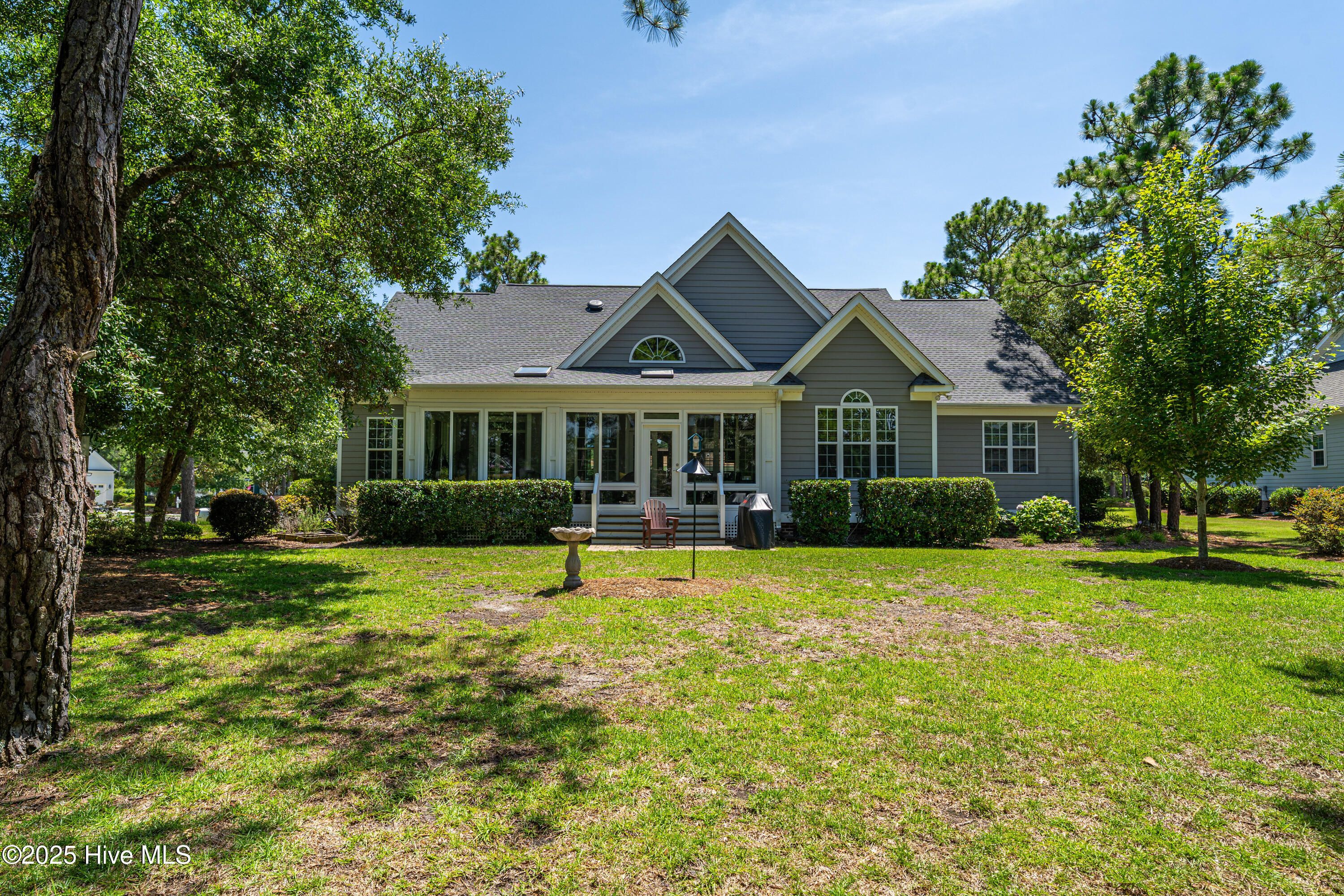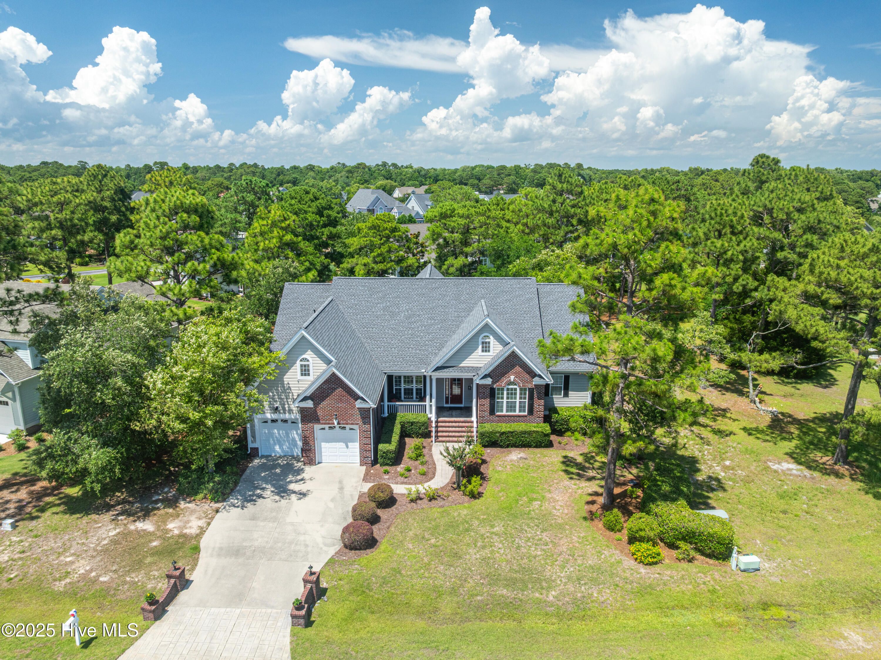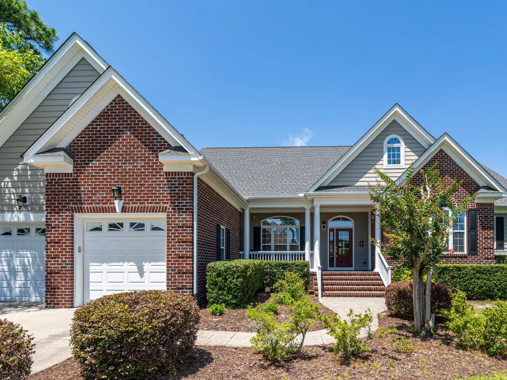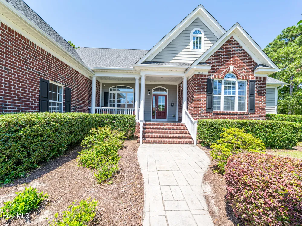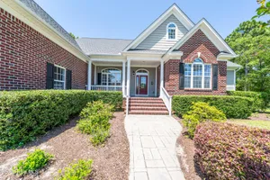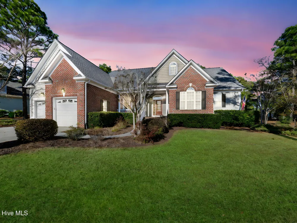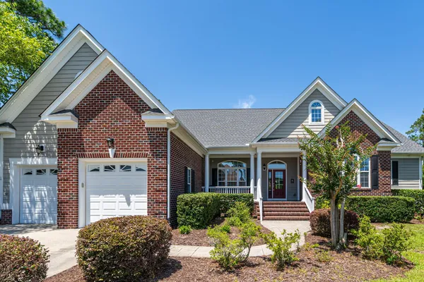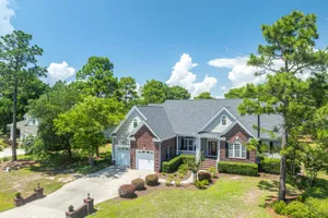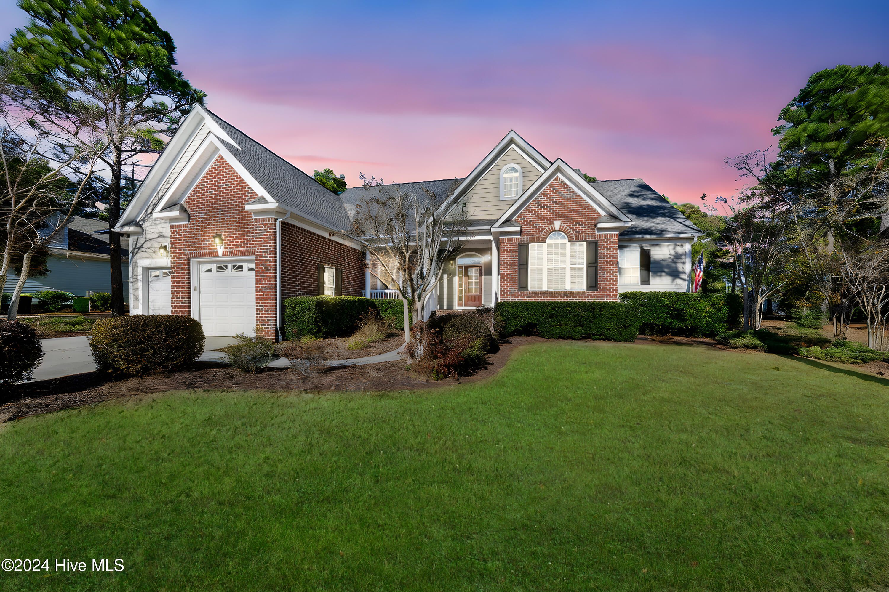 This beautiful custom built home boasts an attractive curb appeal that exudes timeless charm and character. The excellent location puts you just minutes away from the full-scale St. James marina, waterway park a 10-acre outdoor area located on the Intracoastal waterway, and minutes away from The Grove entrance. Brick pillars frame the entrance to a stamped concrete driveway, setting a warm and welcoming tone. The exterior showcases a harmonious blend of multiple rooflines (new roof installed 2024), elegant brickwork, and durable cement composite siding. A rocking chair front porch, accented by graceful arched transom windows, invites you to relax. Spanning over 3,500 heated square feet, the residence offers three spacious bedrooms and three and a half bathrooms, making it the perfect blend of comfort and sophistication. The entryway is a showcase of elegant and thoughtful design, featuring gorgeous hardwood flooring. Crown molding and custom wainscoted columns frame the formal dining room, which is further distinguished by an octagon-shaped tray ceiling and a striking wood inlay border that adds intricate detail to the floor. The space flows seamlessly into the great room, where a vaulted ceiling and a cozy gas fireplace create a warm and inviting ambiance. Custom recessed built-ins add both functionality and charm, while natural light warms the room through atrium doors crowned with a graceful half-moon transom window. These doors lead to a tiled sunroom with skylights, offering peaceful views of the beautifully landscaped backyard, complete with a paver patio for outdoor relaxation and entertaining. The spacious kitchen features wood cabinetry, stainless steel appliances, black granite counters, a built-in wine rack, and a tumbled stone backsplash. Bar-height seating at the peninsula opens to the breakfast nook, which boasts a vaulted ceiling, custom wainscoting, and picturesque backyard views. The owner's suite is tucked away for maximum privacy and features a
