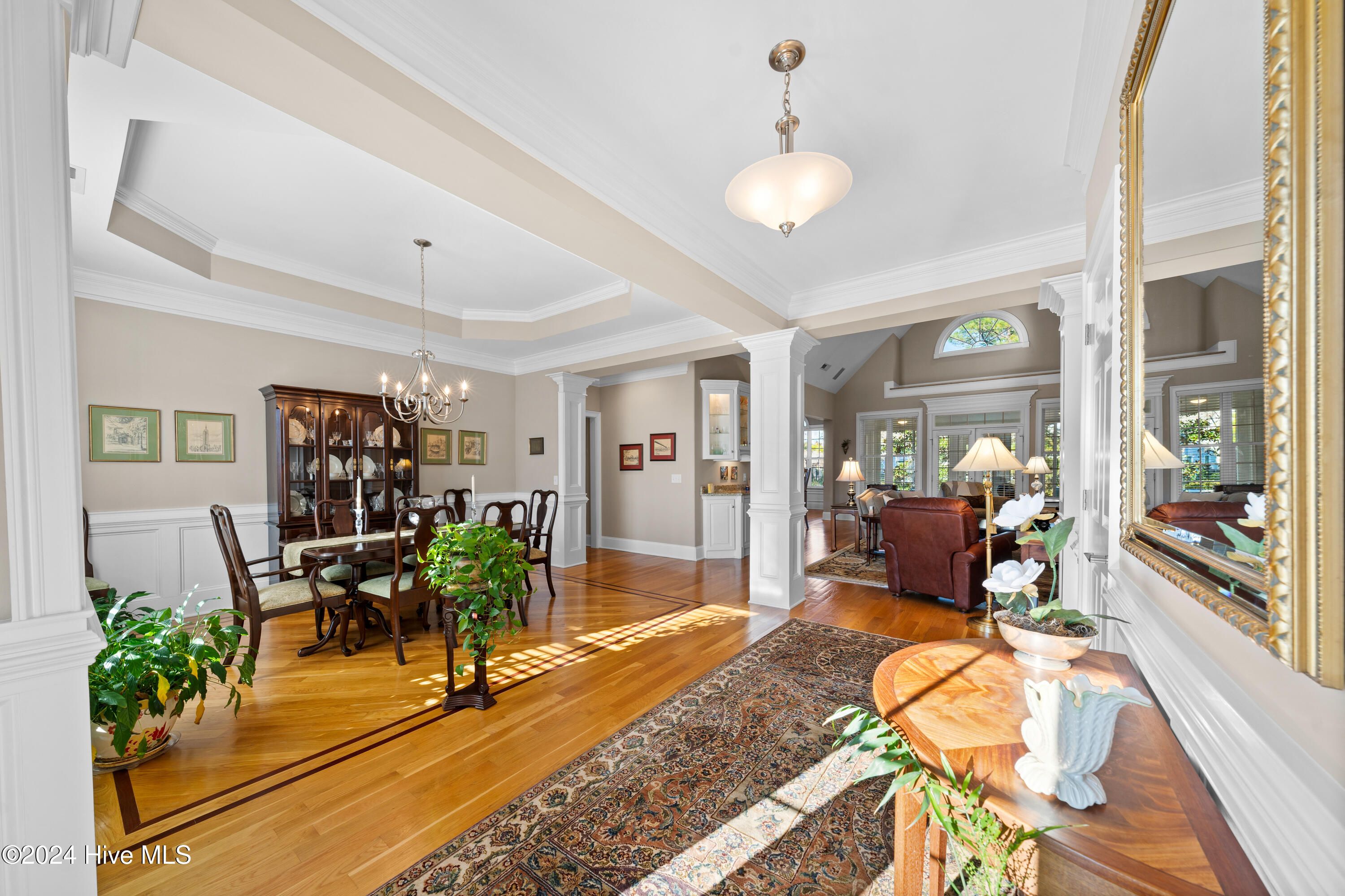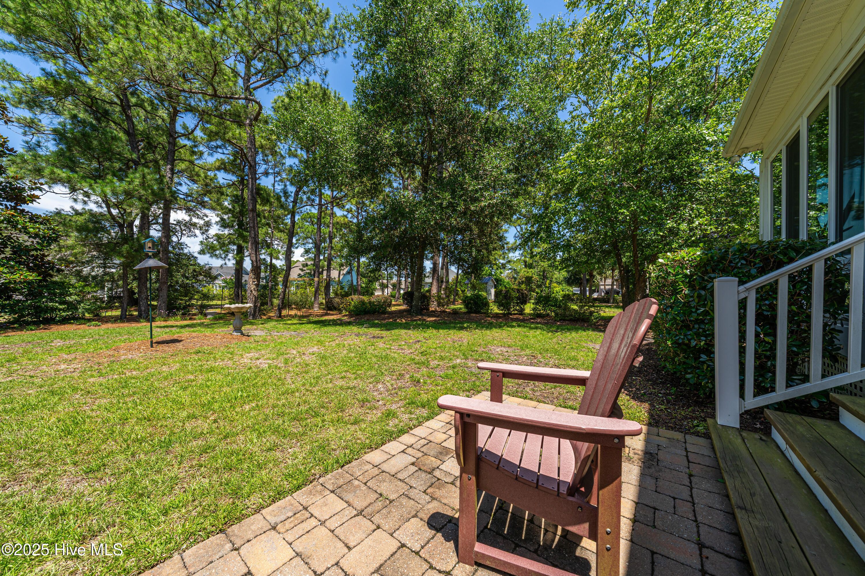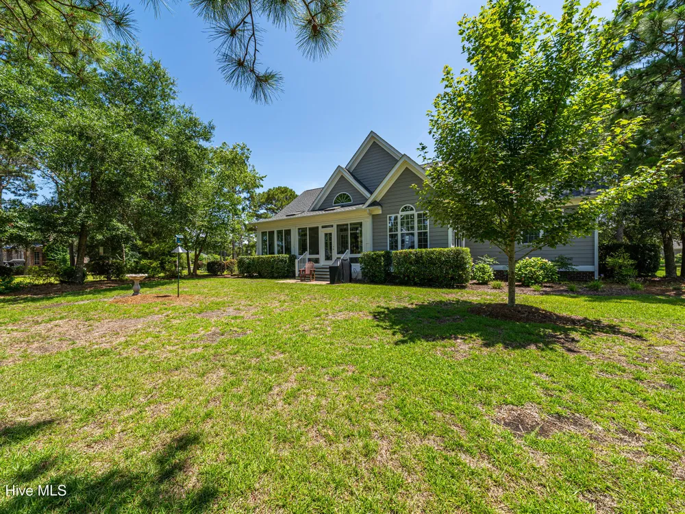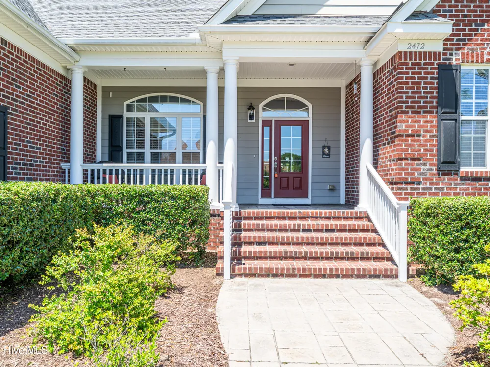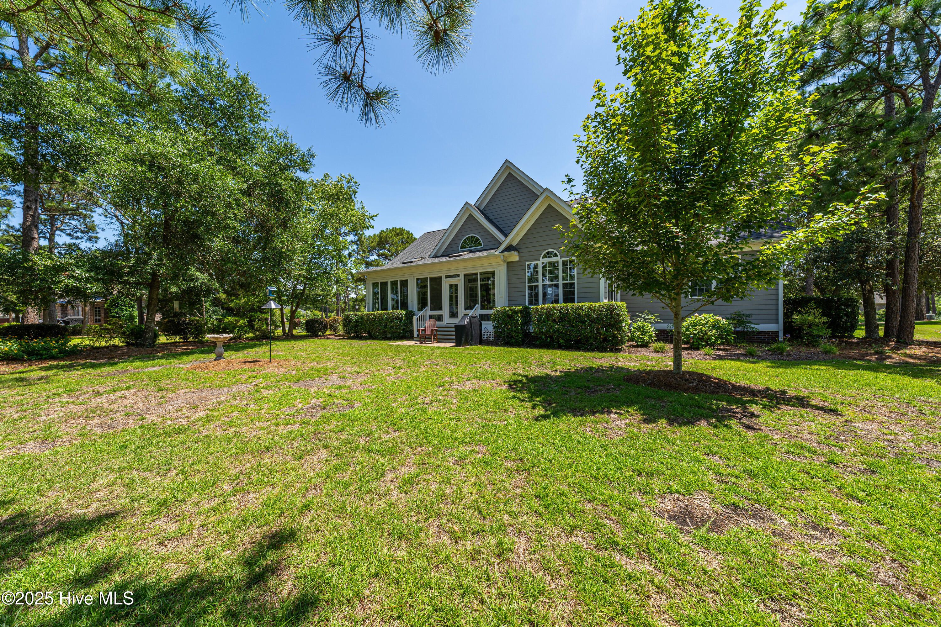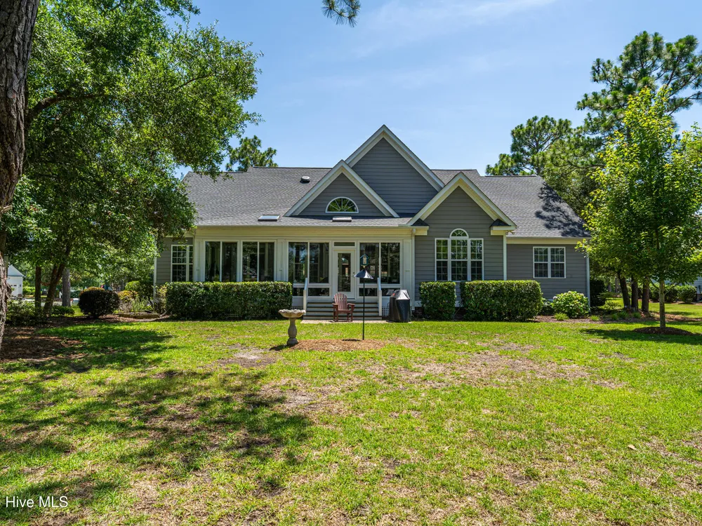 This beautiful custom built home boasts an attractive curb appeal that exudes timeless charm and character. The excellent location puts you just minutes away from the full-scale St. James marina, waterway park a 10-acre outdoor area located on the Intracoastal waterway, and minutes away from The Grove entrance. Brick pillars frame the entrance to a stamped concrete driveway, setting a warm and welcoming tone. The exterior showcases a harmonious blend of multiple rooflines (new roof installed 2024), elegant brickwork, and durable cement composite siding. A rocking chair front porch, accented by graceful arched transom windows, invites you to relax. Spanning over 3,500 heated square feet, the residence offers three spacious bedrooms and three and a half bathrooms, making it the perfect blend of comfort and sophistication. The entryway is a showcase of elegant and thoughtful design, featuring gorgeous hardwood flooring. Crown molding and custom wainscoted columns frame the formal dining room, which is further distinguished by an octagon-shaped tray ceiling and a striking wood inlay border that adds intricate detail to the floor. The space flows seamlessly into the great room, where a vaulted ceiling and a cozy gas fireplace create a warm and inviting ambiance. Custom recessed built-ins add both functionality and charm, while natural light warms the room through atrium doors crowned with a graceful half-moon transom window. These doors lead to a tiled sunroom with skylights, offering peaceful views of the beautifully landscaped backyard, complete with a paver patio for outdoor relaxation and entertaining. The spacious kitchen features wood cabinetry, stainless steel appliances, black granite counters, a built-in wine rack, and a tumbled stone backsplash. Bar-height seating at the peninsula opens to the breakfast nook, which boasts a vaulted ceiling, custom wainscoting, and picturesque backyard views. The owner's suite is tucked away for maximum privacy and features a