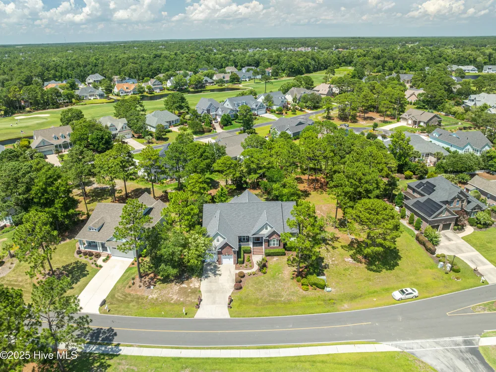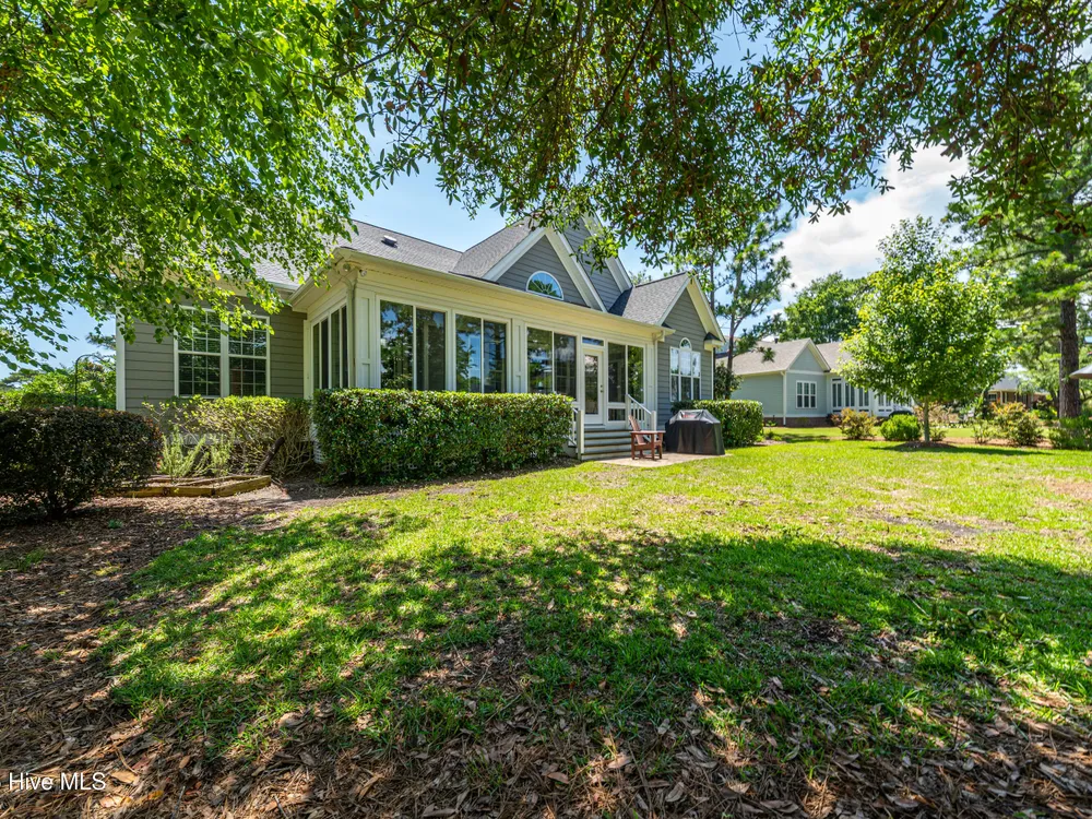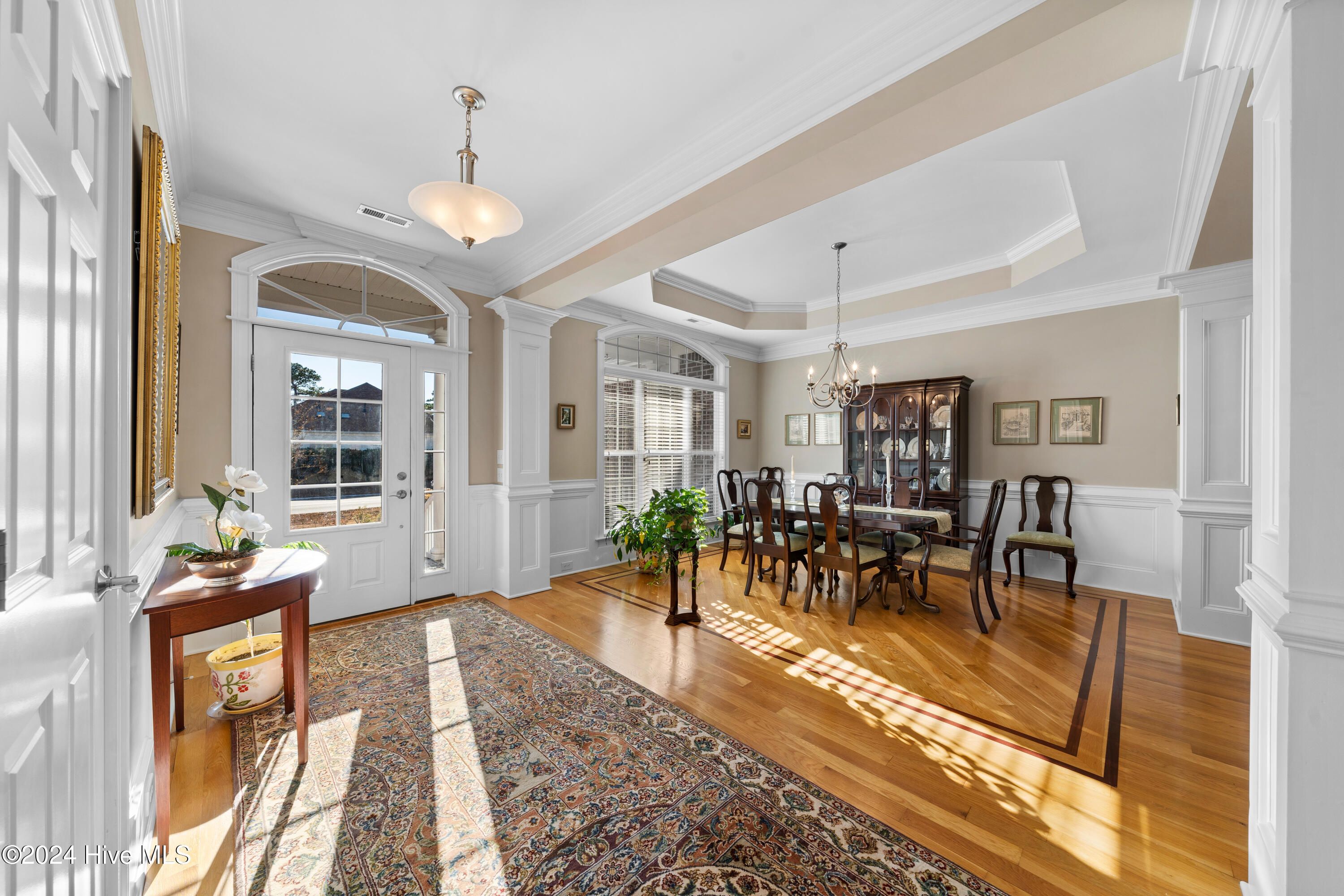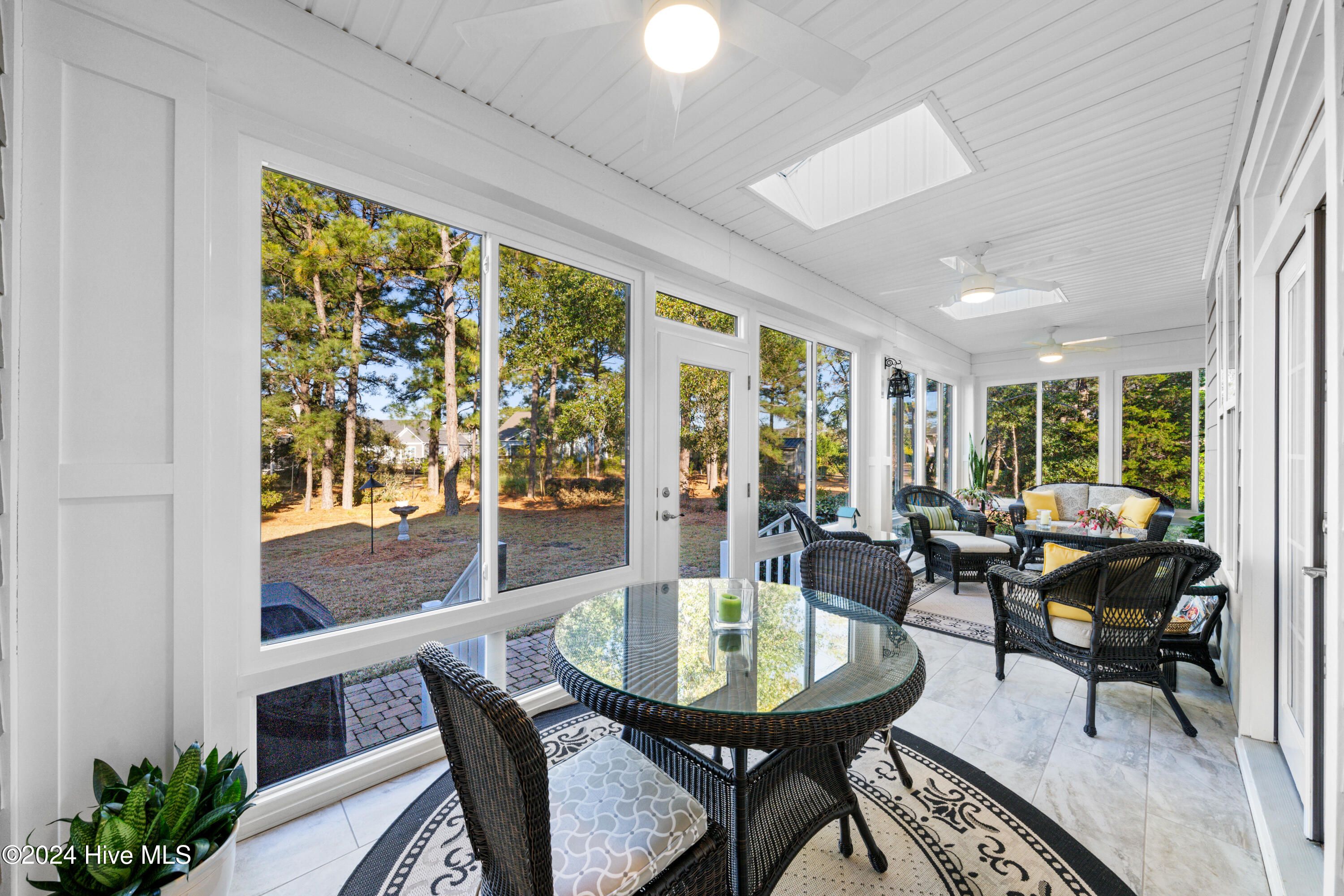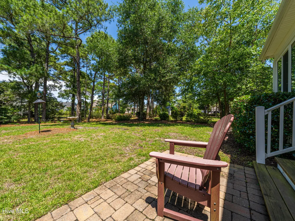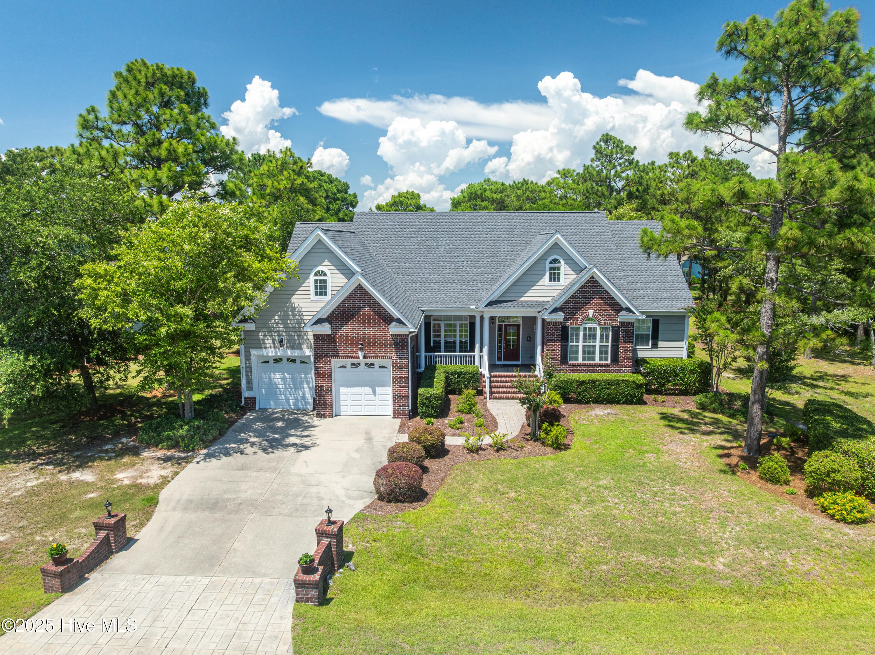 This beautiful custom built home boasts an attractive curb appeal that exudes timeless charm and character. The excellent location puts you just minutes away from the full-scale St. James marina, waterway park a 10-acre outdoor area located on the Intracoastal waterway, and minutes away from The Grove entrance. Brick pillars frame the entrance to a stamped concrete driveway, setting a warm and welcoming tone. The exterior showcases a harmonious blend of multiple rooflines (new roof installed 2024), elegant brickwork, and durable cement composite siding. A rocking chair front porch, accented by graceful arched transom windows, invites you to relax. Spanning over 3,500 heated square feet, the residence offers three spacious bedrooms and three and a half bathrooms, making it the perfect blend of comfort and sophistication. The entryway is a showcase of elegant and thoughtful design, featuring gorgeous hardwood flooring. Crown molding and custom wainscoted columns frame the formal dining room, which is further distinguished by an octagon-shaped tray ceiling and a striking wood inlay border that adds intricate detail to the floor. The space flows seamlessly into the great room, where a vaulted ceiling and a cozy gas fireplace create a warm and inviting ambiance. Custom recessed built-ins add both functionality and charm, while natural light warms the room through atrium doors crowned with a graceful half-moon transom window. These doors lead to a tiled sunroom with skylights, offering peaceful views of the beautifully landscaped backyard, complete with a paver patio for outdoor relaxation and entertaining. The spacious kitchen features wood cabinetry, stainless steel appliances, black granite counters, a built-in wine rack, and a tumbled stone backsplash. Bar-height seating at the peninsula opens to the breakfast nook, which boasts a vaulted ceiling, custom wainscoting, and picturesque backyard views. The owner's suite is tucked away for maximum privacy and features a