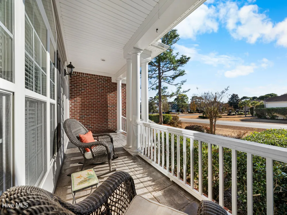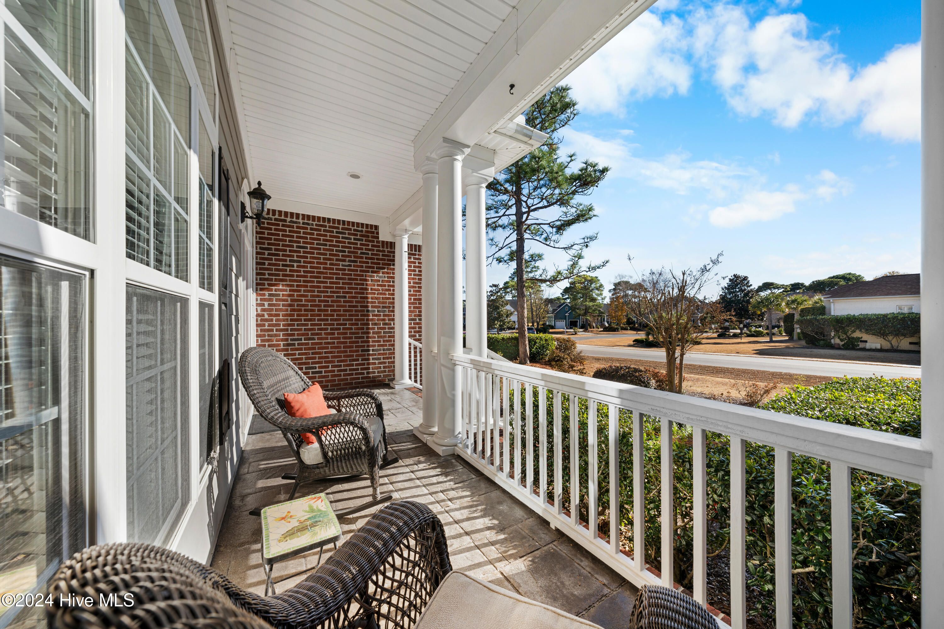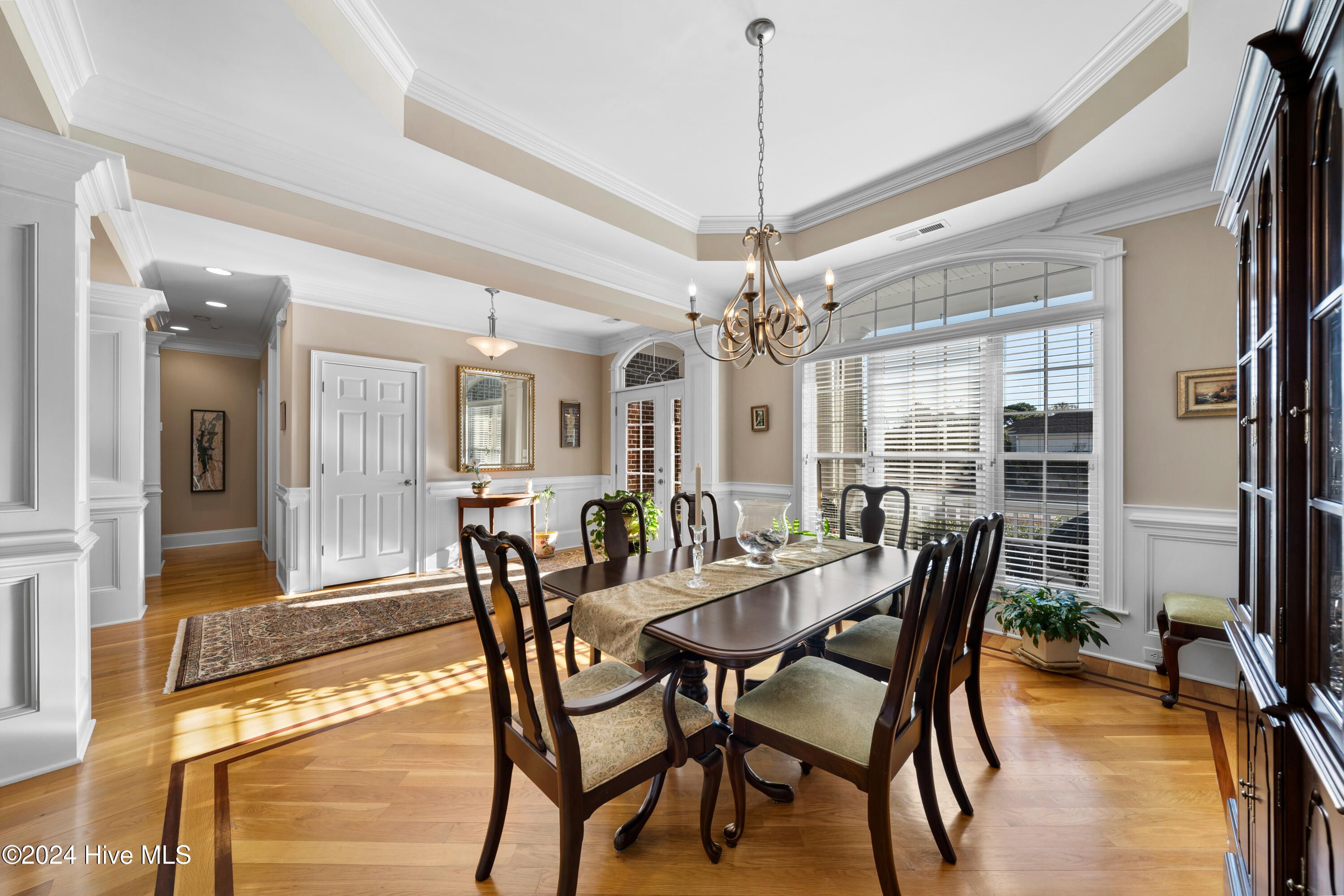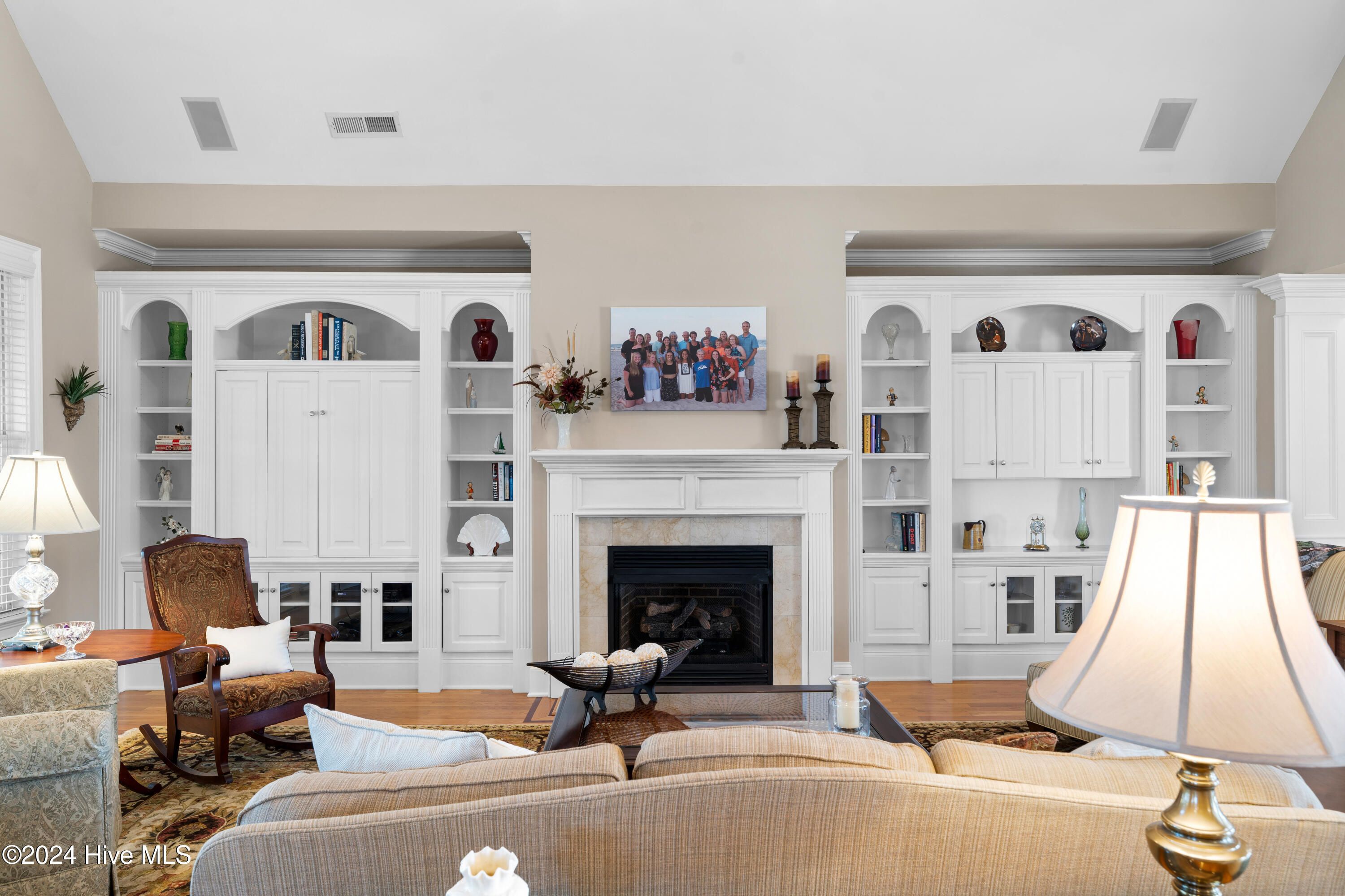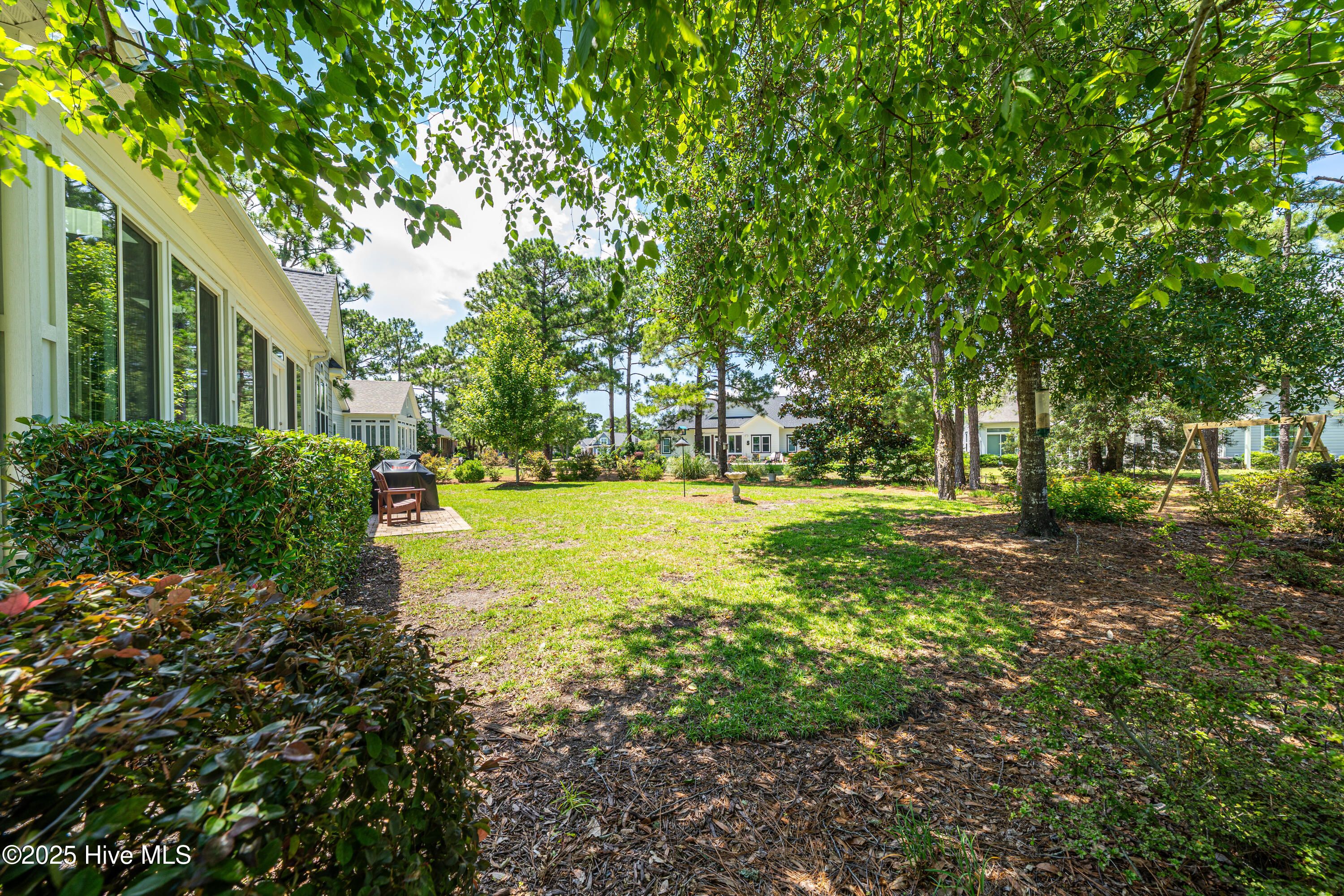 This beautiful custom built home boasts an attractive curb appeal that exudes timeless charm and character. The excellent location puts you just minutes away from the full-scale St. James marina, waterway park a 10-acre outdoor area located on the Intracoastal waterway, and minutes away from The Grove entrance. Brick pillars frame the entrance to a stamped concrete driveway, setting a warm and welcoming tone. The exterior showcases a harmonious blend of multiple rooflines (new roof installed 2024), elegant brickwork, and durable cement composite siding. A rocking chair front porch, accented by graceful arched transom windows, invites you to relax. Spanning over 3,500 heated square feet, the residence offers three spacious bedrooms and three and a half bathrooms, making it the perfect blend of comfort and sophistication. The entryway is a showcase of elegant and thoughtful design, featuring gorgeous hardwood flooring. Crown molding and custom wainscoted columns frame the formal dining room, which is further distinguished by an octagon-shaped tray ceiling and a striking wood inlay border that adds intricate detail to the floor. The space flows seamlessly into the great room, where a vaulted ceiling and a cozy gas fireplace create a warm and inviting ambiance. Custom recessed built-ins add both functionality and charm, while natural light warms the room through atrium doors crowned with a graceful half-moon transom window. These doors lead to a tiled sunroom with skylights, offering peaceful views of the beautifully landscaped backyard, complete with a paver patio for outdoor relaxation and entertaining. The spacious kitchen features wood cabinetry, stainless steel appliances, black granite counters, a built-in wine rack, and a tumbled stone backsplash. Bar-height seating at the peninsula opens to the breakfast nook, which boasts a vaulted ceiling, custom wainscoting, and picturesque backyard views. The owner's suite is tucked away for maximum privacy and features a
