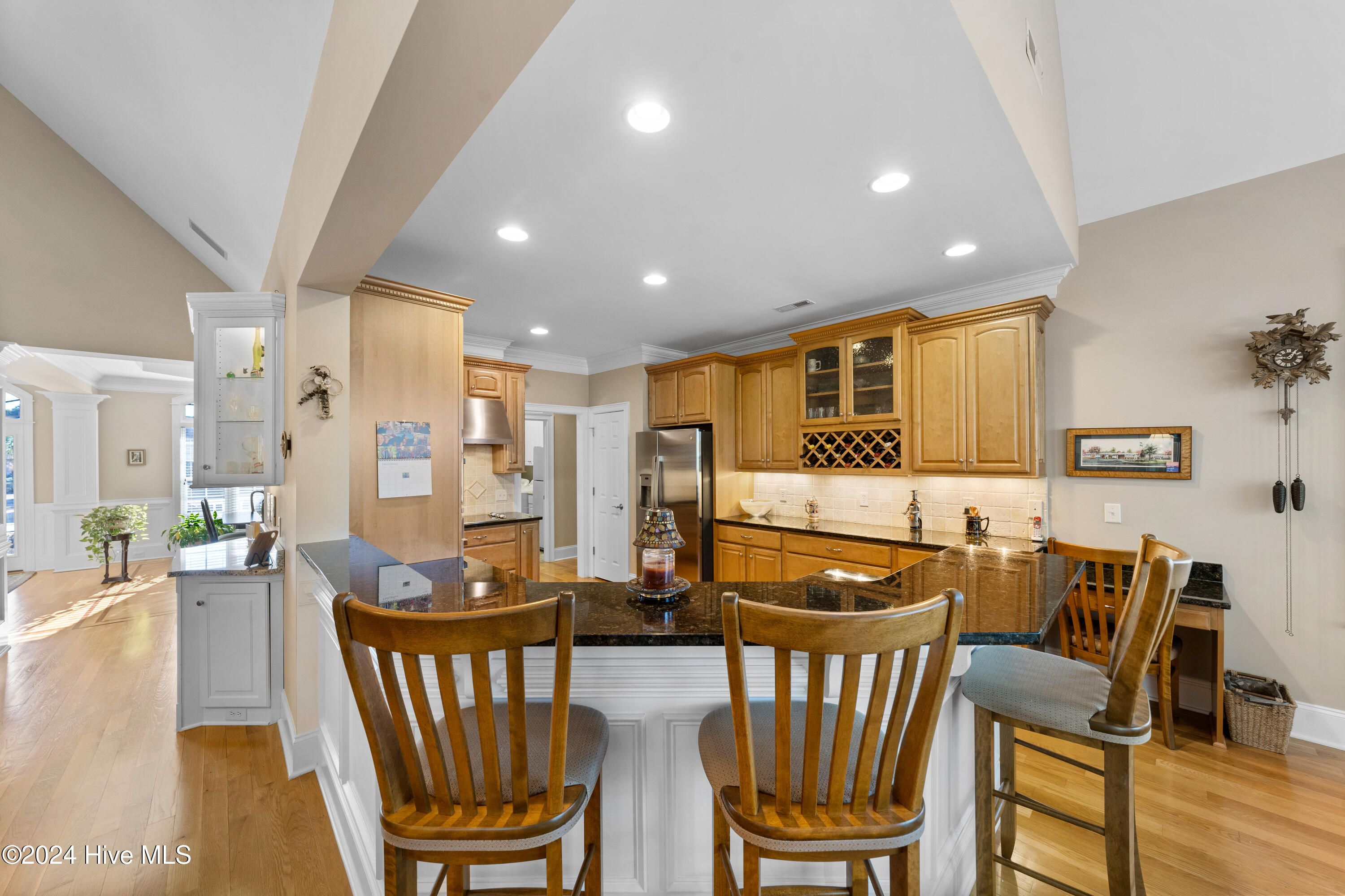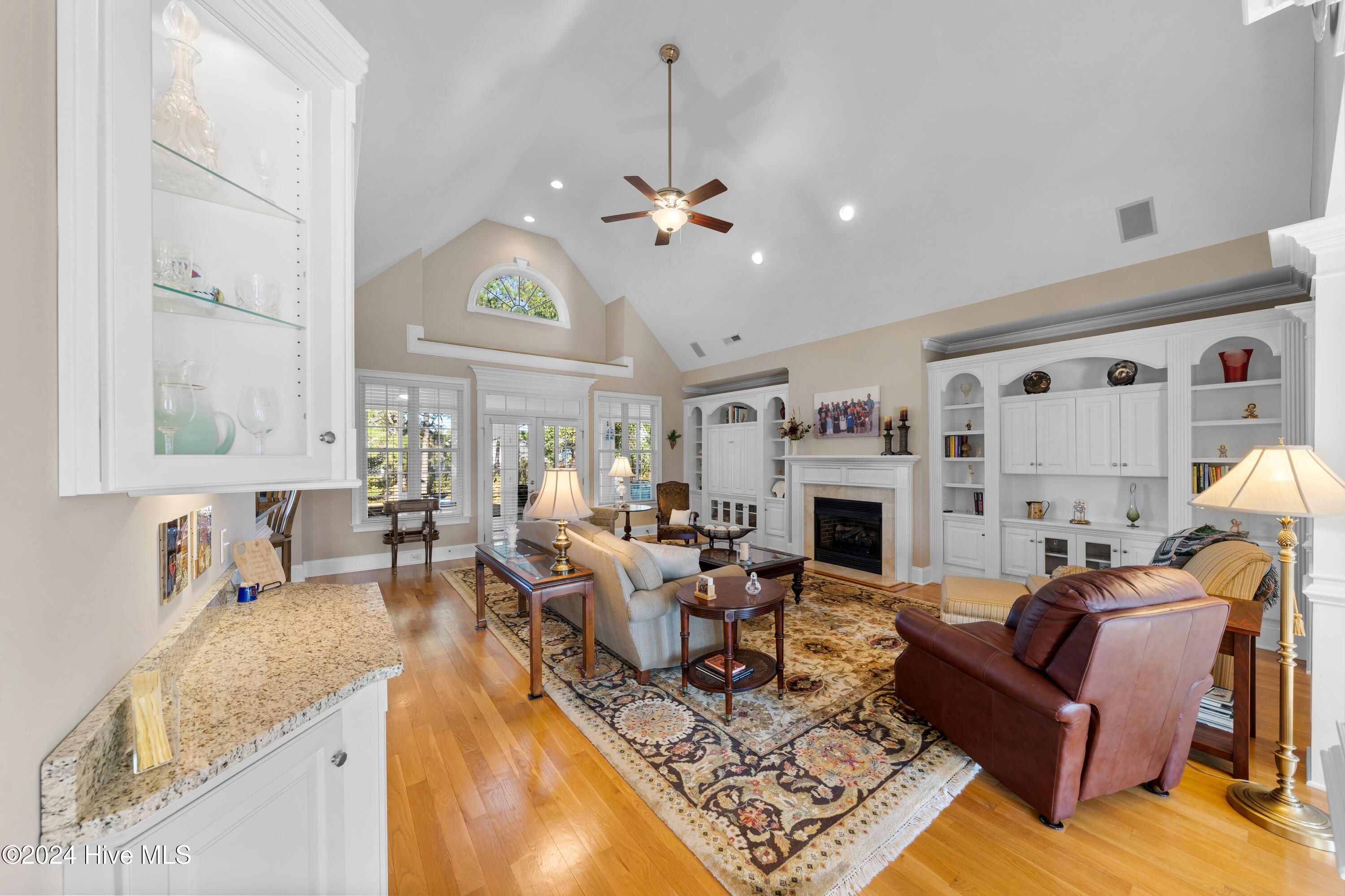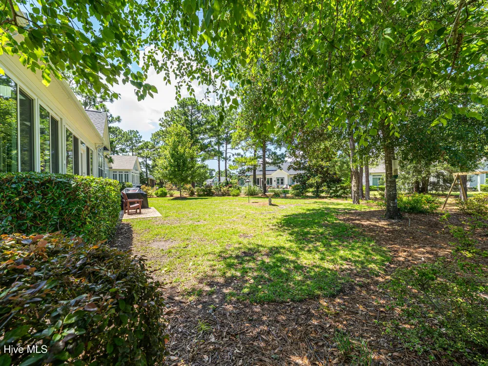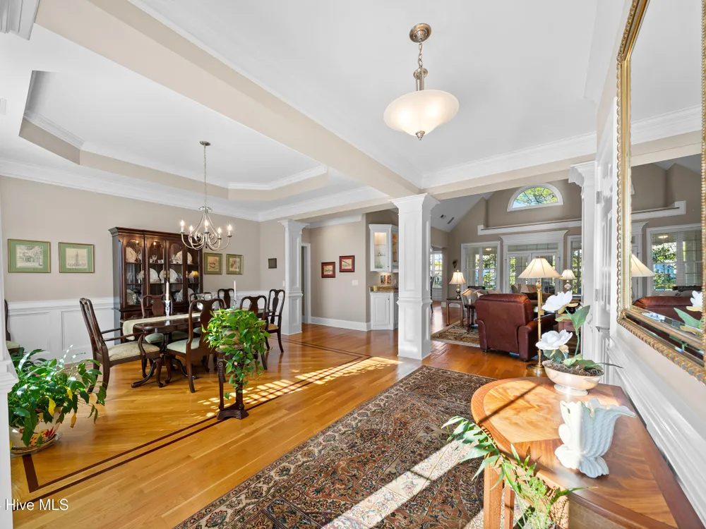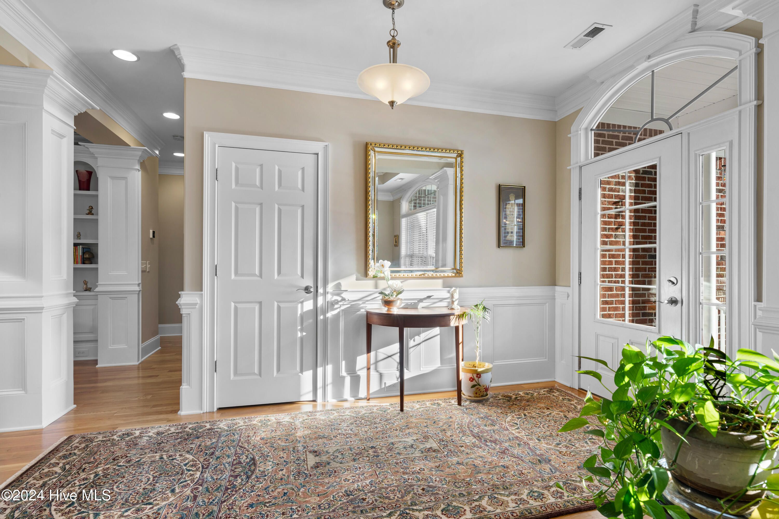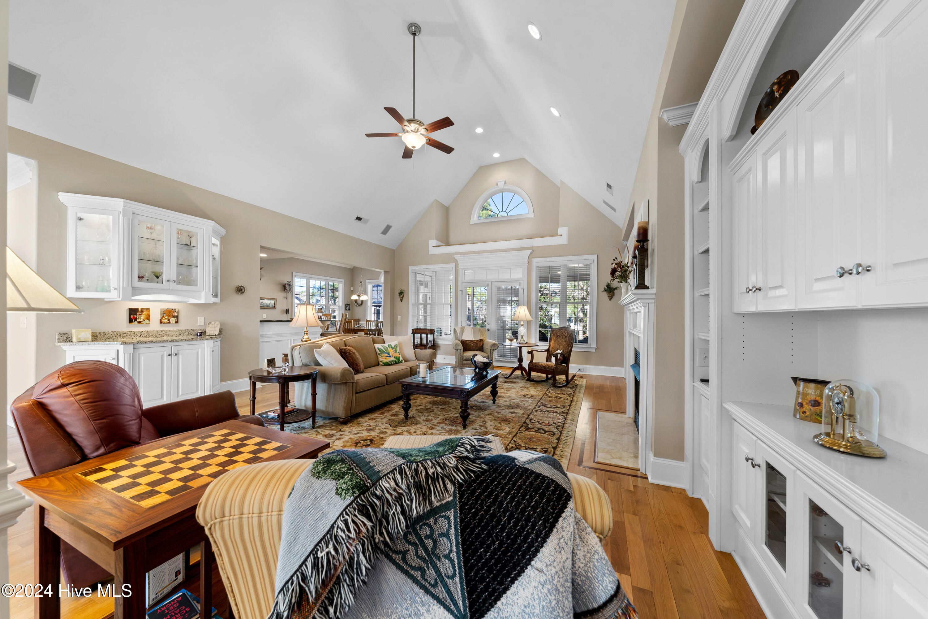This beautiful custom built home boasts an attractive curb appeal that exudes timeless charm and character. The excellent location puts you just minutes away from the full-scale St. James marina, waterway park a 10-acre outdoor area located on the Intracoastal waterway, and minutes away from The Grove entrance. Brick pillars frame the entrance to a stamped concrete driveway, setting a warm and welcoming tone. The exterior showcases a harmonious blend of multiple rooflines (new roof installed 2024), elegant brickwork, and durable cement composite siding. A rocking chair front porch, accented by graceful arched transom windows, invites you to relax. Spanning over 3,500 heated square feet, the residence offers three spacious bedrooms and three and a half bathrooms, making it the perfect blend of comfort and sophistication. The entryway is a showcase of elegant and thoughtful design, featuring gorgeous hardwood flooring. Crown molding and custom wainscoted columns frame the formal dining room, which is further distinguished by an octagon-shaped tray ceiling and a striking wood inlay border that adds intricate detail to the floor. The space flows seamlessly into the great room, where a vaulted ceiling and a cozy gas fireplace create a warm and inviting ambiance. Custom recessed built-ins add both functionality and charm, while natural light warms the room through atrium doors crowned with a graceful half-moon transom window. These doors lead to a tiled sunroom with skylights, offering peaceful views of the beautifully landscaped backyard, complete with a paver patio for outdoor relaxation and entertaining. The spacious kitchen features wood cabinetry, stainless steel appliances, black granite counters, a built-in wine rack, and a tumbled stone backsplash. Bar-height seating at the peninsula opens to the breakfast nook, which boasts a vaulted ceiling, custom wainscoting, and picturesque backyard views. The owner's suite is tucked away for maximum privacy and features a