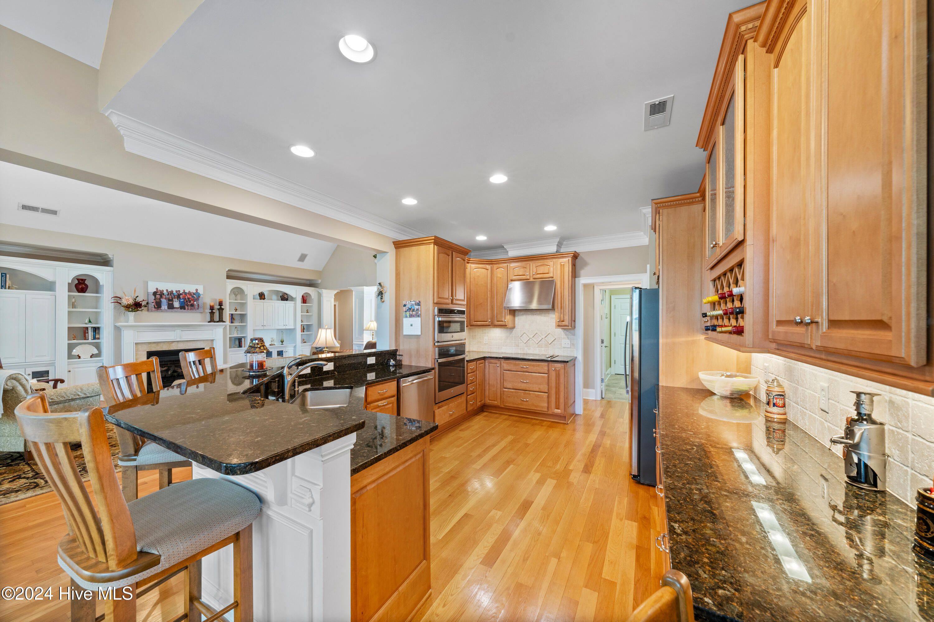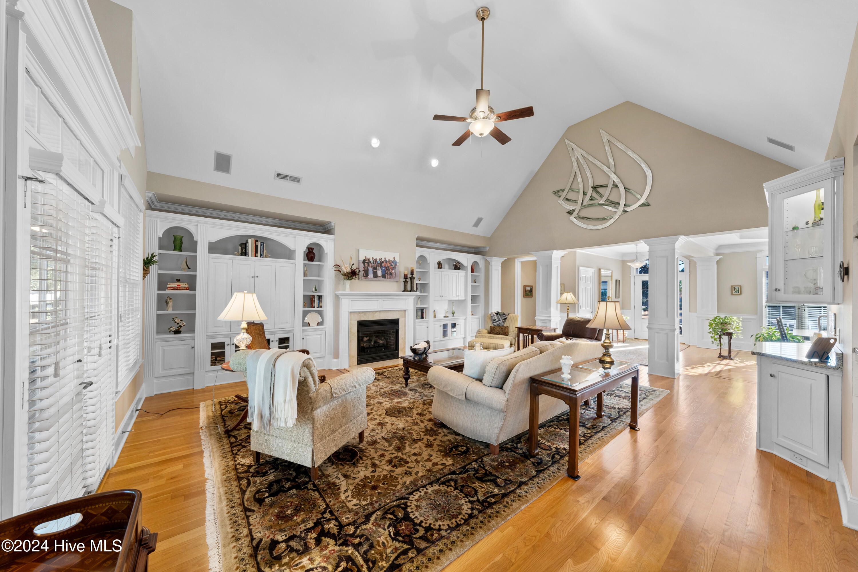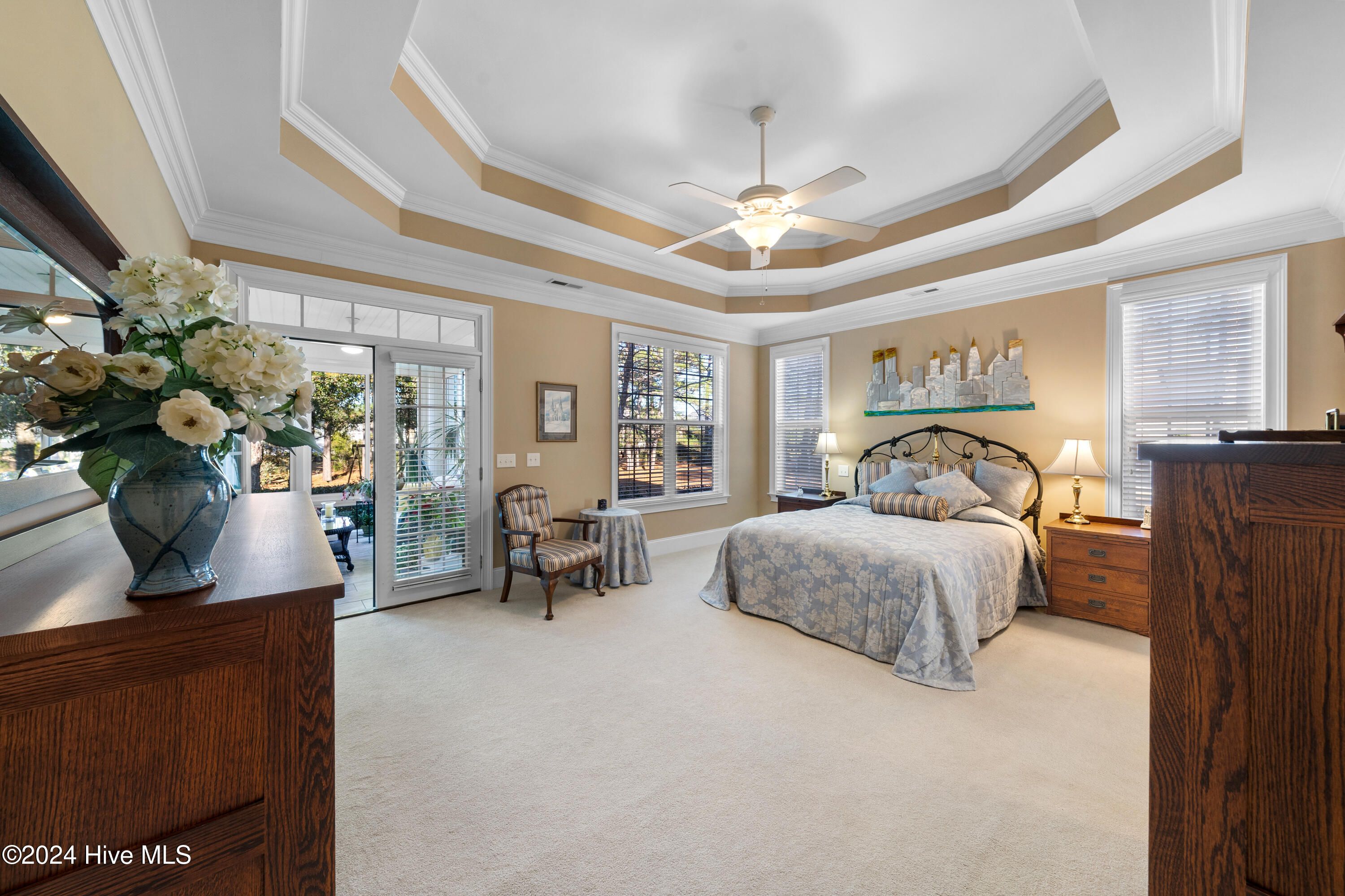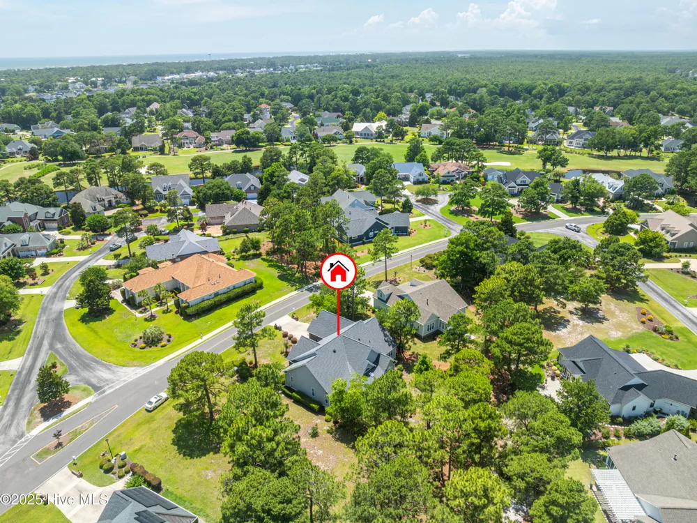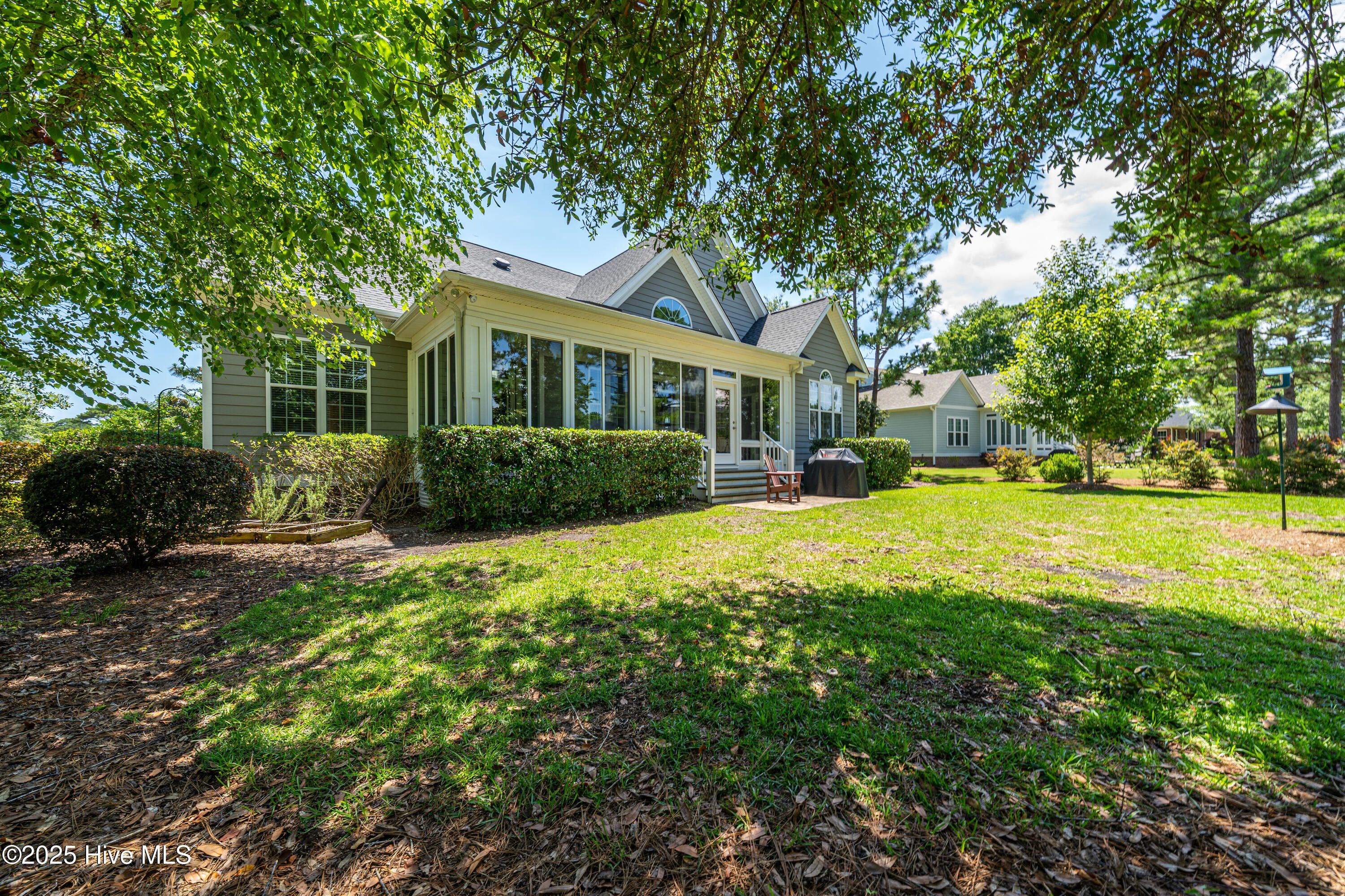 This beautiful custom built home boasts an attractive curb appeal that exudes timeless charm and character. The excellent location puts you just minutes away from the full-scale St. James marina, waterway park a 10-acre outdoor area located on the Intracoastal waterway, and minutes away from The Grove entrance. Brick pillars frame the entrance to a stamped concrete driveway, setting a warm and welcoming tone. The exterior showcases a harmonious blend of multiple rooflines (new roof installed 2024), elegant brickwork, and durable cement composite siding. A rocking chair front porch, accented by graceful arched transom windows, invites you to relax. Spanning over 3,500 heated square feet, the residence offers three spacious bedrooms and three and a half bathrooms, making it the perfect blend of comfort and sophistication. The entryway is a showcase of elegant and thoughtful design, featuring gorgeous hardwood flooring. Crown molding and custom wainscoted columns frame the formal dining room, which is further distinguished by an octagon-shaped tray ceiling and a striking wood inlay border that adds intricate detail to the floor. The space flows seamlessly into the great room, where a vaulted ceiling and a cozy gas fireplace create a warm and inviting ambiance. Custom recessed built-ins add both functionality and charm, while natural light warms the room through atrium doors crowned with a graceful half-moon transom window. These doors lead to a tiled sunroom with skylights, offering peaceful views of the beautifully landscaped backyard, complete with a paver patio for outdoor relaxation and entertaining. The spacious kitchen features wood cabinetry, stainless steel appliances, black granite counters, a built-in wine rack, and a tumbled stone backsplash. Bar-height seating at the peninsula opens to the breakfast nook, which boasts a vaulted ceiling, custom wainscoting, and picturesque backyard views. The owner's suite is tucked away for maximum privacy and features a