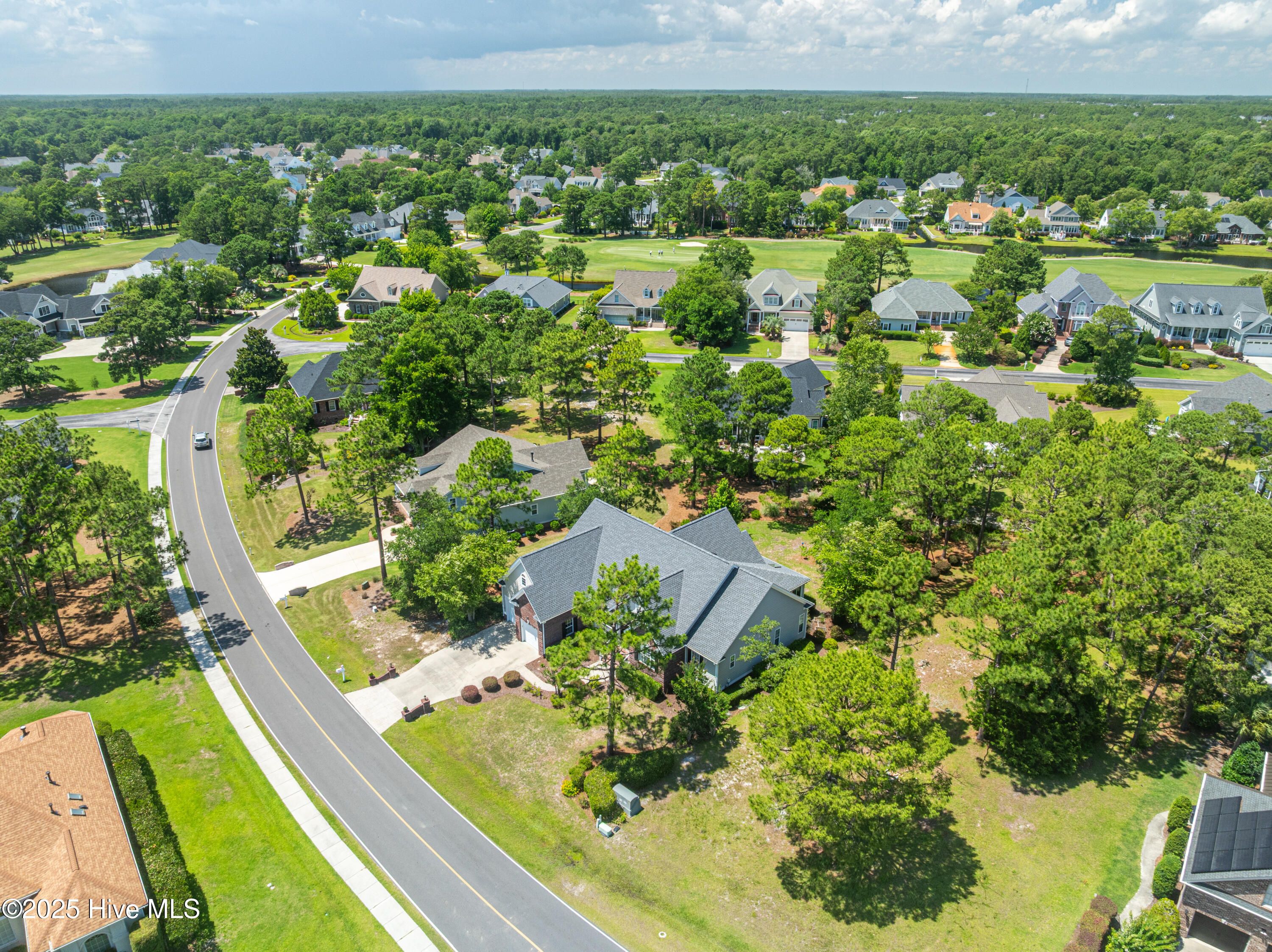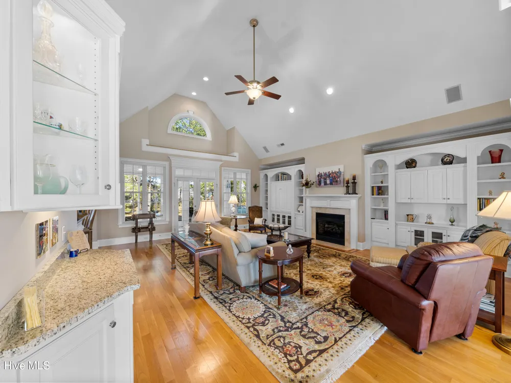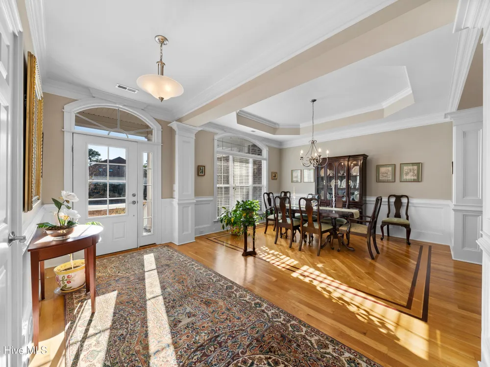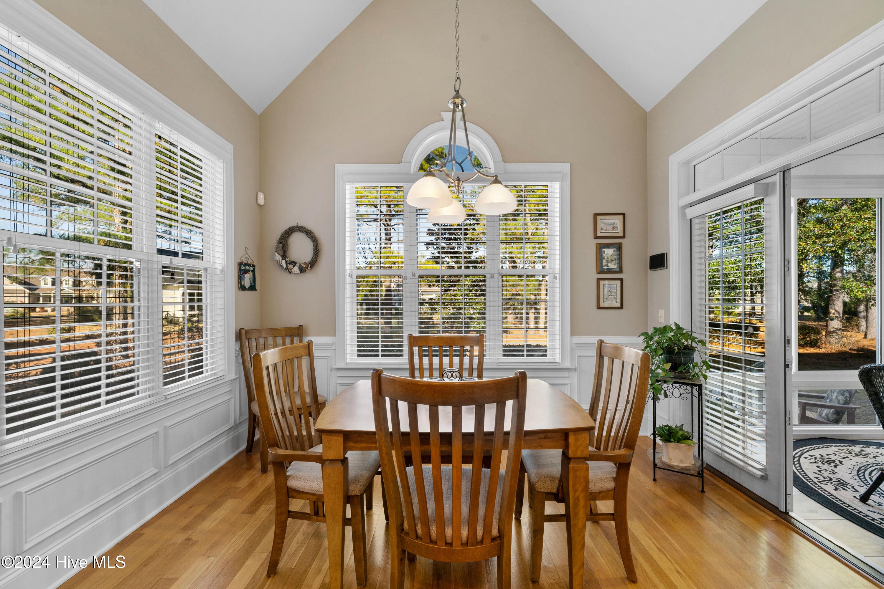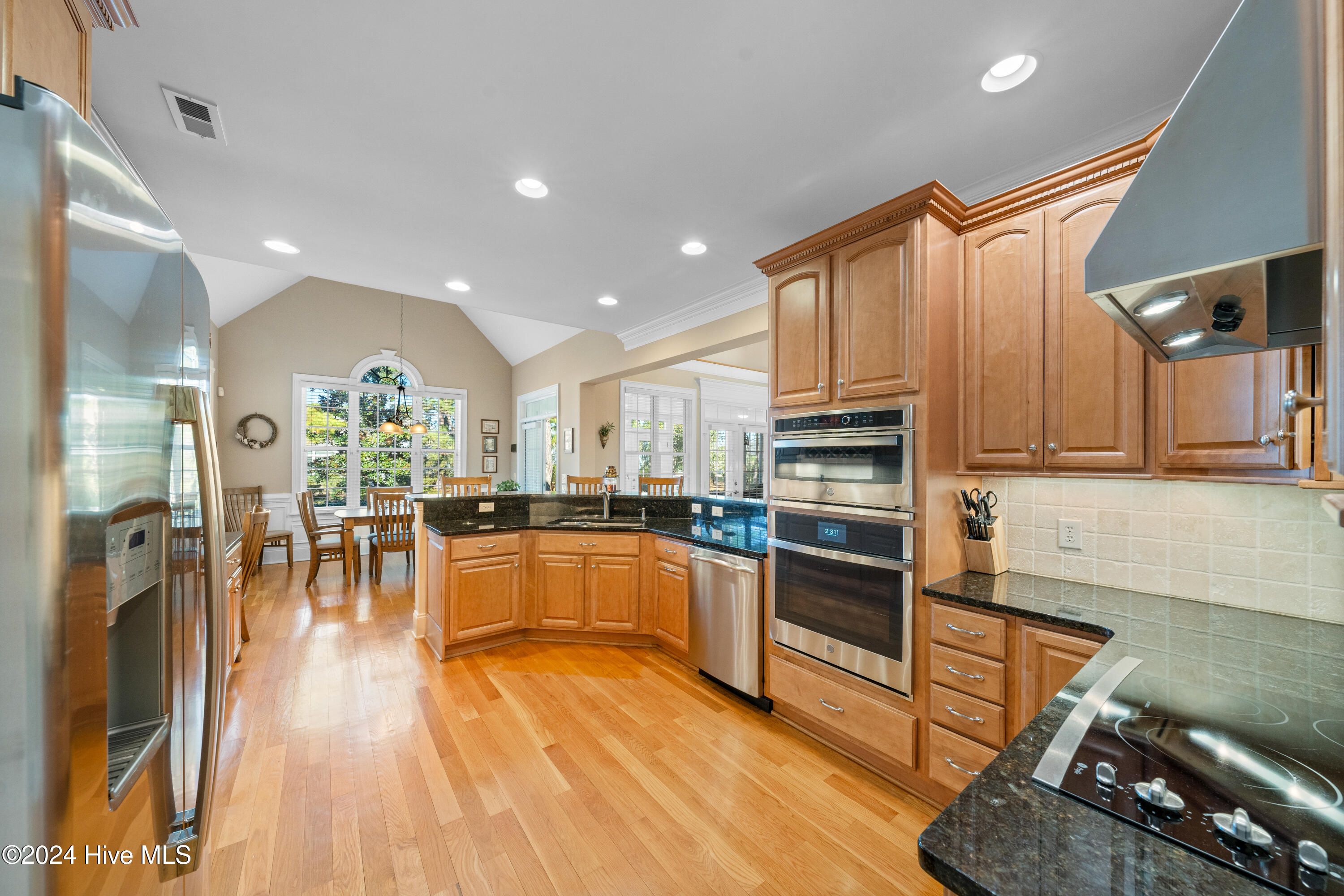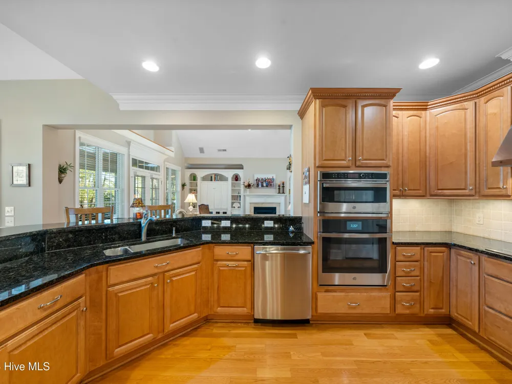 This beautiful custom built home boasts an attractive curb appeal that exudes timeless charm and character. The excellent location puts you just minutes away from the full-scale St. James marina, waterway park a 10-acre outdoor area located on the Intracoastal waterway, and minutes away from The Grove entrance. Brick pillars frame the entrance to a stamped concrete driveway, setting a warm and welcoming tone. The exterior showcases a harmonious blend of multiple rooflines (new roof installed 2024), elegant brickwork, and durable cement composite siding. A rocking chair front porch, accented by graceful arched transom windows, invites you to relax. Spanning over 3,500 heated square feet, the residence offers three spacious bedrooms and three and a half bathrooms, making it the perfect blend of comfort and sophistication. The entryway is a showcase of elegant and thoughtful design, featuring gorgeous hardwood flooring. Crown molding and custom wainscoted columns frame the formal dining room, which is further distinguished by an octagon-shaped tray ceiling and a striking wood inlay border that adds intricate detail to the floor. The space flows seamlessly into the great room, where a vaulted ceiling and a cozy gas fireplace create a warm and inviting ambiance. Custom recessed built-ins add both functionality and charm, while natural light warms the room through atrium doors crowned with a graceful half-moon transom window. These doors lead to a tiled sunroom with skylights, offering peaceful views of the beautifully landscaped backyard, complete with a paver patio for outdoor relaxation and entertaining. The spacious kitchen features wood cabinetry, stainless steel appliances, black granite counters, a built-in wine rack, and a tumbled stone backsplash. Bar-height seating at the peninsula opens to the breakfast nook, which boasts a vaulted ceiling, custom wainscoting, and picturesque backyard views. The owner's suite is tucked away for maximum privacy and features a