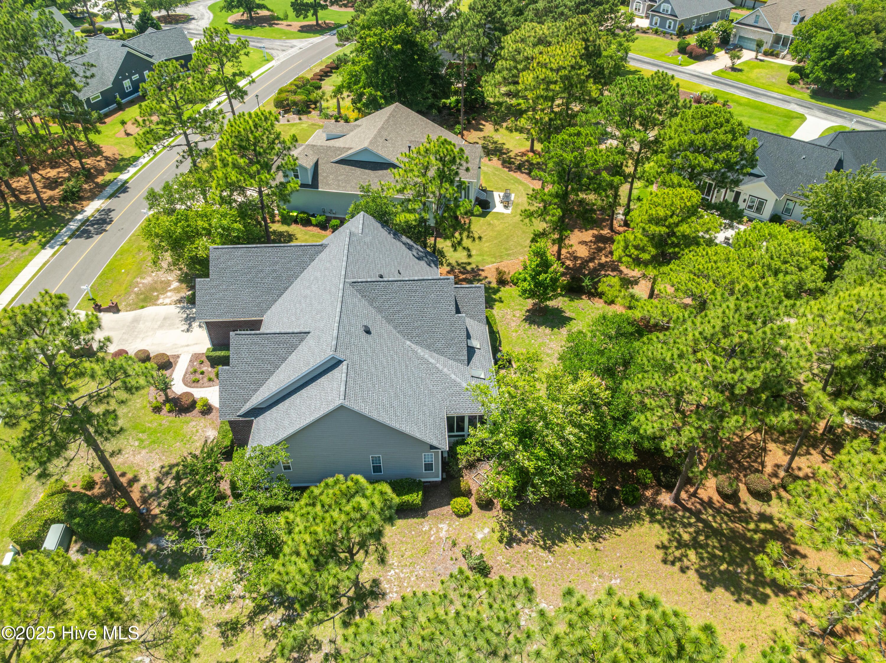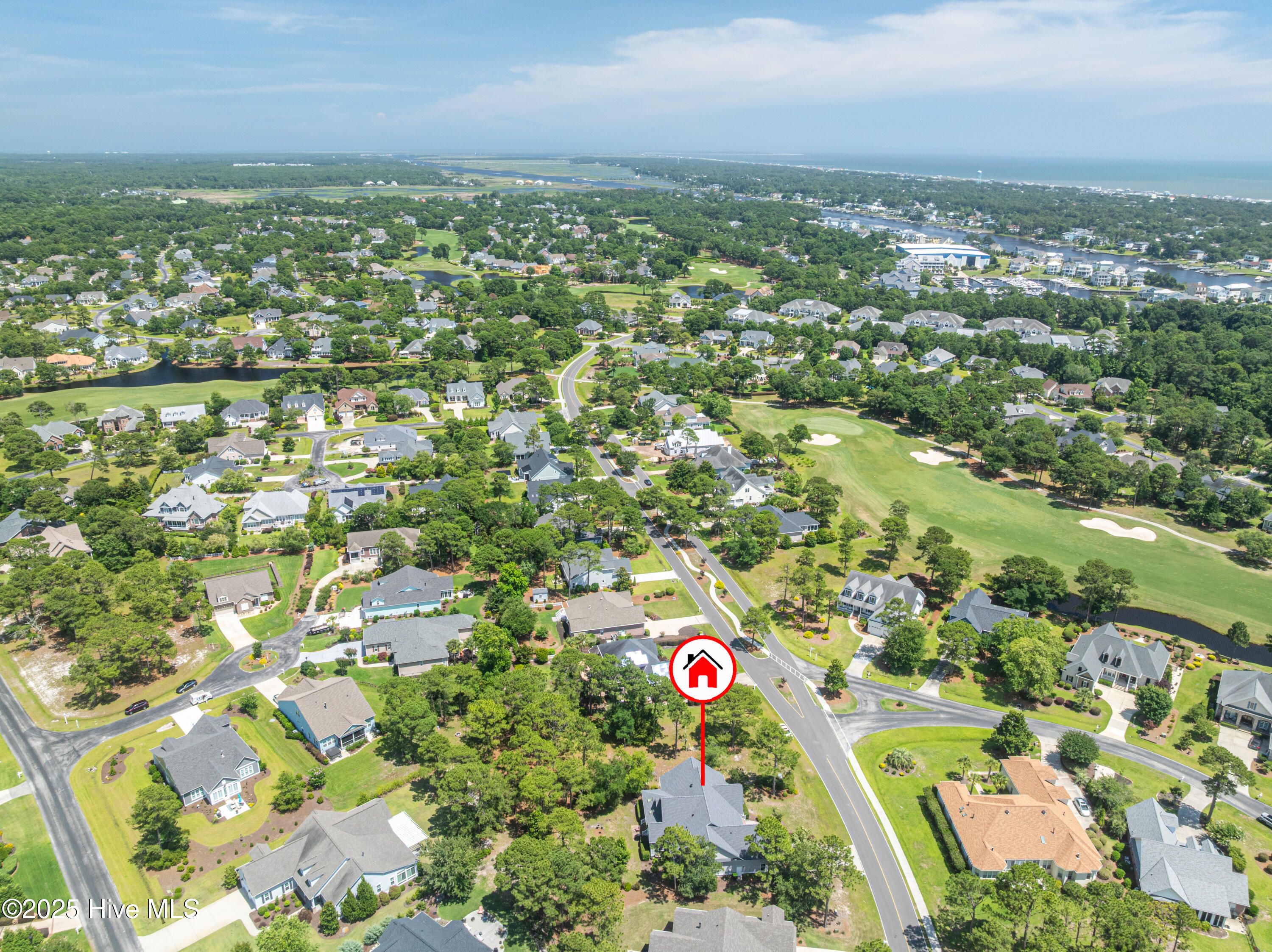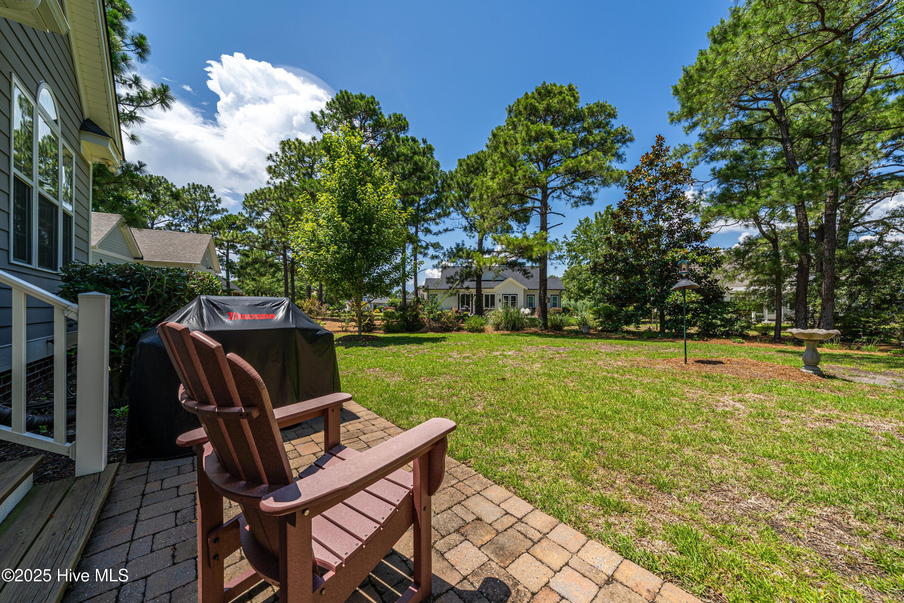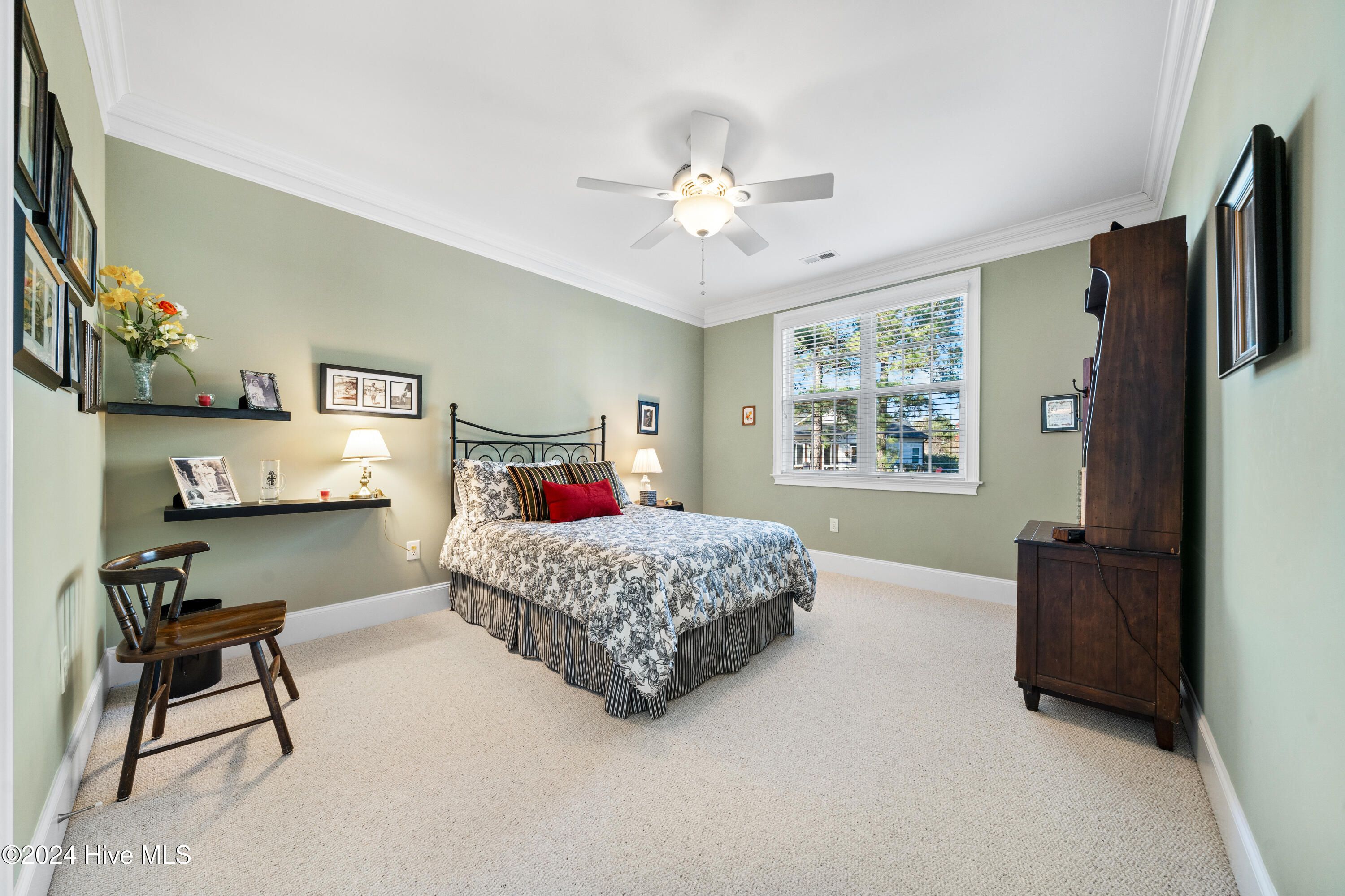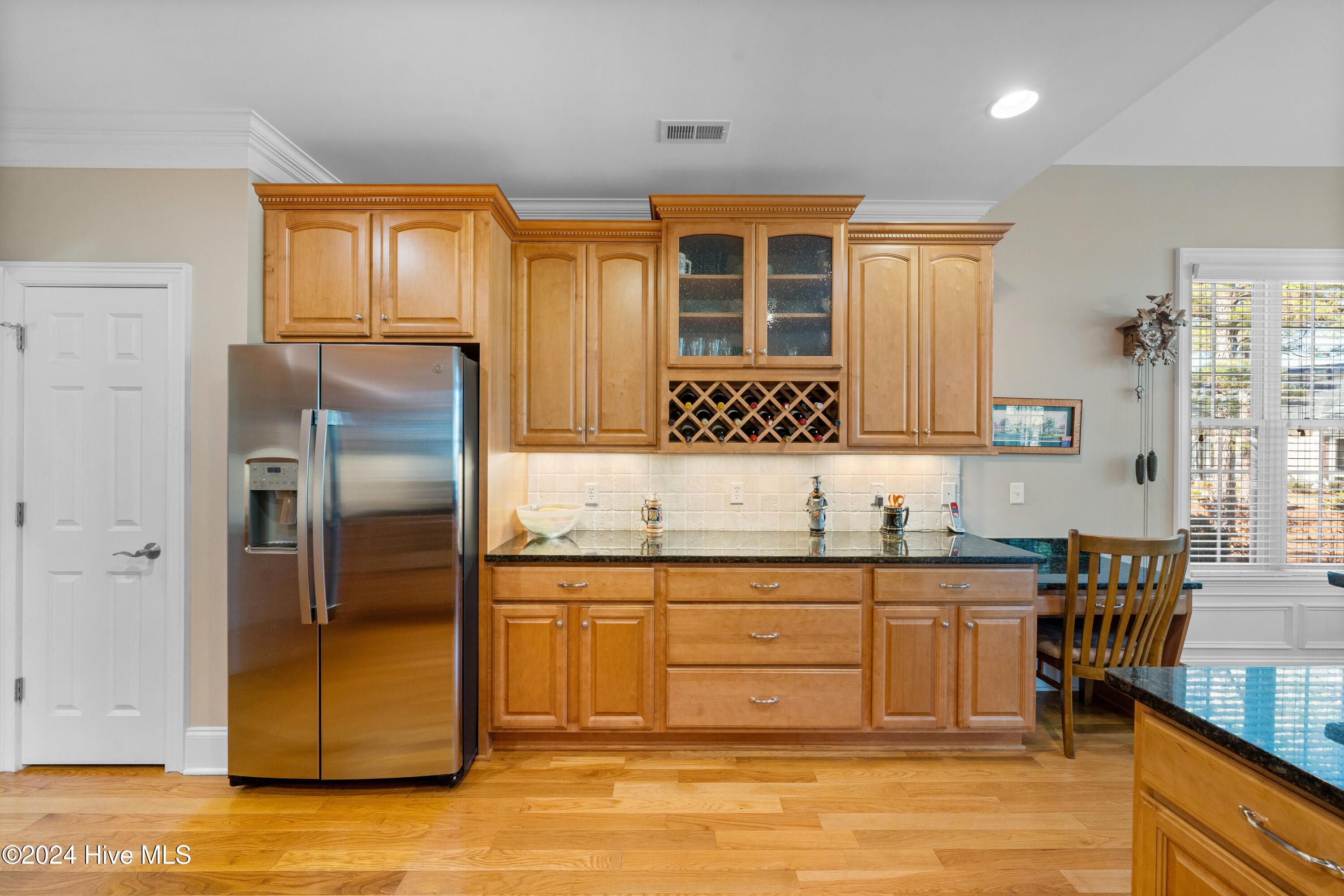 This beautiful custom built home boasts an attractive curb appeal that exudes timeless charm and character. The excellent location puts you just minutes away from the full-scale St. James marina, waterway park a 10-acre outdoor area located on the Intracoastal waterway, and minutes away from The Grove entrance. Brick pillars frame the entrance to a stamped concrete driveway, setting a warm and welcoming tone. The exterior showcases a harmonious blend of multiple rooflines (new roof installed 2024), elegant brickwork, and durable cement composite siding. A rocking chair front porch, accented by graceful arched transom windows, invites you to relax. Spanning over 3,500 heated square feet, the residence offers three spacious bedrooms and three and a half bathrooms, making it the perfect blend of comfort and sophistication. The entryway is a showcase of elegant and thoughtful design, featuring gorgeous hardwood flooring. Crown molding and custom wainscoted columns frame the formal dining room, which is further distinguished by an octagon-shaped tray ceiling and a striking wood inlay border that adds intricate detail to the floor. The space flows seamlessly into the great room, where a vaulted ceiling and a cozy gas fireplace create a warm and inviting ambiance. Custom recessed built-ins add both functionality and charm, while natural light warms the room through atrium doors crowned with a graceful half-moon transom window. These doors lead to a tiled sunroom with skylights, offering peaceful views of the beautifully landscaped backyard, complete with a paver patio for outdoor relaxation and entertaining. The spacious kitchen features wood cabinetry, stainless steel appliances, black granite counters, a built-in wine rack, and a tumbled stone backsplash. Bar-height seating at the peninsula opens to the breakfast nook, which boasts a vaulted ceiling, custom wainscoting, and picturesque backyard views. The owner's suite is tucked away for maximum privacy and features a