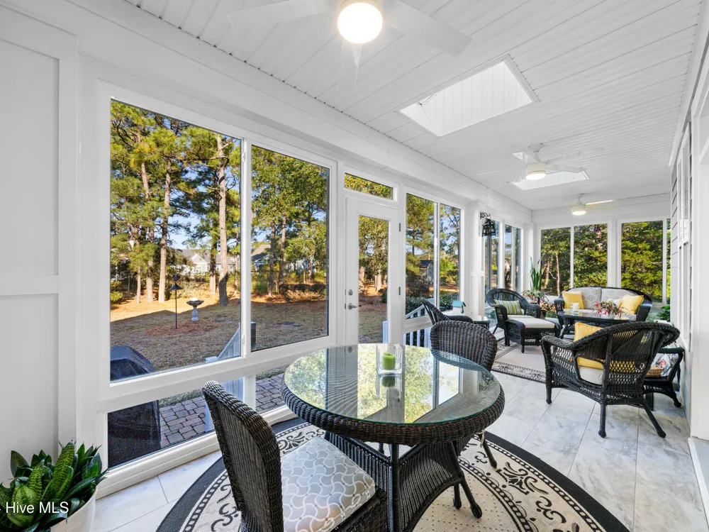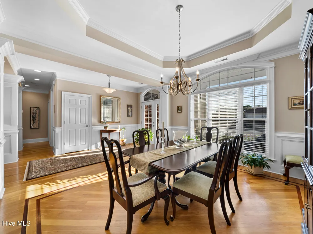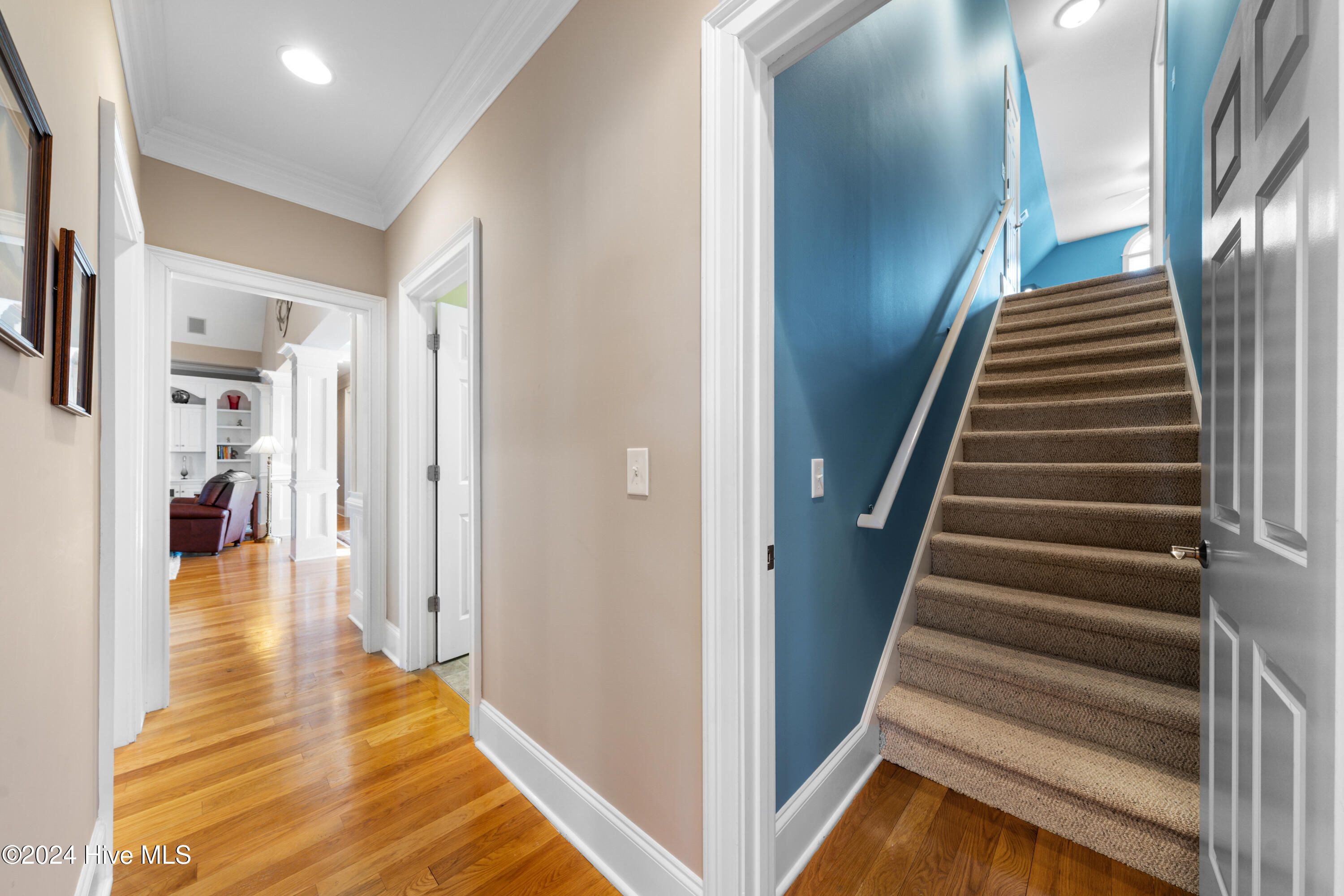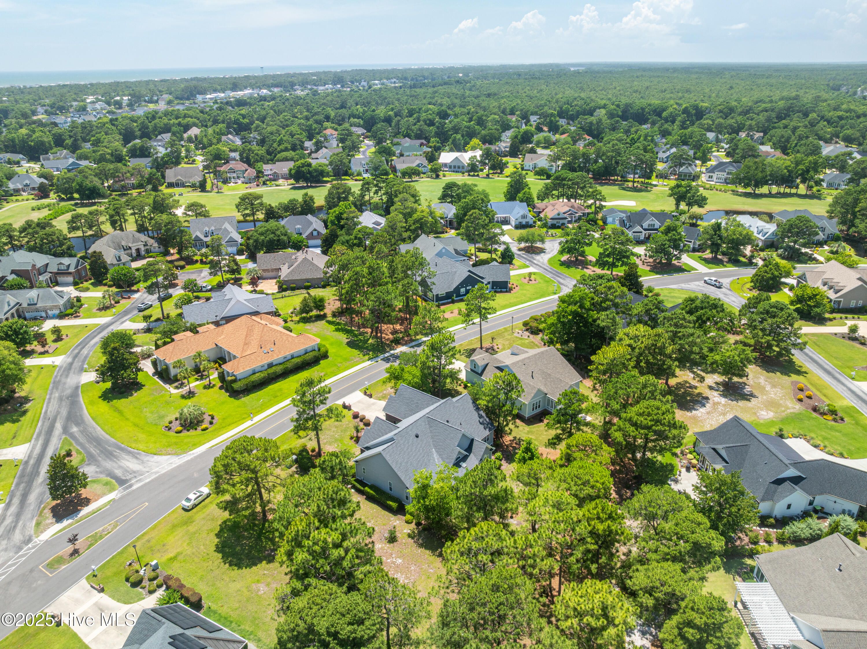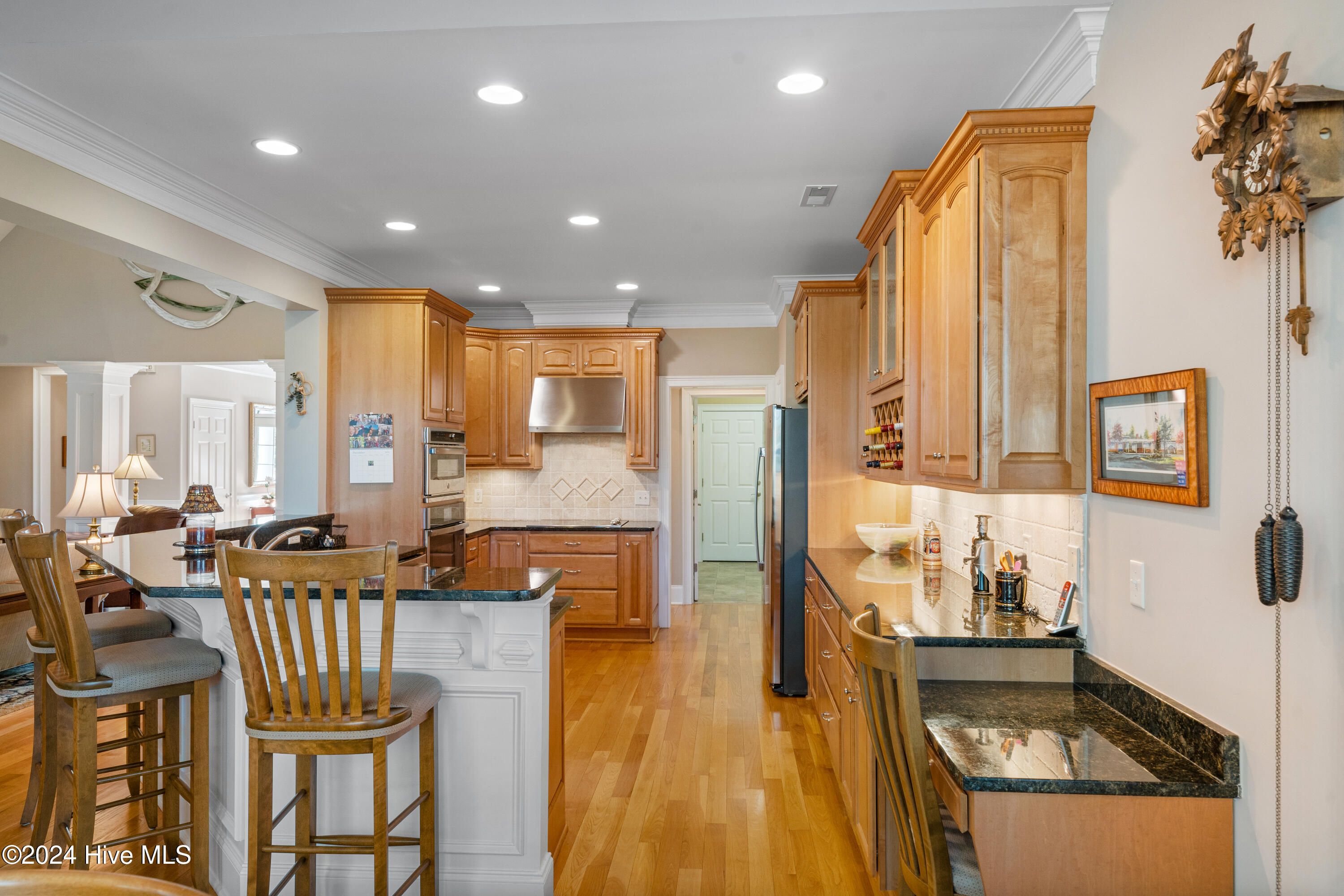 This beautiful custom built home boasts an attractive curb appeal that exudes timeless charm and character. The excellent location puts you just minutes away from the full-scale St. James marina, waterway park a 10-acre outdoor area located on the Intracoastal waterway, and minutes away from The Grove entrance. Brick pillars frame the entrance to a stamped concrete driveway, setting a warm and welcoming tone. The exterior showcases a harmonious blend of multiple rooflines (new roof installed 2024), elegant brickwork, and durable cement composite siding. A rocking chair front porch, accented by graceful arched transom windows, invites you to relax. Spanning over 3,500 heated square feet, the residence offers three spacious bedrooms and three and a half bathrooms, making it the perfect blend of comfort and sophistication. The entryway is a showcase of elegant and thoughtful design, featuring gorgeous hardwood flooring. Crown molding and custom wainscoted columns frame the formal dining room, which is further distinguished by an octagon-shaped tray ceiling and a striking wood inlay border that adds intricate detail to the floor. The space flows seamlessly into the great room, where a vaulted ceiling and a cozy gas fireplace create a warm and inviting ambiance. Custom recessed built-ins add both functionality and charm, while natural light warms the room through atrium doors crowned with a graceful half-moon transom window. These doors lead to a tiled sunroom with skylights, offering peaceful views of the beautifully landscaped backyard, complete with a paver patio for outdoor relaxation and entertaining. The spacious kitchen features wood cabinetry, stainless steel appliances, black granite counters, a built-in wine rack, and a tumbled stone backsplash. Bar-height seating at the peninsula opens to the breakfast nook, which boasts a vaulted ceiling, custom wainscoting, and picturesque backyard views. The owner's suite is tucked away for maximum privacy and features a