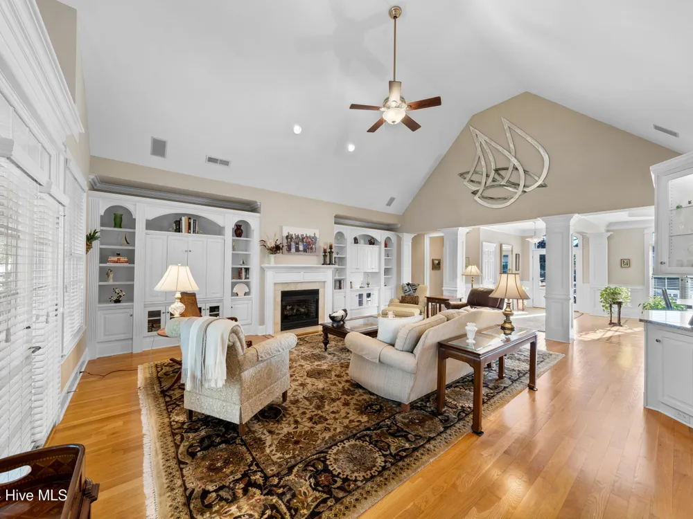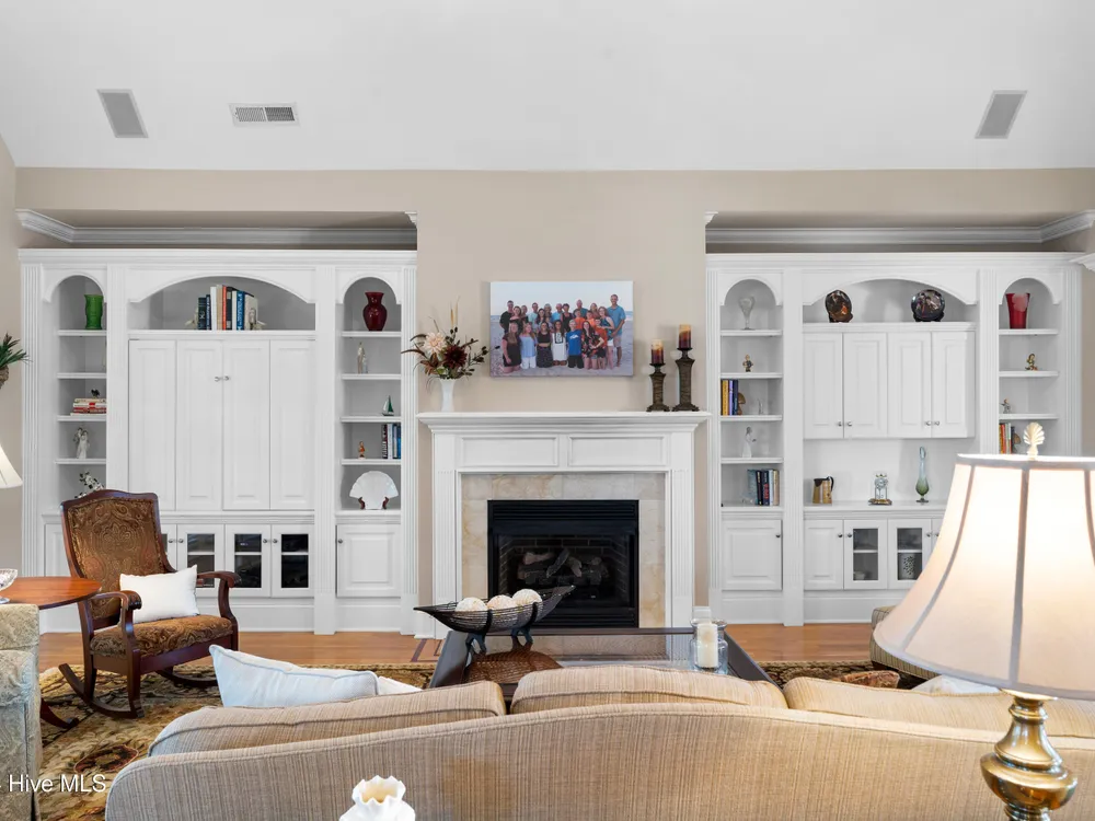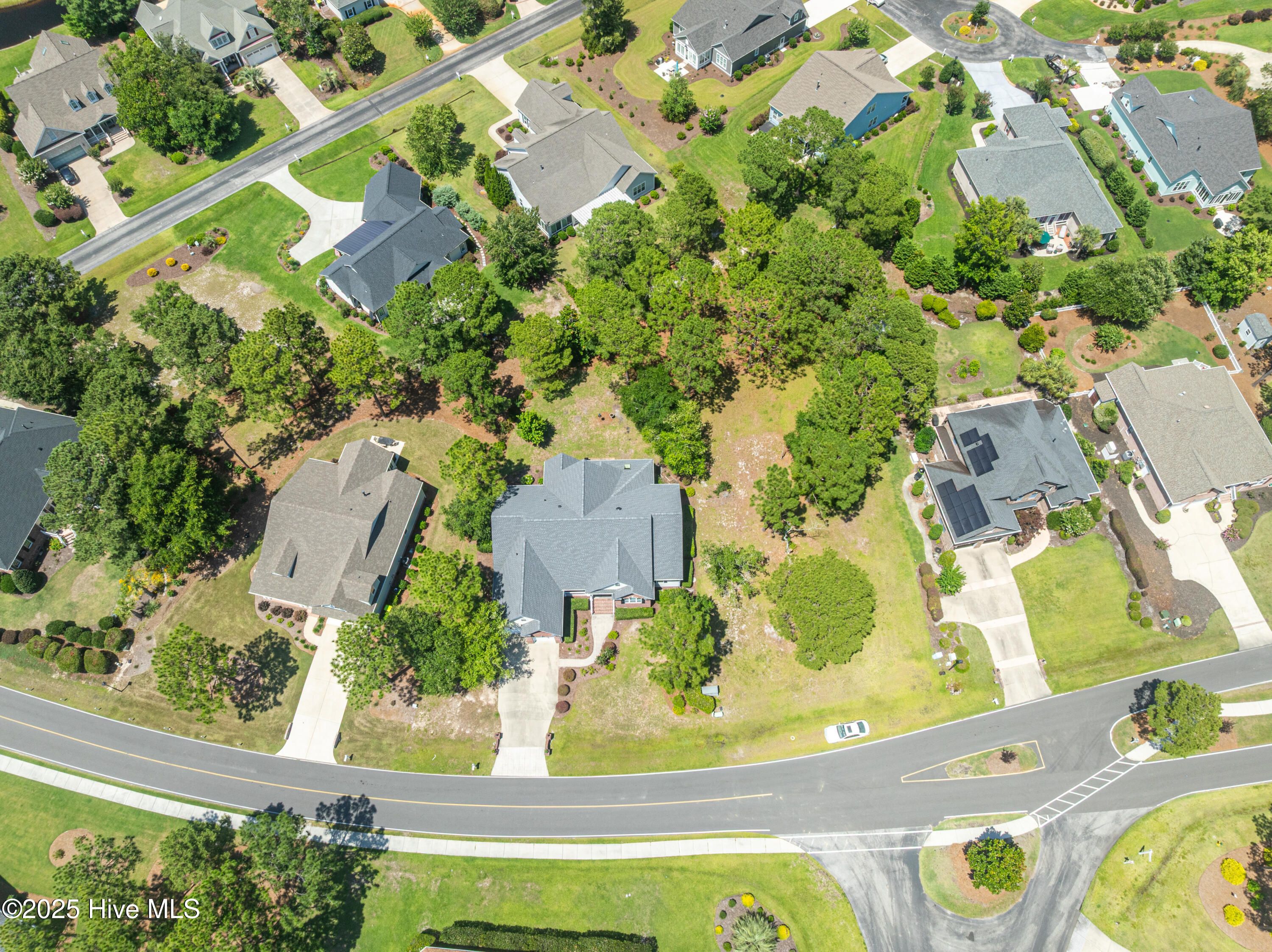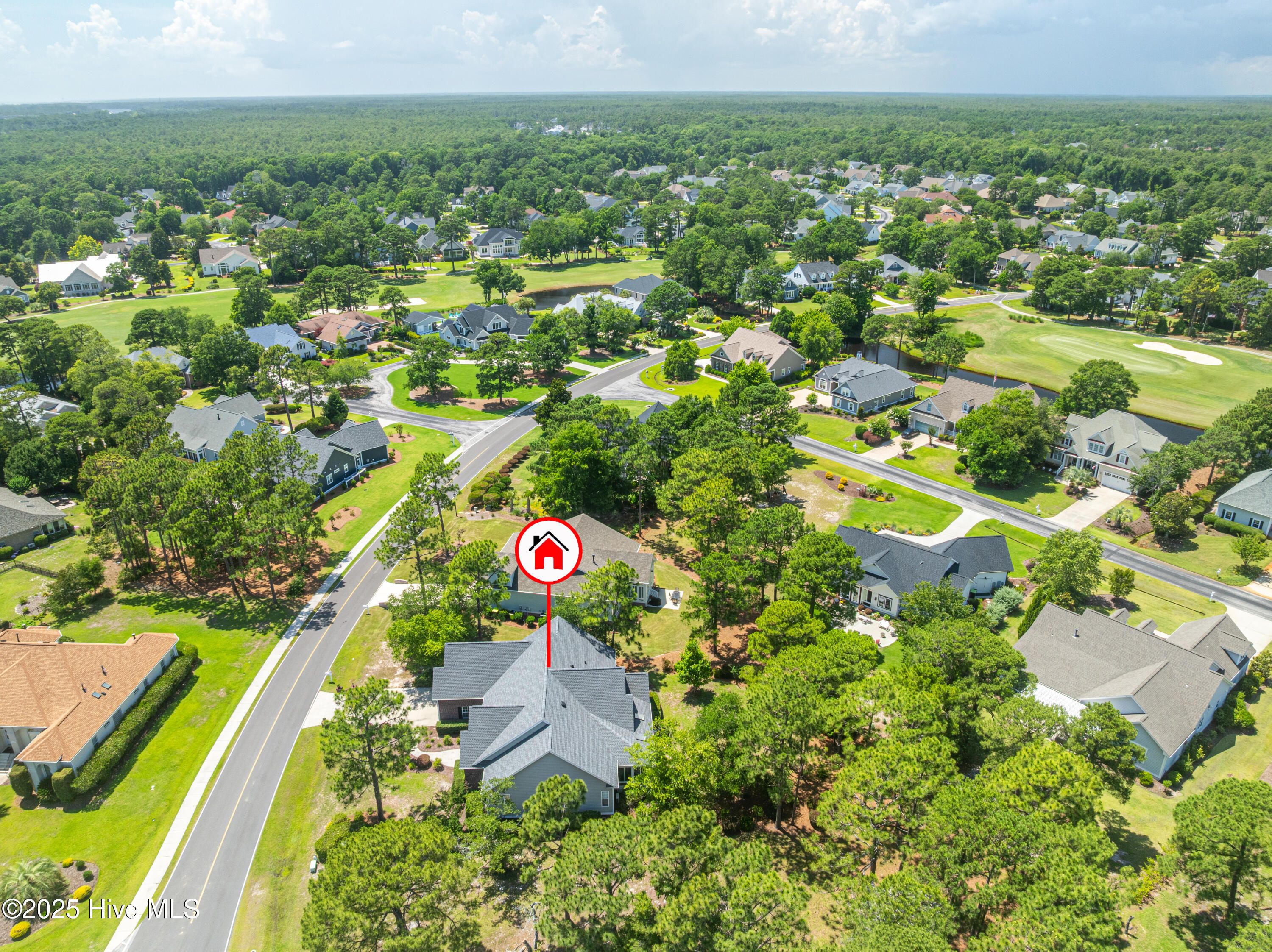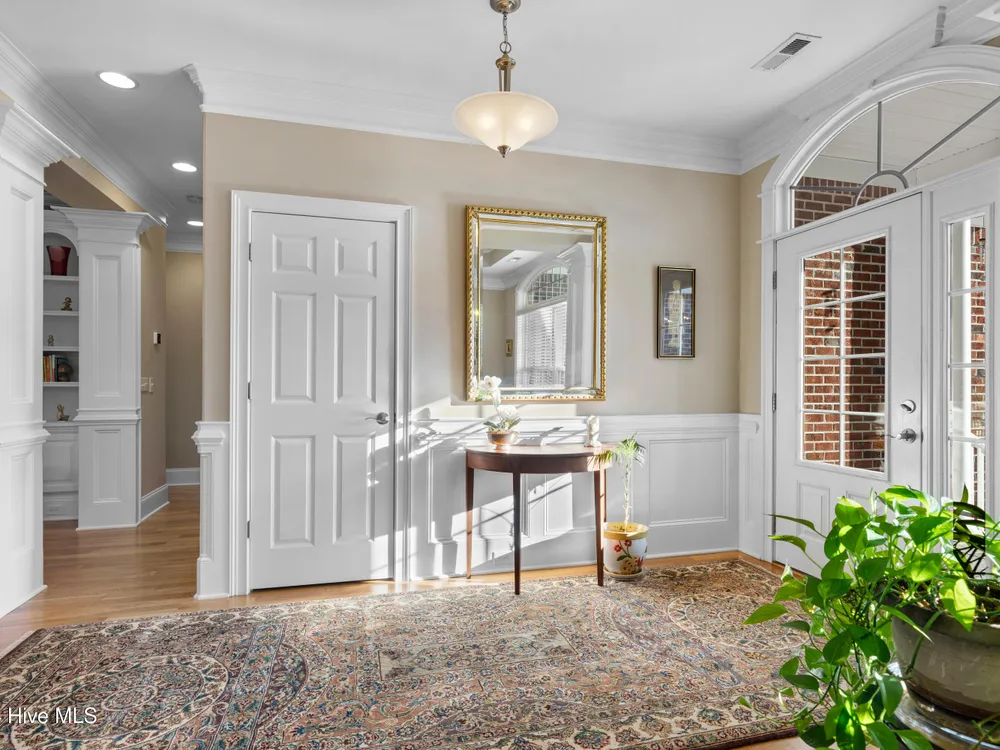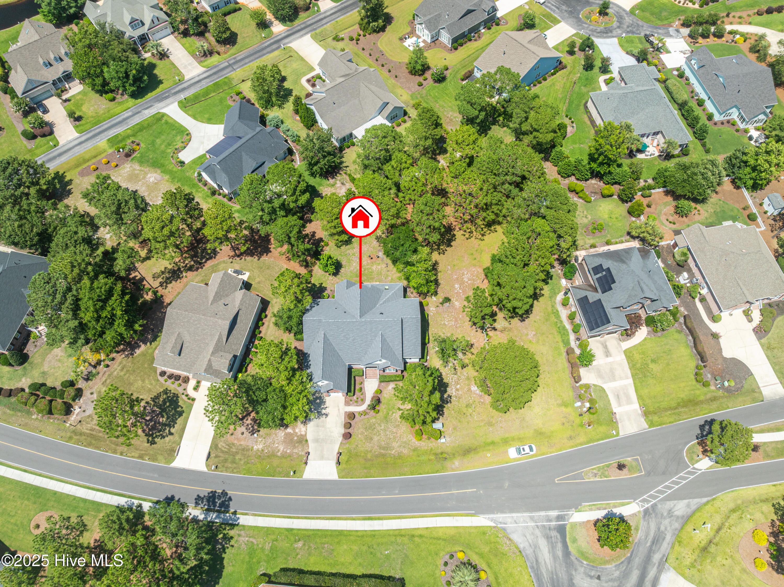 This beautiful custom built home boasts an attractive curb appeal that exudes timeless charm and character. The excellent location puts you just minutes away from the full-scale St. James marina, waterway park a 10-acre outdoor area located on the Intracoastal waterway, and minutes away from The Grove entrance. Brick pillars frame the entrance to a stamped concrete driveway, setting a warm and welcoming tone. The exterior showcases a harmonious blend of multiple rooflines (new roof installed 2024), elegant brickwork, and durable cement composite siding. A rocking chair front porch, accented by graceful arched transom windows, invites you to relax. Spanning over 3,500 heated square feet, the residence offers three spacious bedrooms and three and a half bathrooms, making it the perfect blend of comfort and sophistication. The entryway is a showcase of elegant and thoughtful design, featuring gorgeous hardwood flooring. Crown molding and custom wainscoted columns frame the formal dining room, which is further distinguished by an octagon-shaped tray ceiling and a striking wood inlay border that adds intricate detail to the floor. The space flows seamlessly into the great room, where a vaulted ceiling and a cozy gas fireplace create a warm and inviting ambiance. Custom recessed built-ins add both functionality and charm, while natural light warms the room through atrium doors crowned with a graceful half-moon transom window. These doors lead to a tiled sunroom with skylights, offering peaceful views of the beautifully landscaped backyard, complete with a paver patio for outdoor relaxation and entertaining. The spacious kitchen features wood cabinetry, stainless steel appliances, black granite counters, a built-in wine rack, and a tumbled stone backsplash. Bar-height seating at the peninsula opens to the breakfast nook, which boasts a vaulted ceiling, custom wainscoting, and picturesque backyard views. The owner's suite is tucked away for maximum privacy and features a