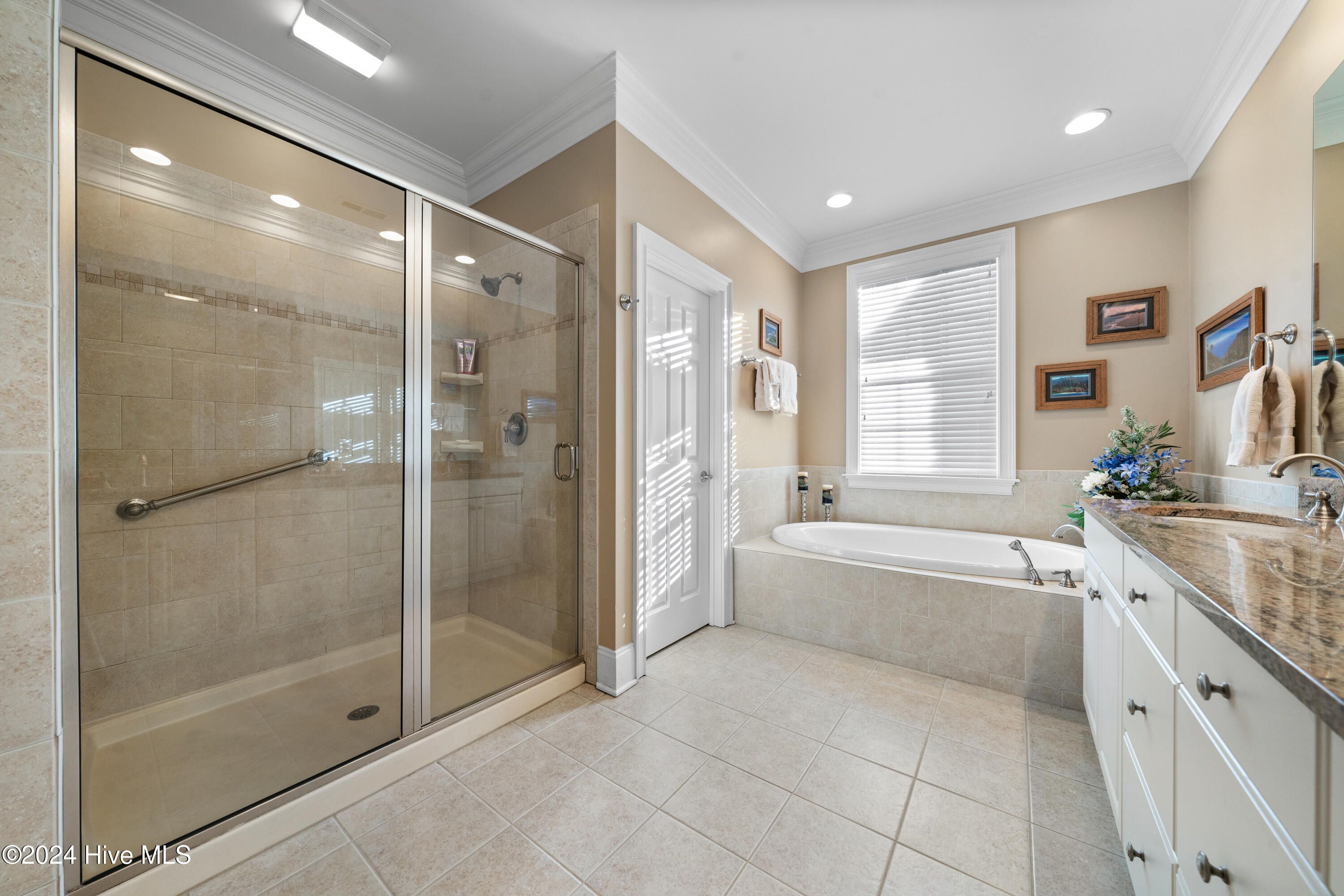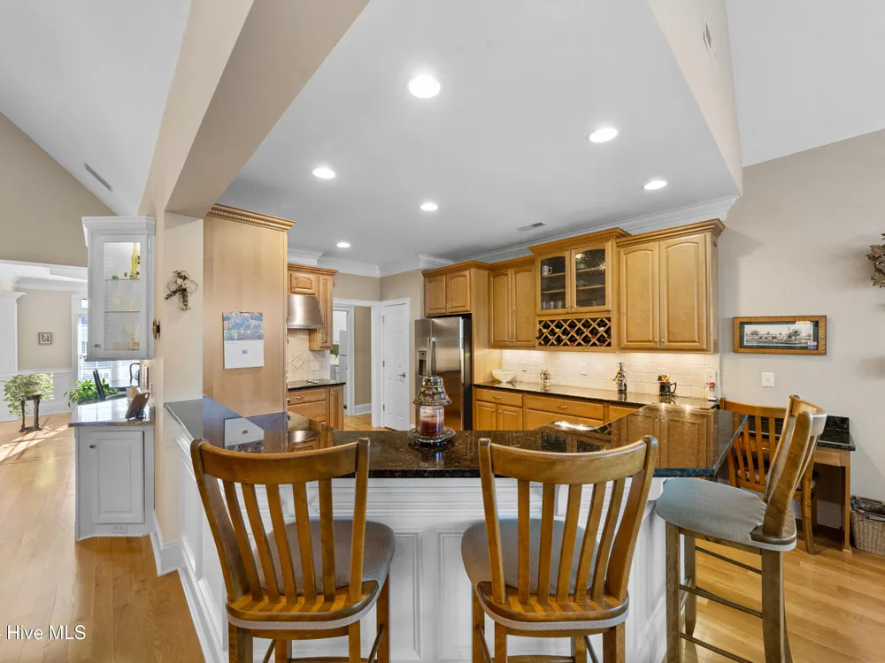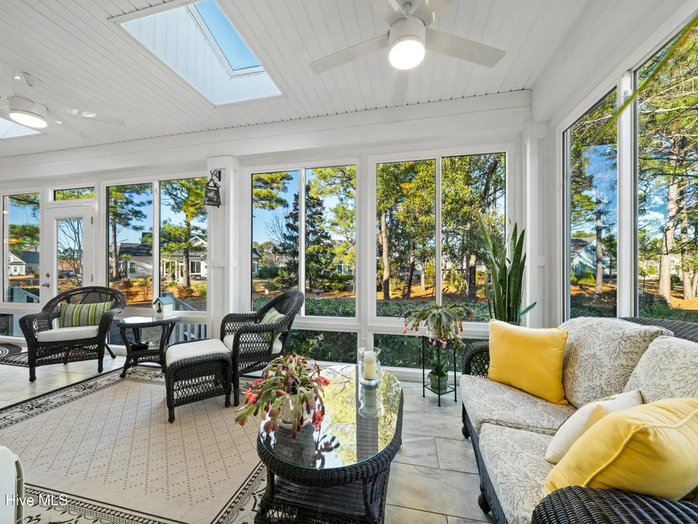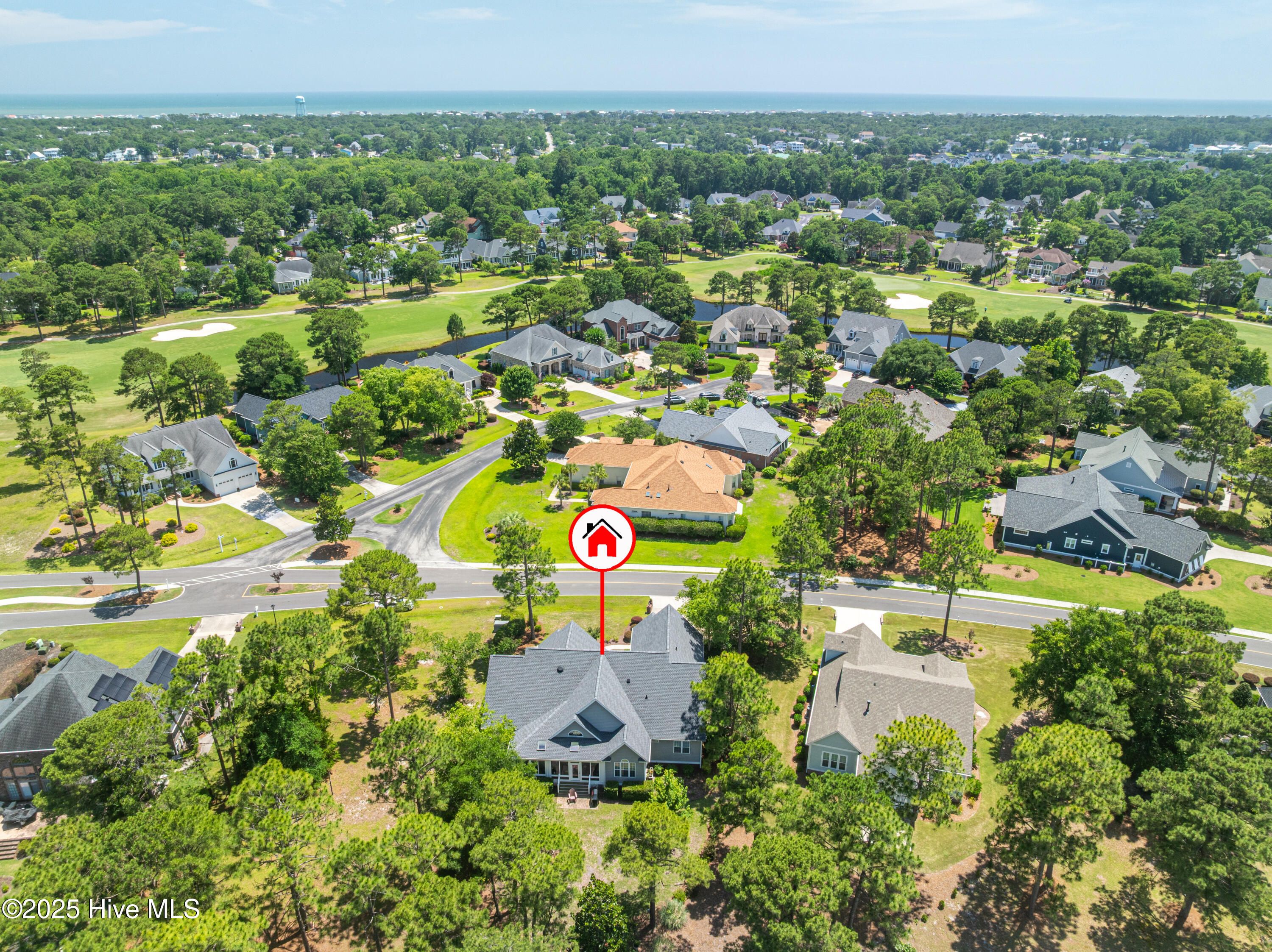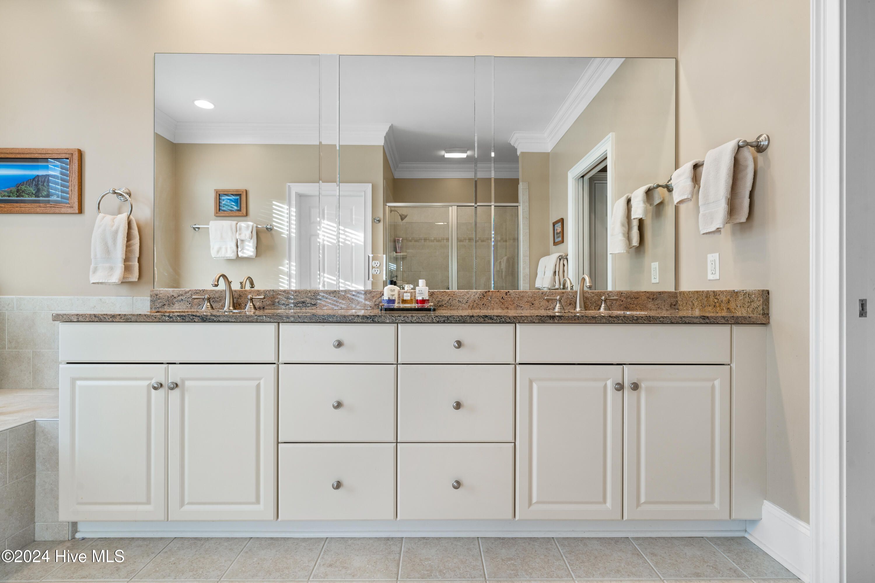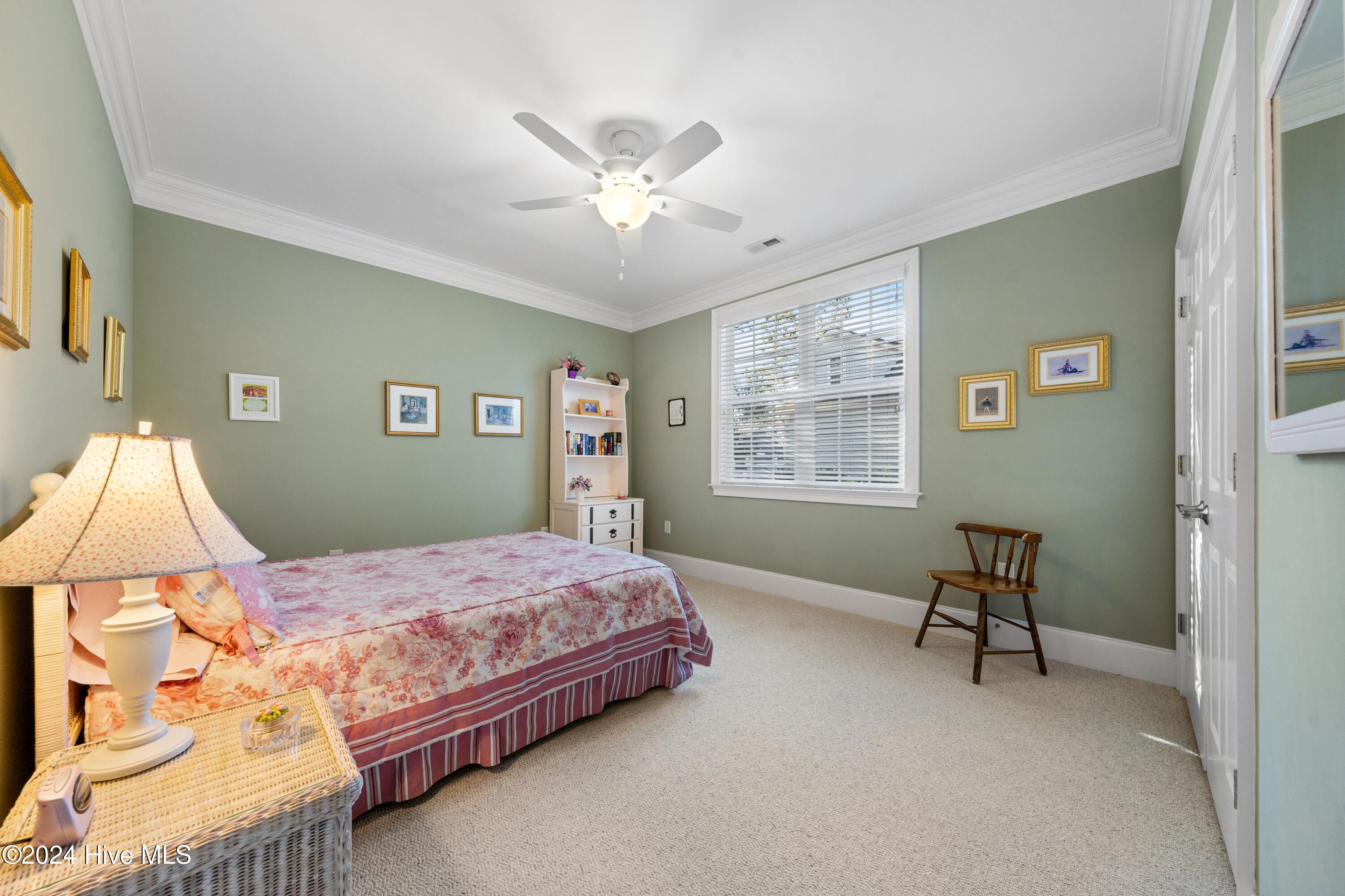 This beautiful custom built home boasts an attractive curb appeal that exudes timeless charm and character. The excellent location puts you just minutes away from the full-scale St. James marina, waterway park a 10-acre outdoor area located on the Intracoastal waterway, and minutes away from The Grove entrance. Brick pillars frame the entrance to a stamped concrete driveway, setting a warm and welcoming tone. The exterior showcases a harmonious blend of multiple rooflines (new roof installed 2024), elegant brickwork, and durable cement composite siding. A rocking chair front porch, accented by graceful arched transom windows, invites you to relax. Spanning over 3,500 heated square feet, the residence offers three spacious bedrooms and three and a half bathrooms, making it the perfect blend of comfort and sophistication. The entryway is a showcase of elegant and thoughtful design, featuring gorgeous hardwood flooring. Crown molding and custom wainscoted columns frame the formal dining room, which is further distinguished by an octagon-shaped tray ceiling and a striking wood inlay border that adds intricate detail to the floor. The space flows seamlessly into the great room, where a vaulted ceiling and a cozy gas fireplace create a warm and inviting ambiance. Custom recessed built-ins add both functionality and charm, while natural light warms the room through atrium doors crowned with a graceful half-moon transom window. These doors lead to a tiled sunroom with skylights, offering peaceful views of the beautifully landscaped backyard, complete with a paver patio for outdoor relaxation and entertaining. The spacious kitchen features wood cabinetry, stainless steel appliances, black granite counters, a built-in wine rack, and a tumbled stone backsplash. Bar-height seating at the peninsula opens to the breakfast nook, which boasts a vaulted ceiling, custom wainscoting, and picturesque backyard views. The owner's suite is tucked away for maximum privacy and features a