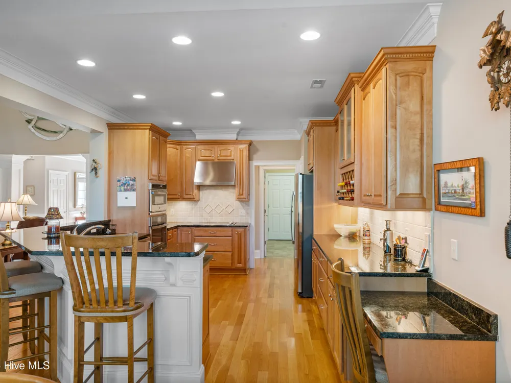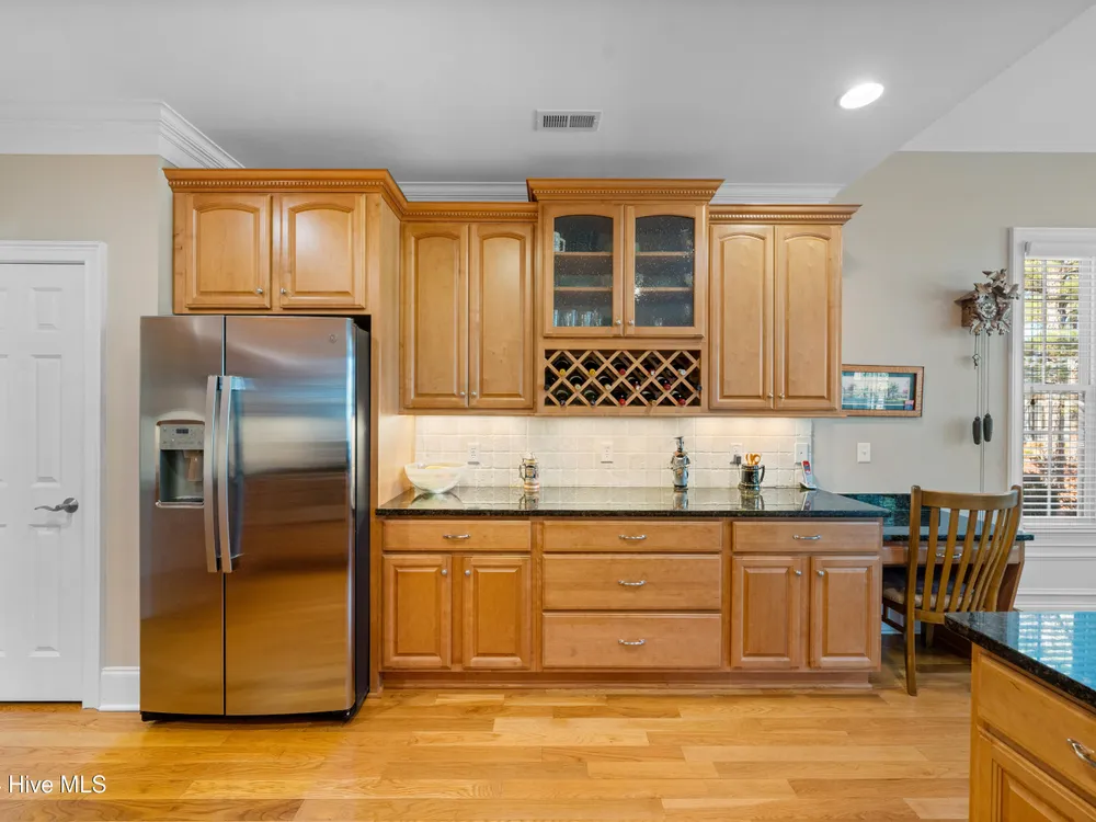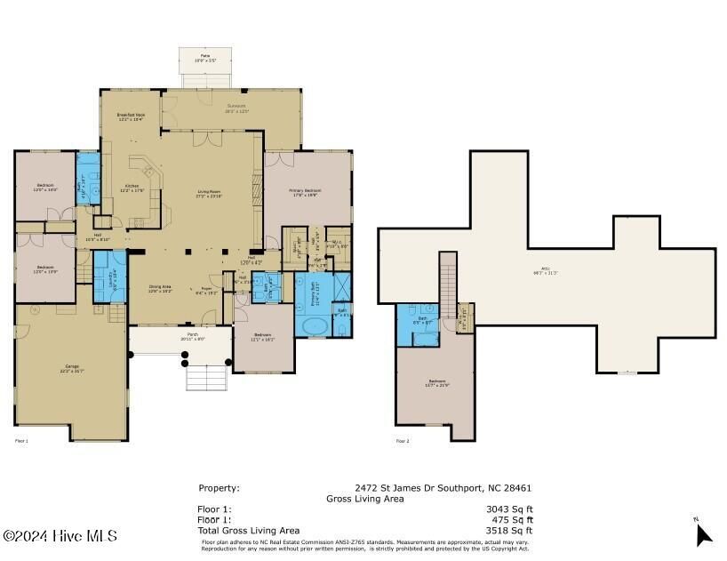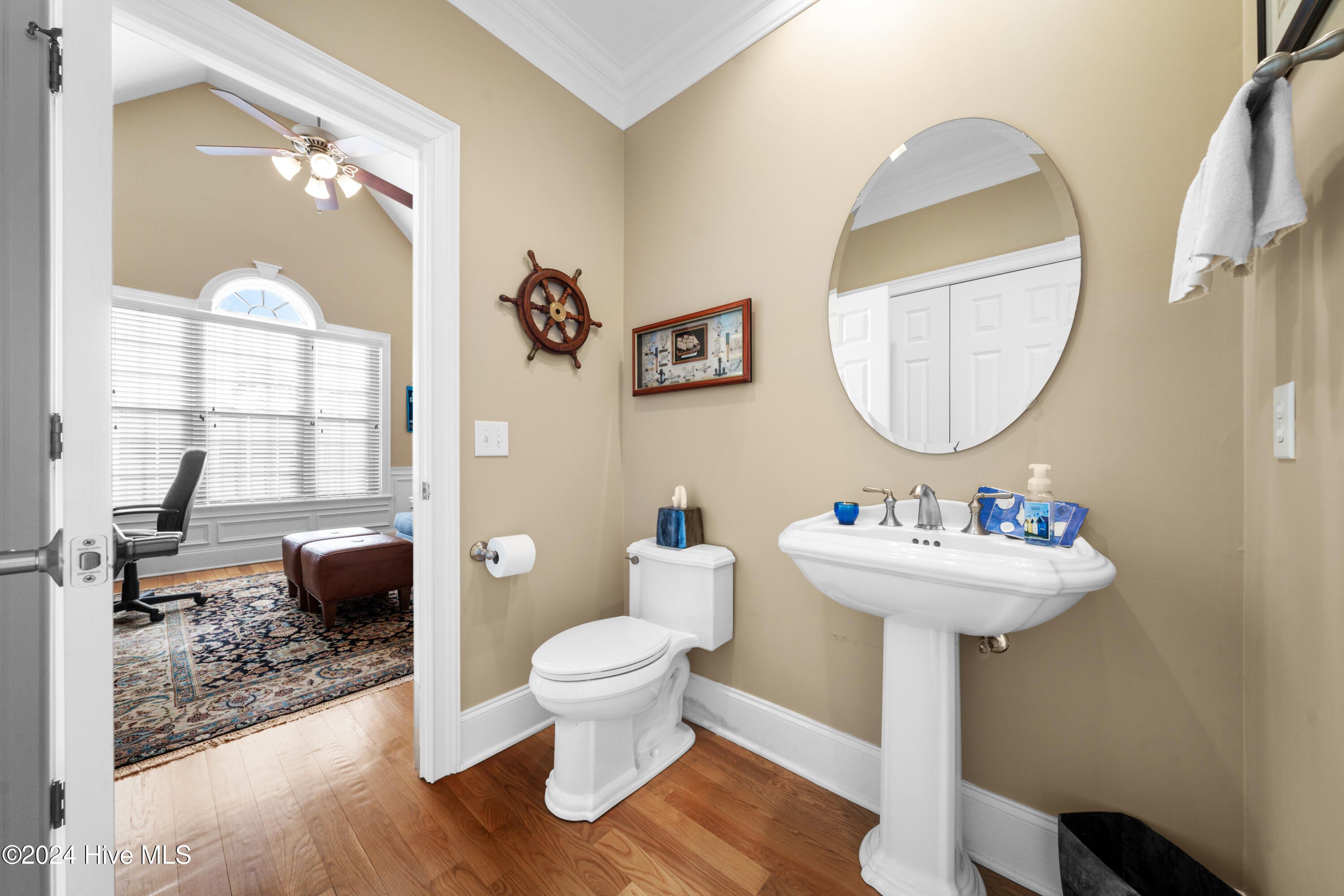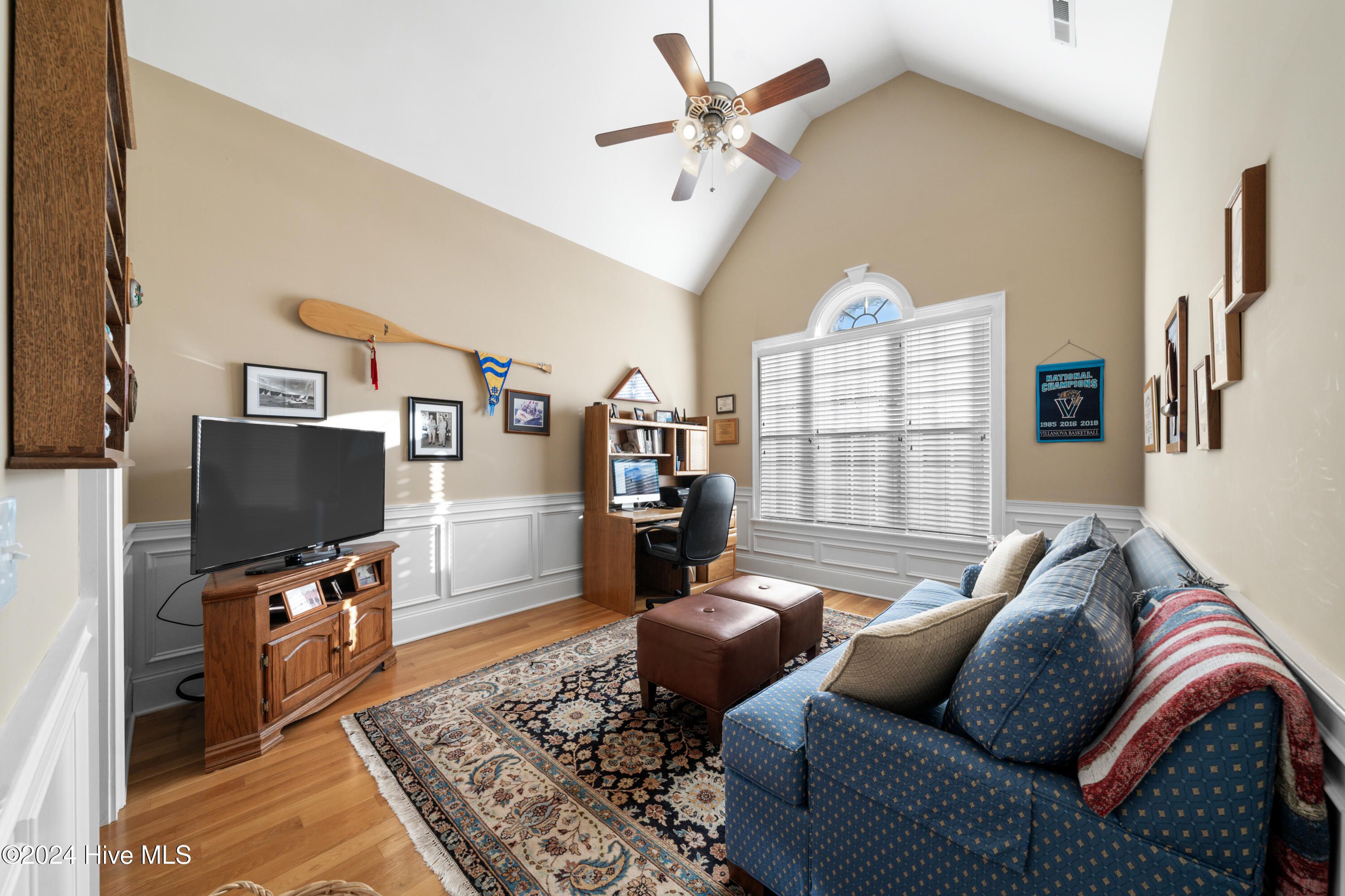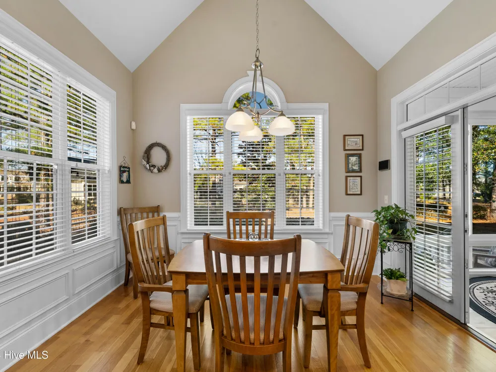 This beautiful custom built home boasts an attractive curb appeal that exudes timeless charm and character. The excellent location puts you just minutes away from the full-scale St. James marina, waterway park a 10-acre outdoor area located on the Intracoastal waterway, and minutes away from The Grove entrance. Brick pillars frame the entrance to a stamped concrete driveway, setting a warm and welcoming tone. The exterior showcases a harmonious blend of multiple rooflines (new roof installed 2024), elegant brickwork, and durable cement composite siding. A rocking chair front porch, accented by graceful arched transom windows, invites you to relax. Spanning over 3,500 heated square feet, the residence offers three spacious bedrooms and three and a half bathrooms, making it the perfect blend of comfort and sophistication. The entryway is a showcase of elegant and thoughtful design, featuring gorgeous hardwood flooring. Crown molding and custom wainscoted columns frame the formal dining room, which is further distinguished by an octagon-shaped tray ceiling and a striking wood inlay border that adds intricate detail to the floor. The space flows seamlessly into the great room, where a vaulted ceiling and a cozy gas fireplace create a warm and inviting ambiance. Custom recessed built-ins add both functionality and charm, while natural light warms the room through atrium doors crowned with a graceful half-moon transom window. These doors lead to a tiled sunroom with skylights, offering peaceful views of the beautifully landscaped backyard, complete with a paver patio for outdoor relaxation and entertaining. The spacious kitchen features wood cabinetry, stainless steel appliances, black granite counters, a built-in wine rack, and a tumbled stone backsplash. Bar-height seating at the peninsula opens to the breakfast nook, which boasts a vaulted ceiling, custom wainscoting, and picturesque backyard views. The owner's suite is tucked away for maximum privacy and features a