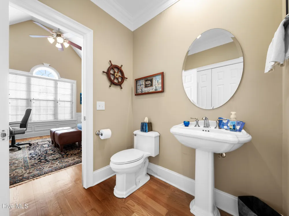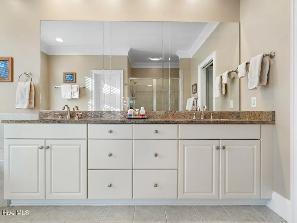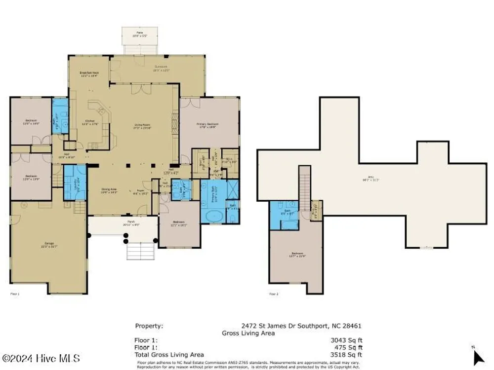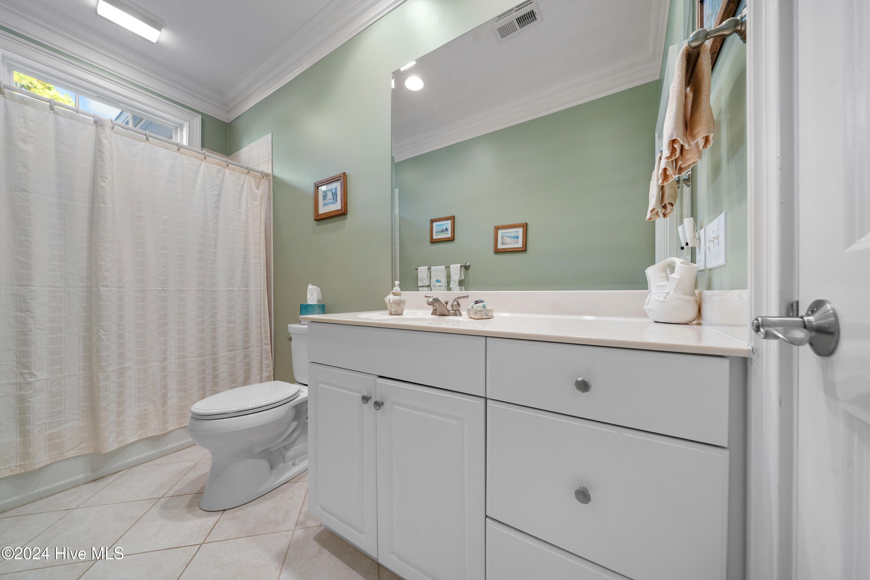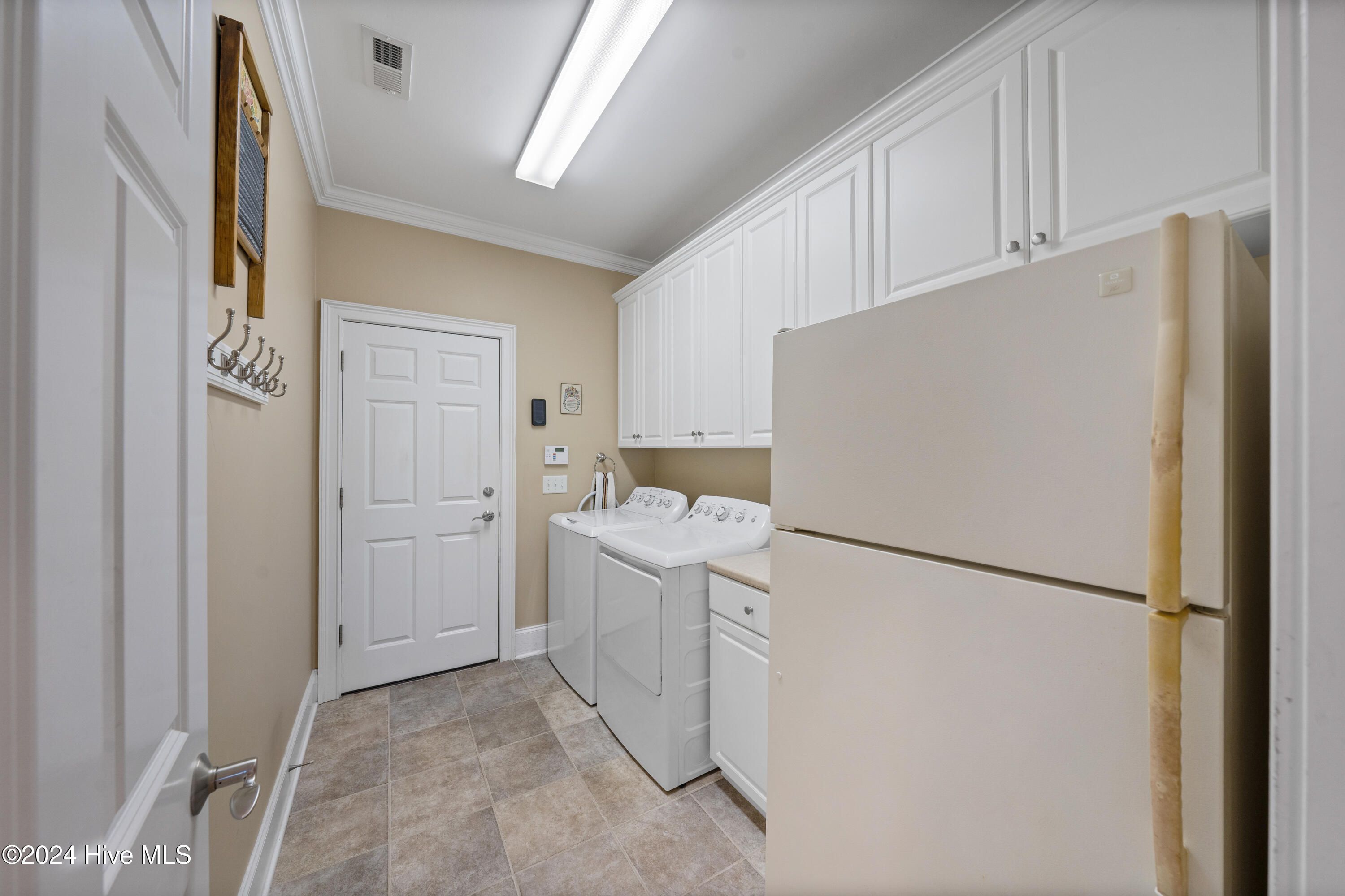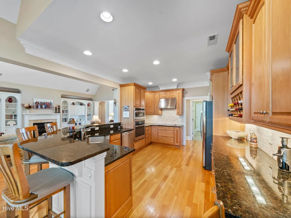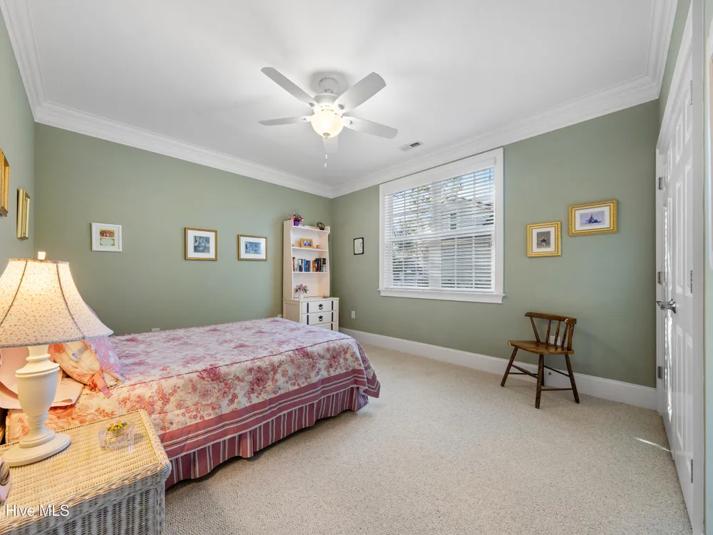 This beautiful custom built home boasts an attractive curb appeal that exudes timeless charm and character. The excellent location puts you just minutes away from the full-scale St. James marina, waterway park a 10-acre outdoor area located on the Intracoastal waterway, and minutes away from The Grove entrance. Brick pillars frame the entrance to a stamped concrete driveway, setting a warm and welcoming tone. The exterior showcases a harmonious blend of multiple rooflines (new roof installed 2024), elegant brickwork, and durable cement composite siding. A rocking chair front porch, accented by graceful arched transom windows, invites you to relax. Spanning over 3,500 heated square feet, the residence offers three spacious bedrooms and three and a half bathrooms, making it the perfect blend of comfort and sophistication. The entryway is a showcase of elegant and thoughtful design, featuring gorgeous hardwood flooring. Crown molding and custom wainscoted columns frame the formal dining room, which is further distinguished by an octagon-shaped tray ceiling and a striking wood inlay border that adds intricate detail to the floor. The space flows seamlessly into the great room, where a vaulted ceiling and a cozy gas fireplace create a warm and inviting ambiance. Custom recessed built-ins add both functionality and charm, while natural light warms the room through atrium doors crowned with a graceful half-moon transom window. These doors lead to a tiled sunroom with skylights, offering peaceful views of the beautifully landscaped backyard, complete with a paver patio for outdoor relaxation and entertaining. The spacious kitchen features wood cabinetry, stainless steel appliances, black granite counters, a built-in wine rack, and a tumbled stone backsplash. Bar-height seating at the peninsula opens to the breakfast nook, which boasts a vaulted ceiling, custom wainscoting, and picturesque backyard views. The owner's suite is tucked away for maximum privacy and features a