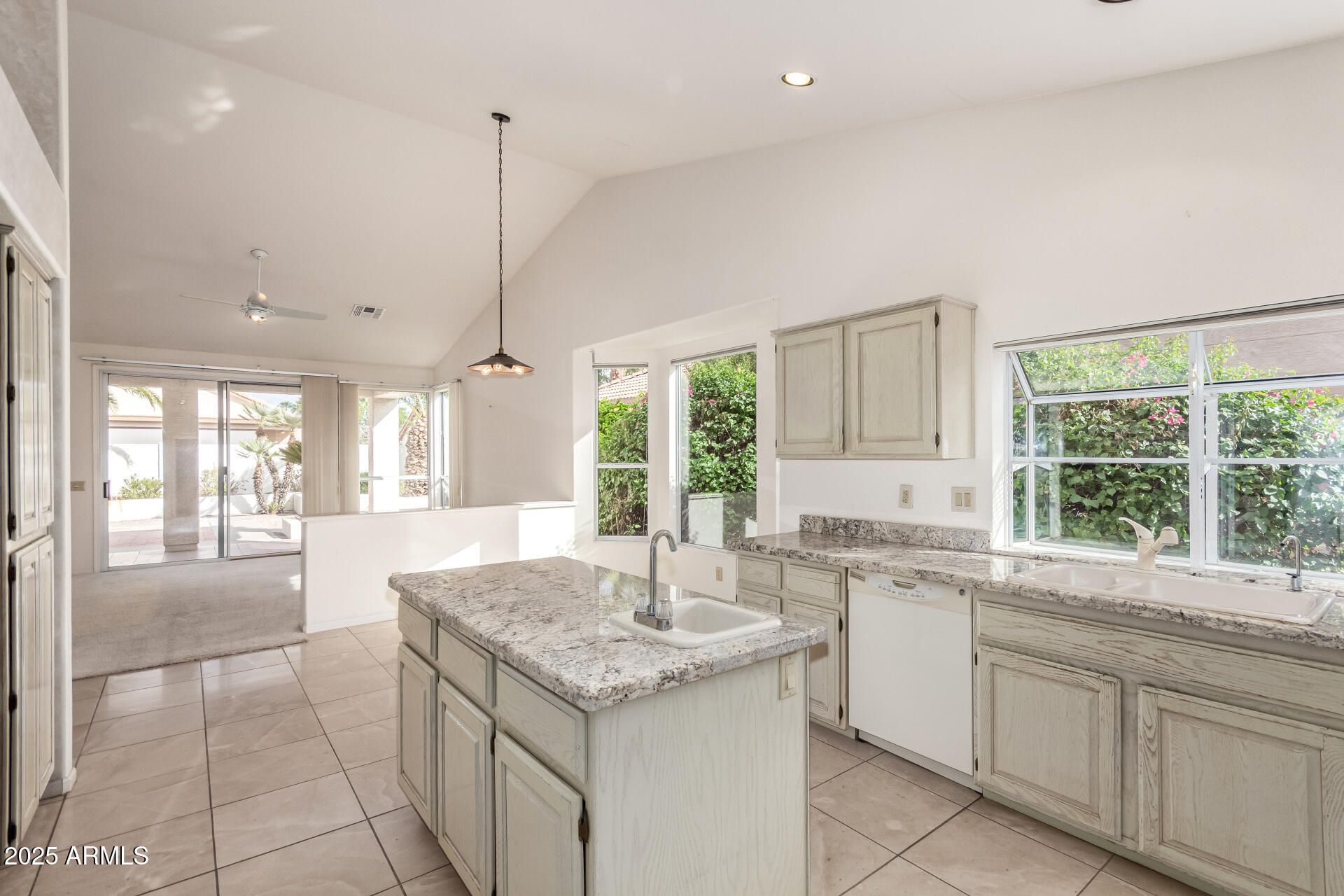Popular Barcelona model. Greatroom living floorplan.Vaulted ceilings and lots of natural light! Kitchen features ample cabinetry, granite counters and work island. Expanded laundry for this model is conveniently located. Master suite with exit to patio. Master bath has soaker tub and shower. Huge walk in closet. Hallway storage cabinets.Oversized guest room has private access to guest bath creating an ensuite space. Guest room walk in closet too! Additional flex space , great for office, hobbies or additional dining area. 2.5 car garage with storage cabinets. Large patio offers covered and uncovered space to soak up the sun! Desert landscaping. Great opportunity to update with your own design options.