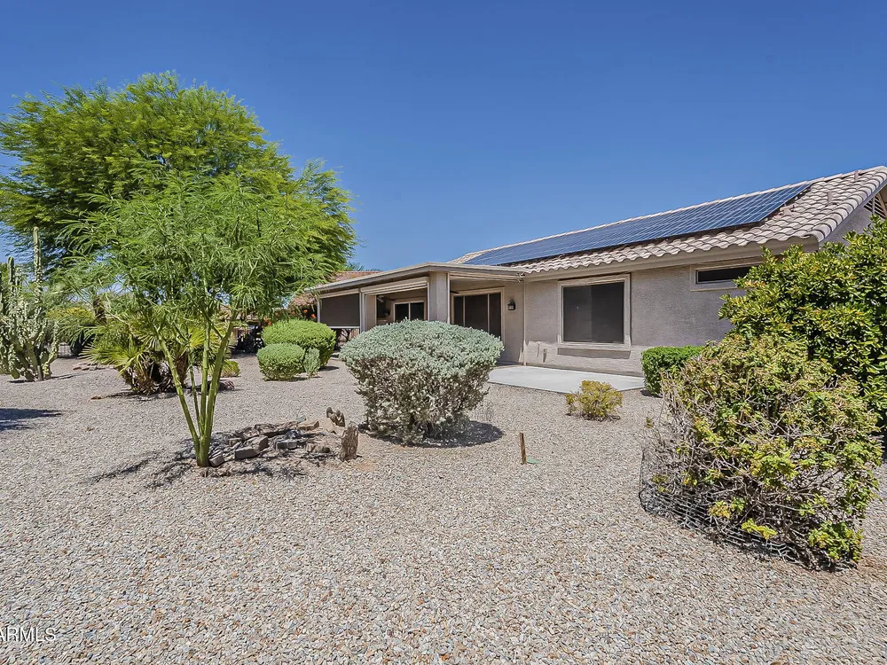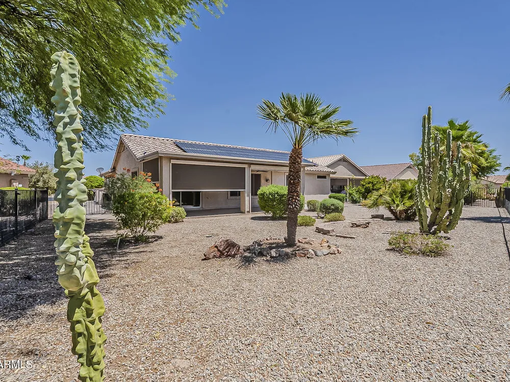 Motivated Seller! Bring an offer! Discover this one-of-a-kind gem in Mission Royale's active adult community! This energy-efficient home features owned solar panels with a Tesla backup battery, keeping your energy costs low year-round. Enjoy the outdoors in comfort with power roll-down sun screens enclosing the back patio—perfect for privacy and staying cool. Inside, you'll find 2 spacious bedrooms, a den with double doors, and an open-concept layout. The kitchen shines with stainless appliances and handy slide-out shelves. Fresh interior paint, epoxy-coated garage and patios, plus a fenced backyard and built-in workspace make this home truly move-in ready!