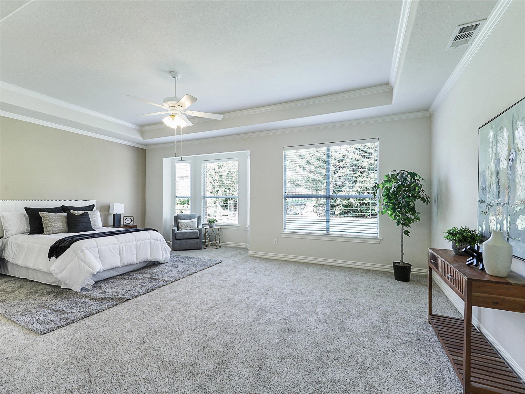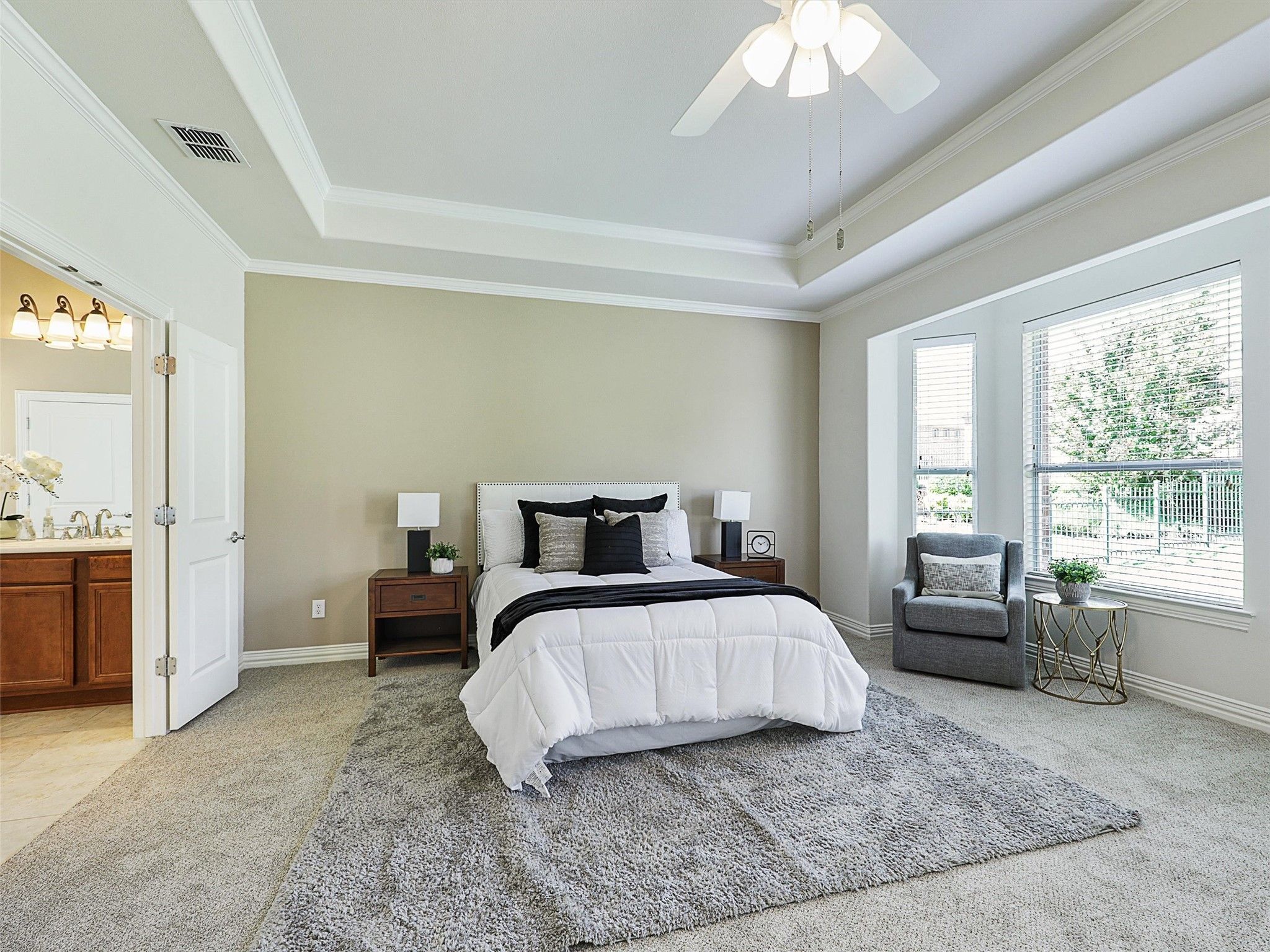 What an Amazing Home in Frisco Lakes! This Concord Floor Plan, nestled on a lovely oversized lot, offers exquisite features including extensive areas for living, entertainment and enjoyment. The elegant trayed and coffered ceilings, crown molding throughout and Brand NEW Carpet compliment the home. Enjoy the fireplace with gas logs on those chilly nights. The luxurious oversized, I mean Really Oversized primary retreat, with new carpet boasts a bay window, seating area, with the primary bath with separate vanities, a large garden tub, and a walk-in shower. Guests will enjoy a private bedroom with an adjacent bath. This home also features an impressive study with French doors and coffered ceilings. A formal dining room with wainscoting leads into a gourmet kitchen. The refrigerator is included in this kitchen with granite counters, upgraded cabinets, stainless appliances, and a 5-burner gas cooktop. The breakfast area with a buffet serving center opens to a spacious great room. And Oh, the Sunroom is so bright and light overlooks a landscaped yard and patio that you can make into your own celestial backyard oasis. Additional perks include a utility room with a sink, cabinets and includes the washer and dryer. This home is absolutely ready for you to make it your own! Oh, and don’t forget the amazing amenities that are offered at Frisco Lakes Del Webb: a veritable Cruise Ship on Land! Come See us!