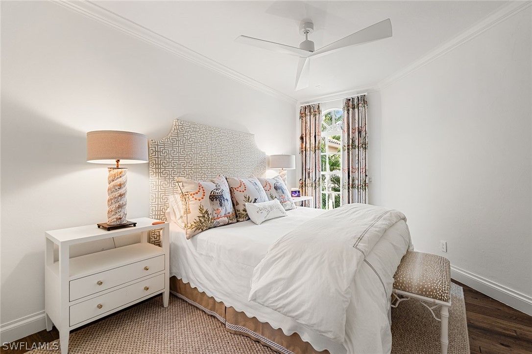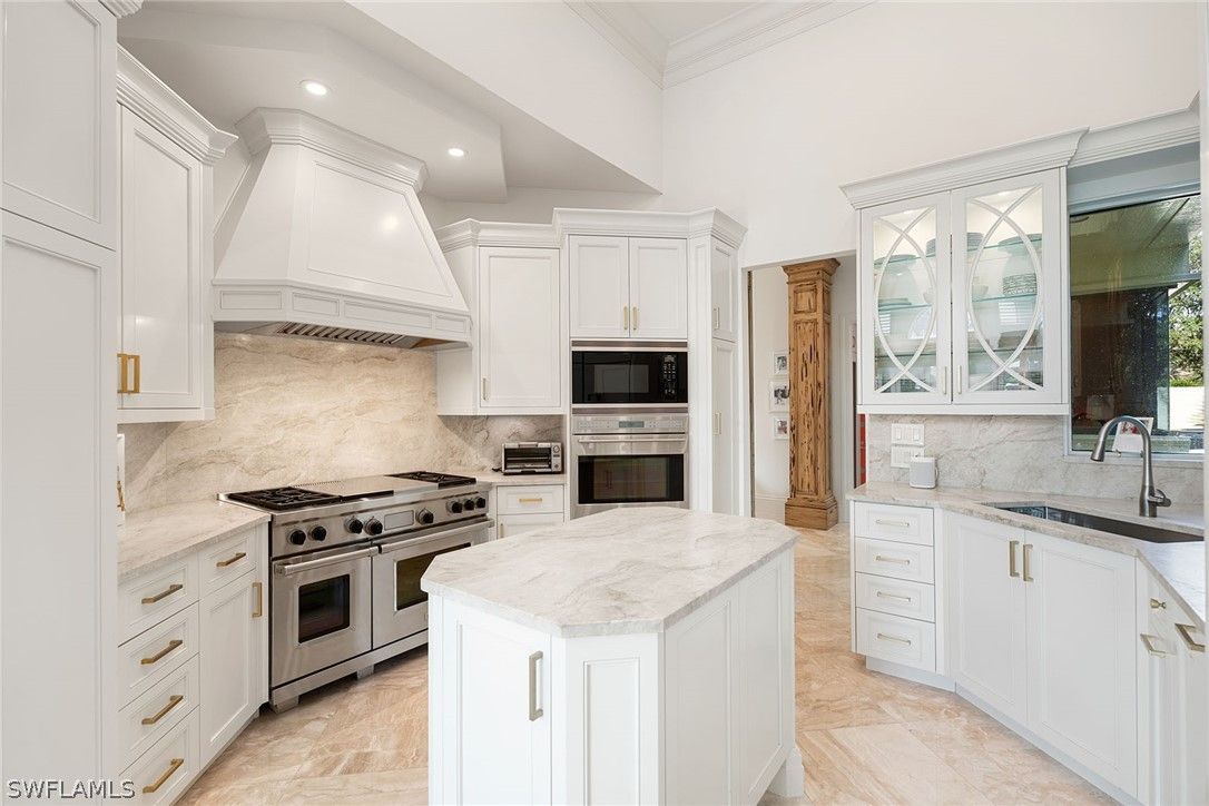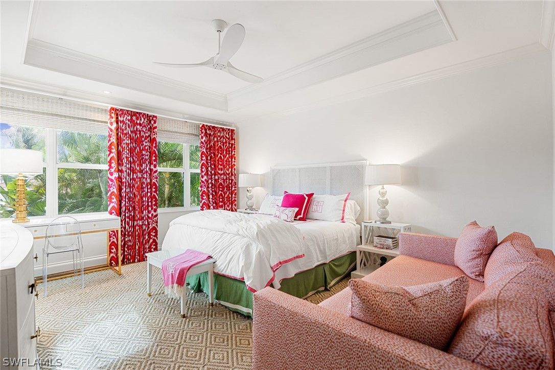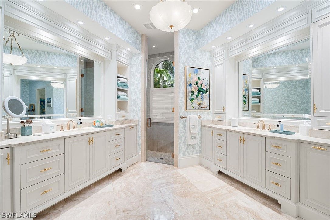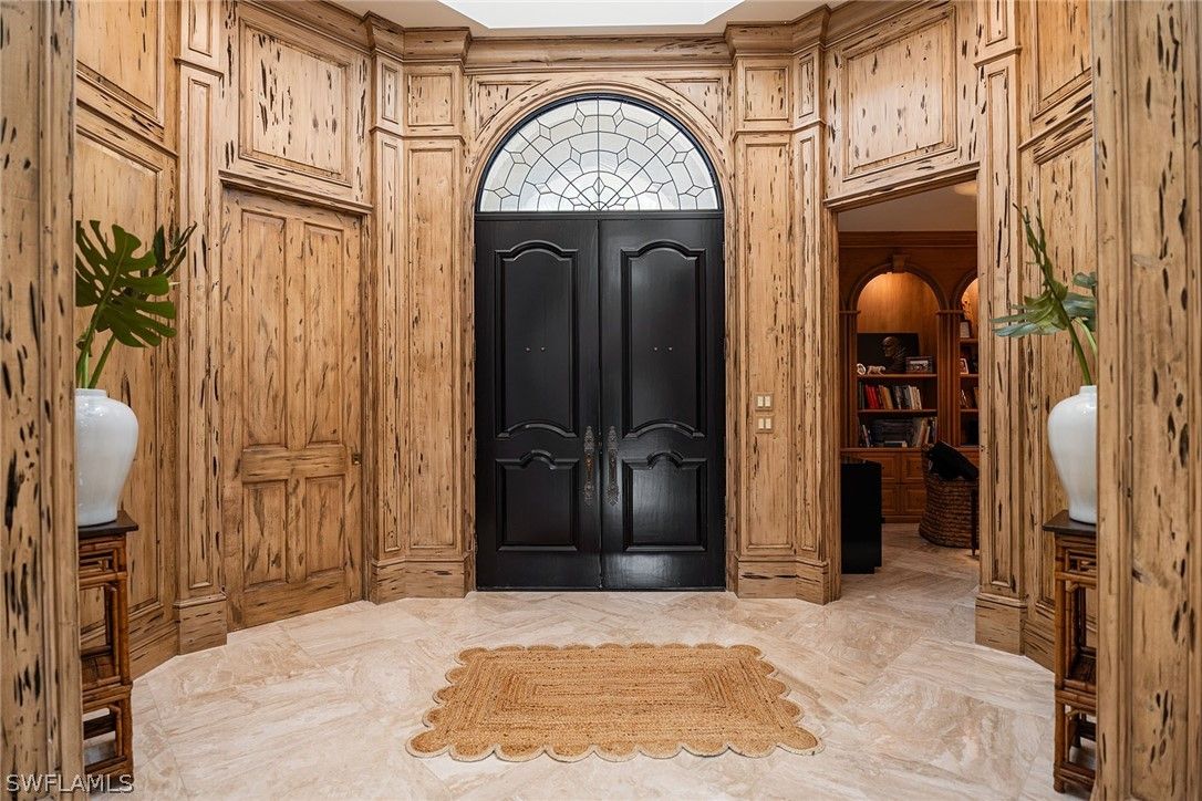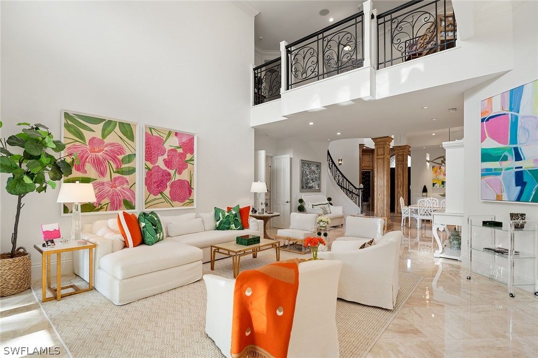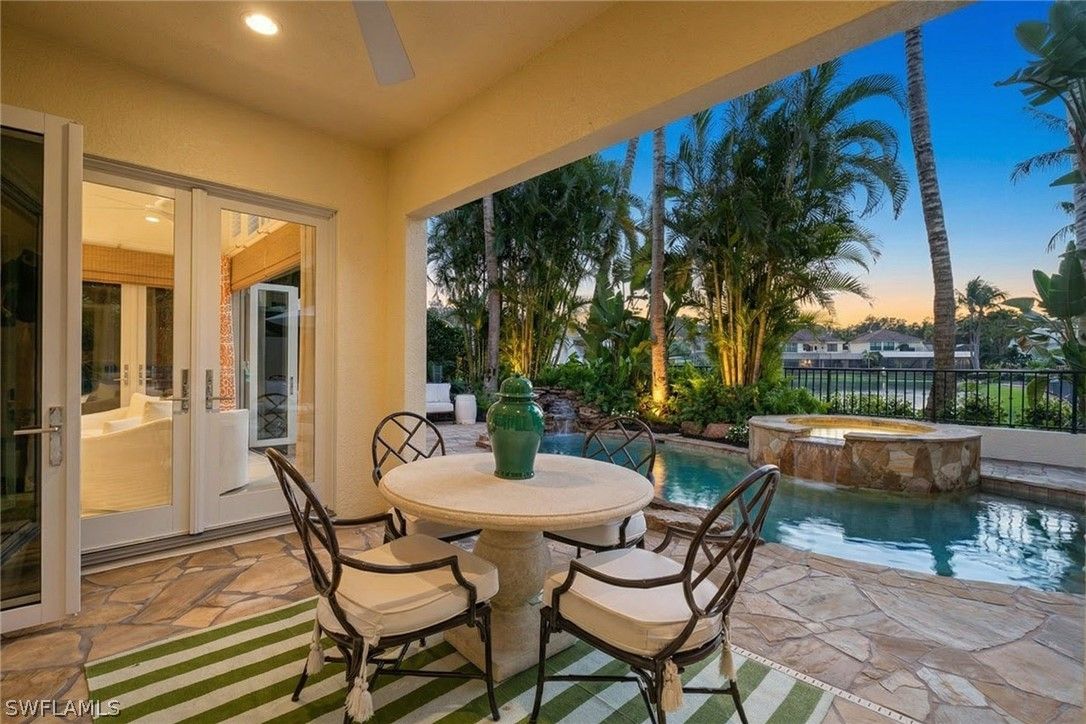 Tucked within the gated private beachfront community of Bay Colony, this beautifully redesigned four bedroom, four and a half bath residence offers refined coastal living with the ease of ownership and maintenance included. Soaring ceilings with dramatic two-story living areas, pecky cypress accents, custom millwork and cabinetry, and an updated kitchen with a six-burner professional gas range create a distinctive interior. Chic window treatments and wallpaper selections by interior designer Jett Thompson give the home a light filled and welcoming atmosphere. An updated EuroWall impact folding door system creates seamless indoor-outdoor living, opening to an expansive lanai and a beautifully designed pool surrounded by tropical landscaping. The home is positioned on a prime south facing point lot, providing exceptional privacy and abundant natural light. Residents enjoy access to the Private Bay Colony Beach Club with beachfront dining, Chickee Bar and beach services, along with newly updated tennis facilities. Ownership also includes full access to Pelican Bay amenities featuring pickleball, fitness center, miles of private beach, and two additional beachfront restaurants.