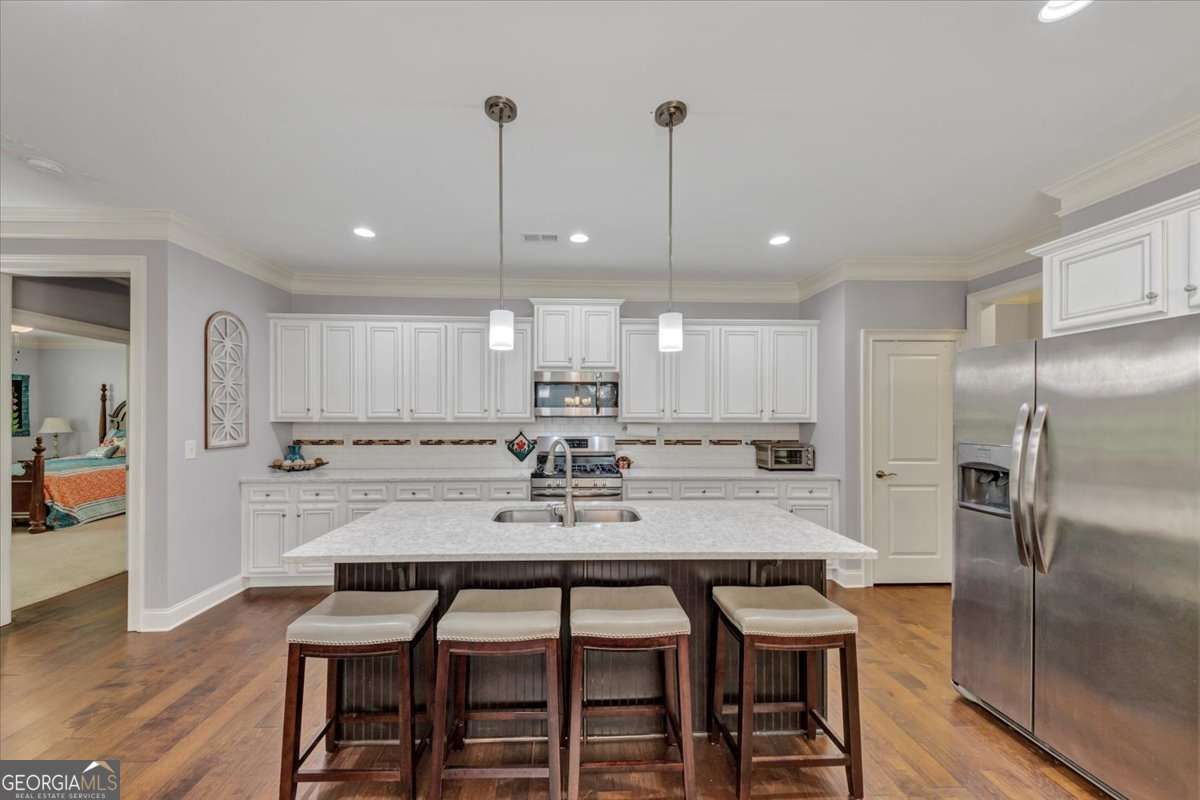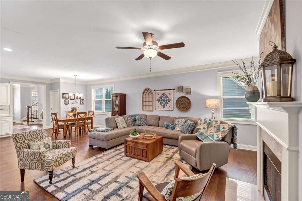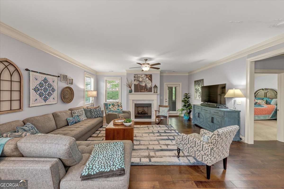 Peaceful and quiet! A beautifully designed and well maintained home located in the 55+ active, adult community of Barrett Preserve. This residence offers a perfect balance of style, comfort, and low-maintenance living. From the inviting covered front porch, step into a spacious foyer featuring built-in bookshelves, setting the tone for the home's character and craftsmanship. The open-concept design flows effortlessly into the gourmet kitchen, dining area, and great room, creating a warm and welcoming space for gatherings and everyday living. The chef's kitchen is a true highlight, complete with quartz countertops, a large breakfast bar, stainless steel appliances, ample cabinetry, and a walk-in pantry. The great room centers around a marble fireplace and opens to a covered back patio, ideal for relaxing mornings or evenings outdoors. The primary suite on the main level provides a luxurious retreat with trey ceilings, a spa-inspired bath featuring dual cultured marble vanities, a tiled shower with a comfort bench, and an extra large walk-in closet. Upstairs, you'll find two spacious guest bedrooms connected by a Jack and Jill bath, along with a generous walk-in storage area perfect for hobbies or seasonal items. This exceptional home in Barrett Preserve combines timeless design with modern convenience-all just minutes from the scenic trails and natural beauty of Kennesaw Mountain.