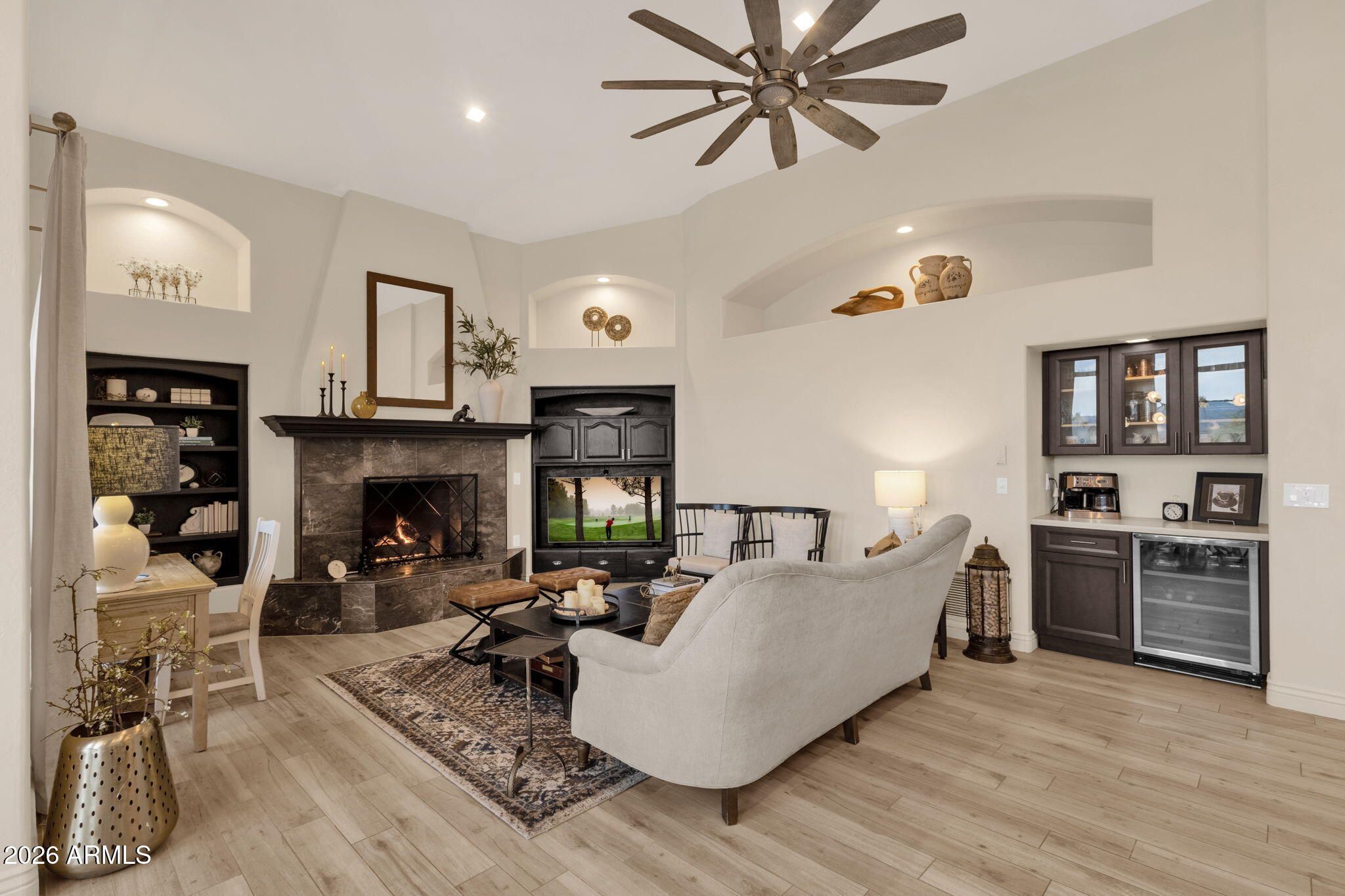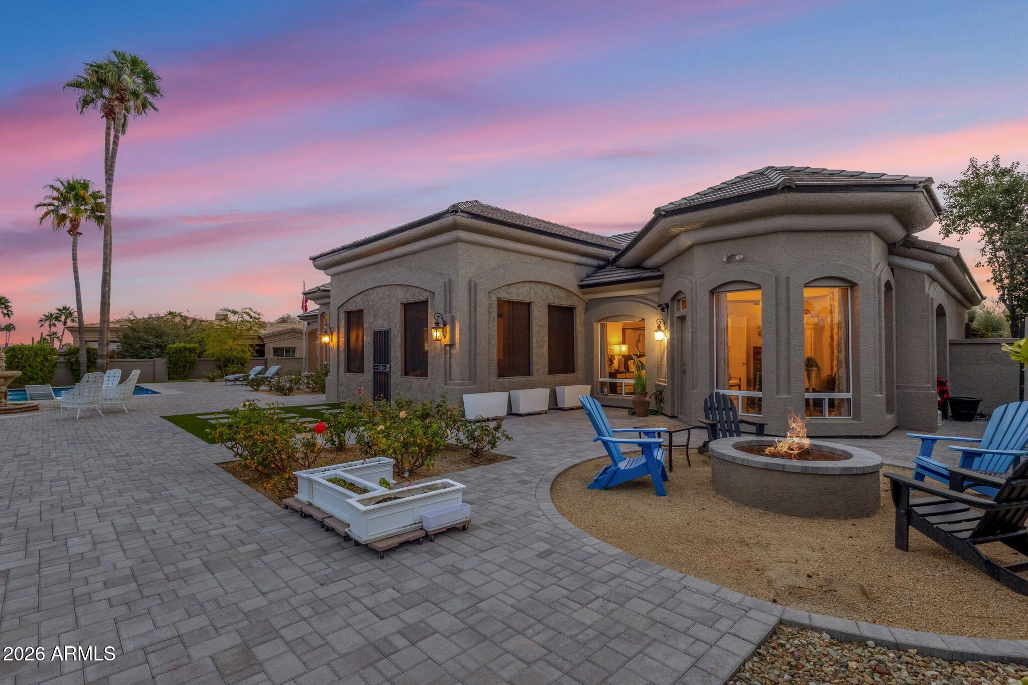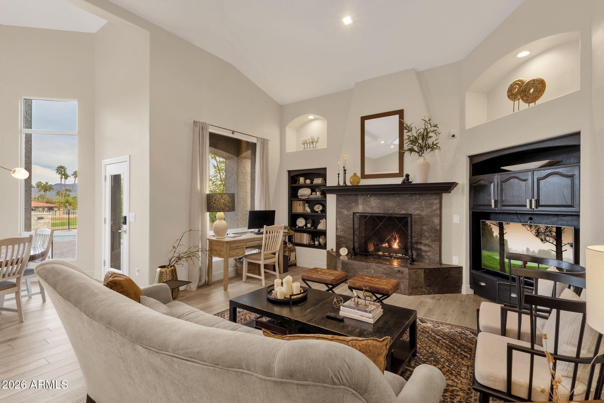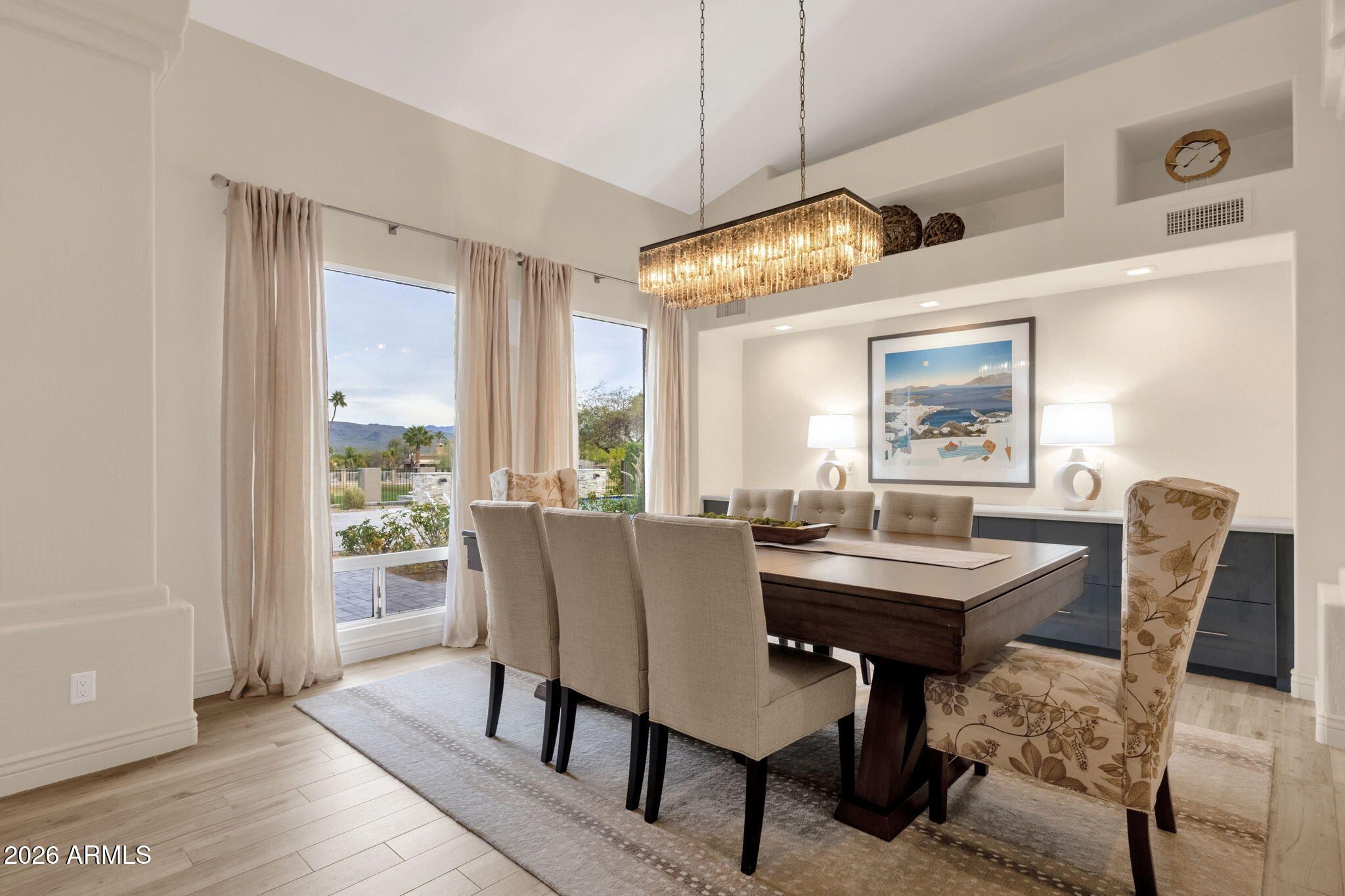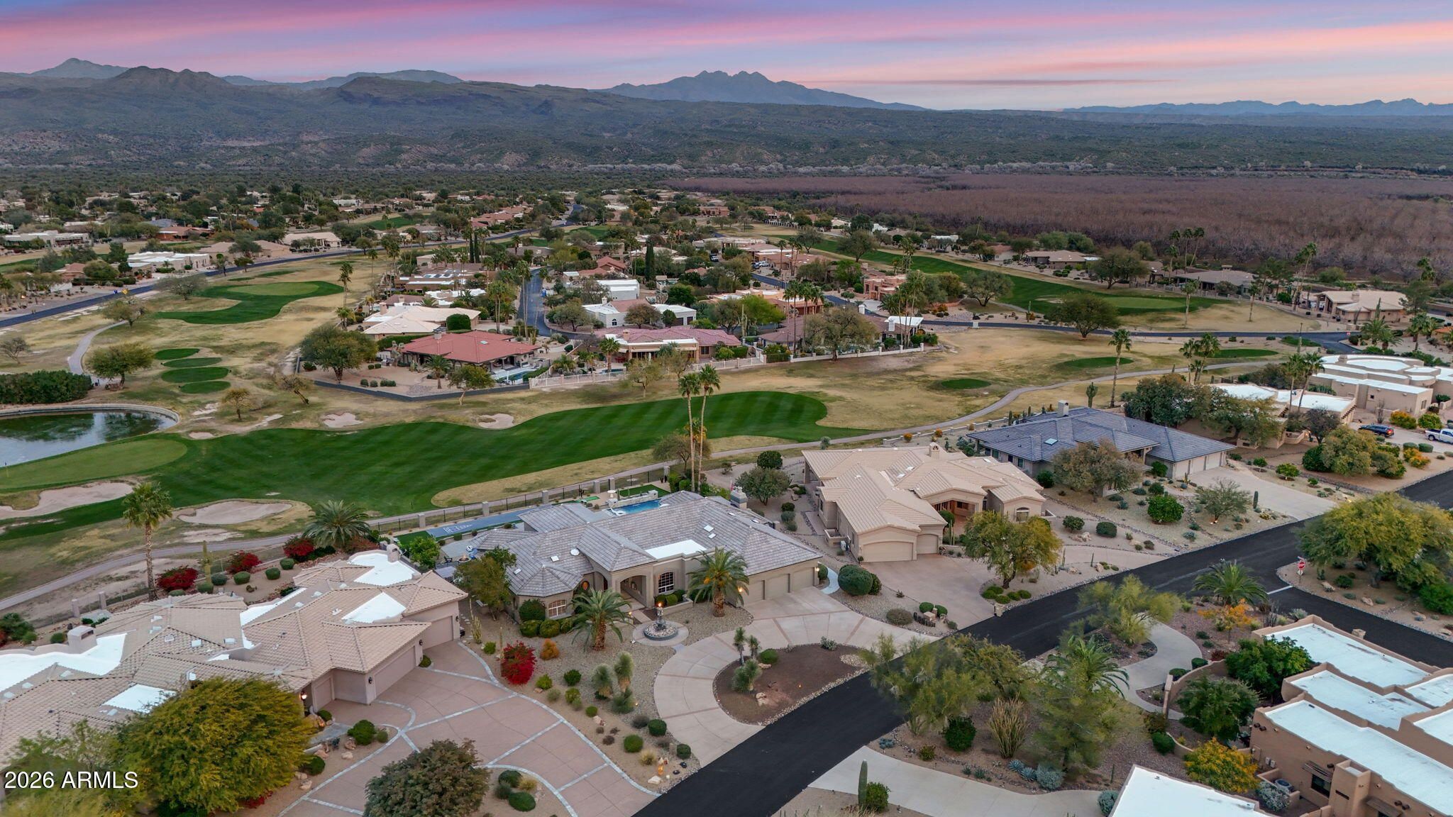 Golf course living with sweeping Four Peaks views, a fully reimagined backyard, and over 4,100 square feet of updated space. Set on a premium golf course lot in Rio Verde, this expansive home delivers sweeping Four Peaks mountain views, thoughtful updates throughout, and resort-style living in one of Arizona's most sought-after golf communities. Inside, vaulted ceilings and large windows frame mountain and fairway views while filling the home with natural light. Updated flooring, fresh interior paint, new doors, and modern light fixtures create a clean, cohesive look. The open kitchen anchors the main living space with new Quartz countertops, custom cabinetry, a large island, and all-new electric appliances from KitchenAid, Bosch, and Frigidaire. The kitchen flows seamlessly into a casual nook and living area, while the formal dining room features custom built-ins and counters, all positioned to capture the scenery beyond. The primary suite is generously sized with a sitting area, two oversized walk-in closets, and a spa-style bath featuring a separate soaking tub and a recently updated walk-in shower. Guest accommodations include a private en-suite bedroom with vaulted ceilings. An extra-large laundry room doubles as a versatile bonus spaceideal for a home gym, hobby room, or craft studiowith abundant cabinetry and counter space. The backyard has been completely transformed with approximately $200,000 in improvements. Highlights include a heated and chilled pool with water features, paver decking, a fire pit, rose gardens, artificial turf areas, shuffleboard and bags space, and a fully updated irrigation system. Mature palms grace the front yard, while the rear landscaping is brand new and designed for both beauty and low maintenance. A new roof was installed in 2026. Additional features include a two-car garage and dedicated golf cart parking and charging, sized to accommodate full-size vehicles and extended-cab trucks. Located on the 11th hole of White Wing, this home is part of the Rio Verde Country Club community. The annual HOA fee includes a family social membership with access to two regulation golf courses, six rounds of golf per year, a heated pool, a health club, pickleball and tennis courts, a community center, a library, craft rooms, restaurants, a post office, and a coffee shop. Conveniently situated just 15 minutes from Fountain Hills and North Scottsdale's Troon area, this home offers a rare combination of privacy, views, and an active golf lifestyle.