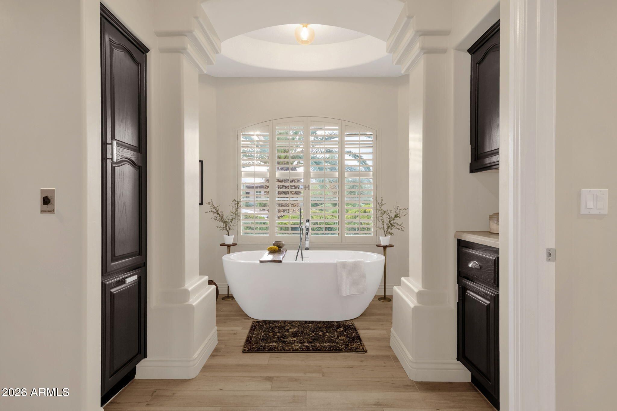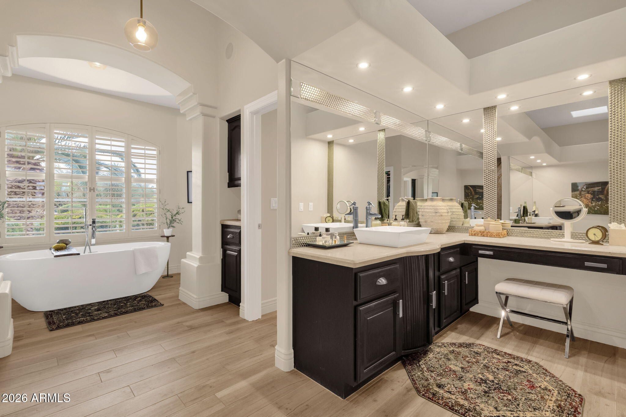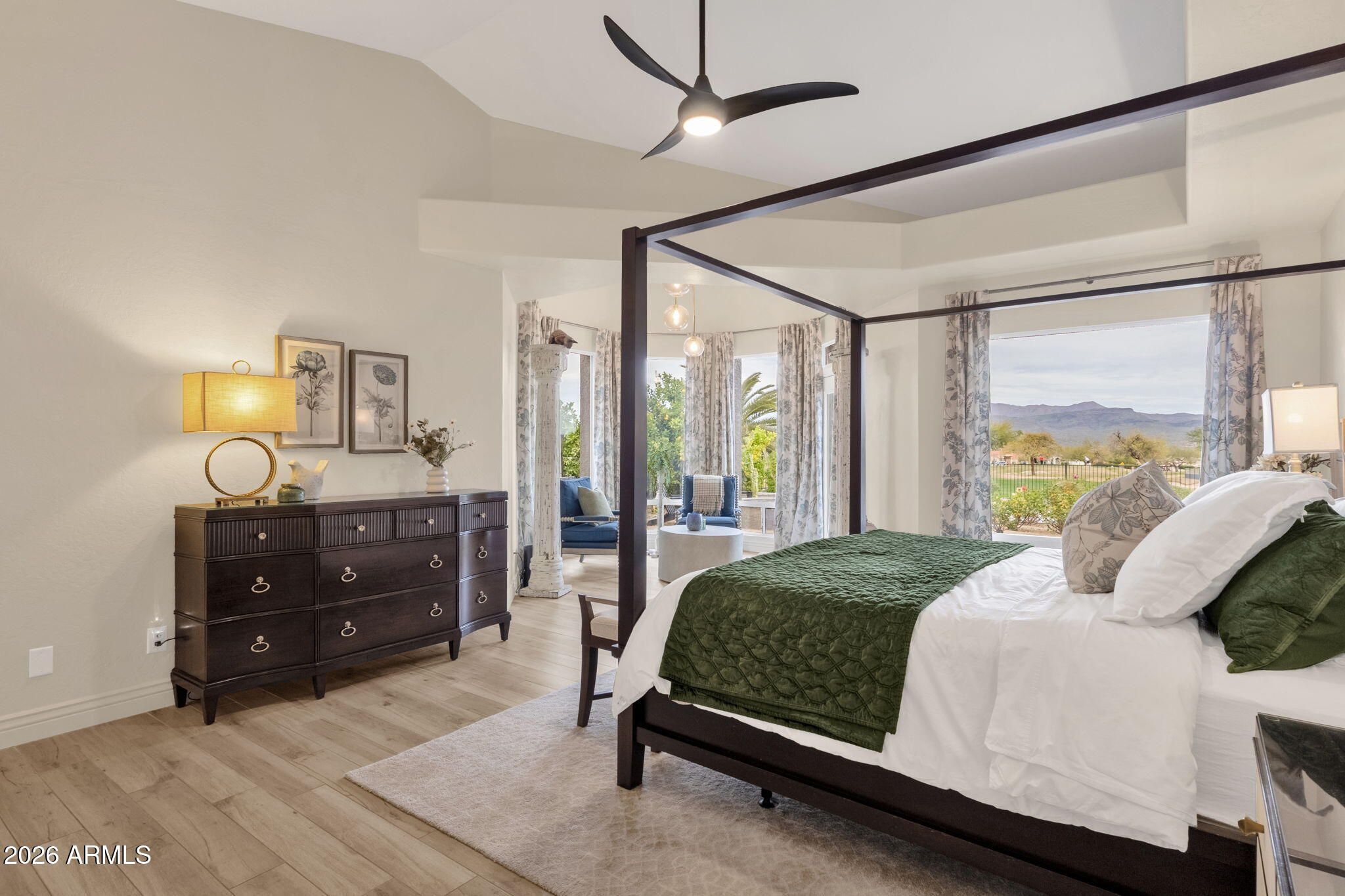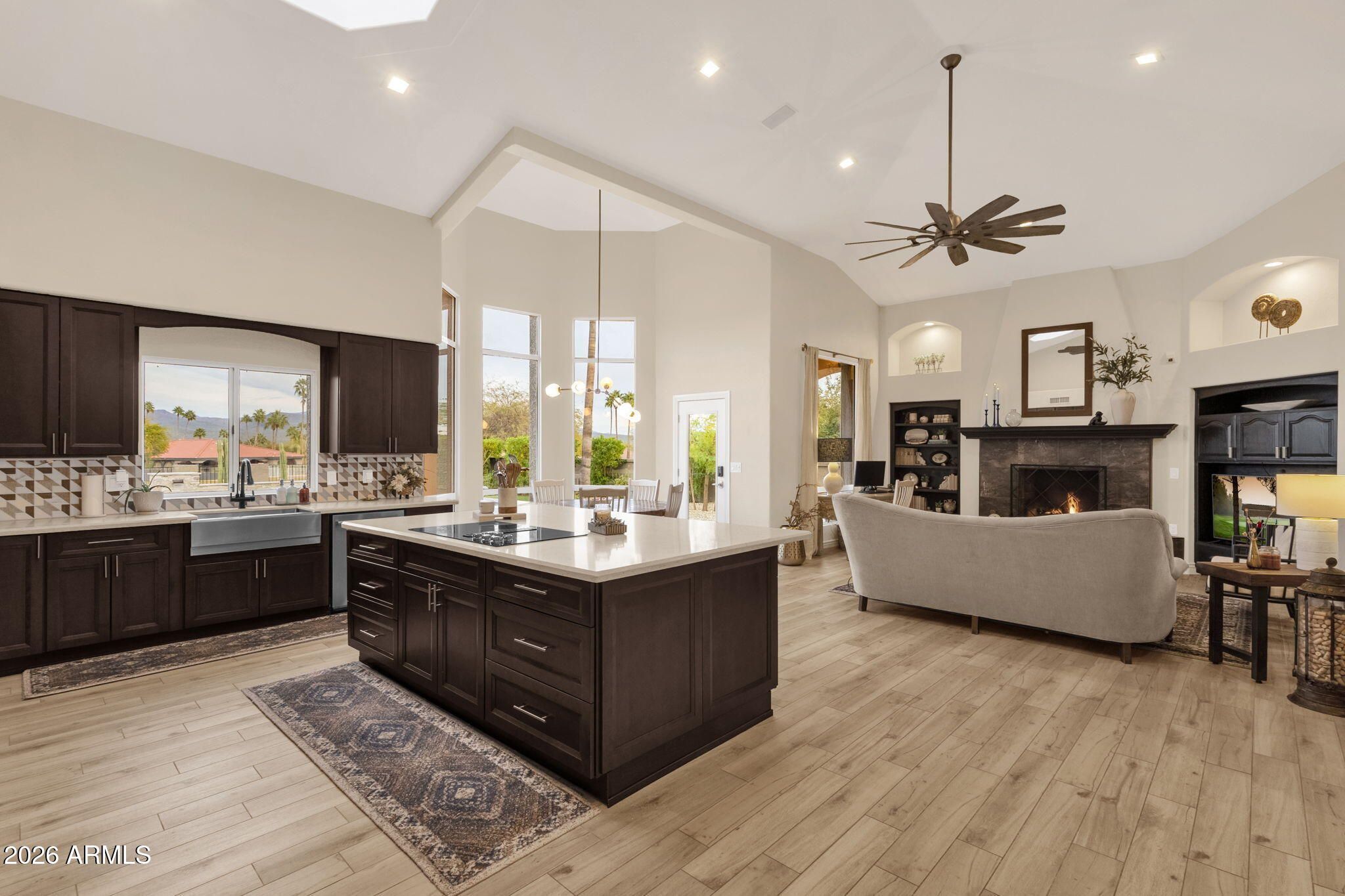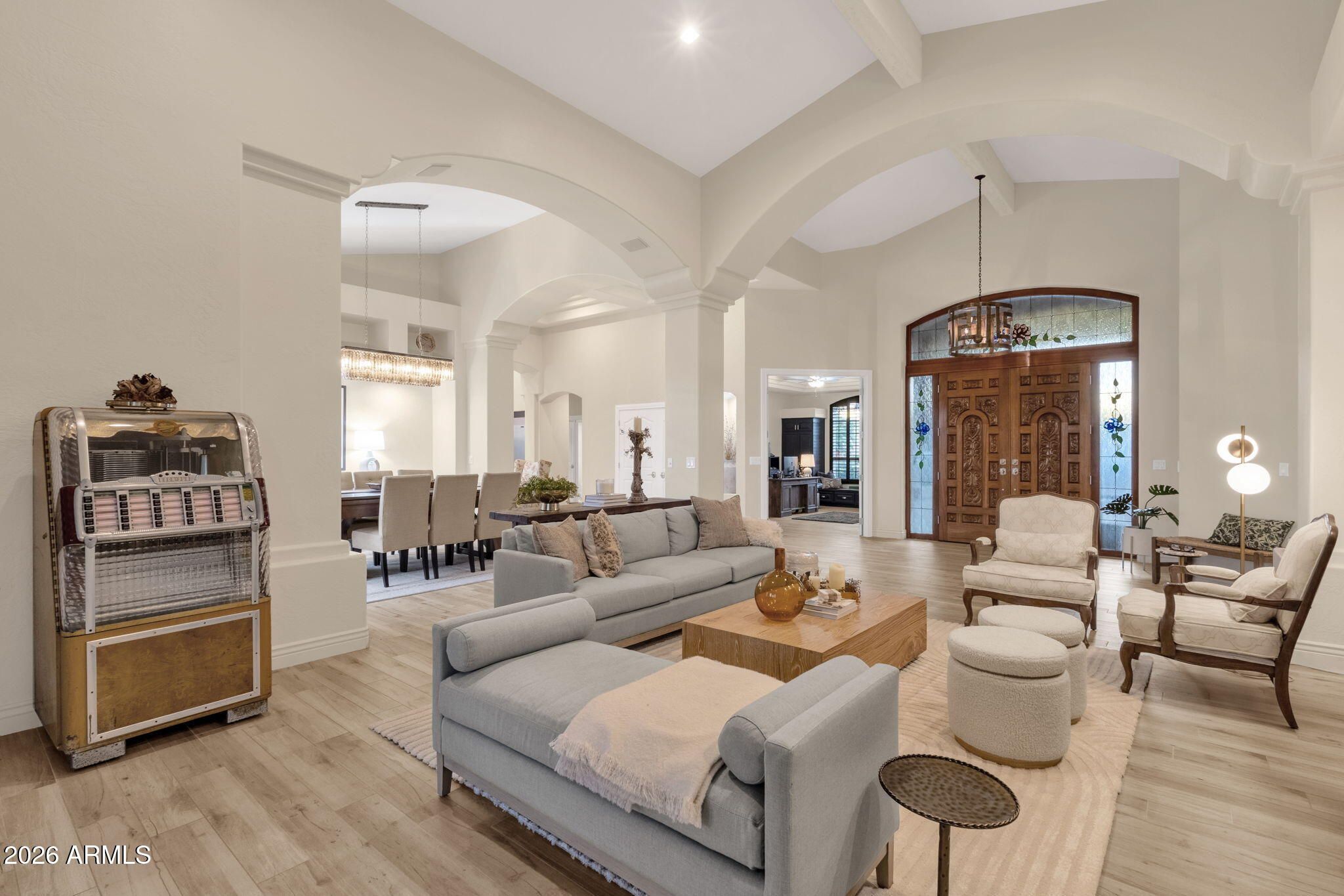 Golf course living with sweeping Four Peaks views, a fully reimagined backyard, and over 4,100 square feet of updated space. Set on a premium golf course lot in Rio Verde, this expansive home delivers sweeping Four Peaks mountain views, thoughtful updates throughout, and resort-style living in one of Arizona's most sought-after golf communities. Inside, vaulted ceilings and large windows frame mountain and fairway views while filling the home with natural light. Updated flooring, fresh interior paint, new doors, and modern light fixtures create a clean, cohesive look. The open kitchen anchors the main living space with new Quartz countertops, custom cabinetry, a large island, and all-new electric appliances from KitchenAid, Bosch, and Frigidaire. The kitchen flows seamlessly into a casual nook and living area, while the formal dining room features custom built-ins and counters, all positioned to capture the scenery beyond. The primary suite is generously sized with a sitting area, two oversized walk-in closets, and a spa-style bath featuring a separate soaking tub and a recently updated walk-in shower. Guest accommodations include a private en-suite bedroom with vaulted ceilings. An extra-large laundry room doubles as a versatile bonus spaceideal for a home gym, hobby room, or craft studiowith abundant cabinetry and counter space. The backyard has been completely transformed with approximately $200,000 in improvements. Highlights include a heated and chilled pool with water features, paver decking, a fire pit, rose gardens, artificial turf areas, shuffleboard and bags space, and a fully updated irrigation system. Mature palms grace the front yard, while the rear landscaping is brand new and designed for both beauty and low maintenance. A new roof was installed in 2026. Additional features include a two-car garage and dedicated golf cart parking and charging, sized to accommodate full-size vehicles and extended-cab trucks. Located on the 11th hole of White Wing, this home is part of the Rio Verde Country Club community. The annual HOA fee includes a family social membership with access to two regulation golf courses, six rounds of golf per year, a heated pool, a health club, pickleball and tennis courts, a community center, a library, craft rooms, restaurants, a post office, and a coffee shop. Conveniently situated just 15 minutes from Fountain Hills and North Scottsdale's Troon area, this home offers a rare combination of privacy, views, and an active golf lifestyle.