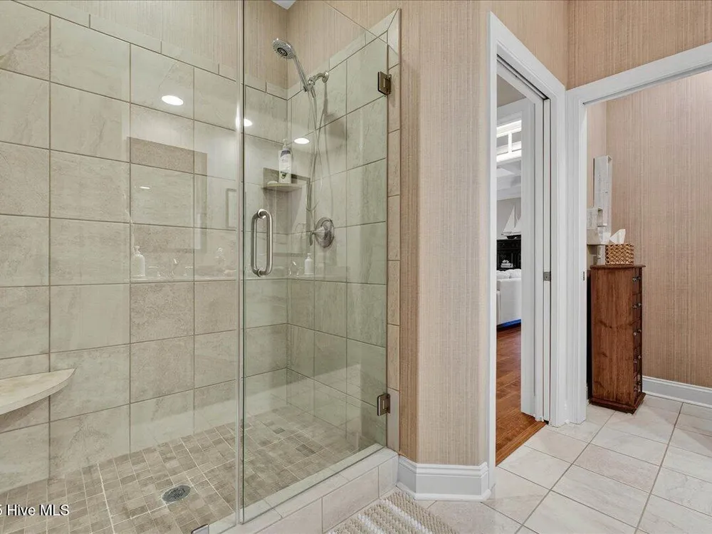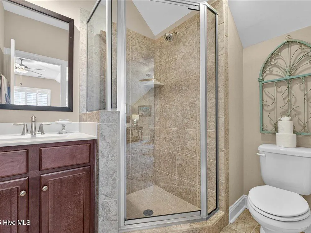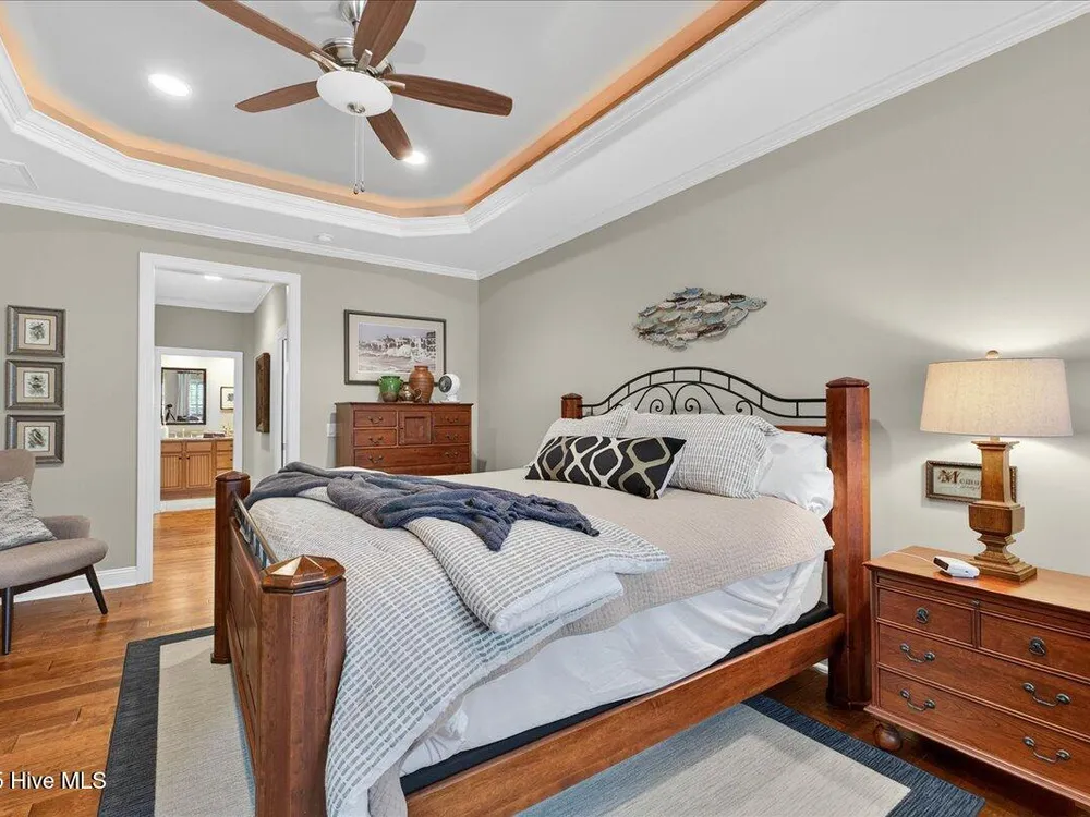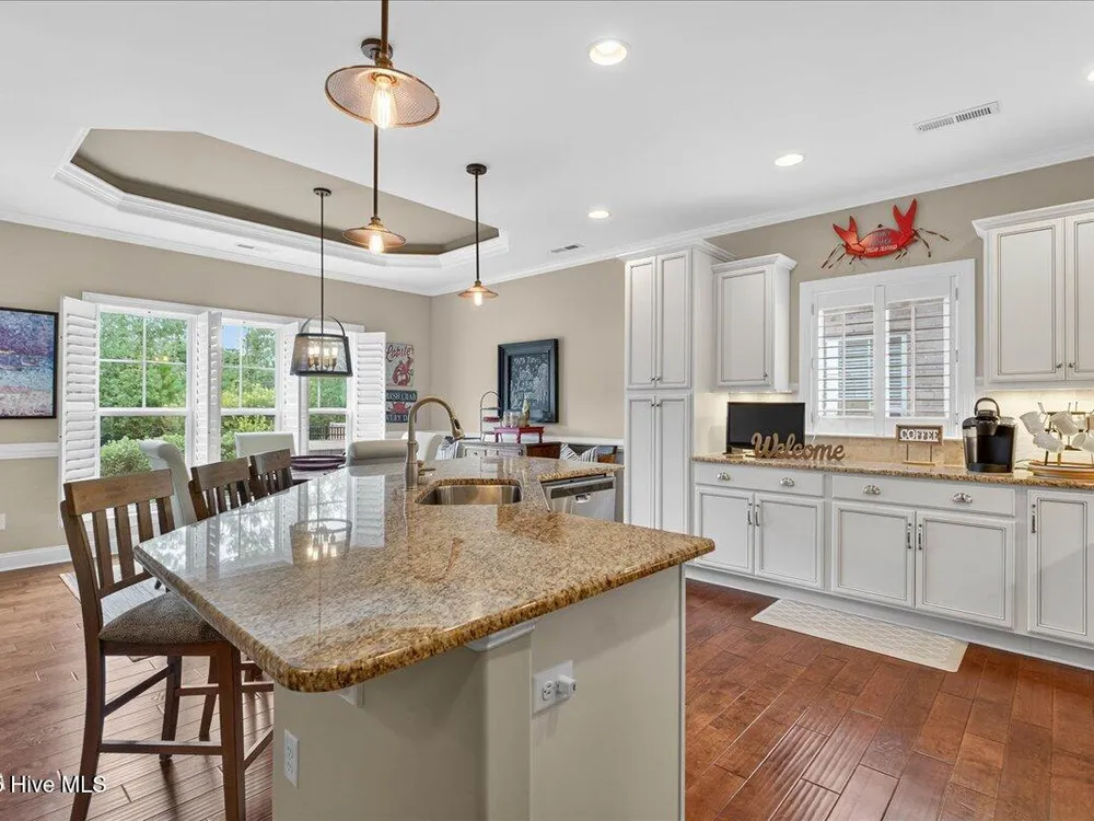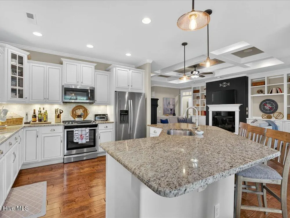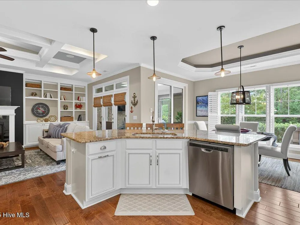 - Bookcases, Solid Surface, Walk-In Closet(s), Walk-in Shower, Tray Ceiling(s), Pantry, Master Downstairs, Kitchen Island, High Ceilings, Gas Log, Ceiling Fan(s)