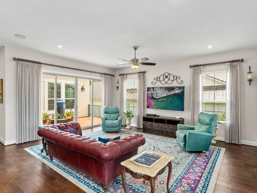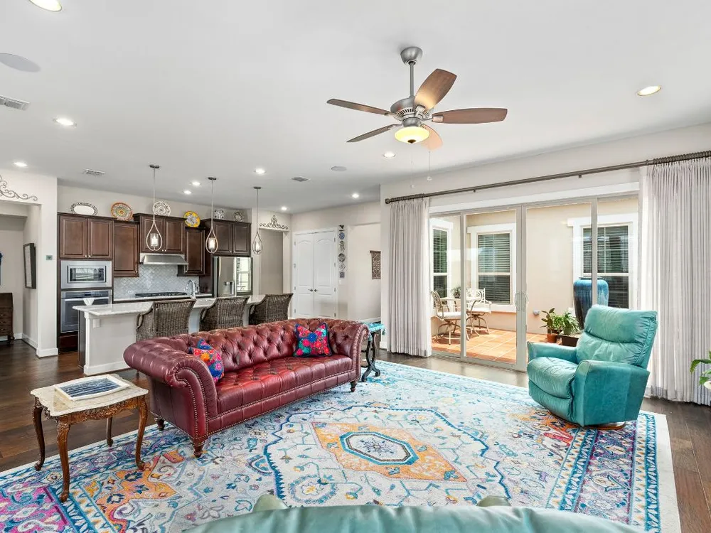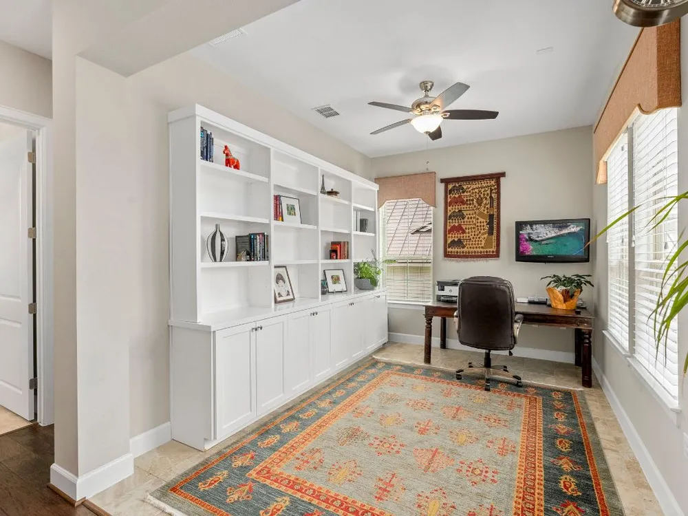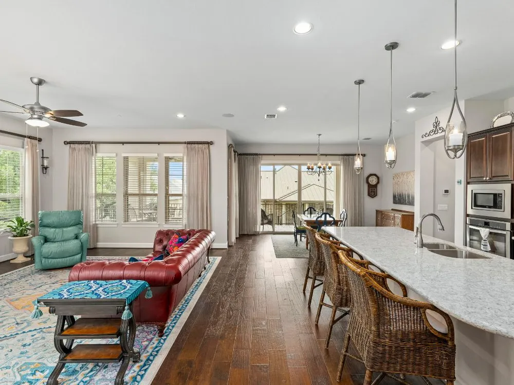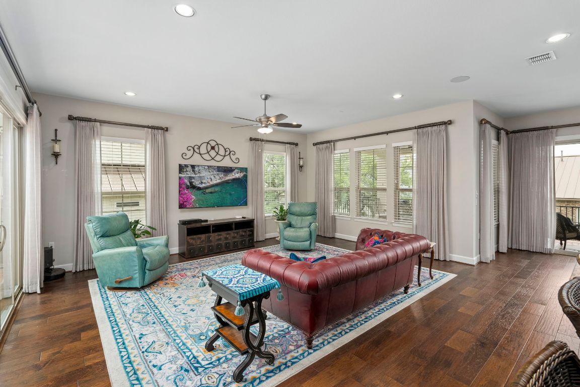 - Bookcases, Ceiling Fan(s), High Ceilings, Kitchen Island, Open Floorplan, Recessed Lighting, Wired for Sound
