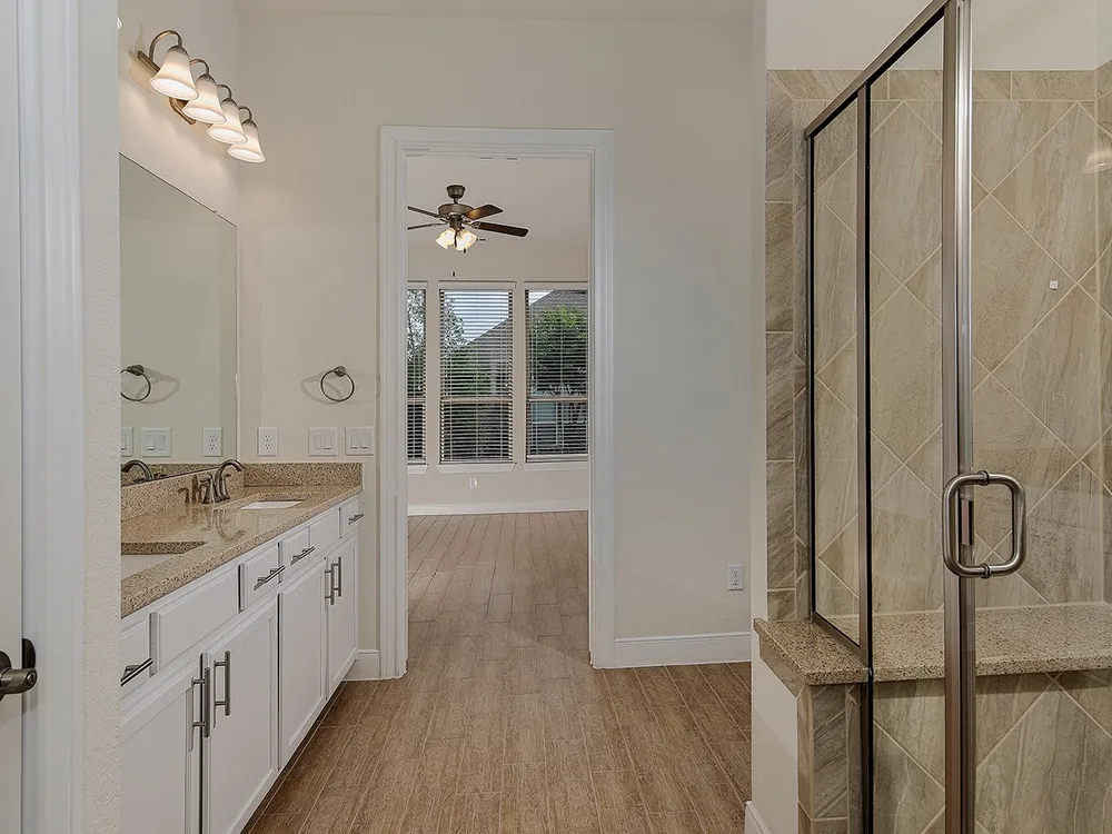 - Breakfast Bar, Double Vanity, High Ceilings, Kitchen Island, Kitchen/Family Room Combo, Pantry, Solid Surface Counters, Separate Shower, Tub Shower, Window Treatments, Ceiling Fan(s), Kitchen/Dining Combo, Living/Dining Room, Programmable Thermostat