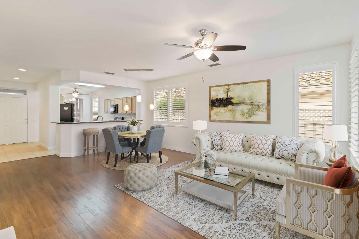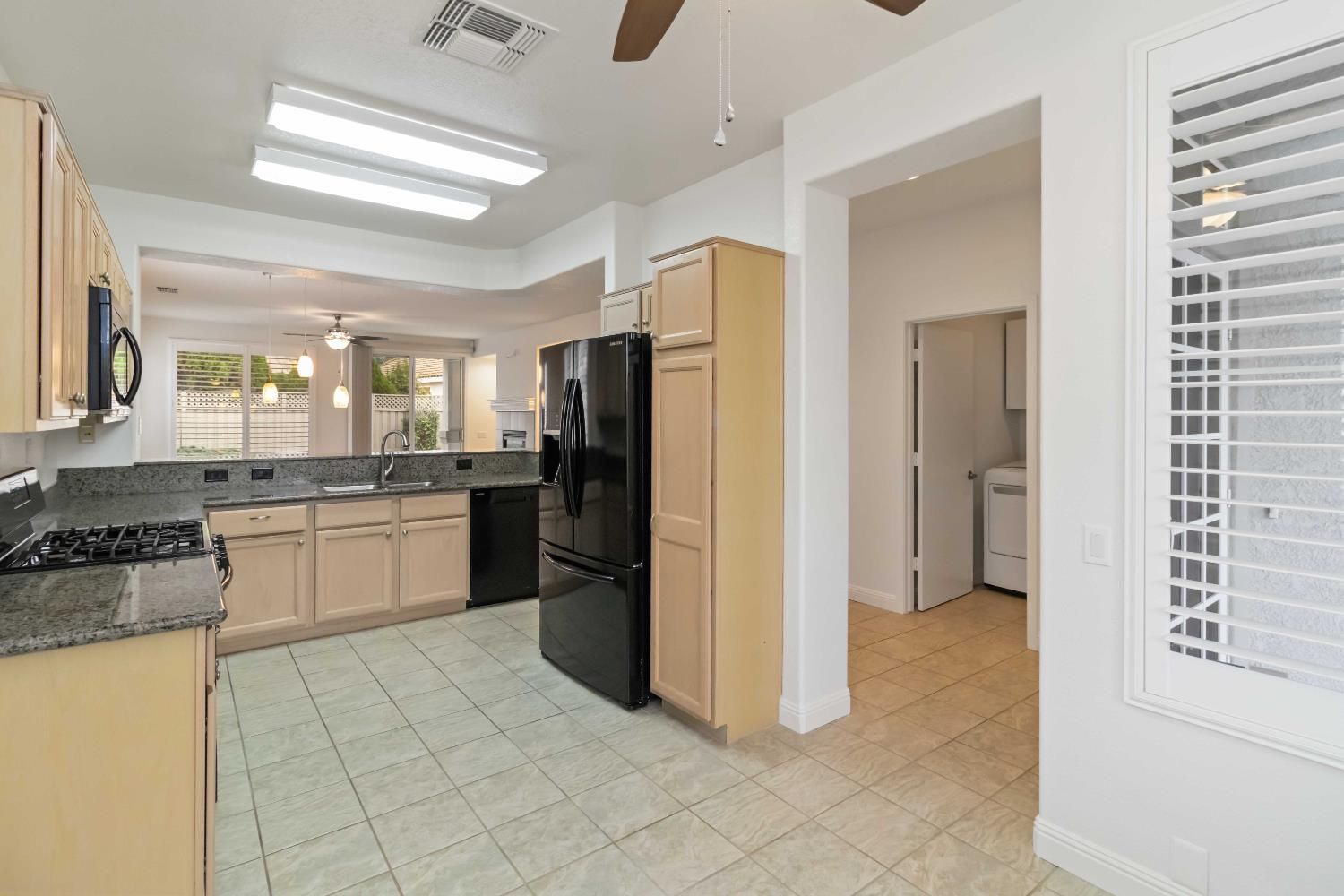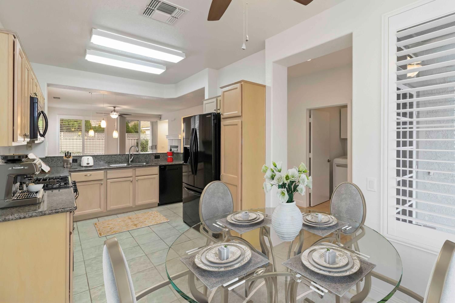 This beautifully maintained 2-bedroom, 2-bath home offers 1,343 sq ft of comfortable living space in the highly desirable Sun City Roseville 55+ Active Adult Community. The open and inviting floor plan features granite countertops, plantation shutters, and durable laminate flooring, creating a stylish yet low-maintenance living space. Interior freshly painted with new bathroom light fixtures and hardwoord throughout. The natural light flows seamlessly through the living room into the kitchen and dining areas, perfect for everyday comfort. Step outside to a nice covered patio, ideal for relaxing mornings or evening gatherings while enjoying the peaceful surroundings. Located in a vibrant, resort-style community with exceptional amenities, this home offers the perfect blend of comfort, convenience, and active adult living. Virtually staged.