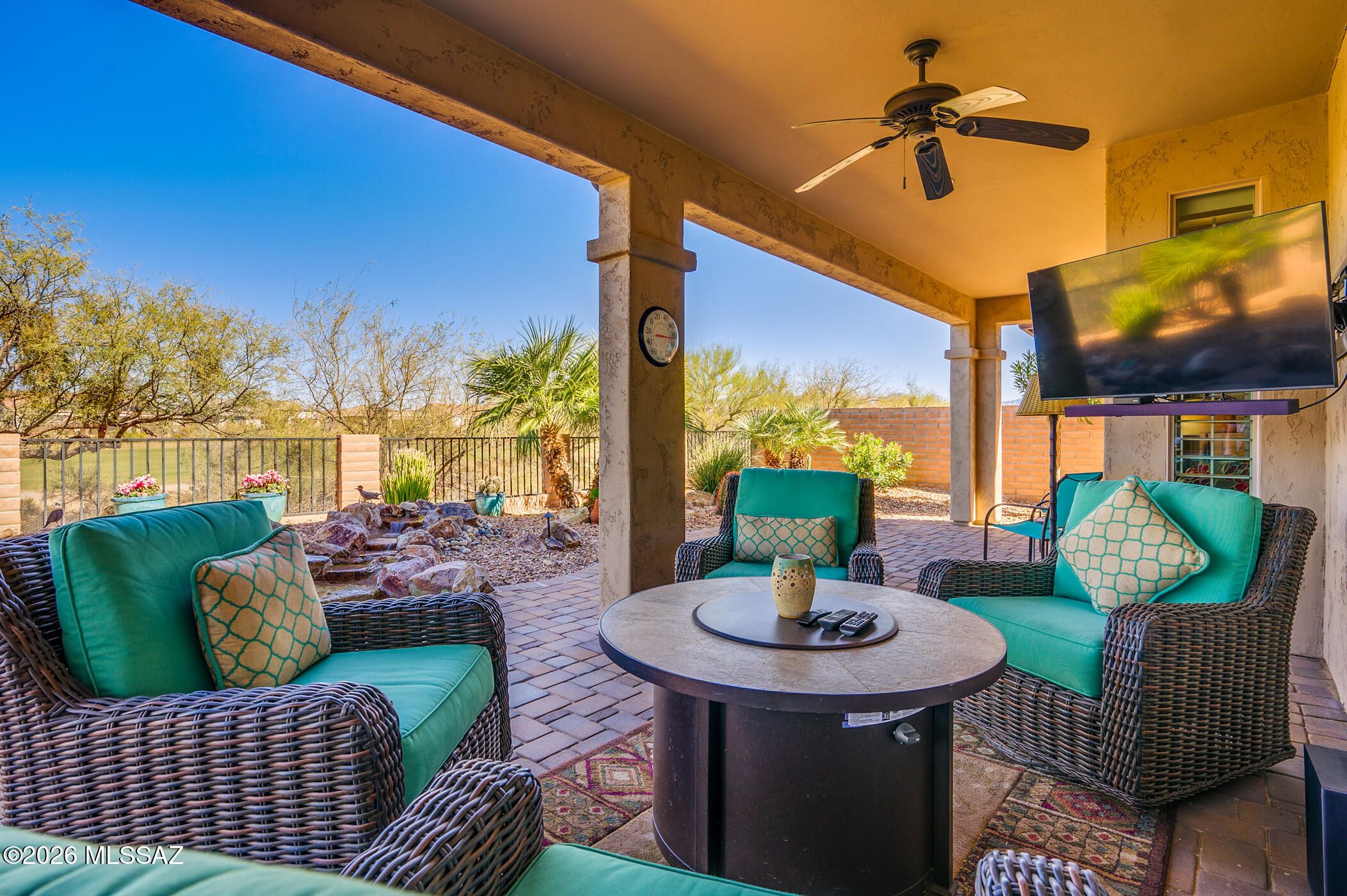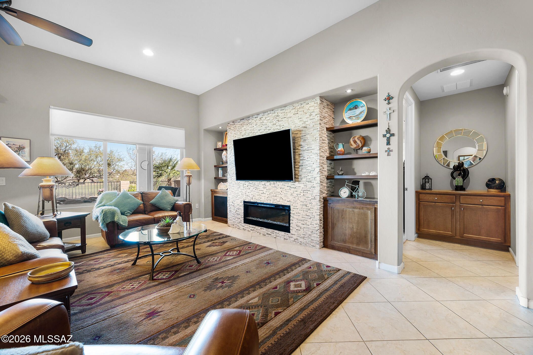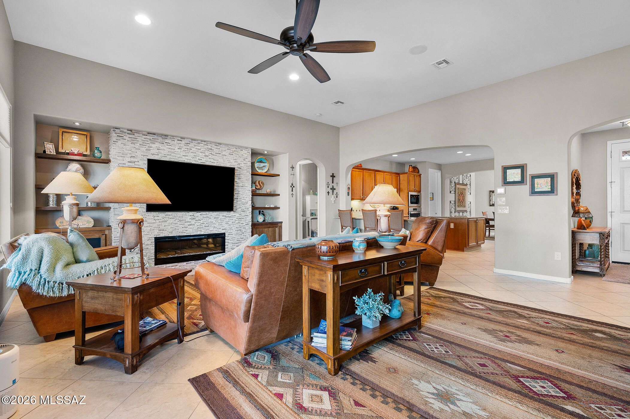 Indulge in a luxurious lifestyle in Southern Arizona's desirable Robson community, where leisure and activity harmonize within a stunning residence that fulfills all your needs. This stunning single-owner home exudes elegance, featuring exceptional upgrades that set it apart. As you enter, you're welcomed by an inviting atmosphere, highlighted by neutral, diagonally laid floor tiles that provide a versatile backdrop for your personal decor. The great room is a masterpiece of design, boasting a beautiful stone wall that elegantly frames the television and a cozy electric fireplace, perfect for adding warmth and ambience to your gatherings. The heart of the home, a chef's dream kitchen, awaits with mid-tone cabinetry, a generous center island, a wall oven, and an electric cooktop, all
