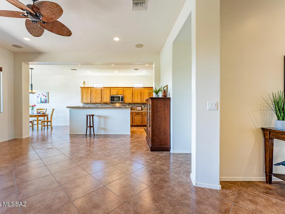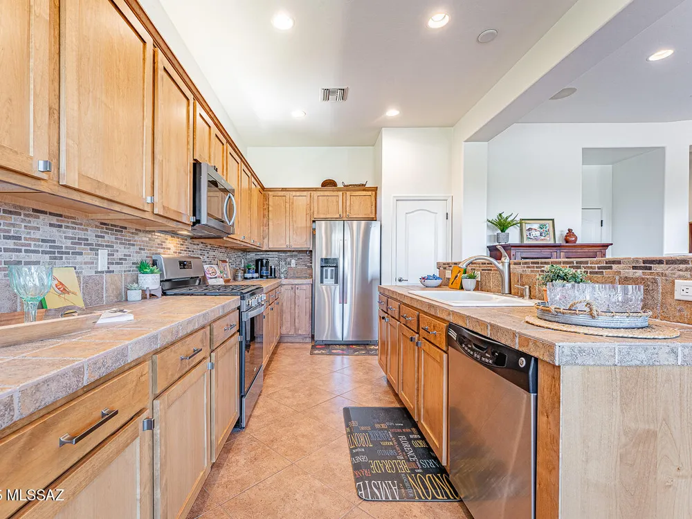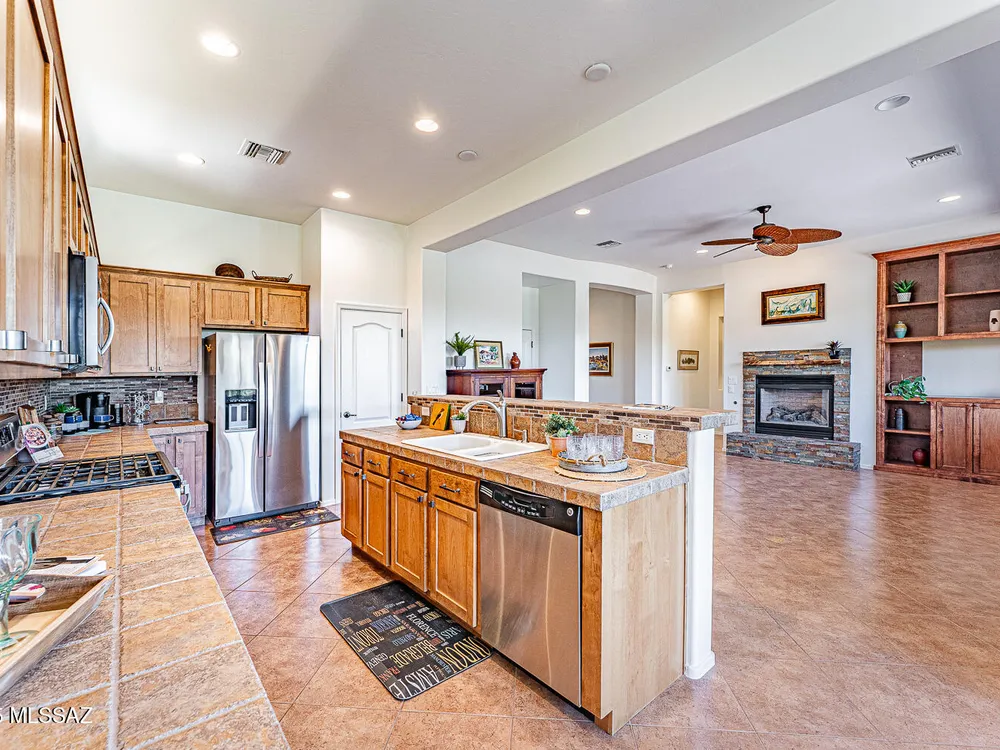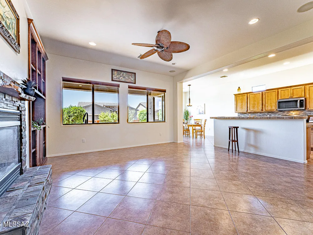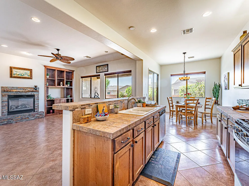 Beautiful Canoa Ranch Home, a Great Room Floorplan, 3 Bedrooms 2 Baths and a 2 Car Garage. Upgrades are throughout this home, Upgraded Kitchen - stainless steel appliances, custom tiled counter tops, back splash and upgrade cabinets with pull out shelves, slate tiled fireplace along with a decorative custom built-in unit, The 3rd bedroom has wonderful built-in desk, cabinets and bookshelves. solar on the roof. The Back Yard would be great for entertaining, citrus trees, a beautiful low care yard. Must See!