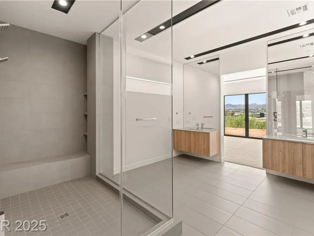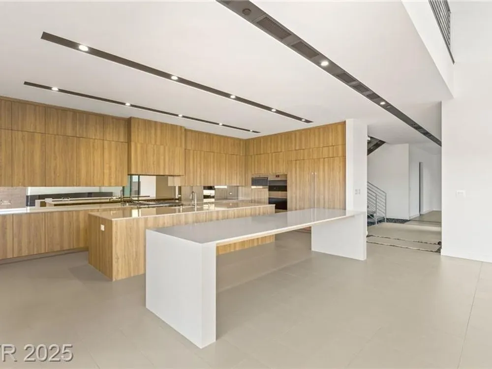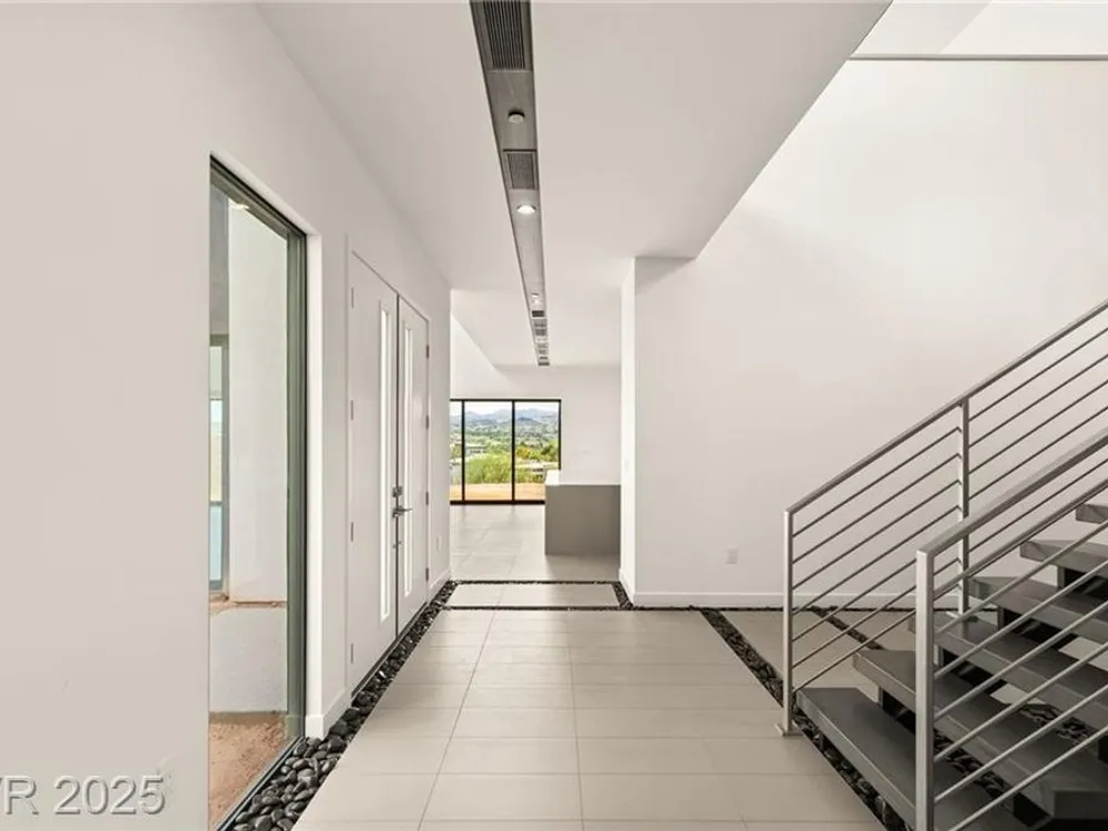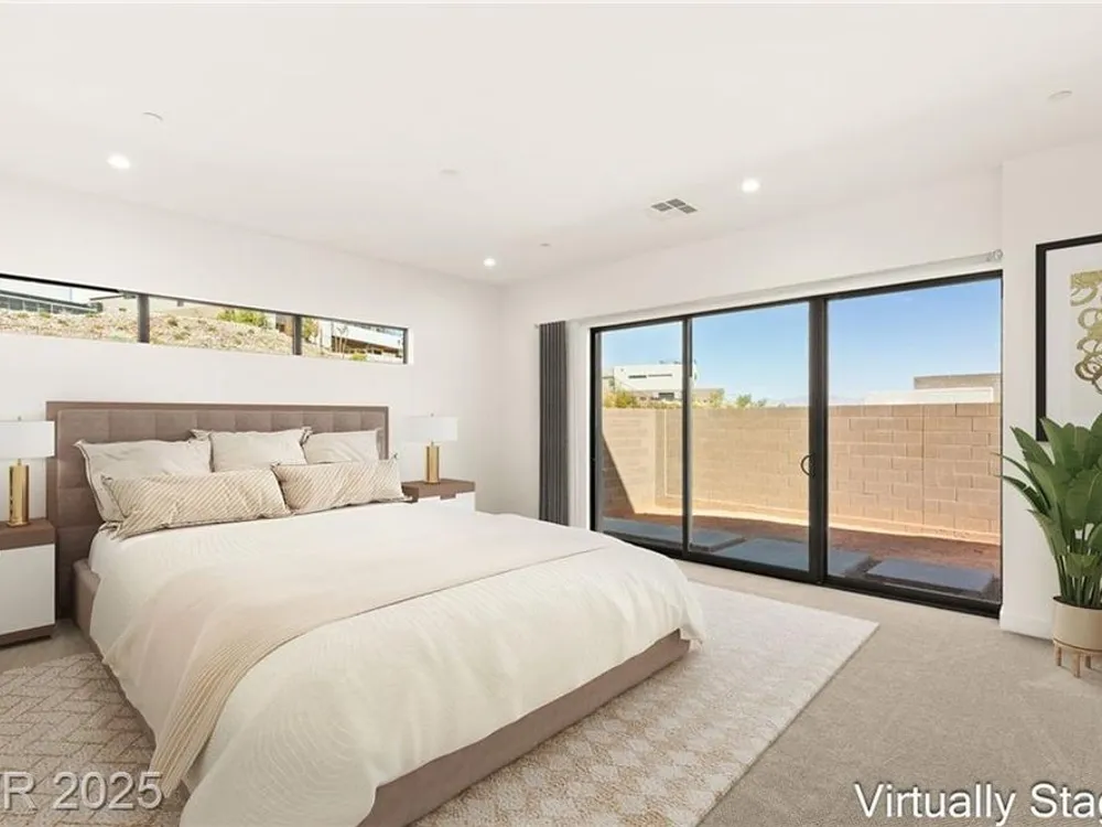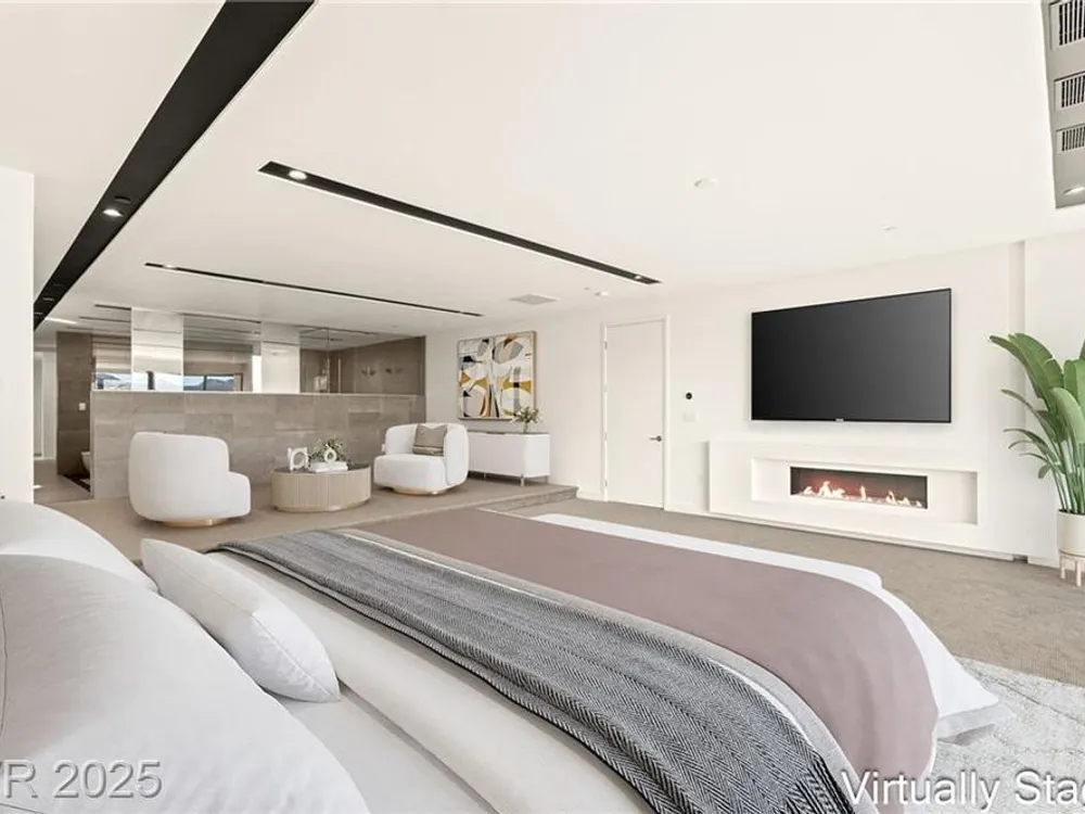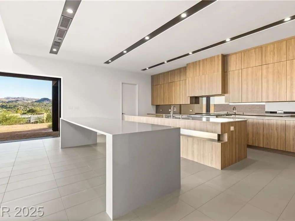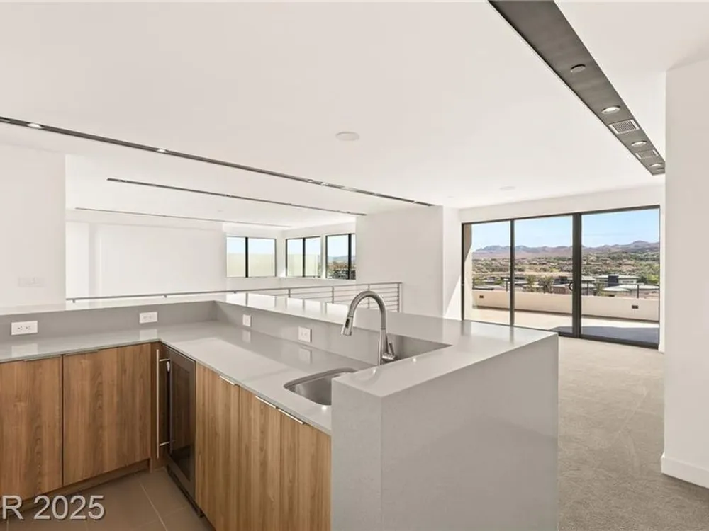 Discover the elegance of this Architecturally Significant Home by Blue Heron at Caliza, a lakeside escape perched on an elevated lot overlooking the lake and mountains within the exclusive double guard-gates of this exclusive community located on Lake Las Vegas’ desirable North Shore. Renowned Vegas Modern designs grace this 7,690-square-foot, four-bed, five-bath home. This home features a seamless biophilic floor plan that blurs the lines between indoor and outdoor spaces and upgrades including Vegas Modern ceilings and entry rock steppers. The Great Room features breathtaking views 108-inch upgraded linear gas fireplace and expansive pocket door. Signature Vegas Modern Kitchen features a top-of-the-line appliance package. Ascend the floating staircase to the luxury primary suite with dual walk-in closets and a panoramic balcony. A Zen-inspired bath offers a walk-in shower, tub, and outdoor shower. Enjoy versatile spaces, including a media/theater room and an upper-level wet bar.