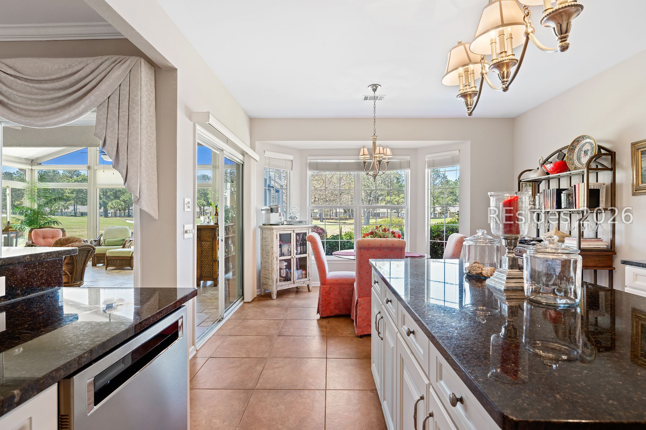 Wisteria model on oversized lot with golf and lagoon sunset views from back yard and lagoon views from front yard in Sun City. 3BR/2BA + office featuring an expansive sunroom with cathedral ceiling, 2 ceiling fans, impact glass windows, and Mitsubishi split A/C. Kitchen offers granite counters, large island, gas stove, double built in ovens, stainless appliances, tile backsplash, pantry, and roll out shelves. Bay windows in primary suite and breakfast nook. Smooth ceilings throughout. Oak Wheat Wood flooring in the great room and dining room, upgraded tile in the foyer, kitchen, laundry room and bathrooms, and beautiful deco tile in the sunroom. Laundry room with utility sink. 4 foot extended garage with attic storage. Paver driveway and concrete patio complete this very clean beautifully designed home.