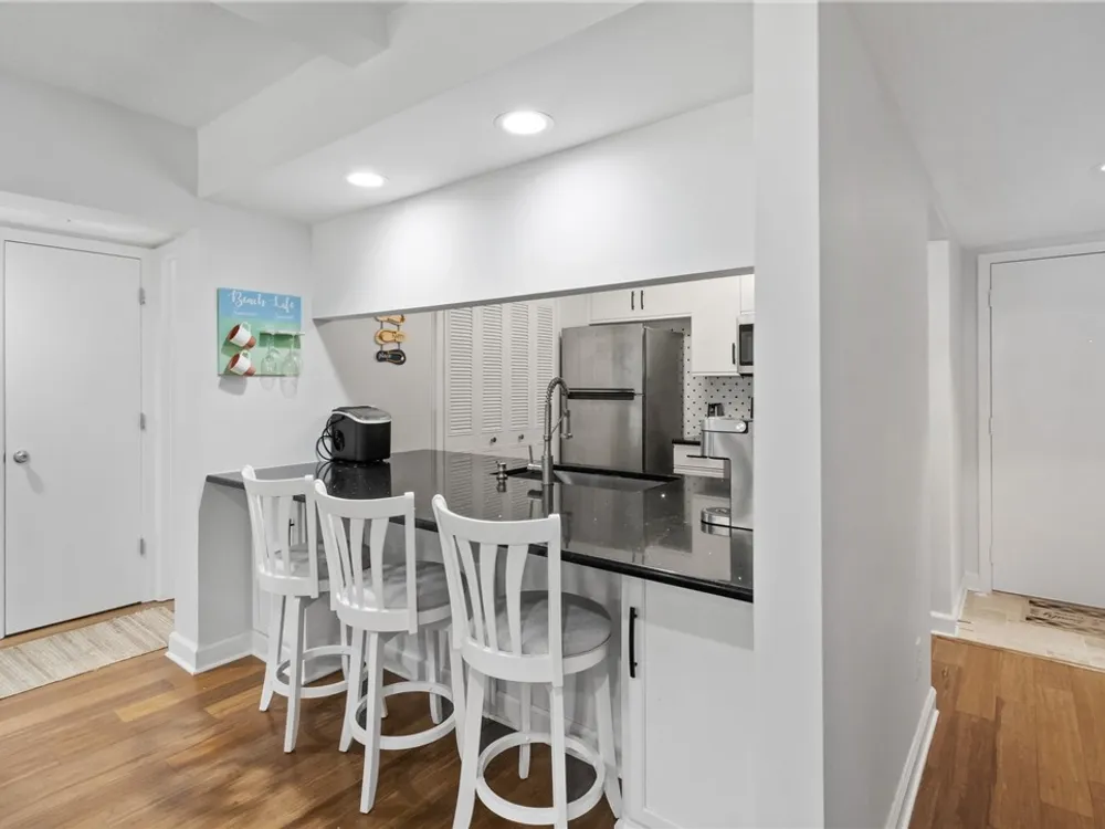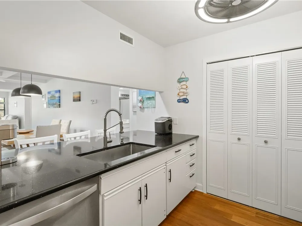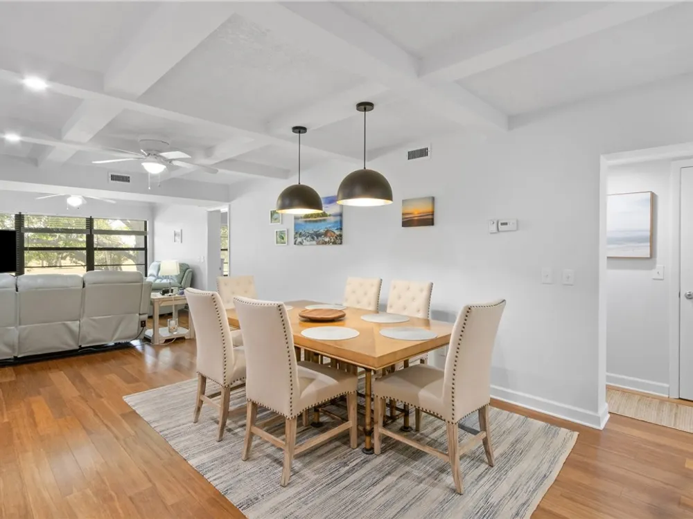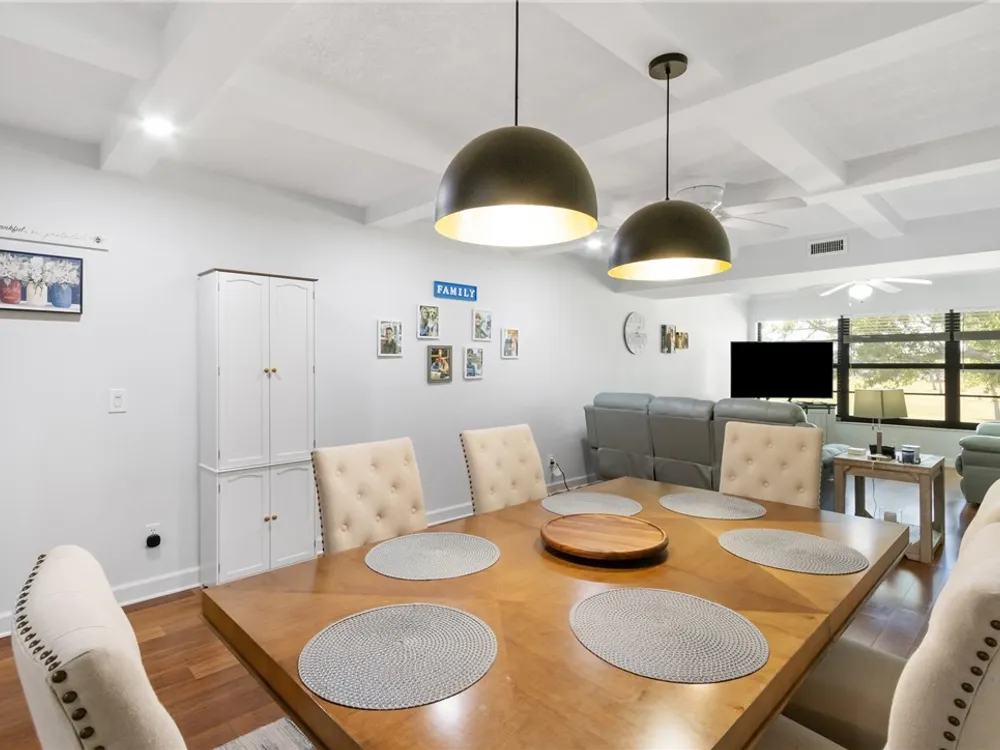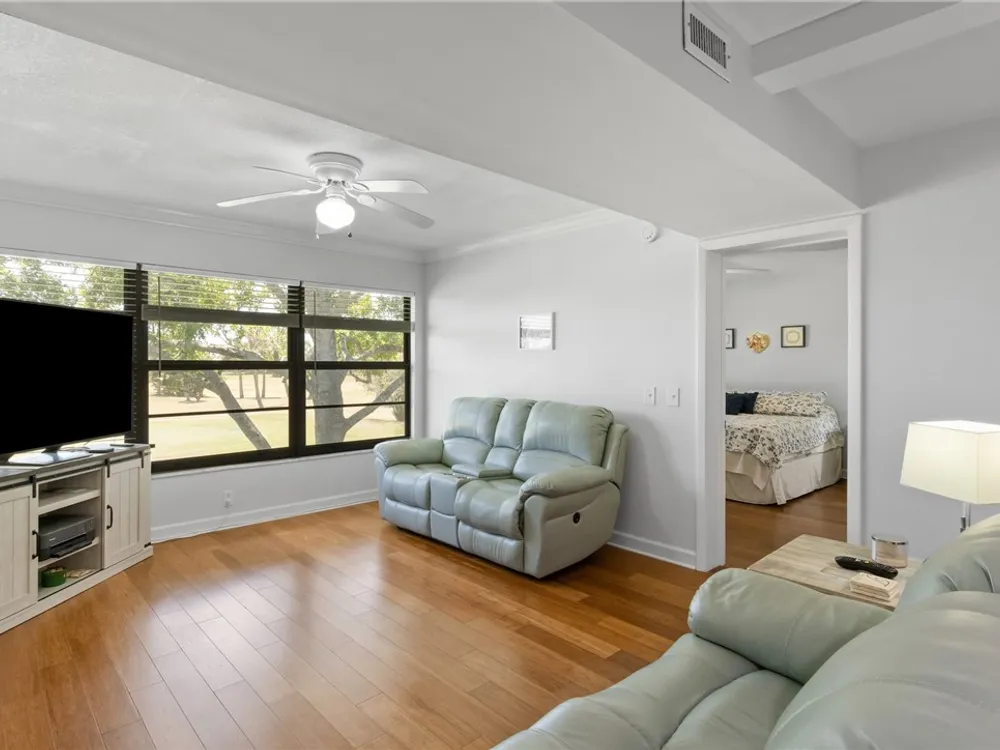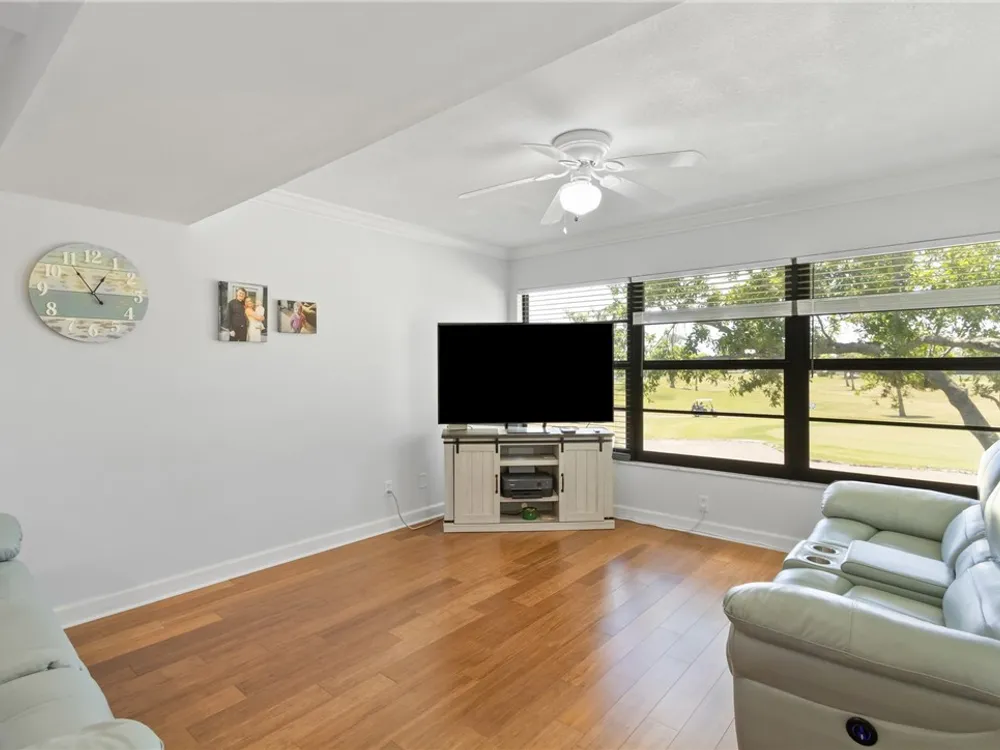 Time to step into pure elegance in this fully furnished-turnkey end unit beauty! Be stunned by gorgeous coffered ceilings, recessed lighting and kitchen boasting sparkling quartz countertops, tile backsplash, pantry and SS appliances! Bamboo, tile & berber flow seamlessly t/o while added crown molding, textured ceilings, pendants, & 21' water tank make you feel right at home! Added barn door to HUGE walk-in closet-modern touch! Washer/Dryer in-unit, 1 assigned space, & impact windows offer convenience at your doorstep! Enjoy endless golf course views-just steps to pool, bbq, bocce ball & more!