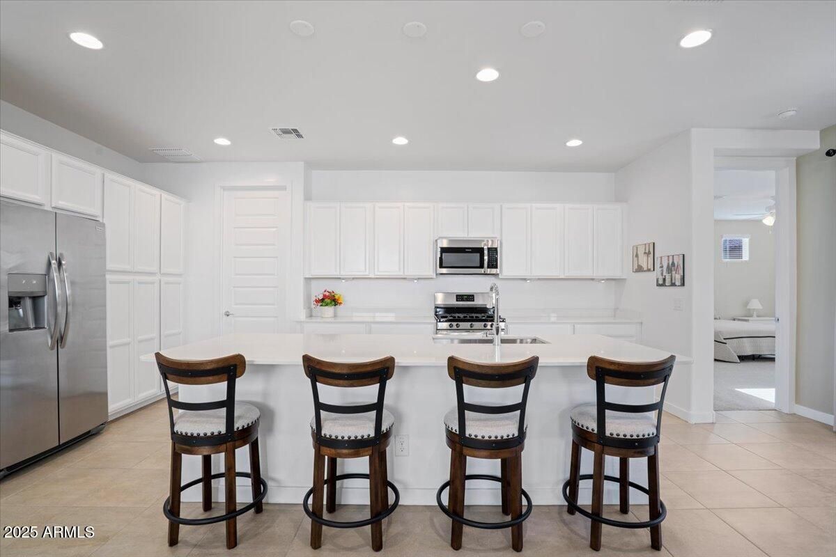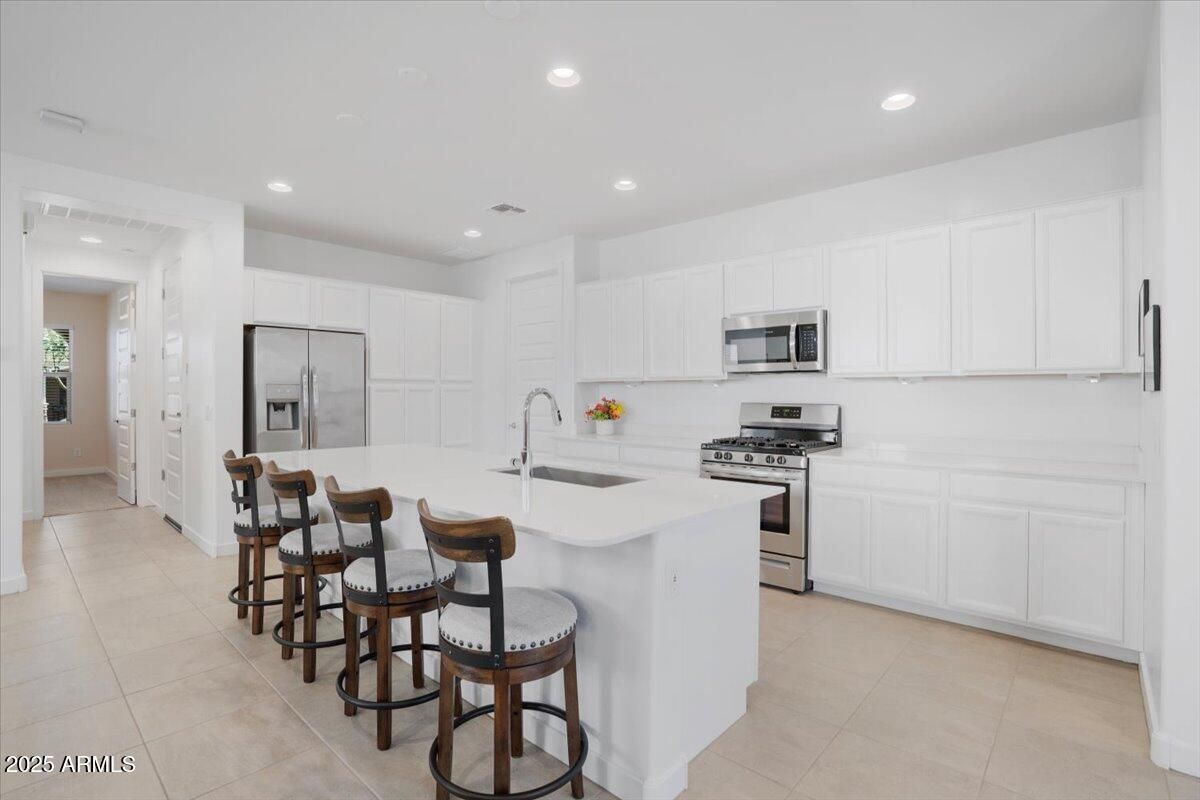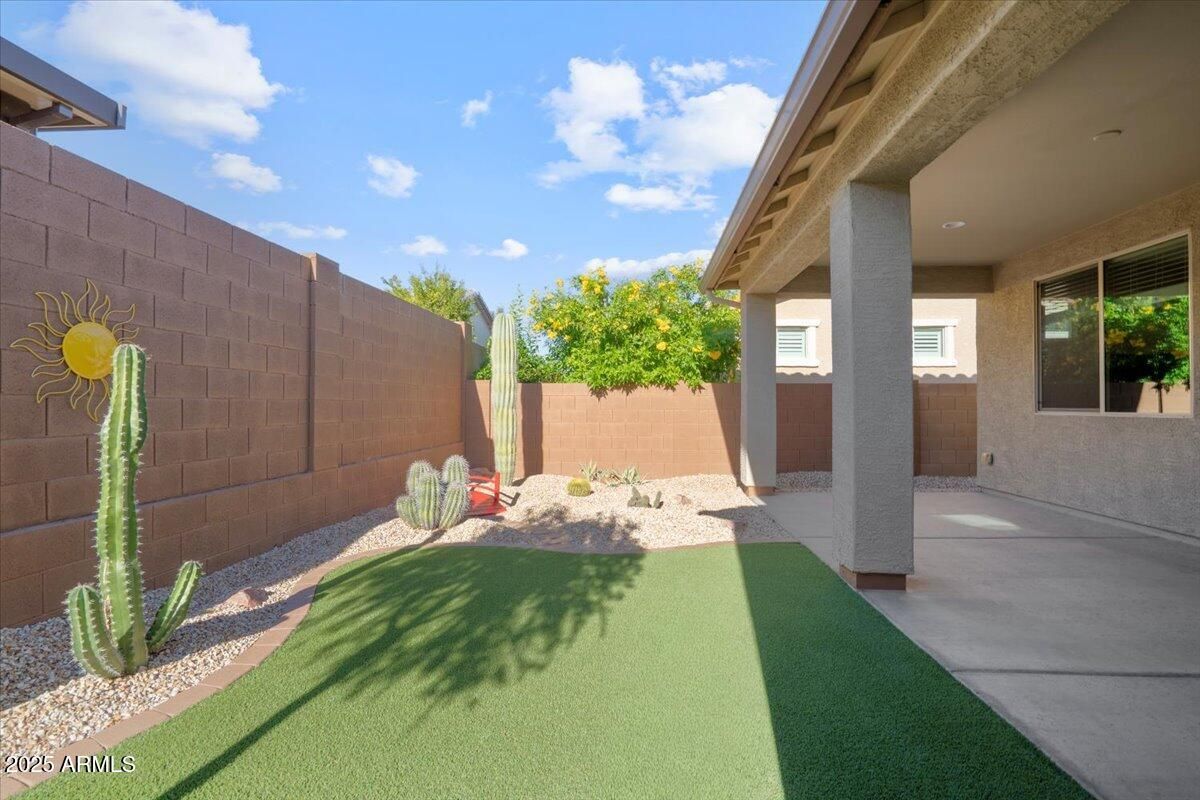 Skip the wait and step into this meticulous 2-bedroom, 2-bath home nestled in Surprise's premier 55+ gated community. Every detail has been thoughtfully curated - from the open-concept great room with tall ceilings to the seamless split floor plan designed for both comfort and convenience. The kitchen is a true centerpiece, featuring crisp white cabinetry, stainless steel appliances, and a large island perfect for casual dining or entertaining. The primary suite offers a spacious retreat with dual sinks, a walk-in shower, and direct access to the laundry and kitchen for effortless everyday flow. Step outside to your private backyard retreat - complete with a large covered patio, extended low-maintenance desert landscaping, and a touch of artificial turf framed by mature cactus and blooming shrubs. It's the perfect balance of easy upkeep and peaceful outdoor living. Residents of Heritage Asante enjoy access to world-class amenities including the Heritage Club, fitness center, resort-style pool, pickleball and bocce courts, a 9-hole putting green, and even a dog park. Furnishings are available on a separate bill of sale, making this an ideal turnkey option for seasonal or full-time living.