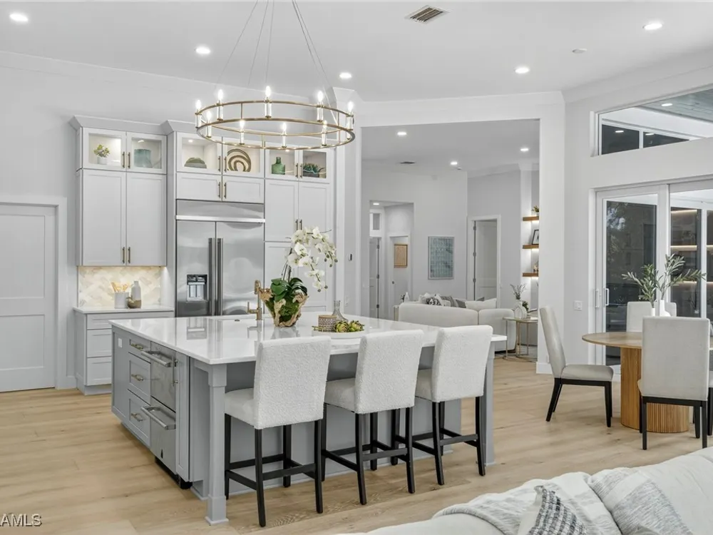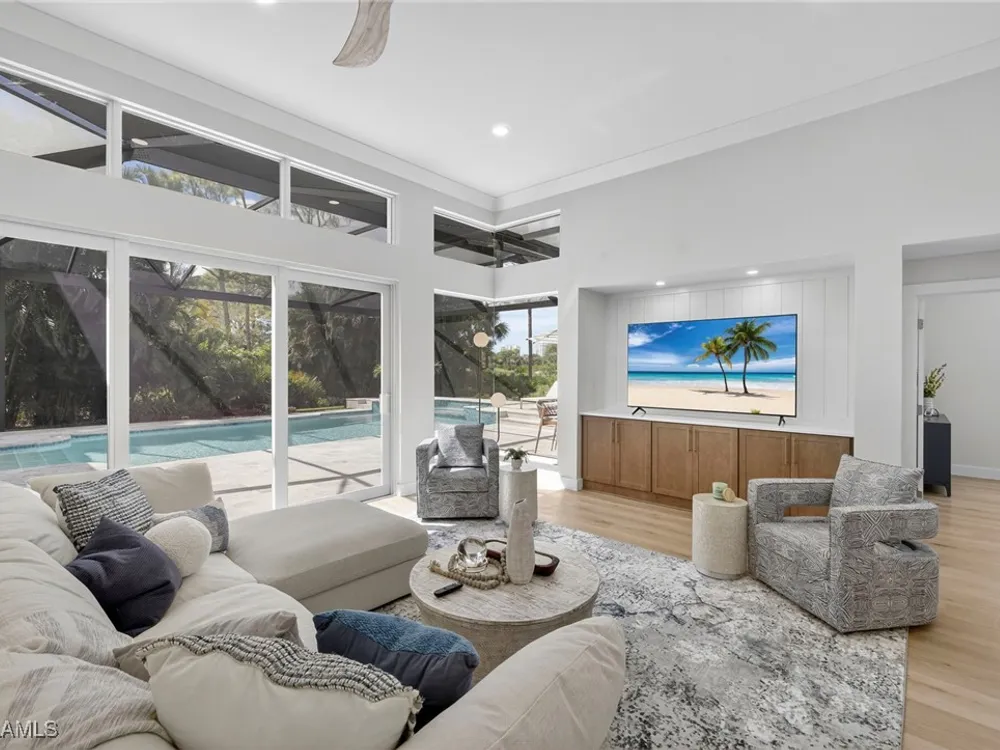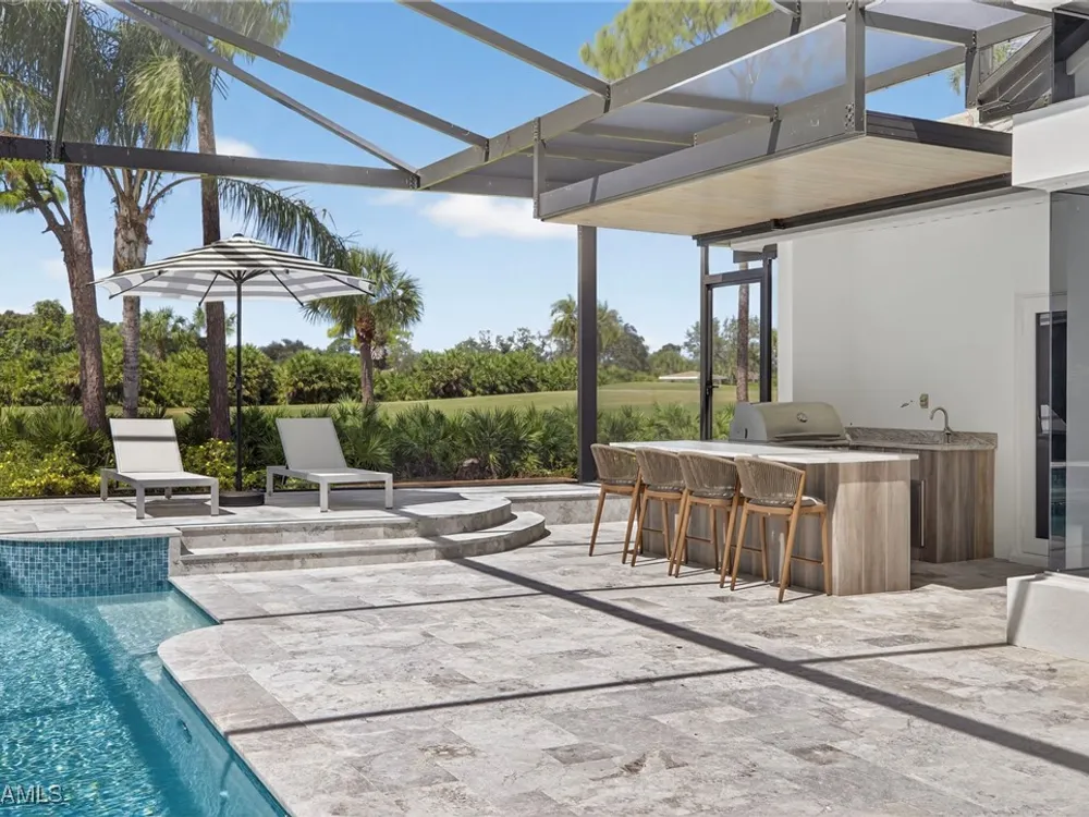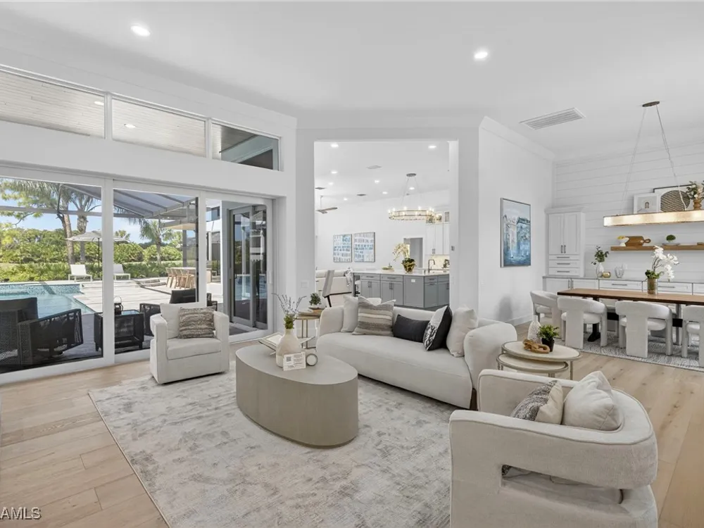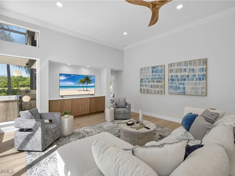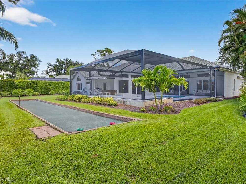 Welcome to your dream home—a breathtaking House Rescue by Tortuga Homes that redefines luxury living with timeless coastal elegance. Perfectly situated along the scenic 8th fairway of the Hurricane Golf Course in Pelican Landing, this fully reimagined 4-bedroom plus den, 3.5-bath residence offers refined style, thoughtful functionality, and a lifestyle of effortless sophistication. Step inside to wide-plank European white oak floors flowing through light-filled, open-concept spaces. The heart of the home is a chef’s kitchen designed to impress—featuring top-tier appliances, custom cabinetry, and ample storage that makes both everyday living and entertaining feel seamless. Adjacent, the tastefully appointed great room invites relaxed gatherings with family and friends. Designed for those who love indoor-outdoor living, this home truly shines beyond its walls. A fabulous outdoor kitchen and bar anchor the expansive lanai, creating an ideal setting for al fresco dining and sunset cocktails. Enjoy the lush, professionally landscaped backyard complete with a private bocce ball court and sweeping fairway views. Each of the four bedrooms offers comfort and serenity, including a luxurious primary suite with a spa-inspired bath. The versatile den adds flexibility as a home office or reading retreat. A 2.5-car garage provides generous room for vehicles, storage, and more—every detail crafted with intention. Every inch of this home reflects Tortuga Homes’ signature craftsmanship and commitment to quality—from the custom millwork and thoughtful layout to the cohesive, coastal-inspired design. This is more than a remodel—it’s a full reinvention. Don’t miss the opportunity to own one of Pelican Landing’s finest House Rescue homes, where luxury meets lifestyle on the fairway.
