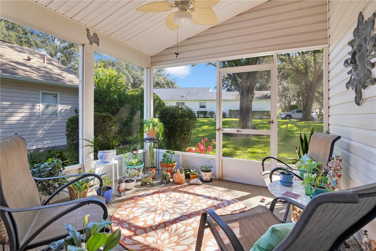 Welcome to this charming 2-bedroom, 2-bath home located in the highly sought-after 55+ community of Plantation at Leesburg. This beautifully maintained residence features an open floor plan with high ceilings, a spacious living room, and a dining area that flows seamlessly into the kitchen with breakfast bar seating. The master suite offers dual sinks and a walk-in closet, while sliding glass doors lead to a relaxing screened-in porch overlooking the corner lot. Recent updates include a new roof (2020), ceramic tile and engineered hardwood flooring, and fresh finishes throughout. Enjoy resort-style living with amenities such as two golf courses, three clubhouses, swimming pools, tennis and pickleball courts, walking trails, fitness centers, and an onsite restaurant. Conveniently located near shopping, dining, and medical facilities, this home is move-in ready and perfect for year-round or seasonal living.
